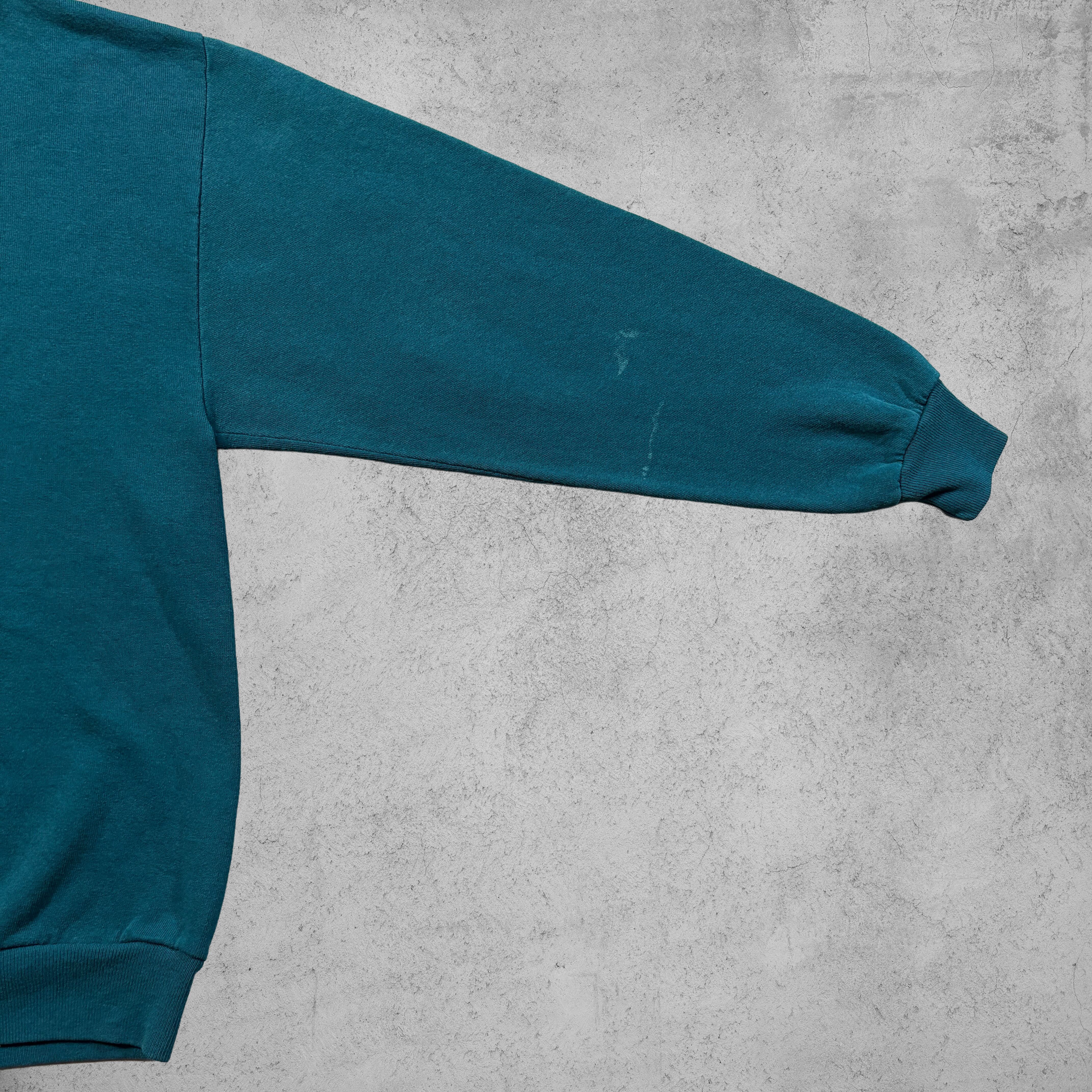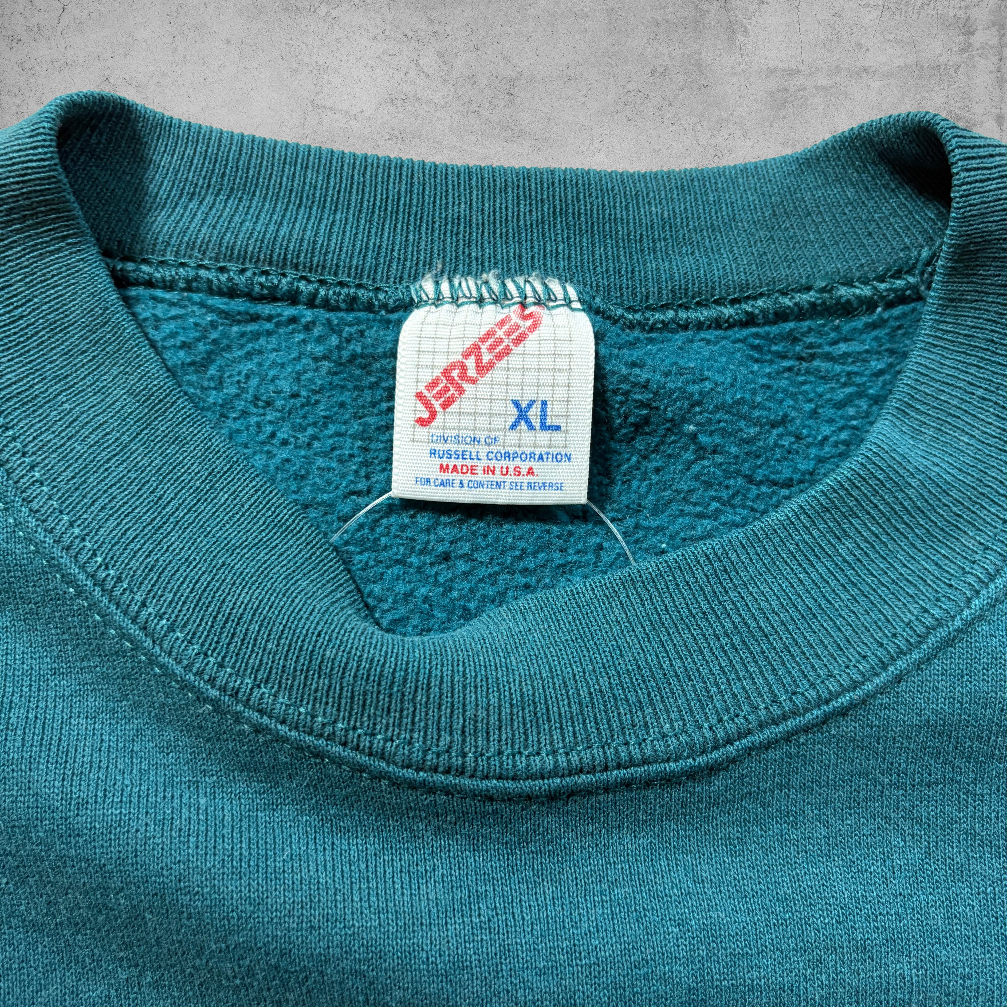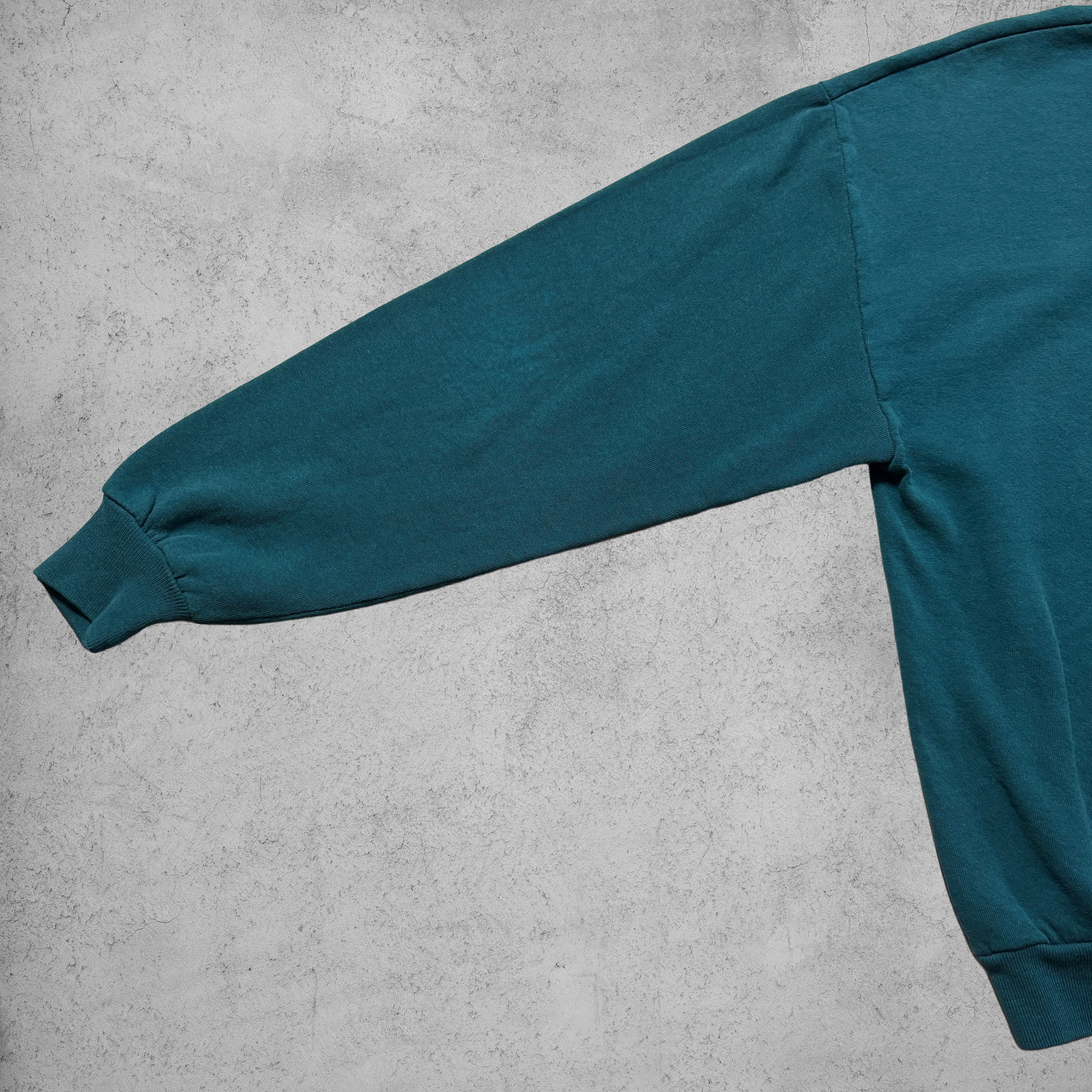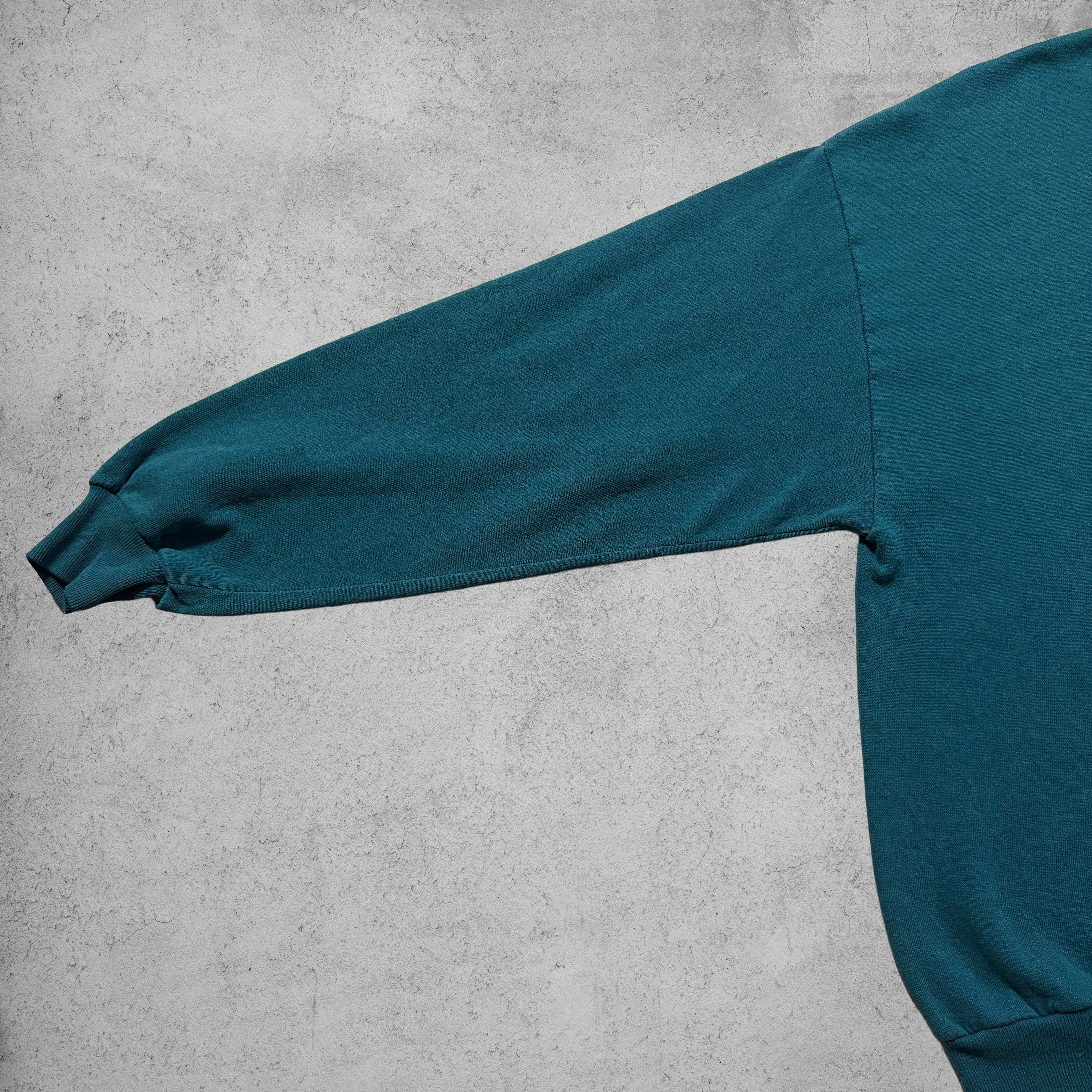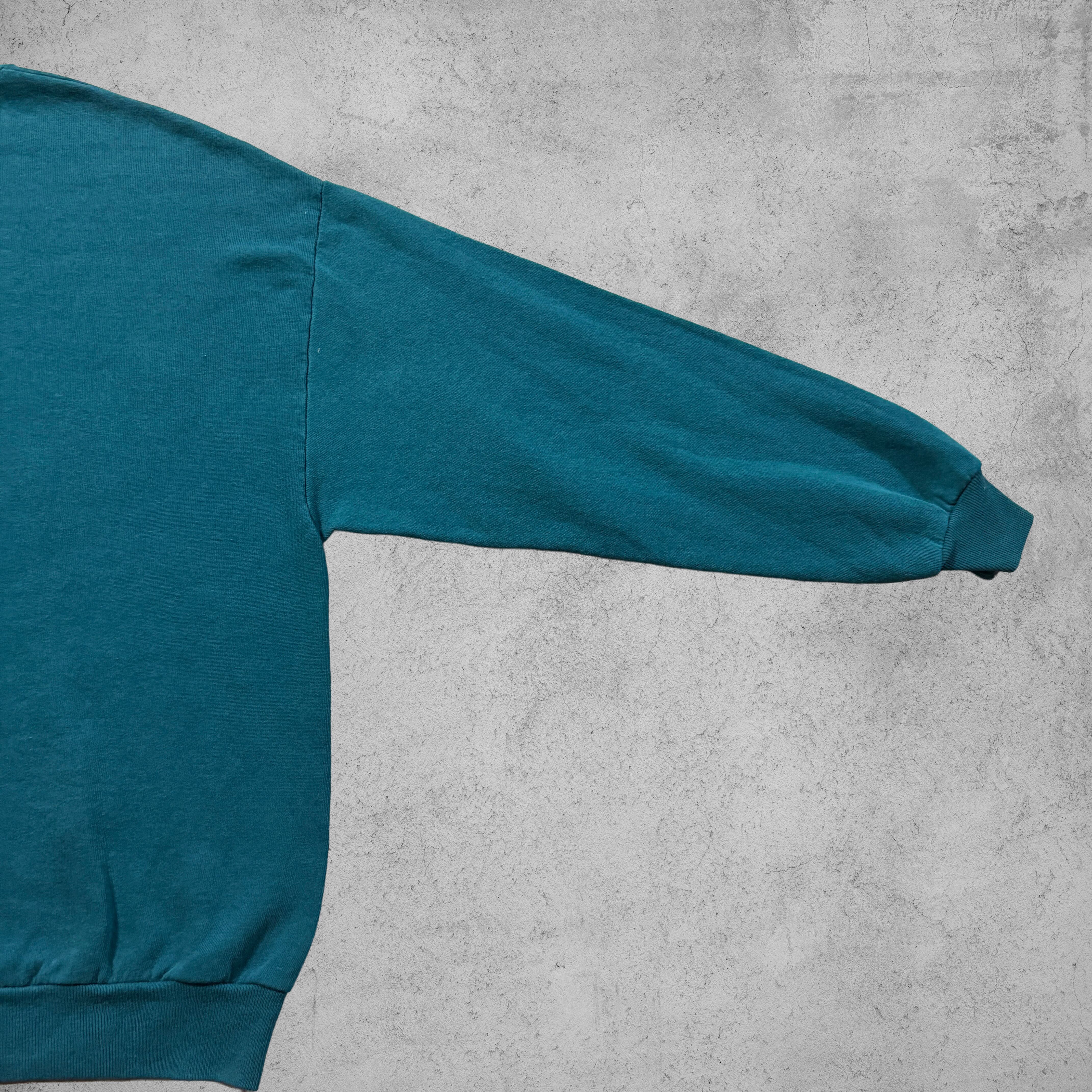 アメリカ製「Jerzees(ジャージーズ)」の無地スウェット。タグからみて90年代頃の一枚。色味は深みのあるグリーンで、シンプルながら存在感ある発色。裏起毛のコットン×ポリエステル生地で、ふんわりした着心地。サイズはXLで、身幅・着丈ともにゆったりしたオーバーサイズシルエット。単体でも、シャツやロンTとのレイヤードにも使いやすく、ヴィンテージらしい雰囲気を楽しめる。