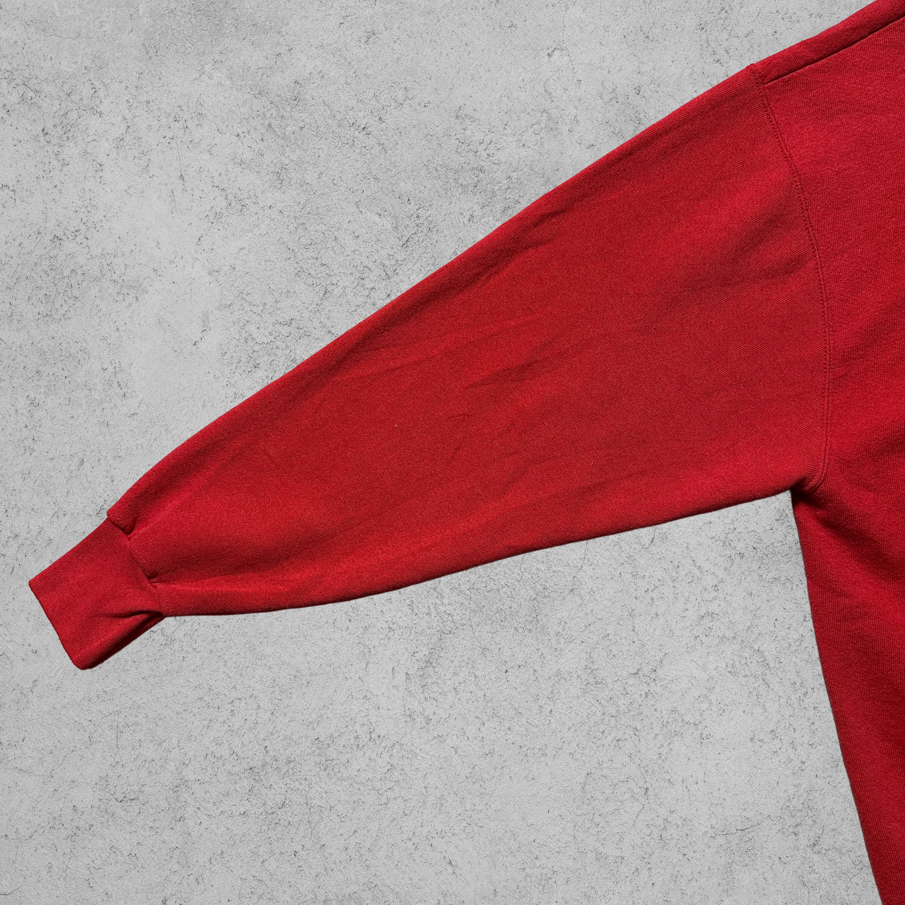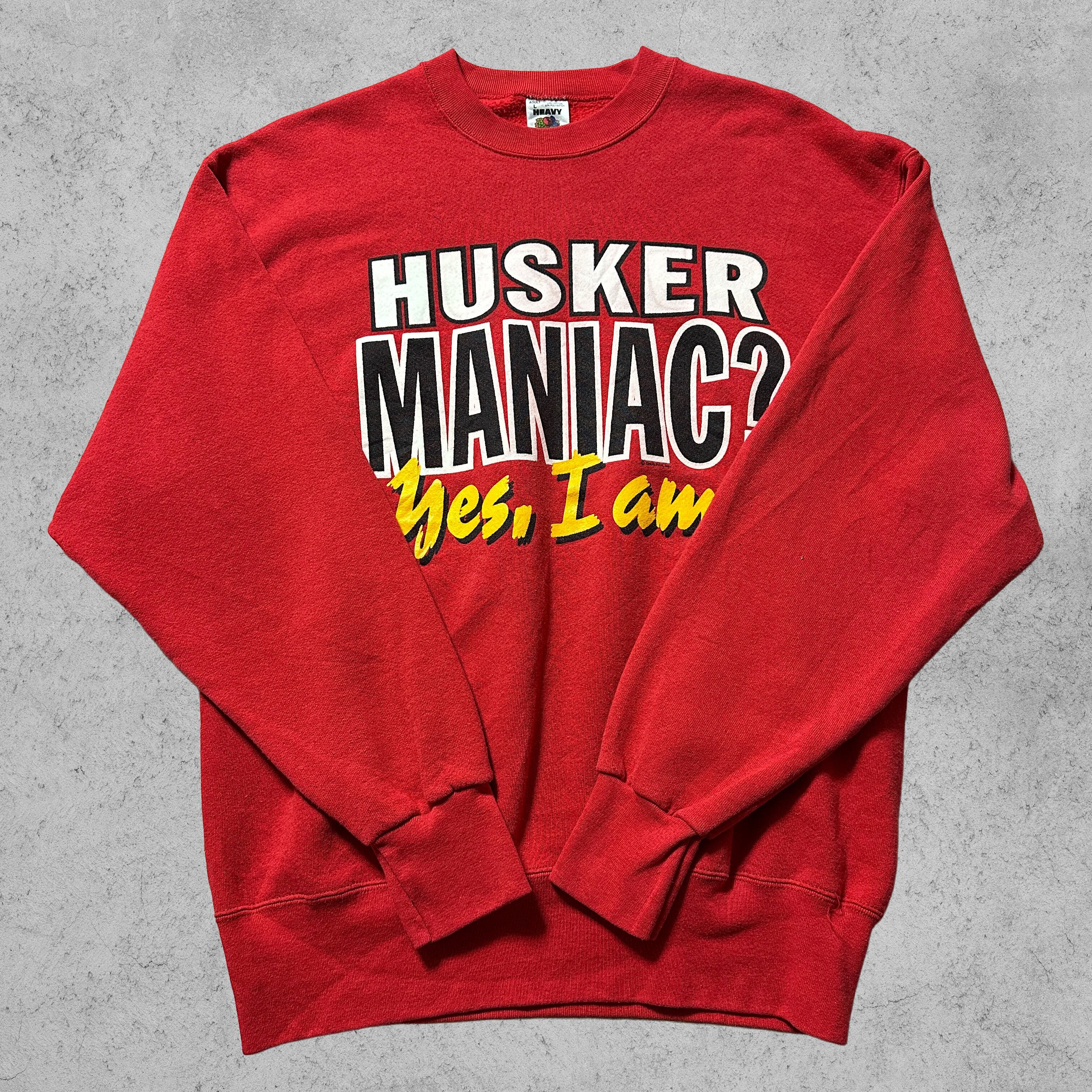 90年代アメリカ製のFruit of the Loomボディを使用したプリントスウェット。鮮やかなレッドボディに「HUSKER MANIAC? Yes, I am!」と大胆なメッセージプリントが入ったインパクト抜群の一枚。ネブラスカ大学のカレッジフットボールチーム「Cornhuskers(コーンハスカーズ)」ファン向けのアイテムで、当時の熱狂的なスポーツカルチャーを感じられるデザイン。