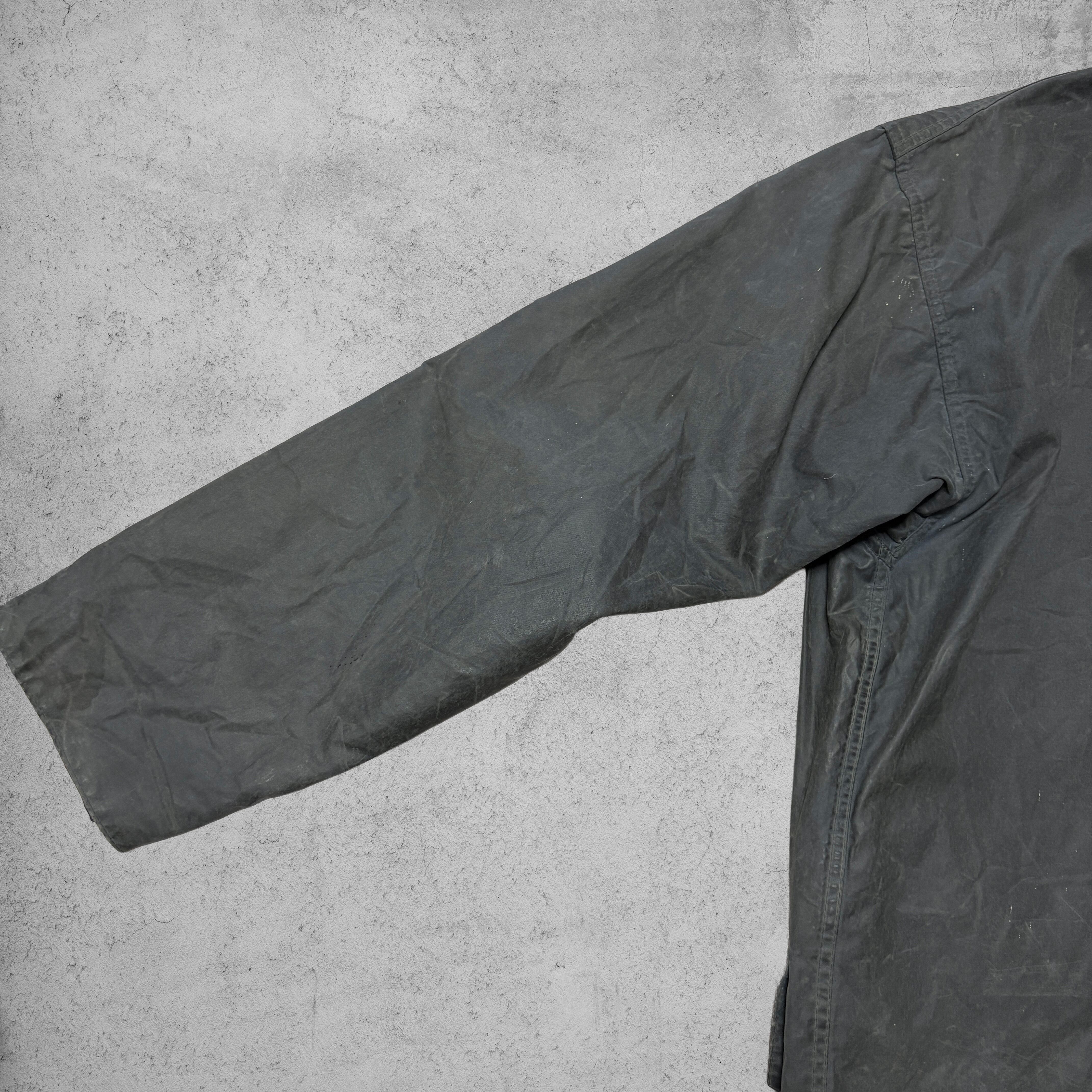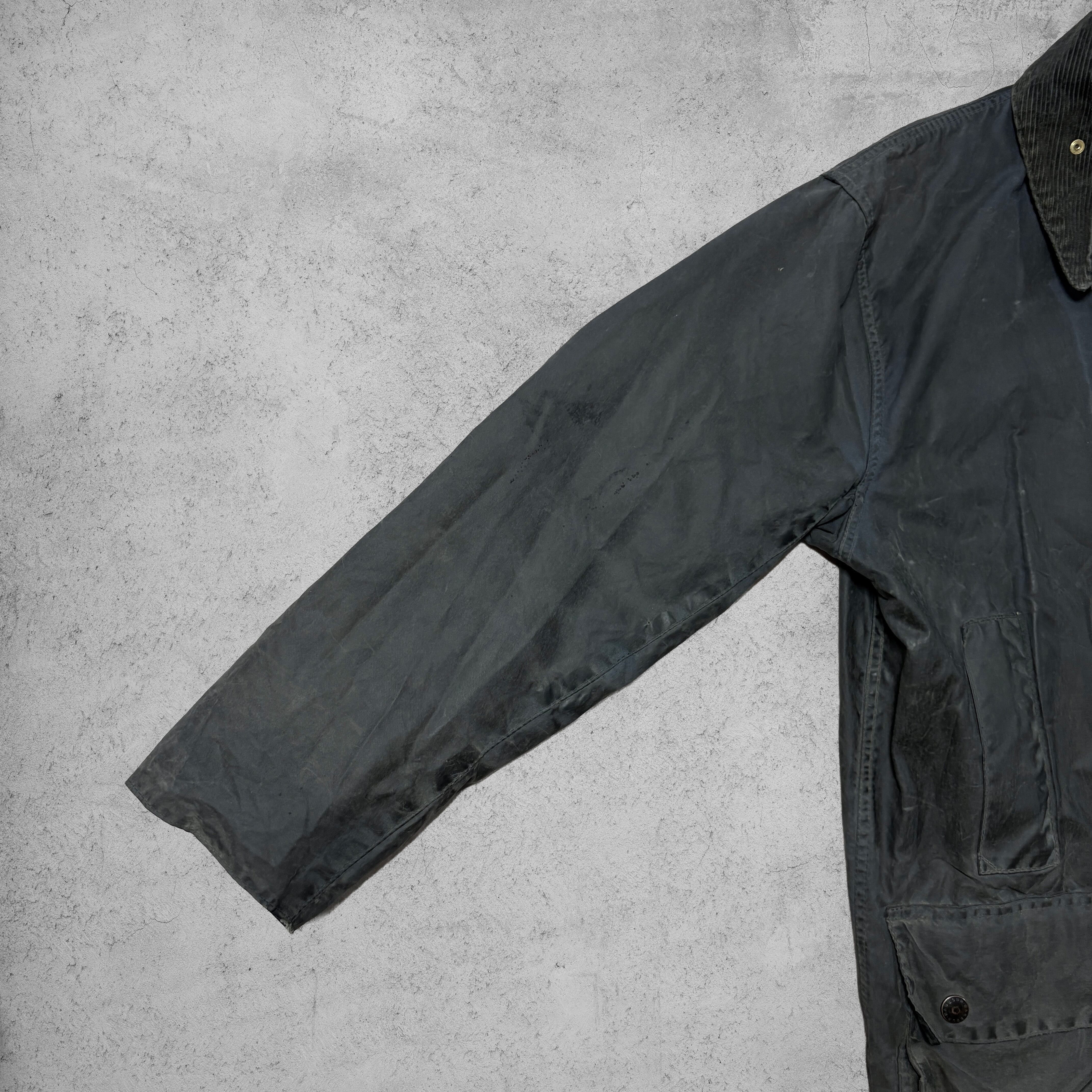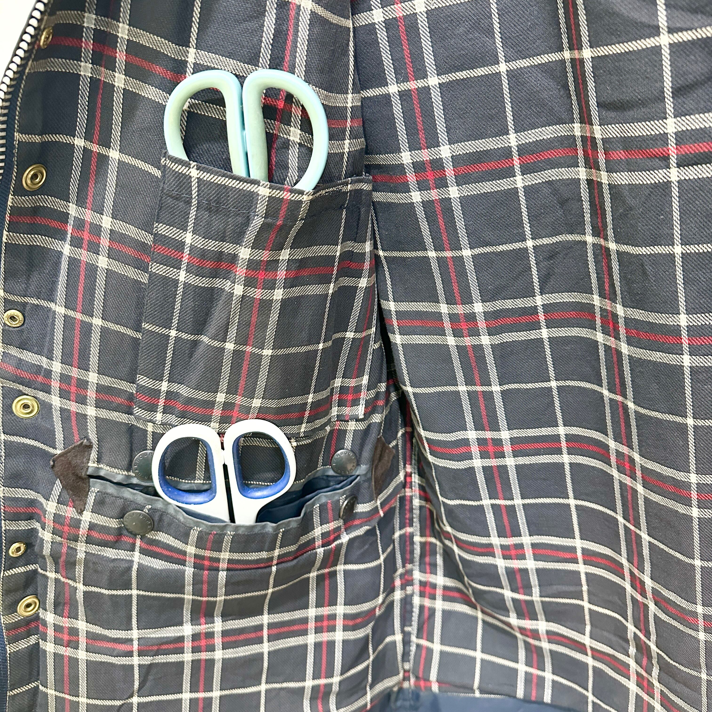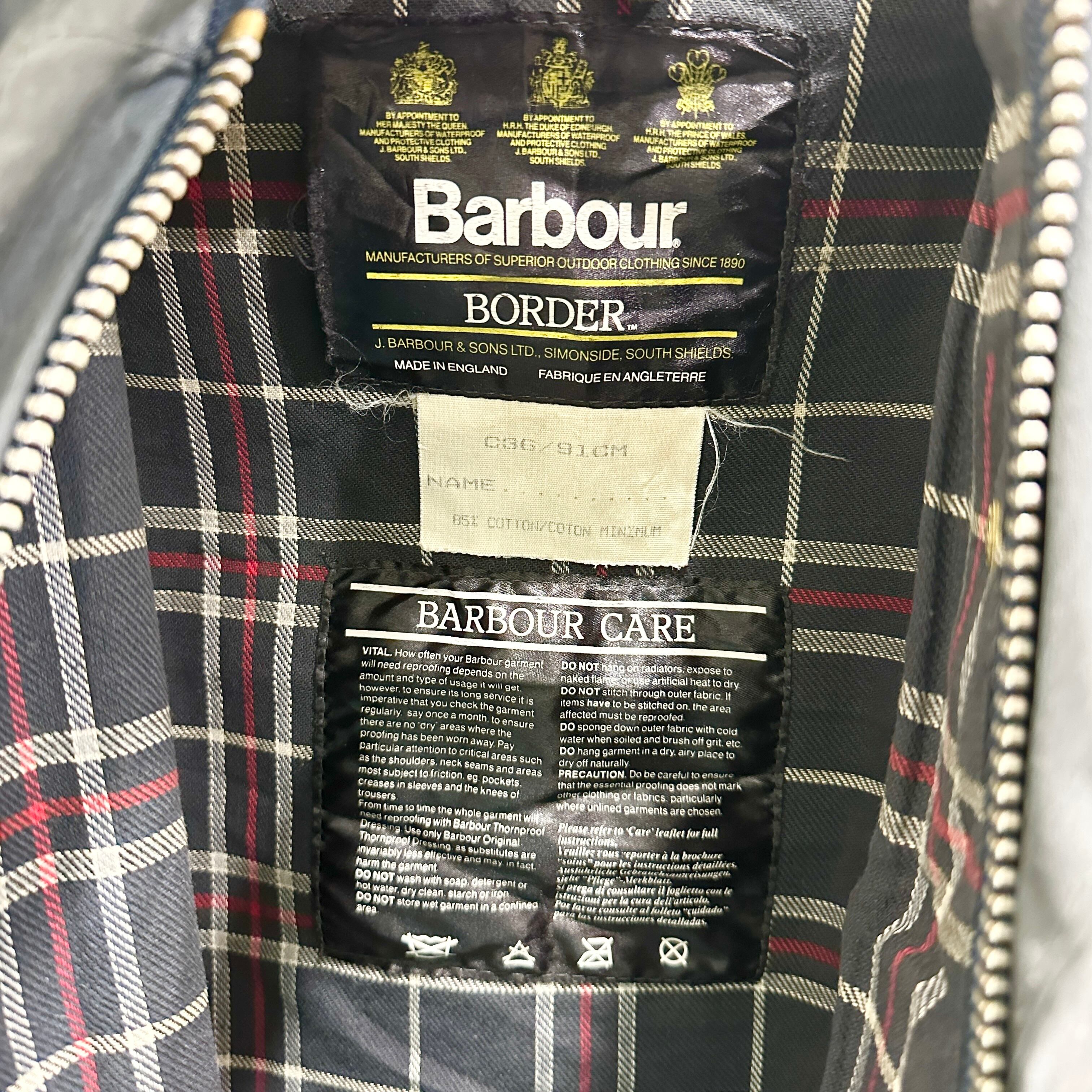 英国アウトドアウェアの代名詞、Barbourの名作「Border(ボーダー)」ワックスドジャケット。タグにある「MADE IN ENGLAND」表記やクラシックタータンライニングから、90s頃のモデルと推測できる。特徴的な大きめのフラップポケット、リング型ジッププル、コーデュロイ襟など、伝統的なディテールが揃った一着。オイルドコットン特有の風合いと使用によるアタリが味わい深く、ヴィンテージならではの雰囲気を持つ。サイズ表記はC36 / 91cmで、日本サイズではメンズS〜M相当。タウンユースからアウトドアまで幅広く着用でき、クラシックな英国カントリースタイルを楽しめる。