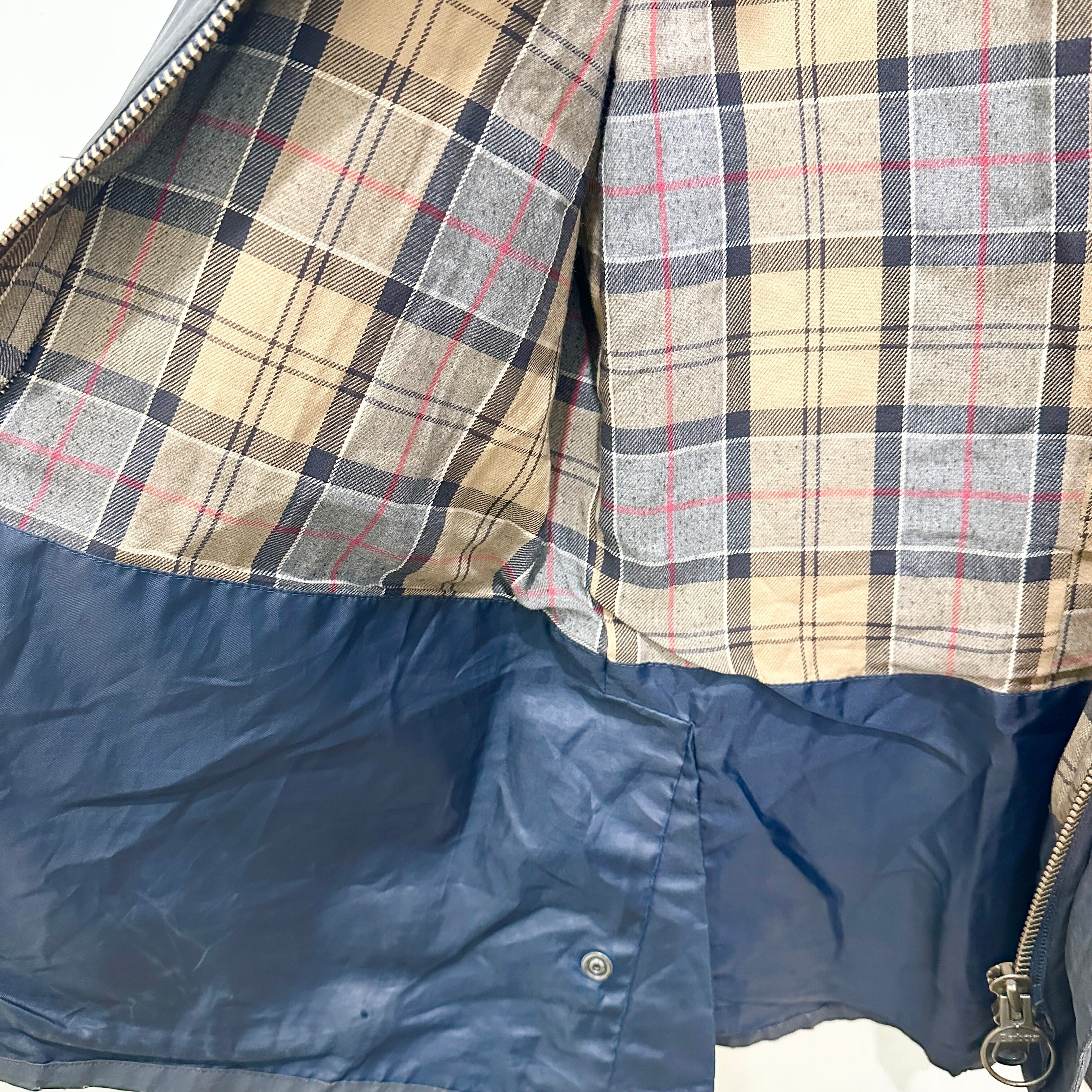 素材はオイルドコットンで、防風性・撥水性に優れ、アウトドアや乗馬用として開発された実用性の高いアイテム。襟はコーデュロイ、裏地にはブランドらしいタータンチェックが配されている。