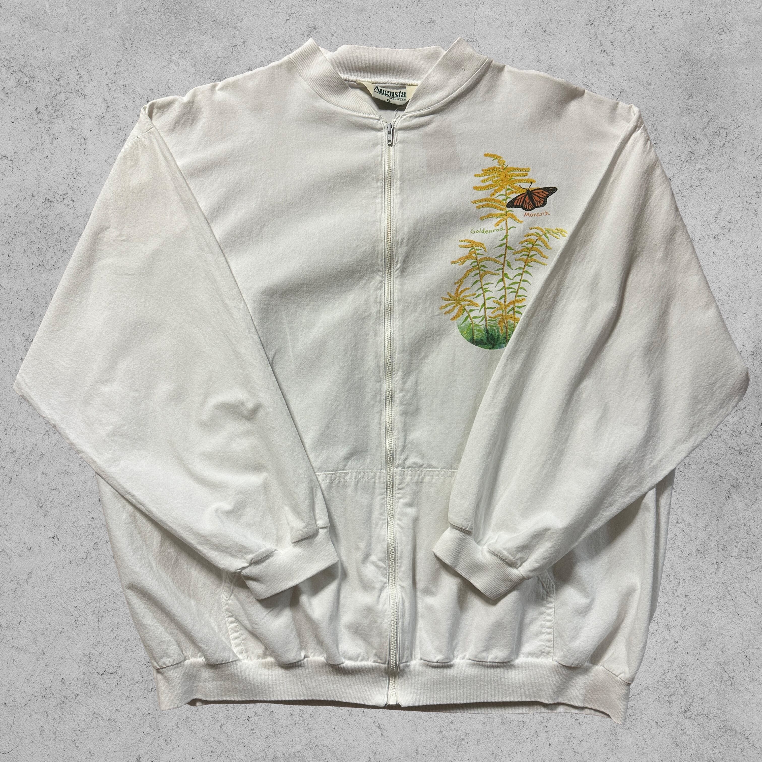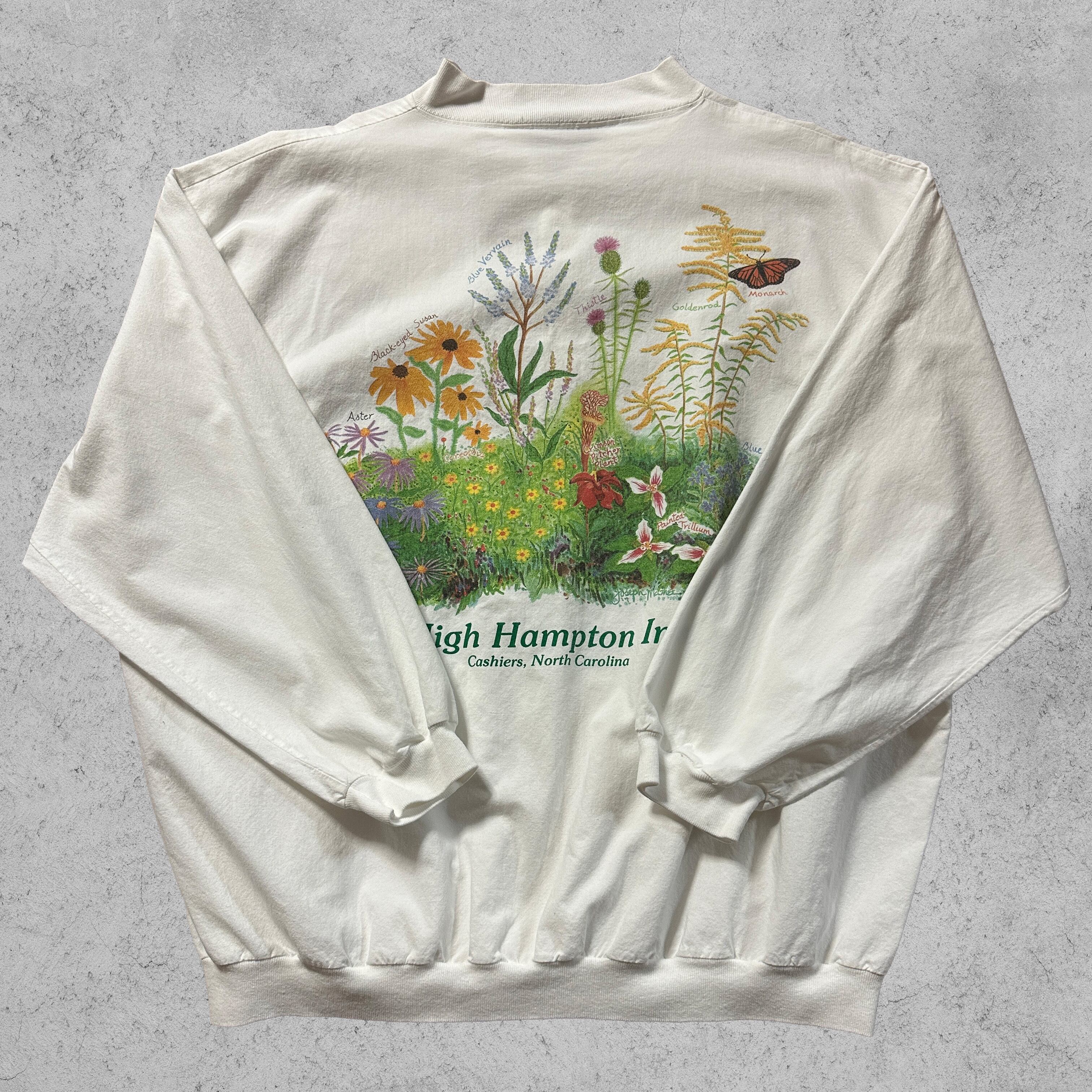 アメリカのホテル「High Hampton Inn(ノースカロライナ州)」のスーベニアスウェットジップ。フロントにはゴールデンロッドとモナーク蝶の小さなプリント、バックには草花が一面に描かれたカラフルな植物図鑑風のデザインモチーフが入る一枚。自然やボタニカルを題材にした珍しいスーベニアアイテムで、ボディは Augusta製 Made in U.S.A. のXLサイズ。