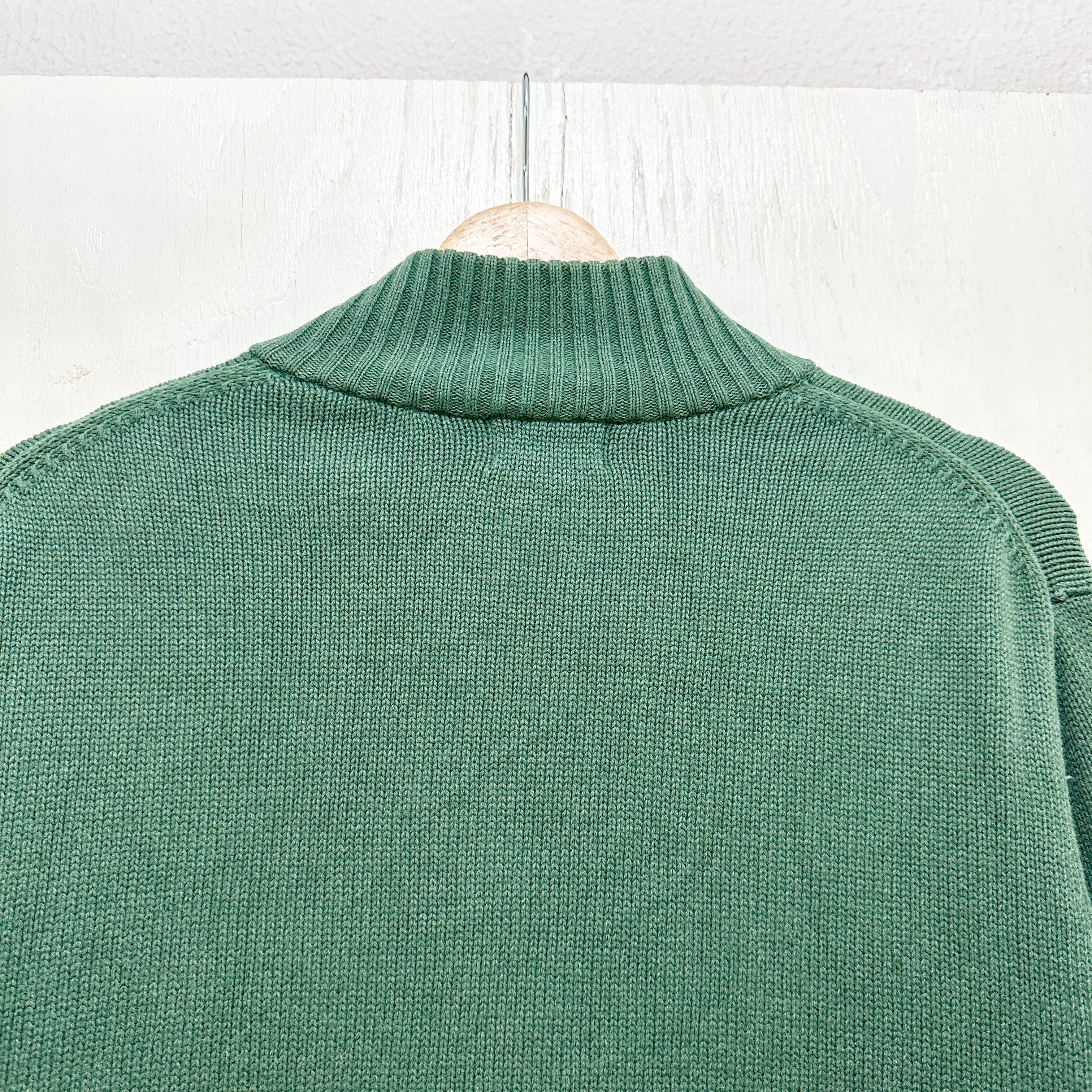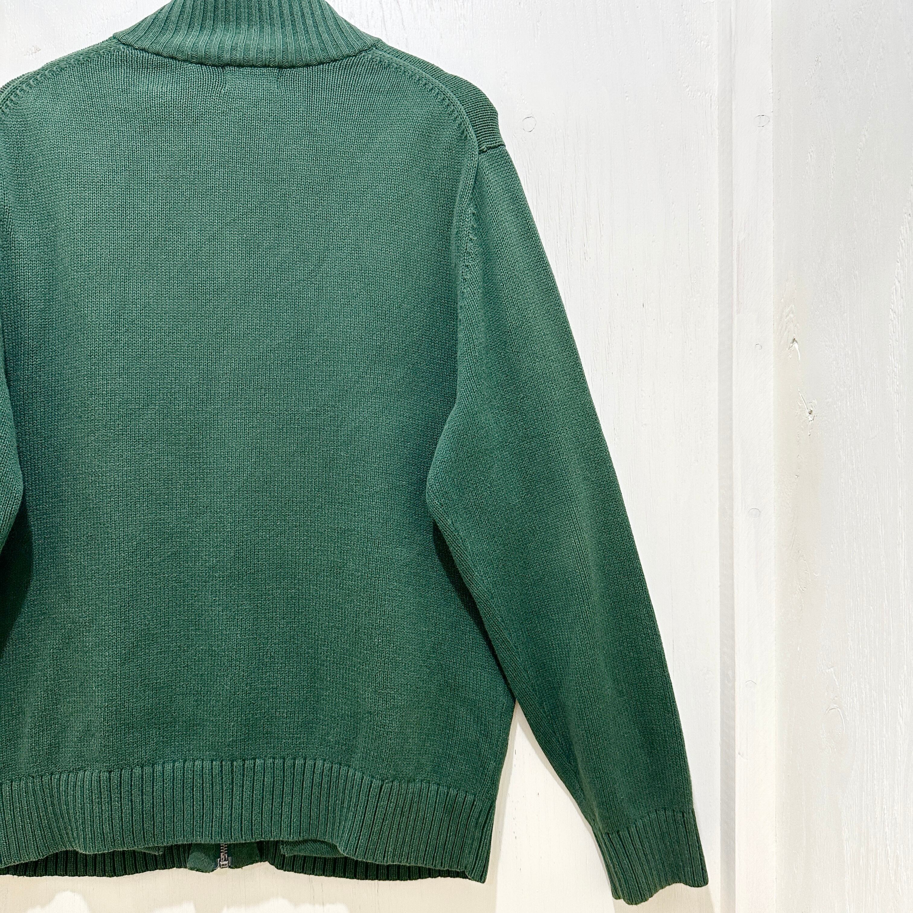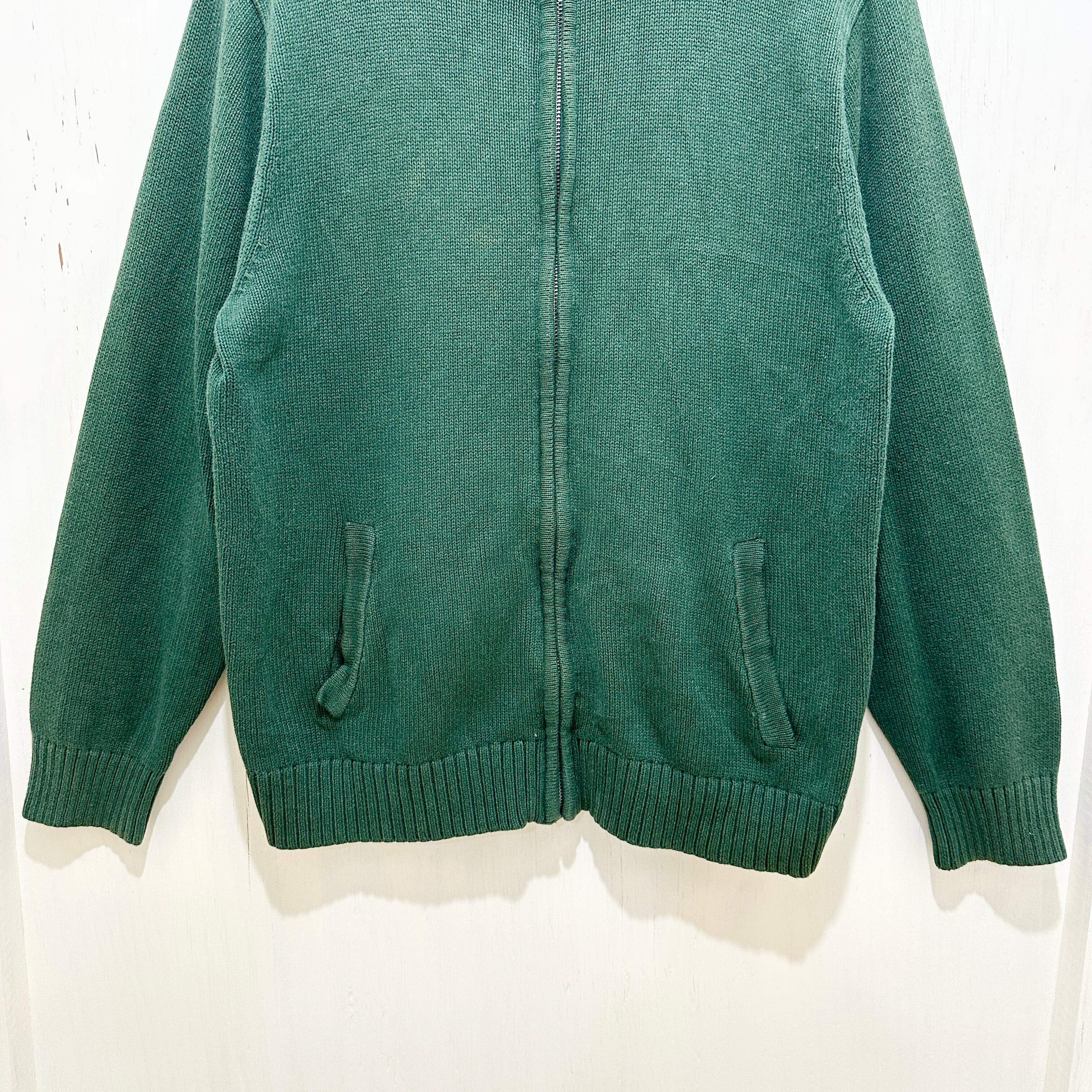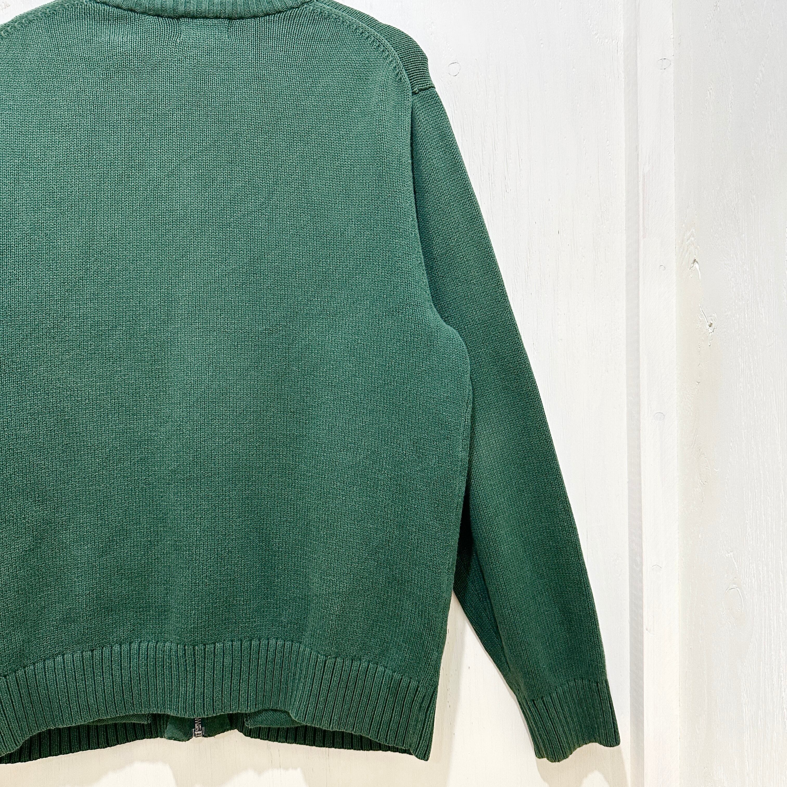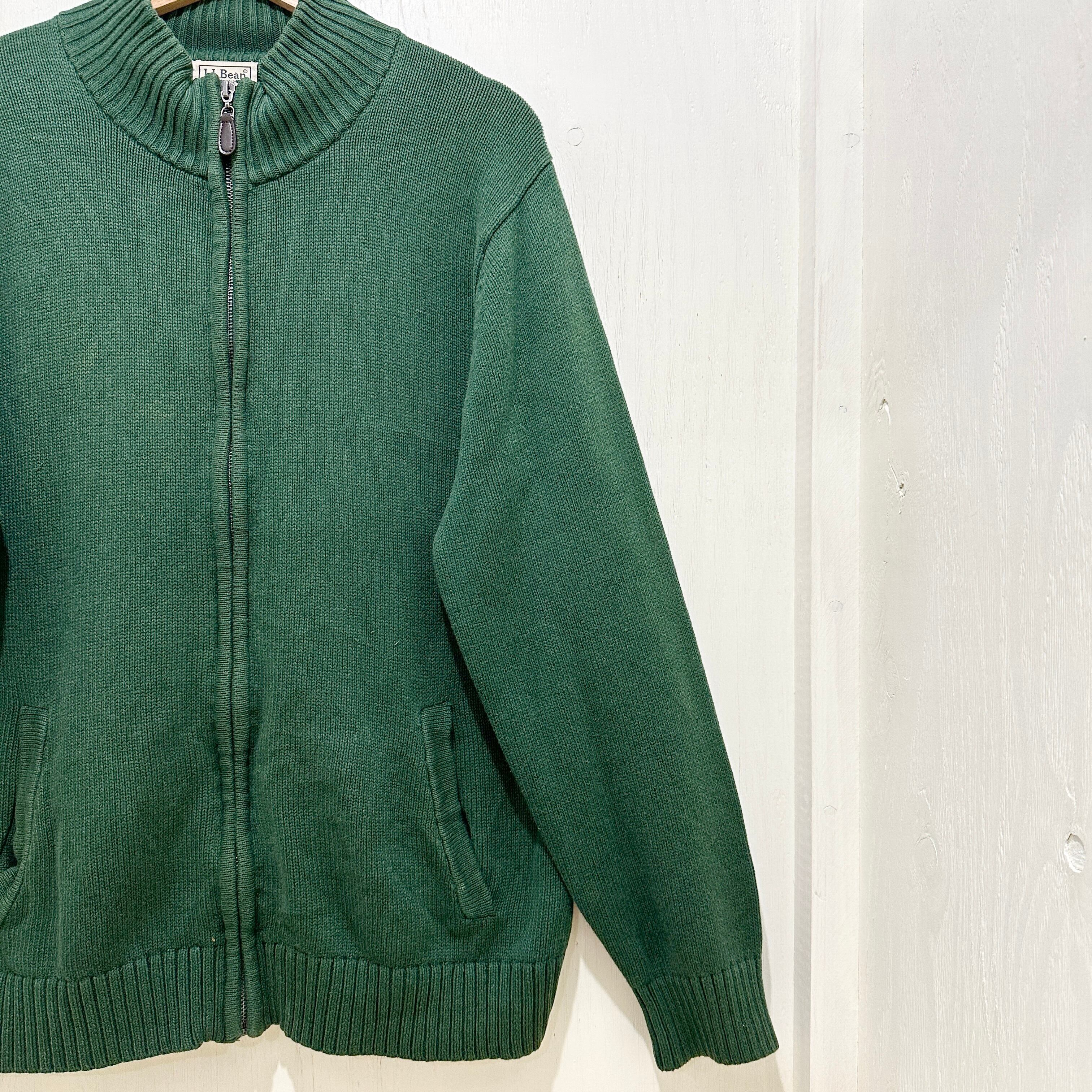 L.L.Beanのジップアップニットカーディガン。クラシックな深緑のボディに、肉厚なリブ襟とフロントポケットが映える一枚。素材は100%コットンで、しっかりした質感ながら柔らかく、春秋はアウターとして、冬はインナーとしても活躍。ジップにはレザープル付きで、無骨ながら上品なアクセントになっている。サイズ表記はL-REG、ゆったりしたシルエットで古着らしいリラックス感を楽しめる。アメカジやアウトドアスタイルにぴったりの万能アイテム。