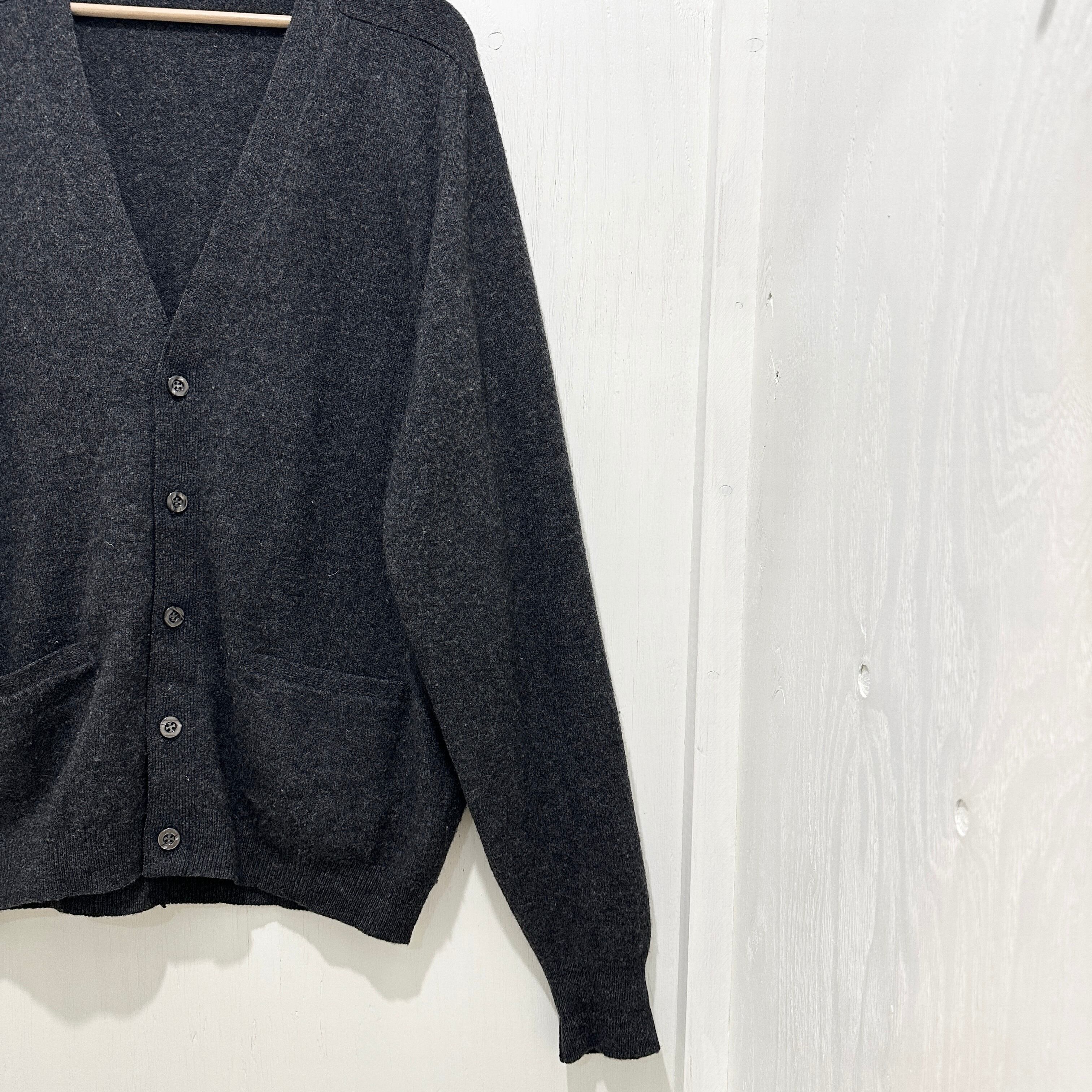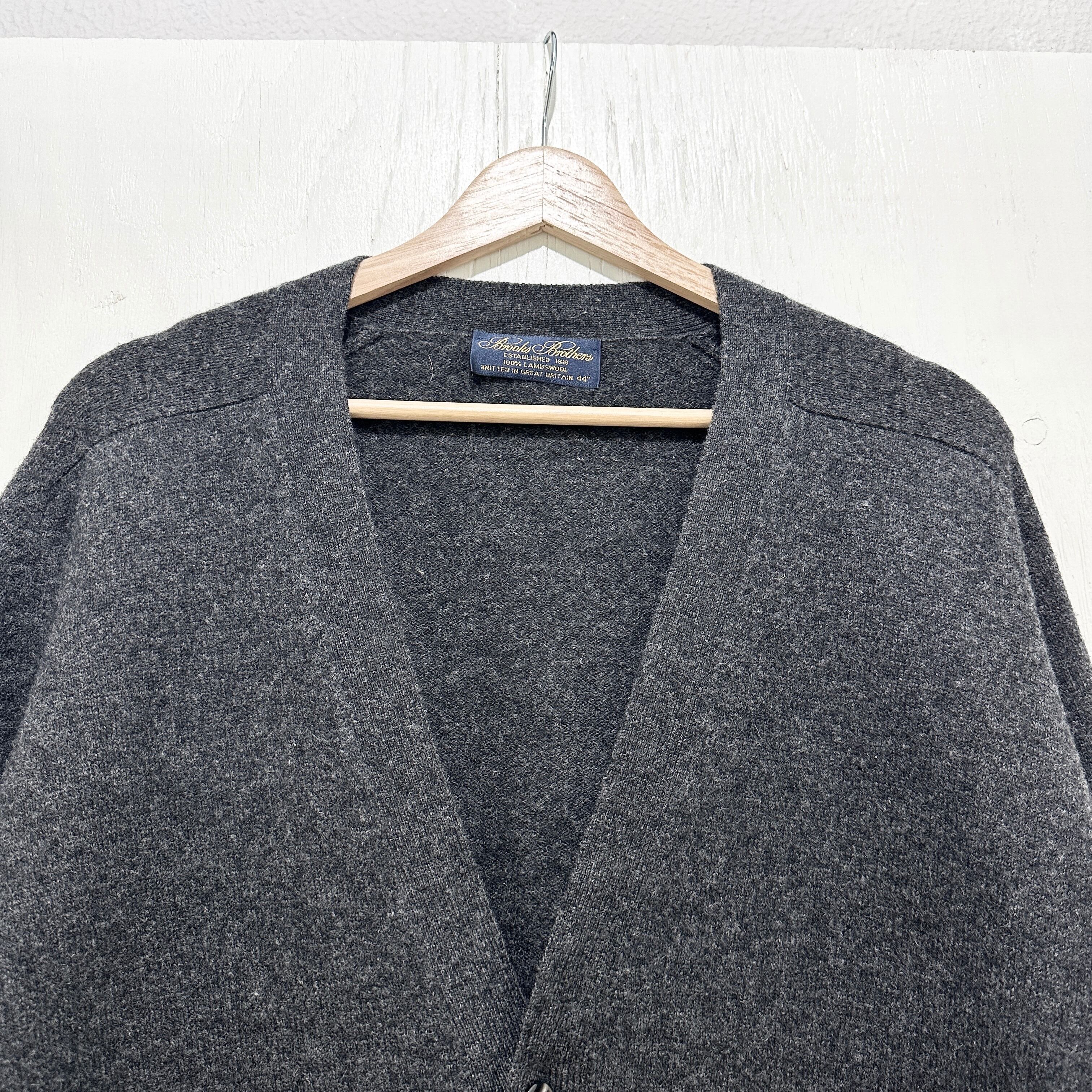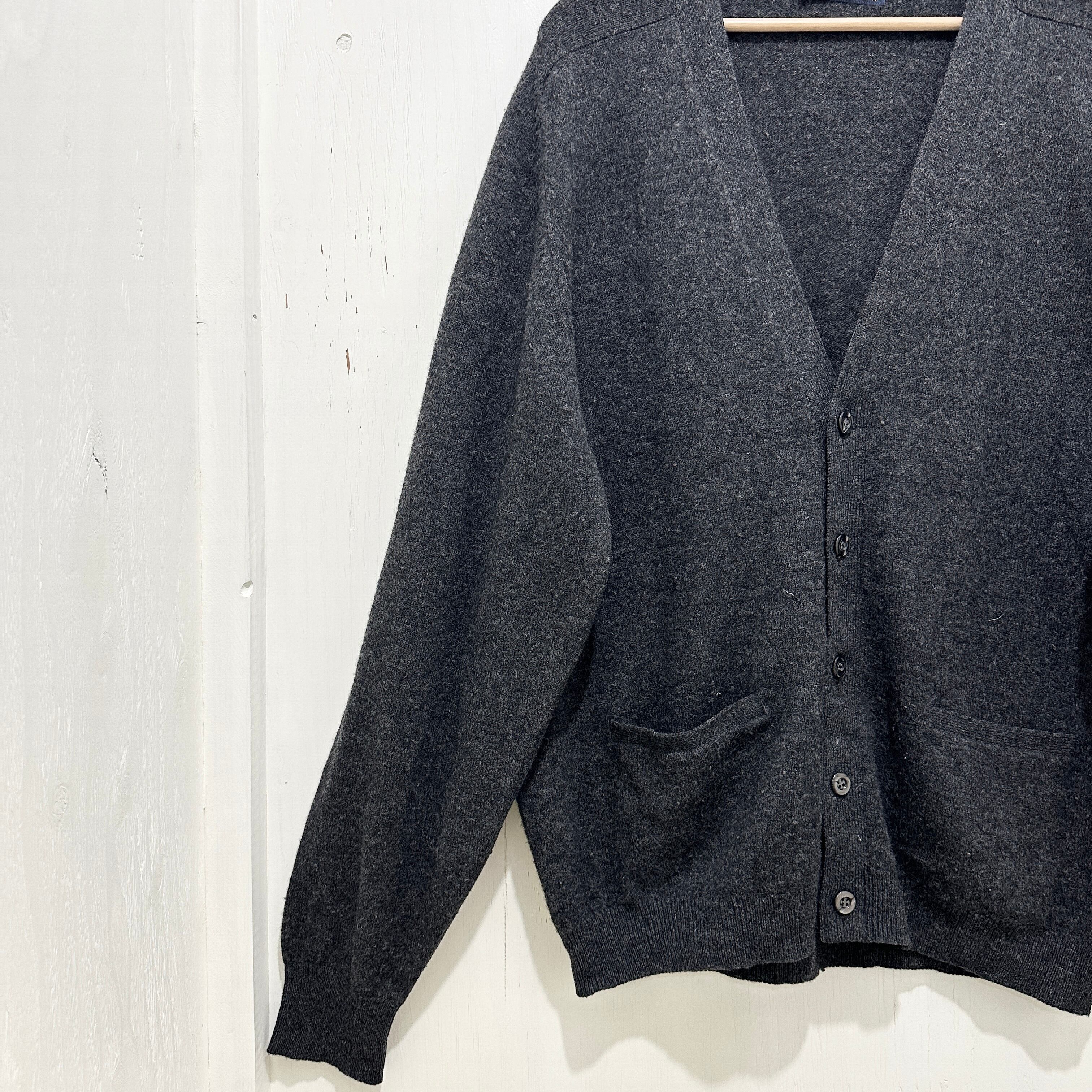 Brooks Brothers製、イギリス製のラムウールカーディガン。タグから90年代頃の個体と推定される。素材は100%ピュアラムズウールで、柔らかく暖かい質感。深めのVネックにフロントボタン、両サイドにはポケット付き。サイズ表記は44(EUR 52 / 112cm相当)で、ゆったりとしたシルエットが魅力。クラシックなグレーブラックカラーは合わせやすく、シャツやタートルネックとのレイヤードにも最適。アメリカントラッドを象徴する一枚。