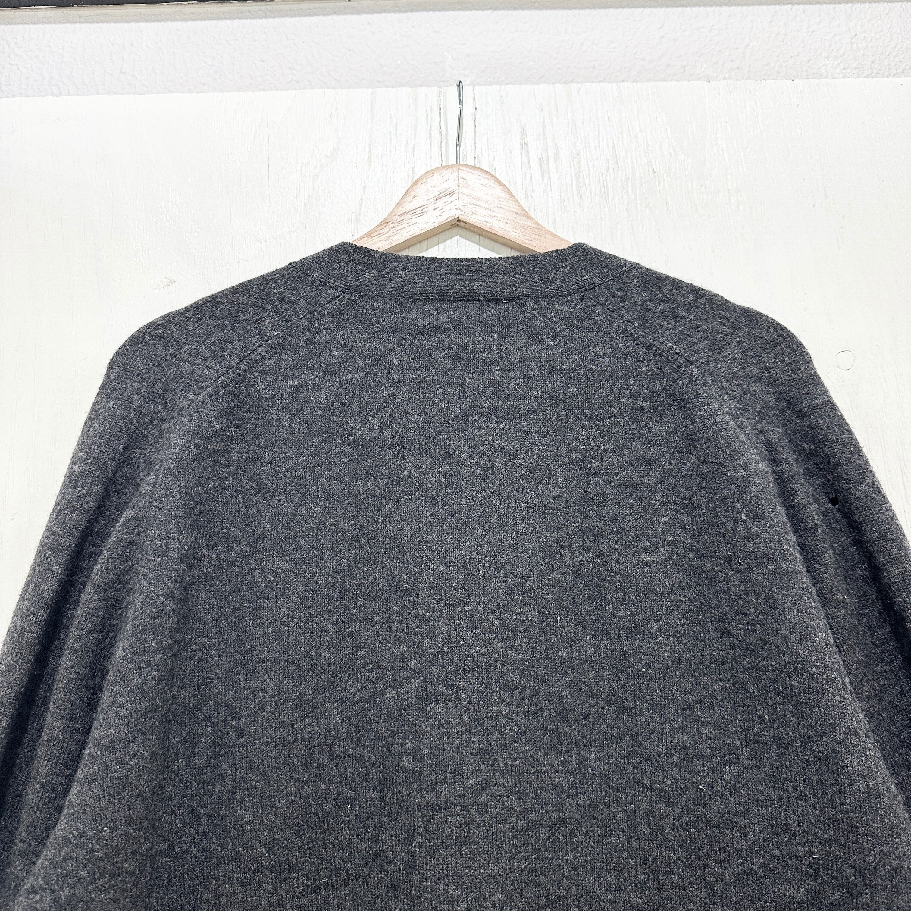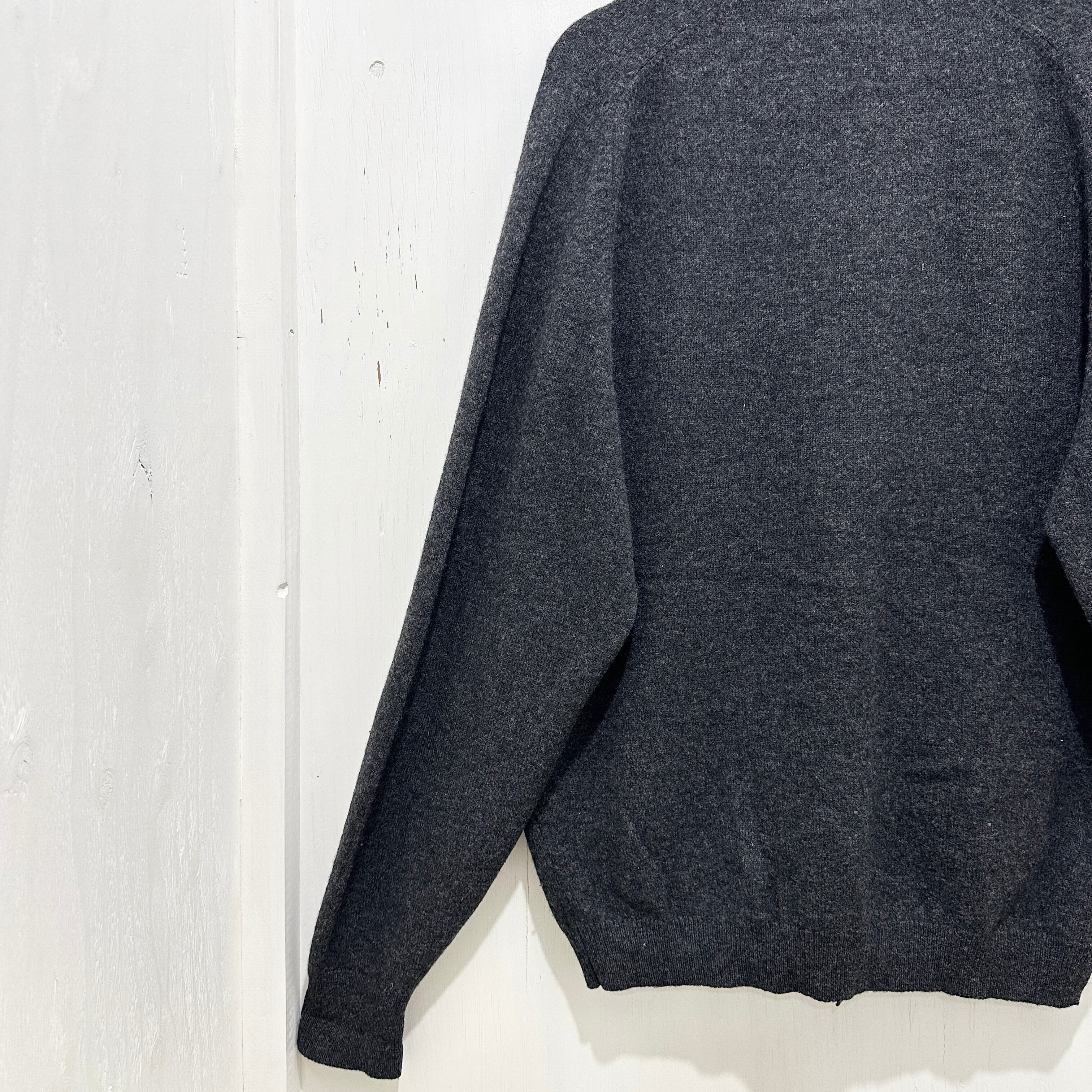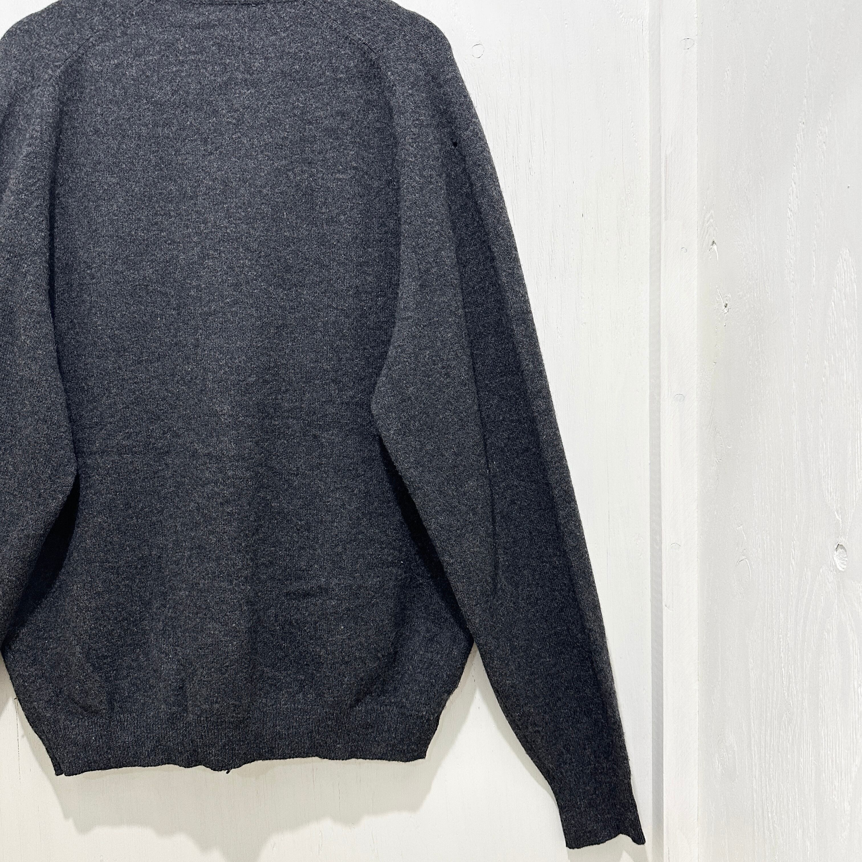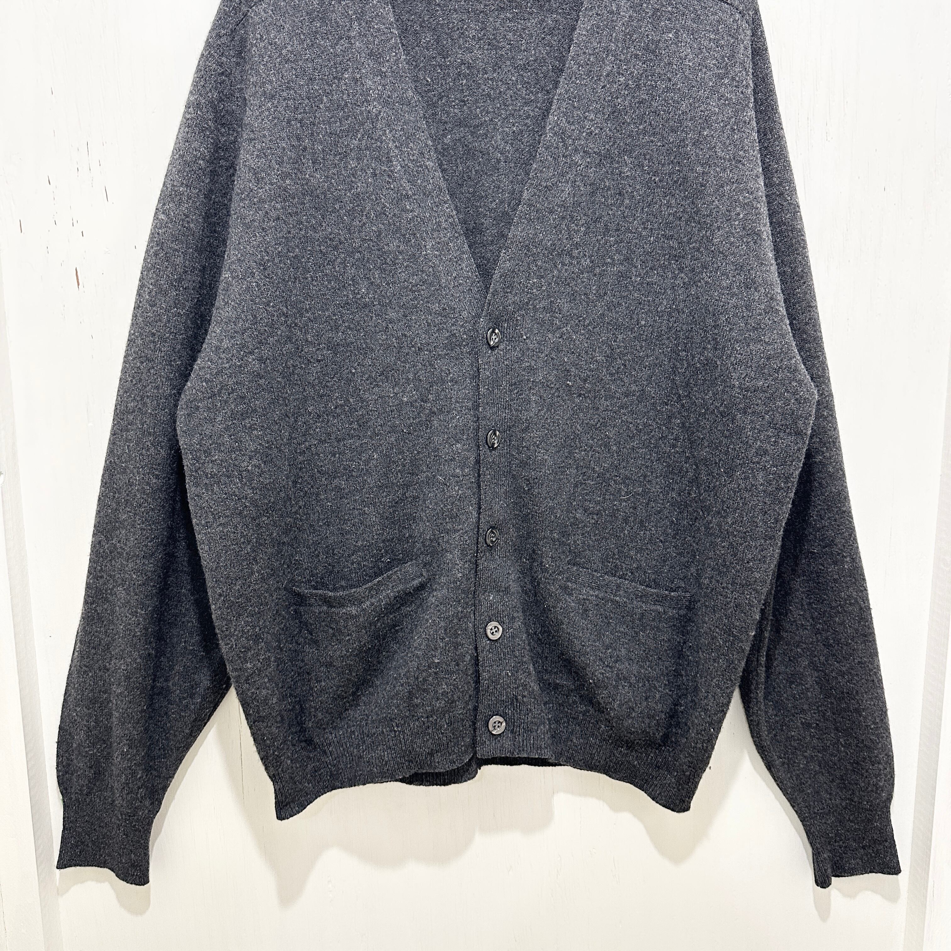 Brooks Brothers製、イギリス製のラムウールカーディガン。タグから90年代頃の個体と推定される。素材は100%ピュアラムズウールで、柔らかく暖かい質感。深めのVネックにフロントボタン、両サイドにはポケット付き。サイズ表記は44(EUR 52 / 112cm相当)で、ゆったりとしたシルエットが魅力。クラシックなグレーブラックカラーは合わせやすく、シャツやタートルネックとのレイヤードにも最適。アメリカントラッドを象徴する一枚。