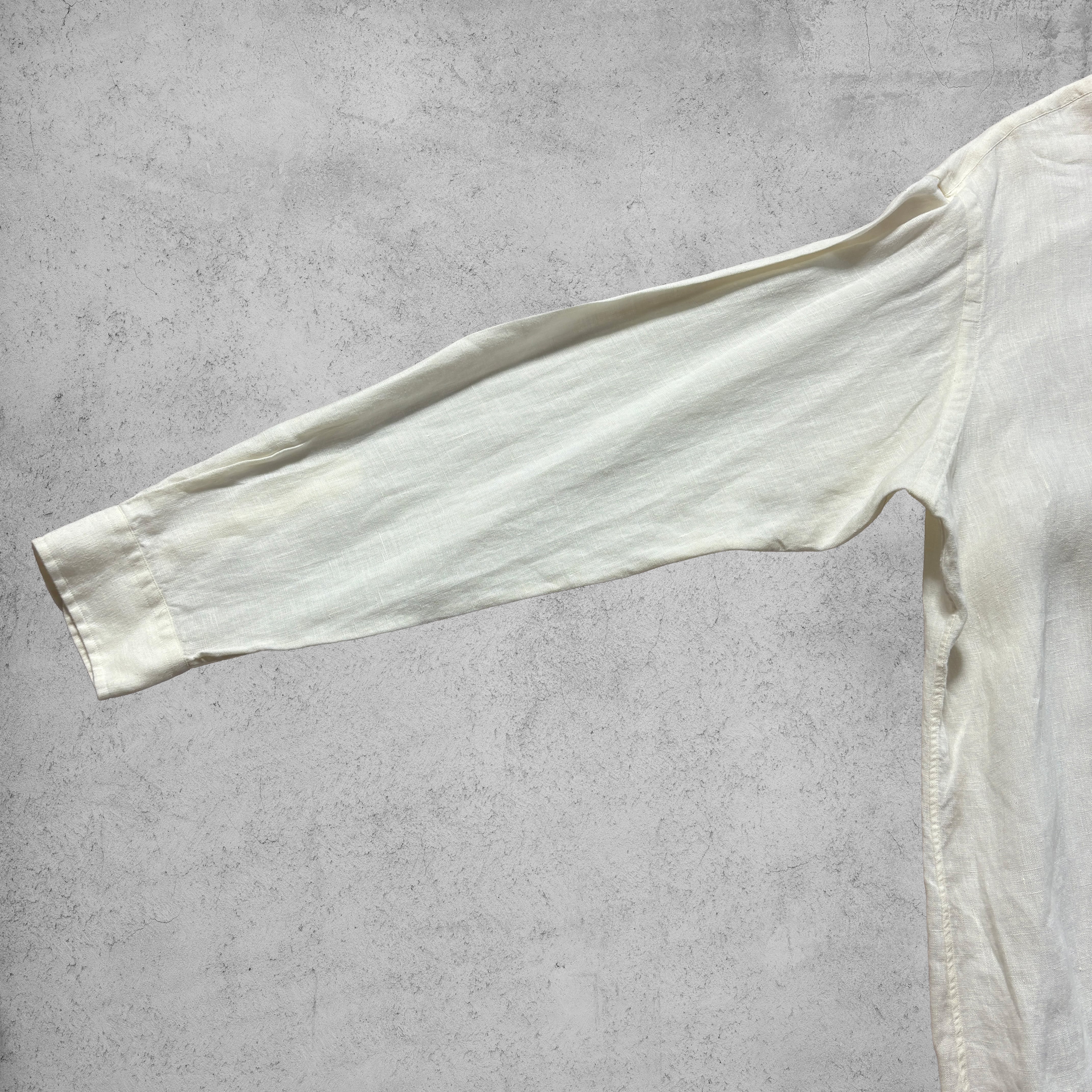 素材は リネン100% で、通気性に優れた涼しげな着心地。やや生成りがかったホワイトカラーで、夏場の軽快なスタイリングにぴったり。