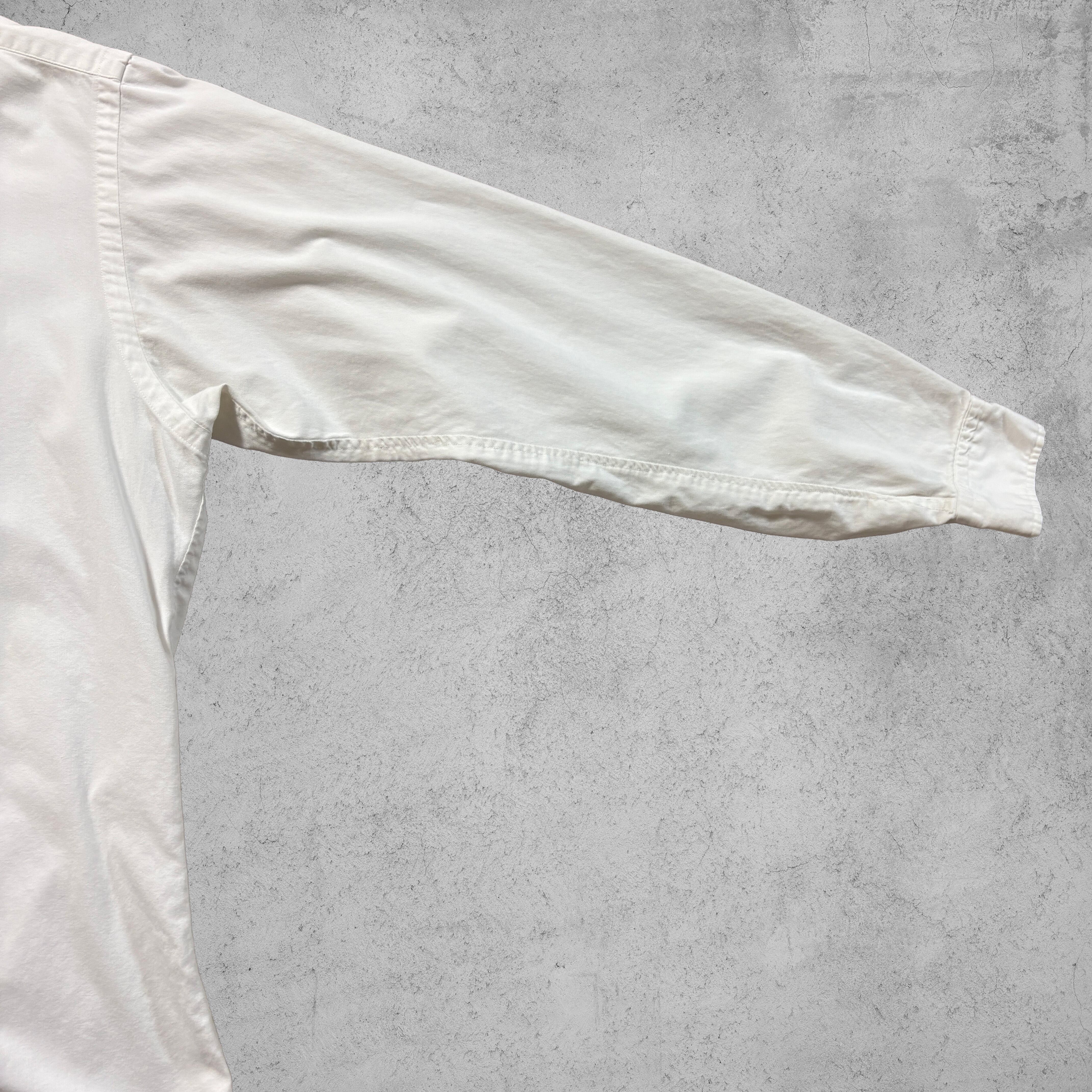 素材はコットン100%のオックスフォード地で、ほどよい厚みとハリ感があり、一枚でもジャケットインでも着こなしやすい。サイズはXLで、ゆったりめのシルエット。現代的なオーバーサイズ風の着こなしにも相性が良い。