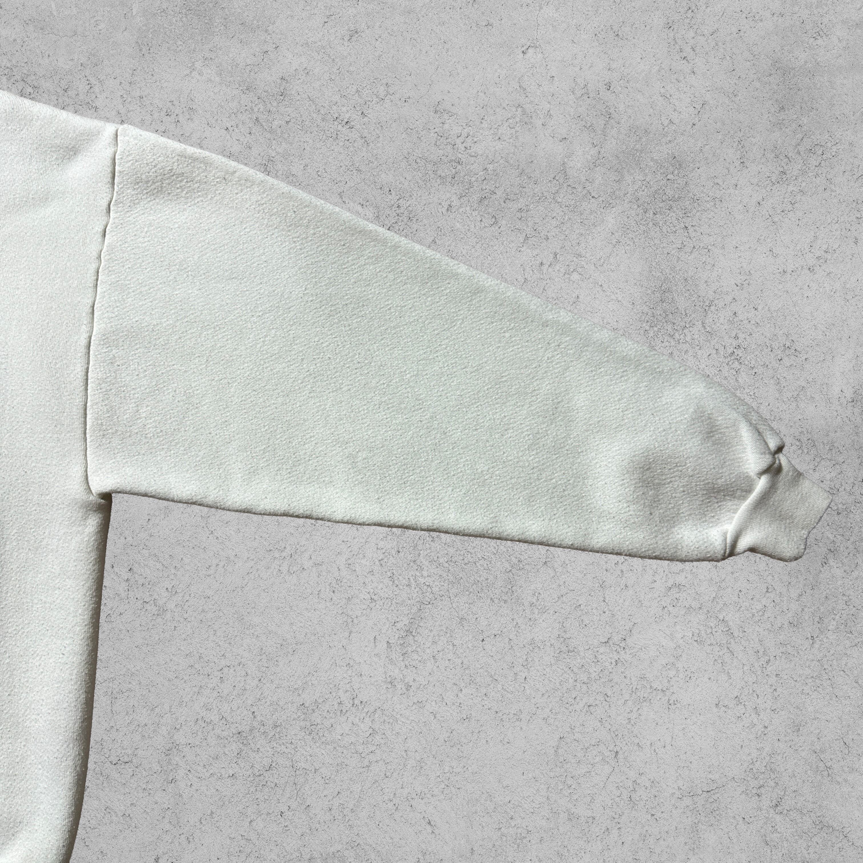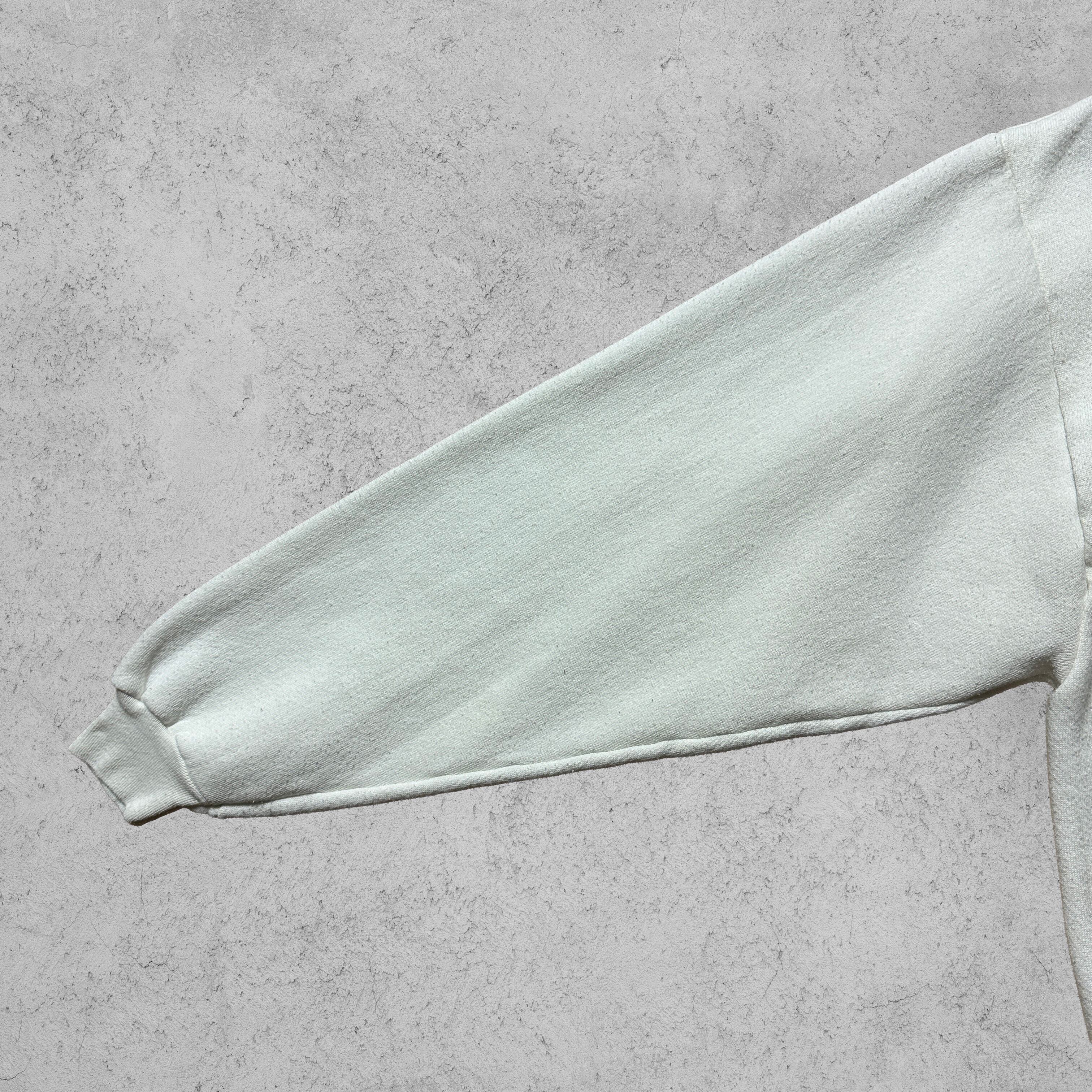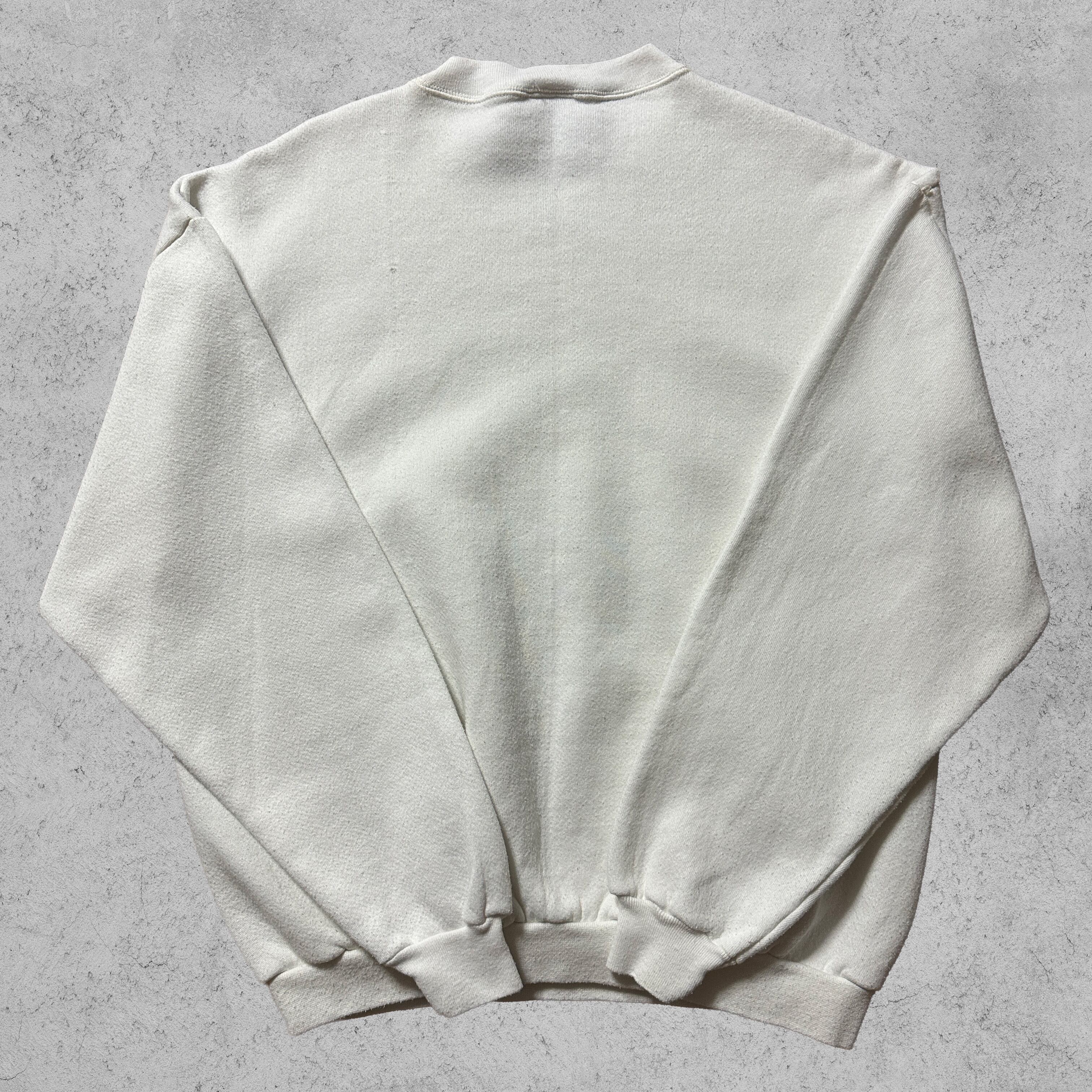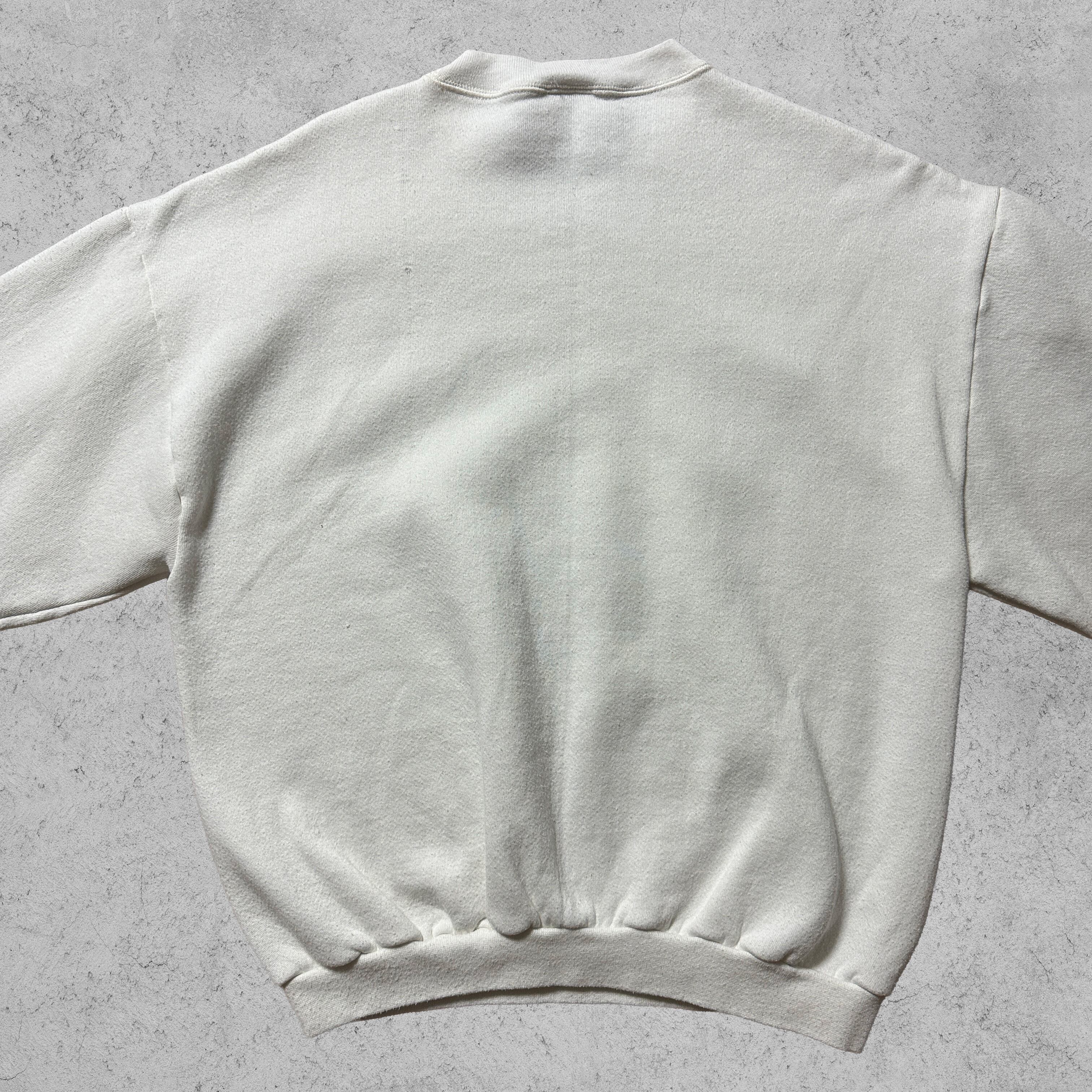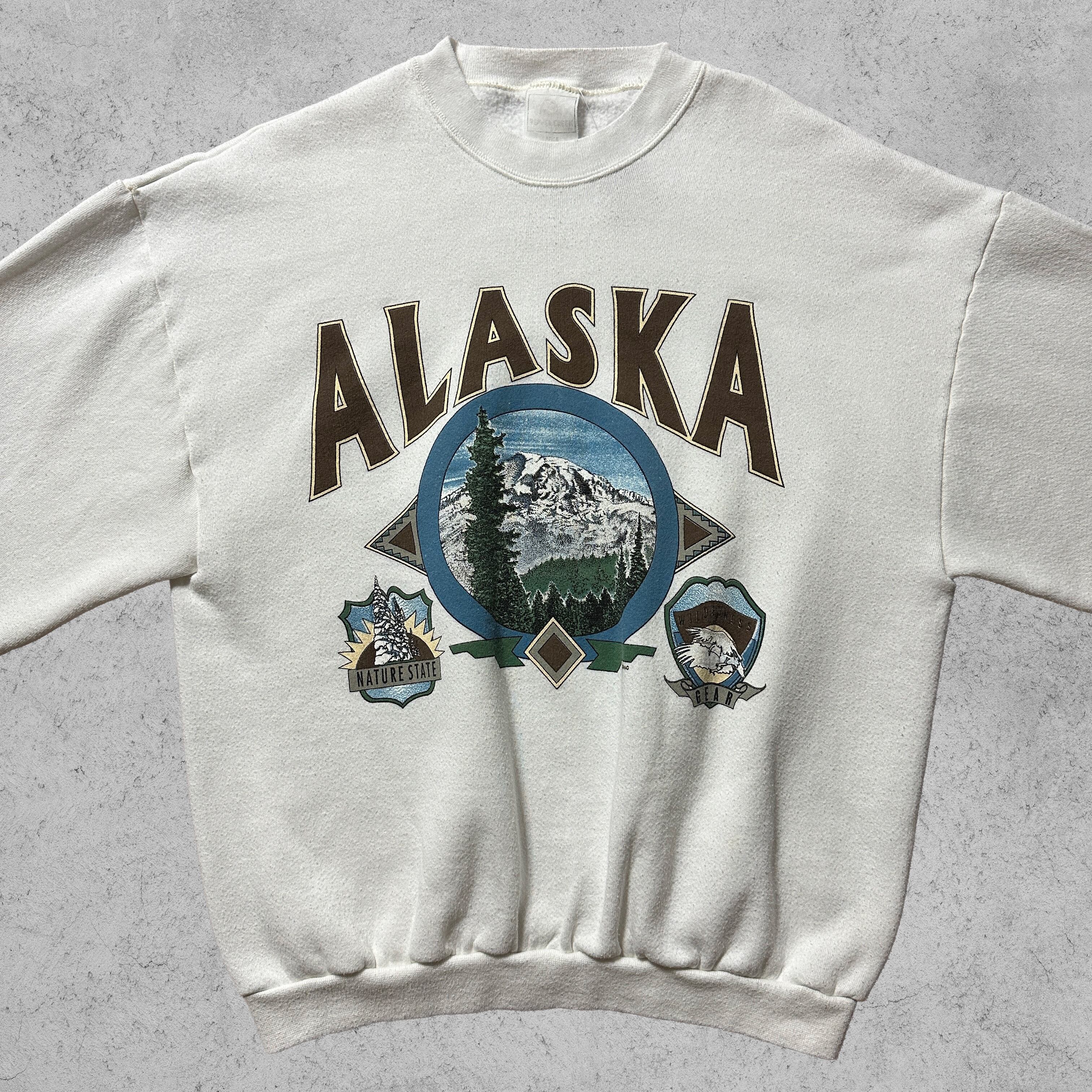 アラスカの大自然を描いた風景プリントがフロントに大胆に配置されたスウェット。ホワイトボディにブラウン&ブルーの配色で、90’sらしいアウトドアテイストが魅力。タグ表記はやや薄れていますが、MADE IN U.S.A. の文字が確認できる一枚。素材はコットン50%・ポリエステル50%で、アメリカ製特有のしっかりとした生地感。裏起毛で暖かく、ゆったりしたシルエットがヴィンテージ好きにも刺さるアイテム。