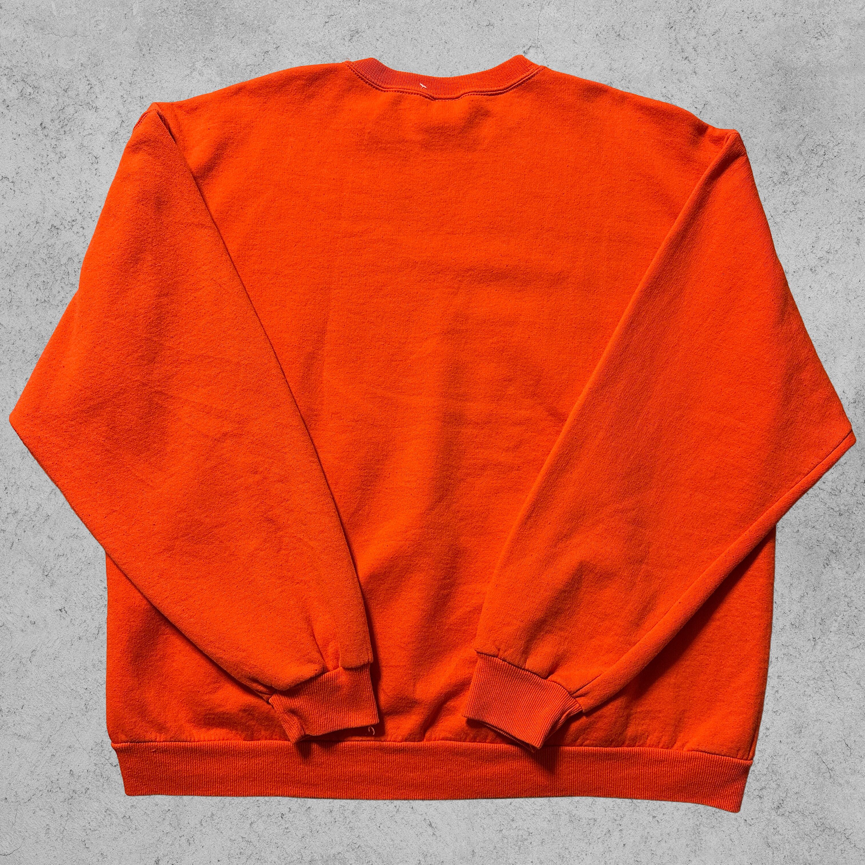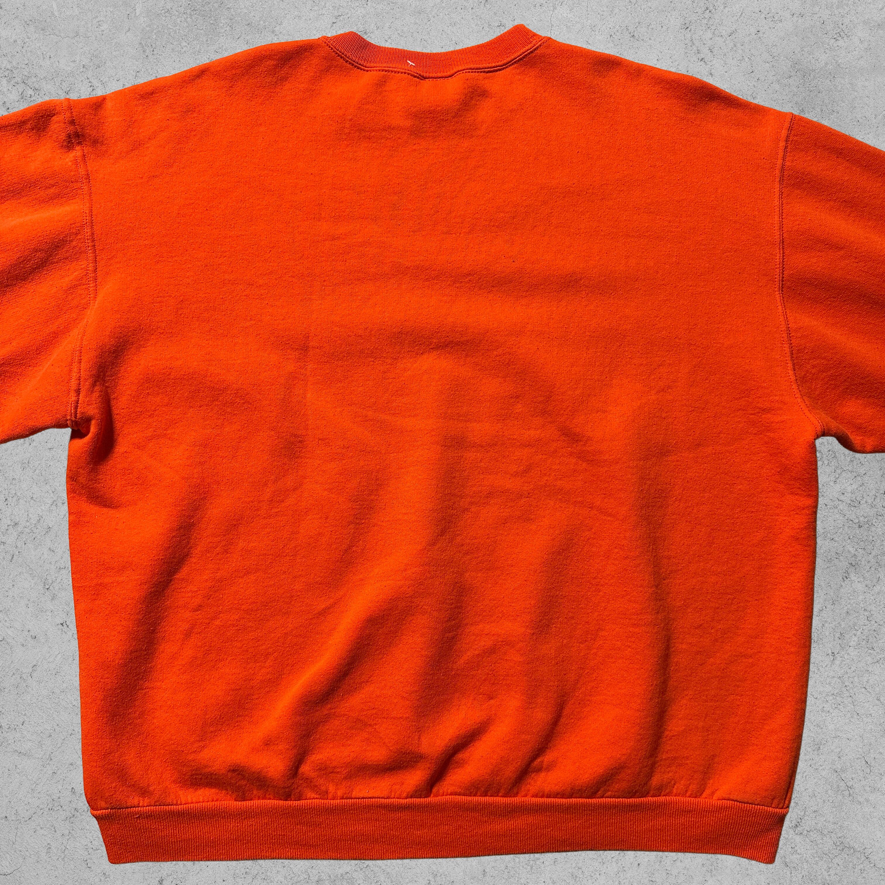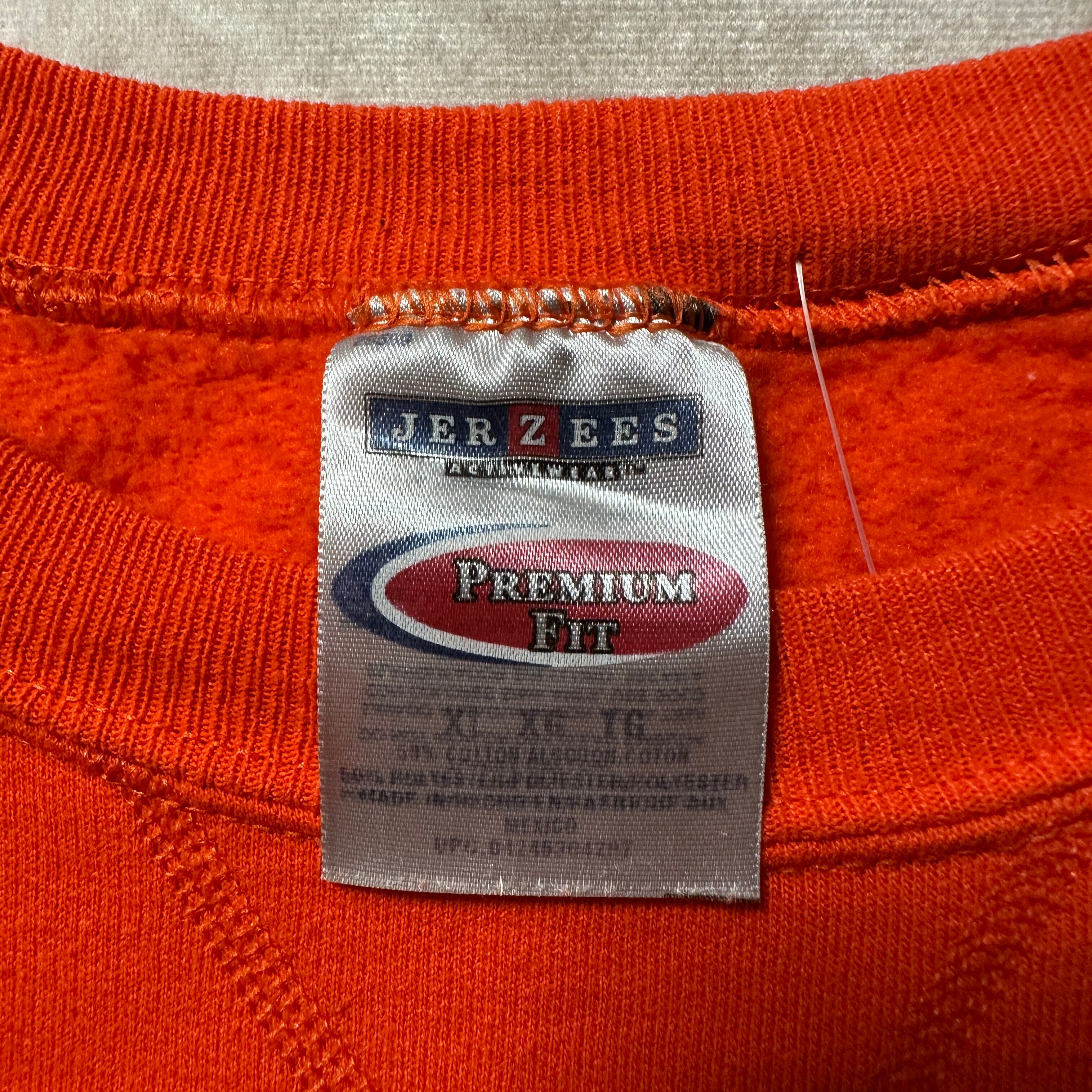Jerzeesの「PREMIUM FIT」スウェット。オレンジボディにクラシックな無地仕様、90s〜00sらしいルーズシルエット。胸元にはVガゼット入りで、スポーツ×カジュアルな空気感。ボディはコットン50%・ポリエステル50%、裏起毛であたたかく、デイリーにも部屋着にもフィット。メキシコ製のXLサイズで、アメカジ古着らしい存在感を放つ一枚。