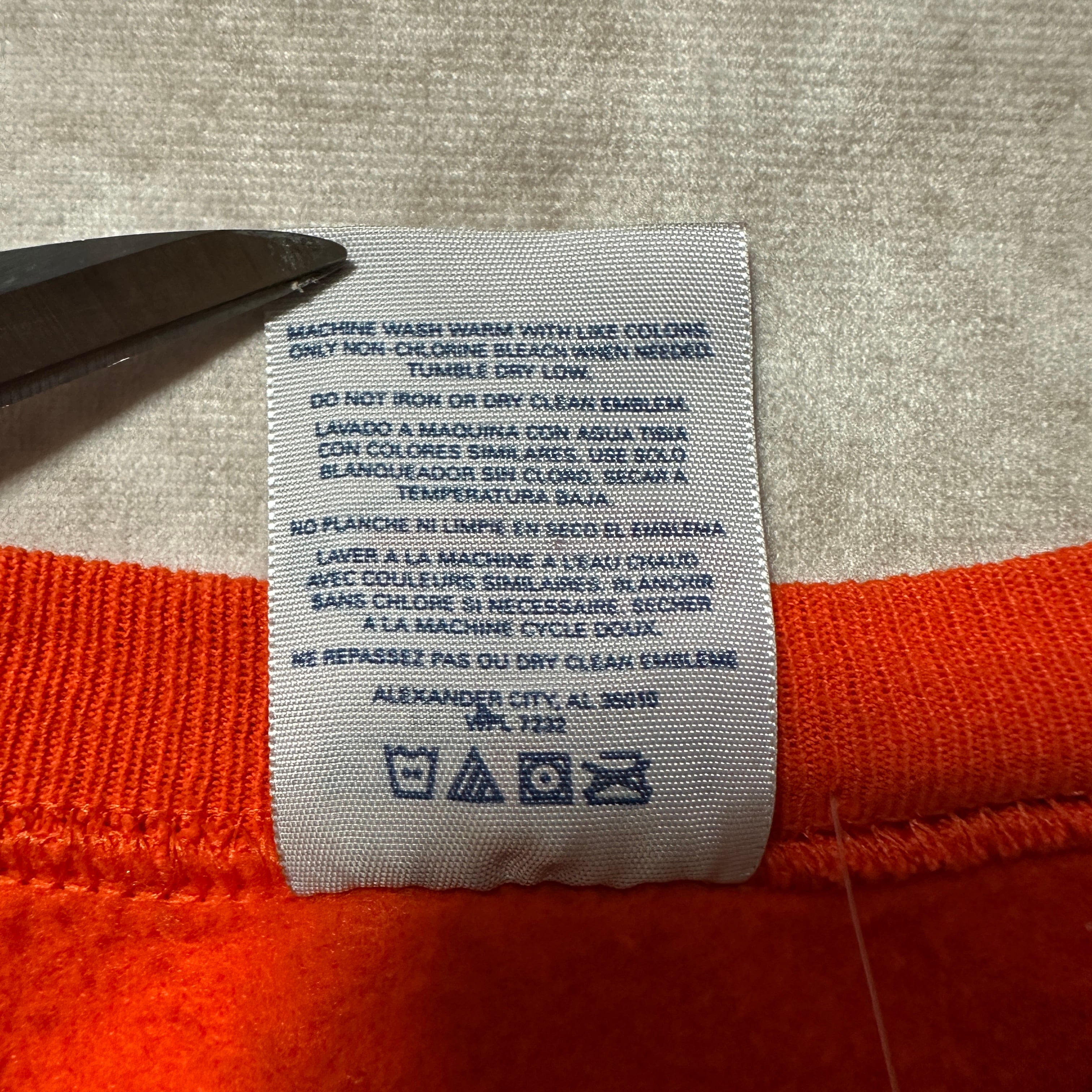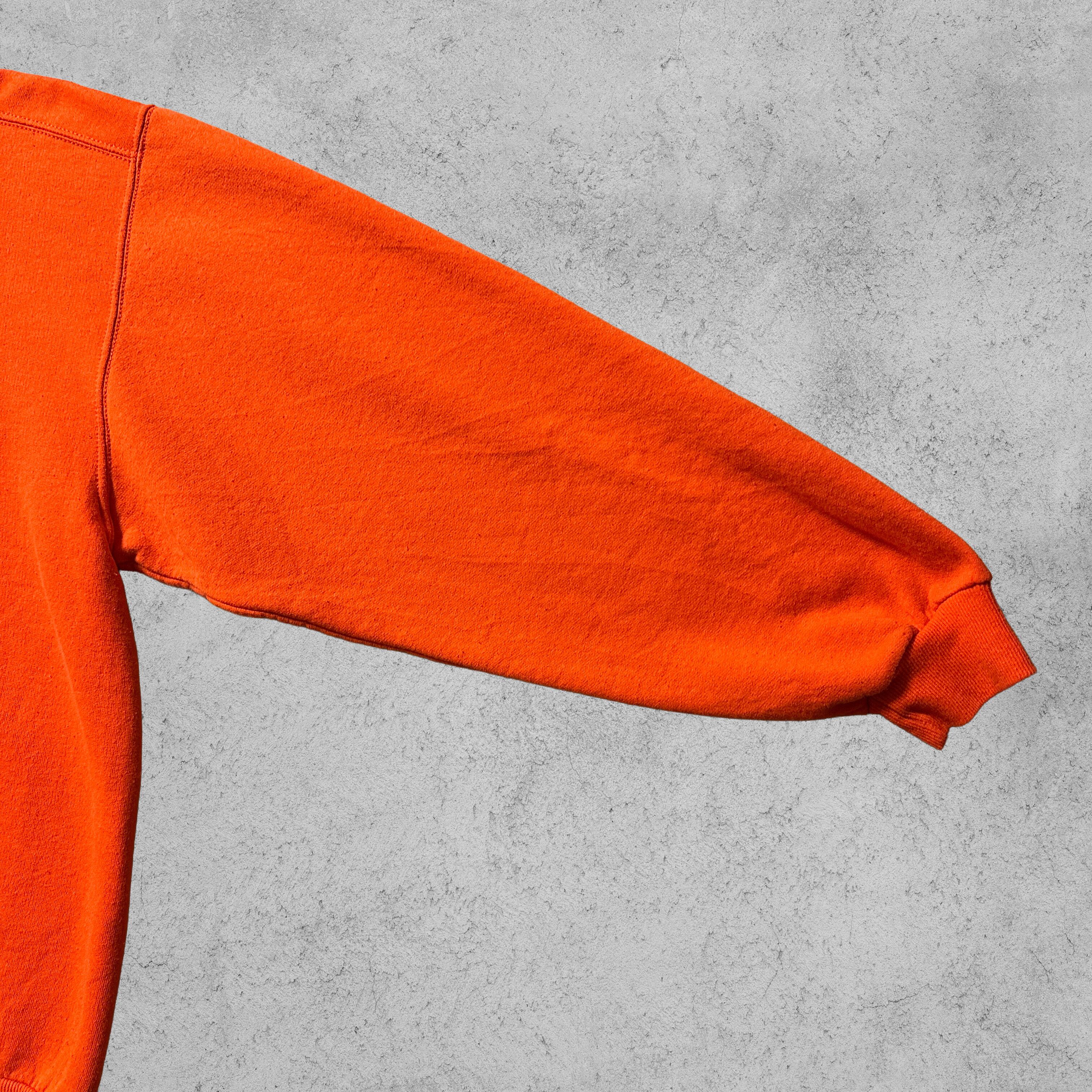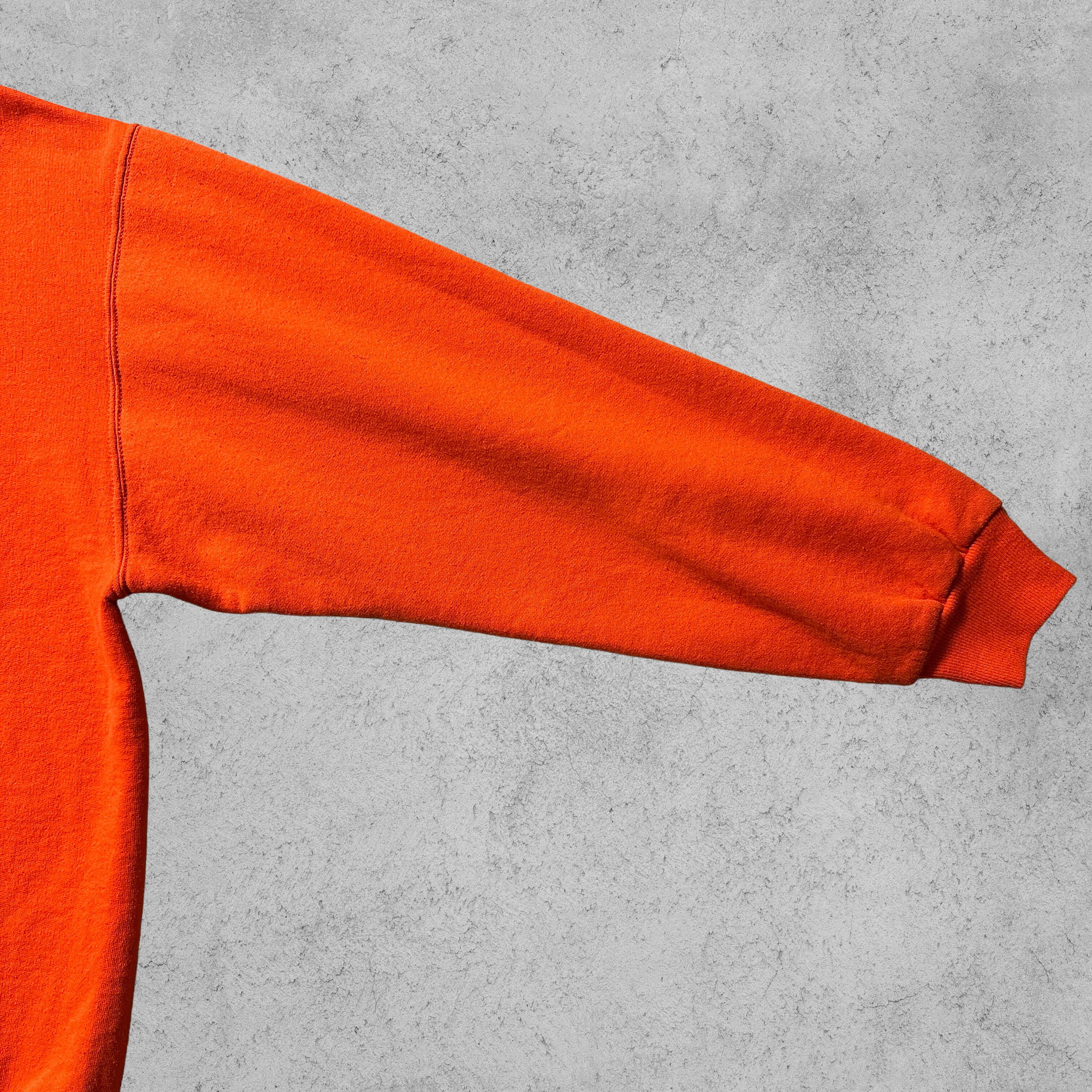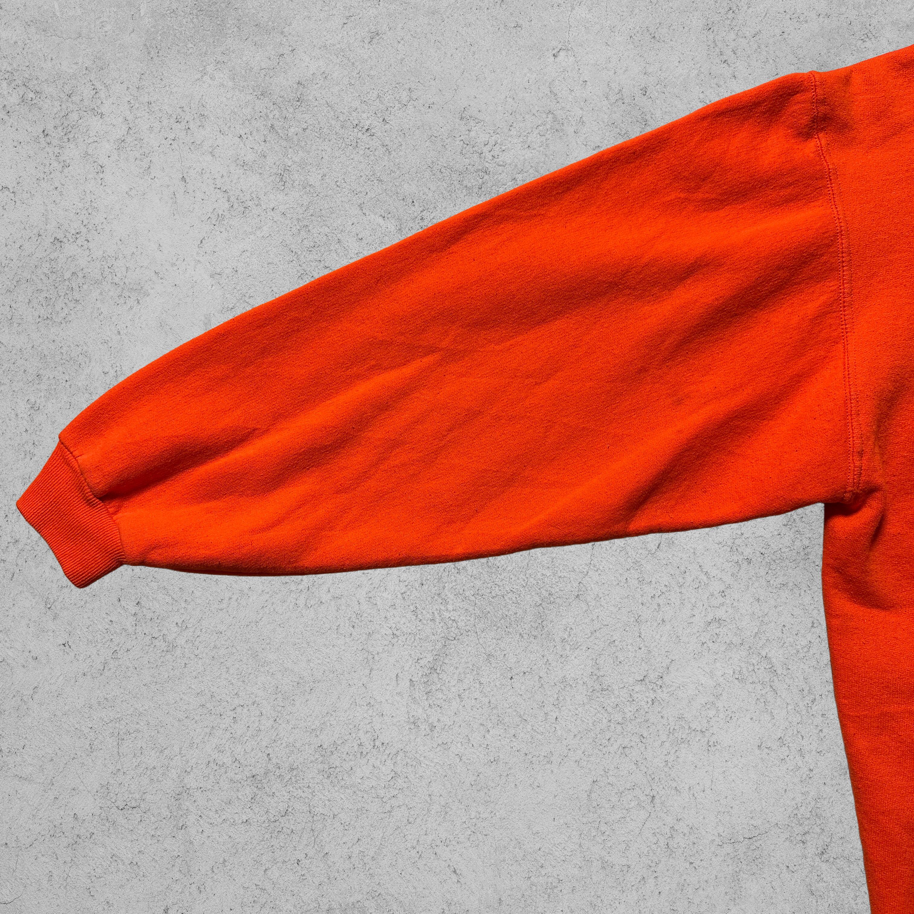 Jerzeesの「PREMIUM FIT」スウェット。オレンジボディにクラシックな無地仕様、90s〜00sらしいルーズシルエット。胸元にはVガゼット入りで、スポーツ×カジュアルな空気感。ボディはコットン50%・ポリエステル50%、裏起毛であたたかく、デイリーにも部屋着にもフィット。メキシコ製のXLサイズで、アメカジ古着らしい存在感を放つ一枚。