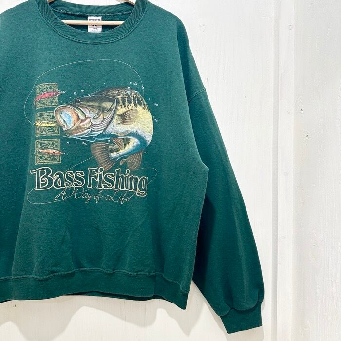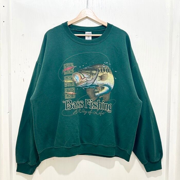 90sらしい存在感あるプリントで、フィッシング好きはもちろん、アメカジ古着のストリートコーデにもバッチリはまる1枚。ボディは「JERZEES / NuBlend」タグ、ホンジュラス製のXLサイズで、ゆったり着こなせるビッグシルエット仕様。