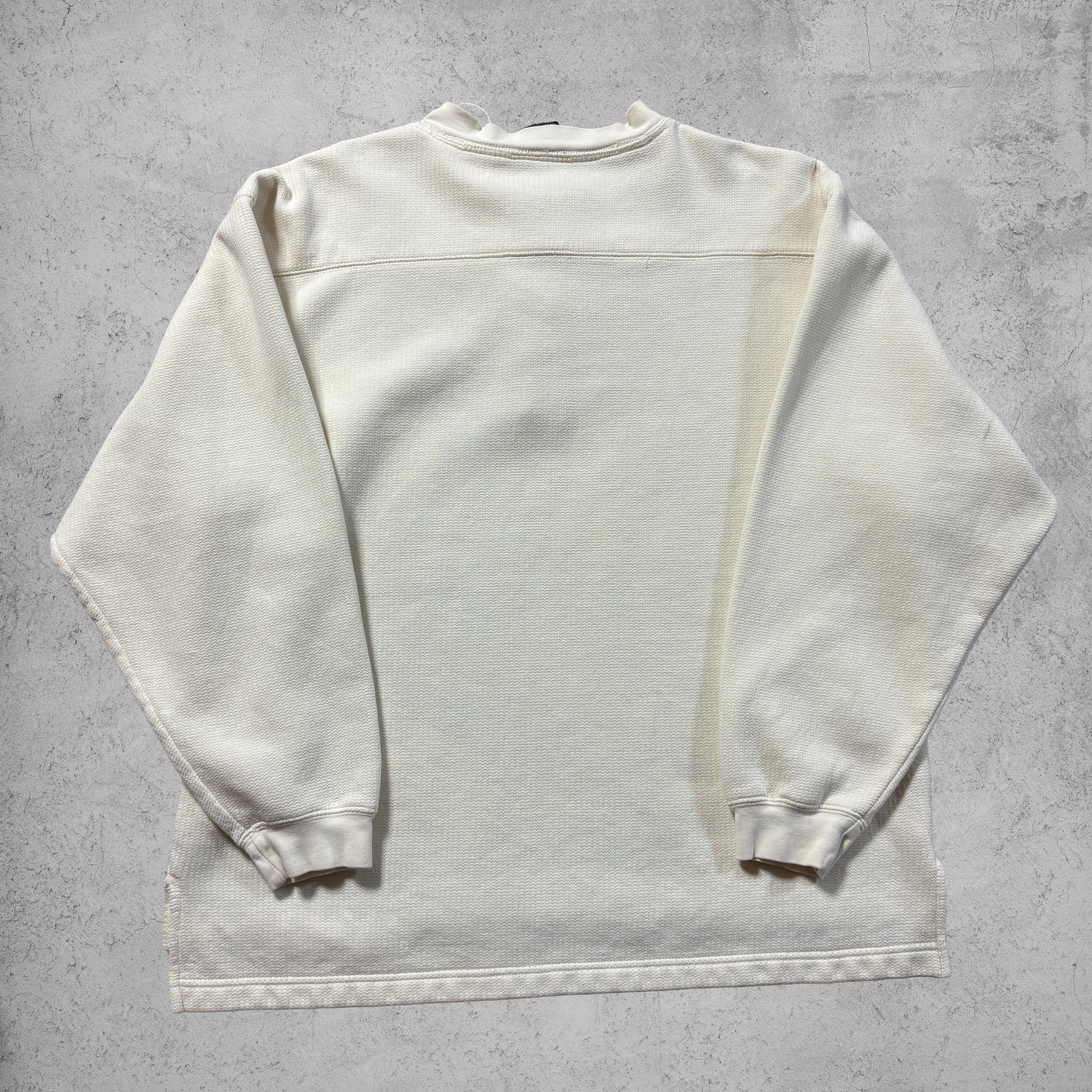コットン80%・ポリエステル20%のしっかり素材。裾リブは緩めでリラックス感あり、古着ミックスやアメカジスタイルにばっちりハマる一枚。NFLファンはもちろん、普段使いにも◎。