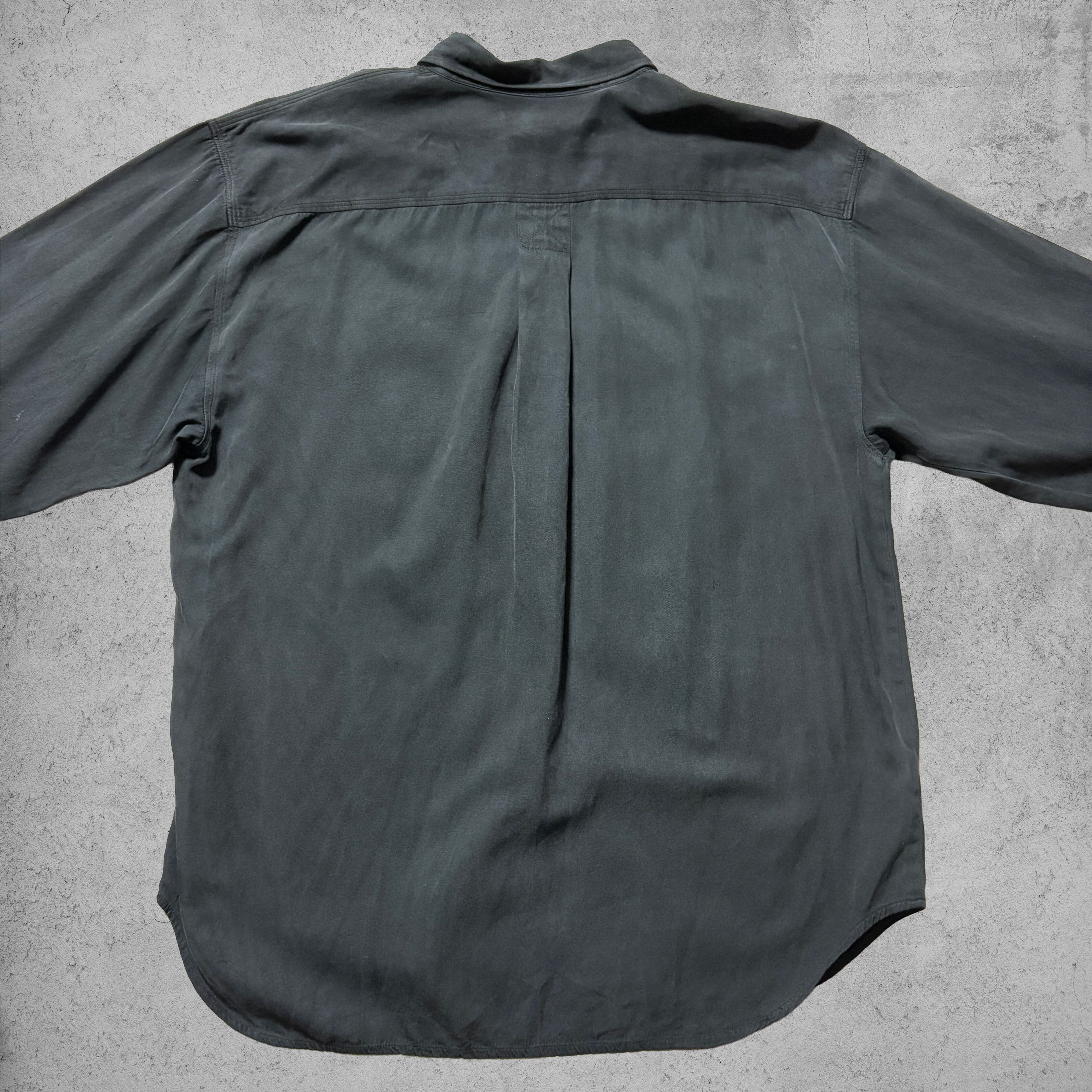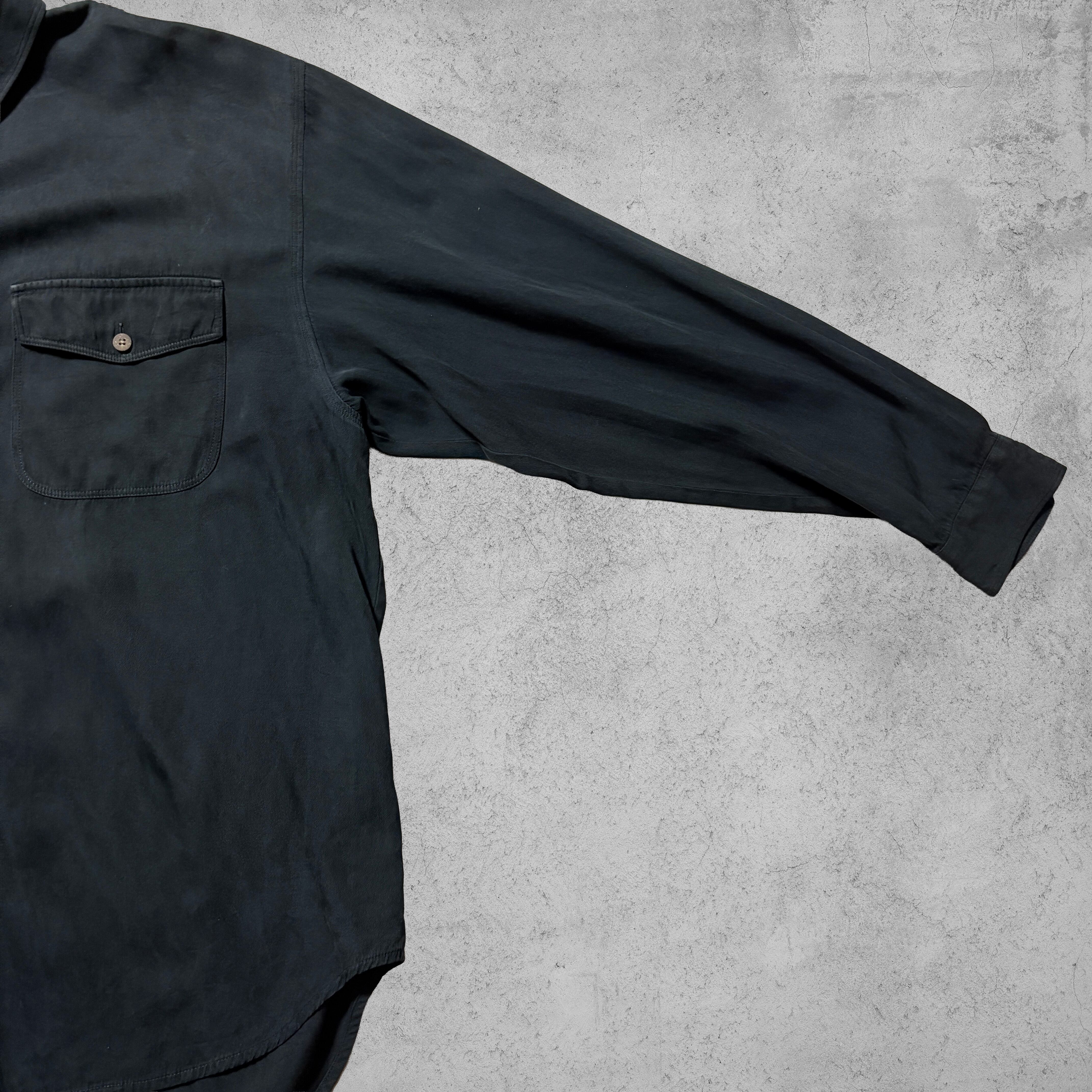 Tommy Bahamaの上質なリゾートラインから、ブラックカラーのシルク混長袖シャツ。70%シルク・30%コットンのしなやかな生地感が特徴で、落ち感がありながらも適度にハリを残した豪華な質感。両胸にフラップポケットを備えたワークテイスト寄りのデザインだが、素材の上品さがカジュアルすぎない大人のリゾートスタイルを演出する。サイズはXLでゆったりした着用感。リゾートやタウンユースはもちろん、軽い羽織りとしてジャケットライクに使える一枚。