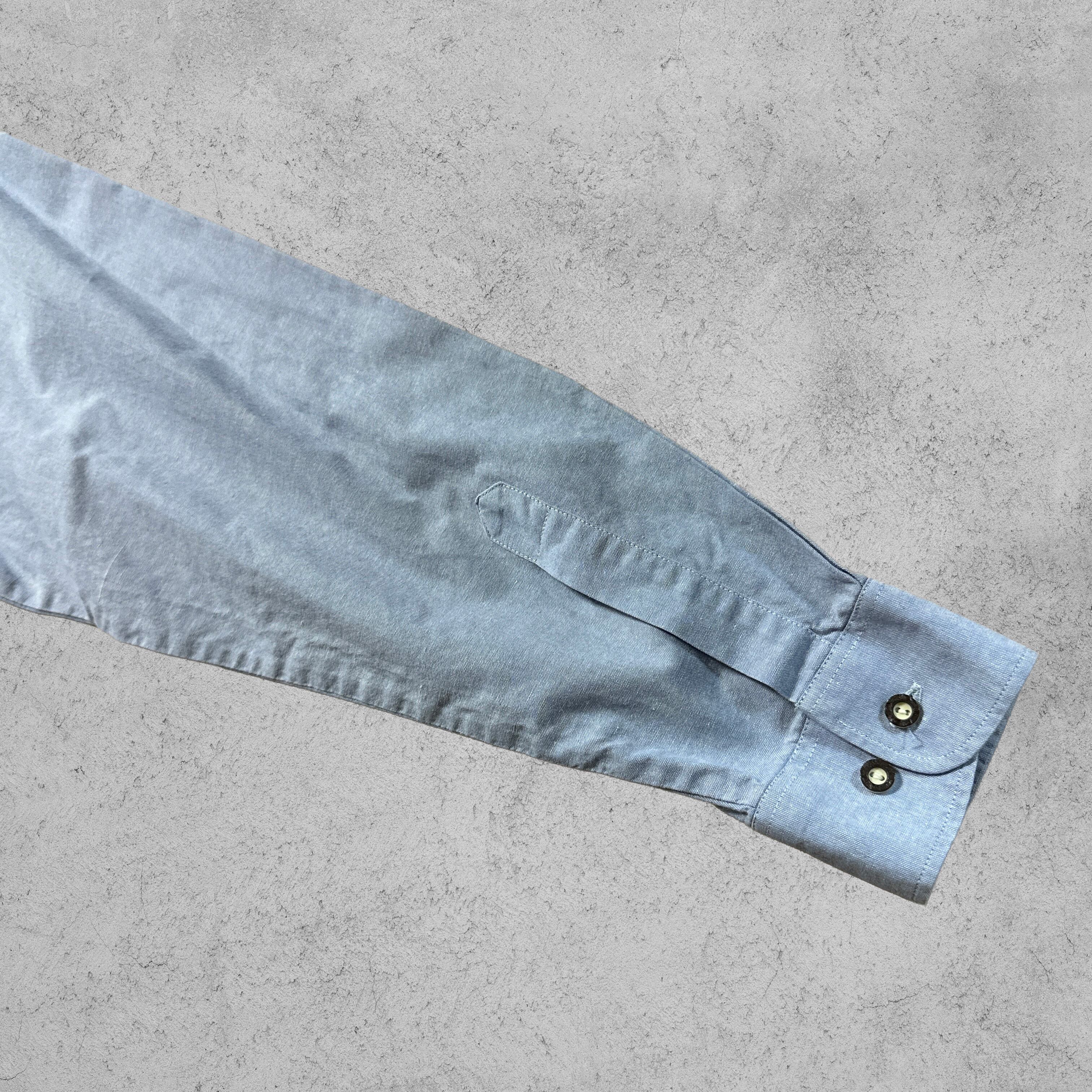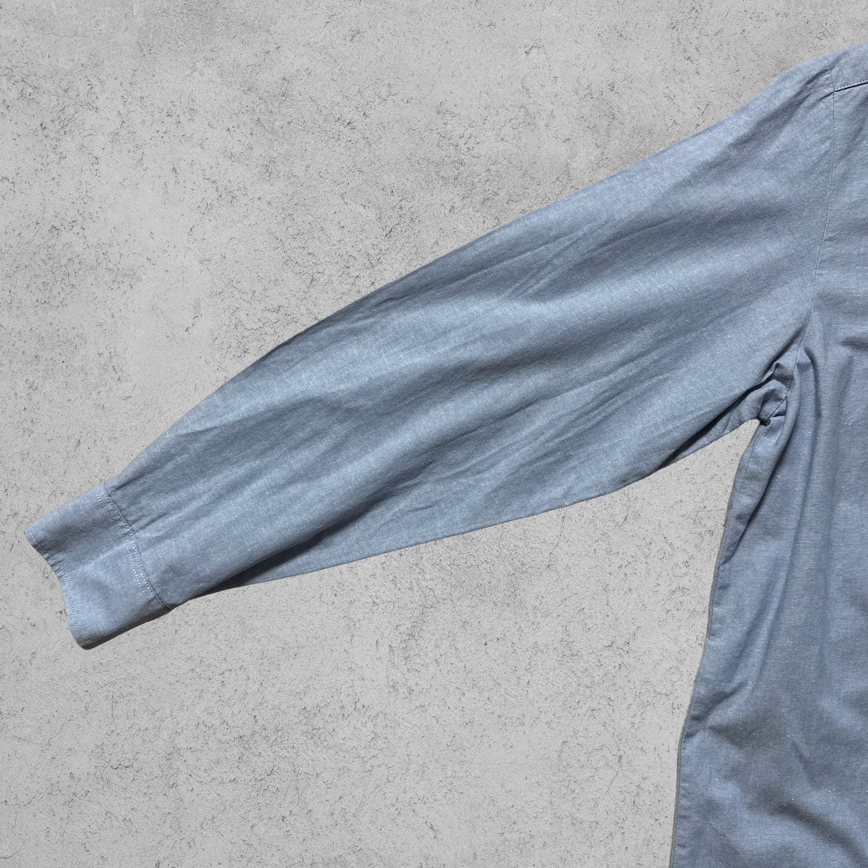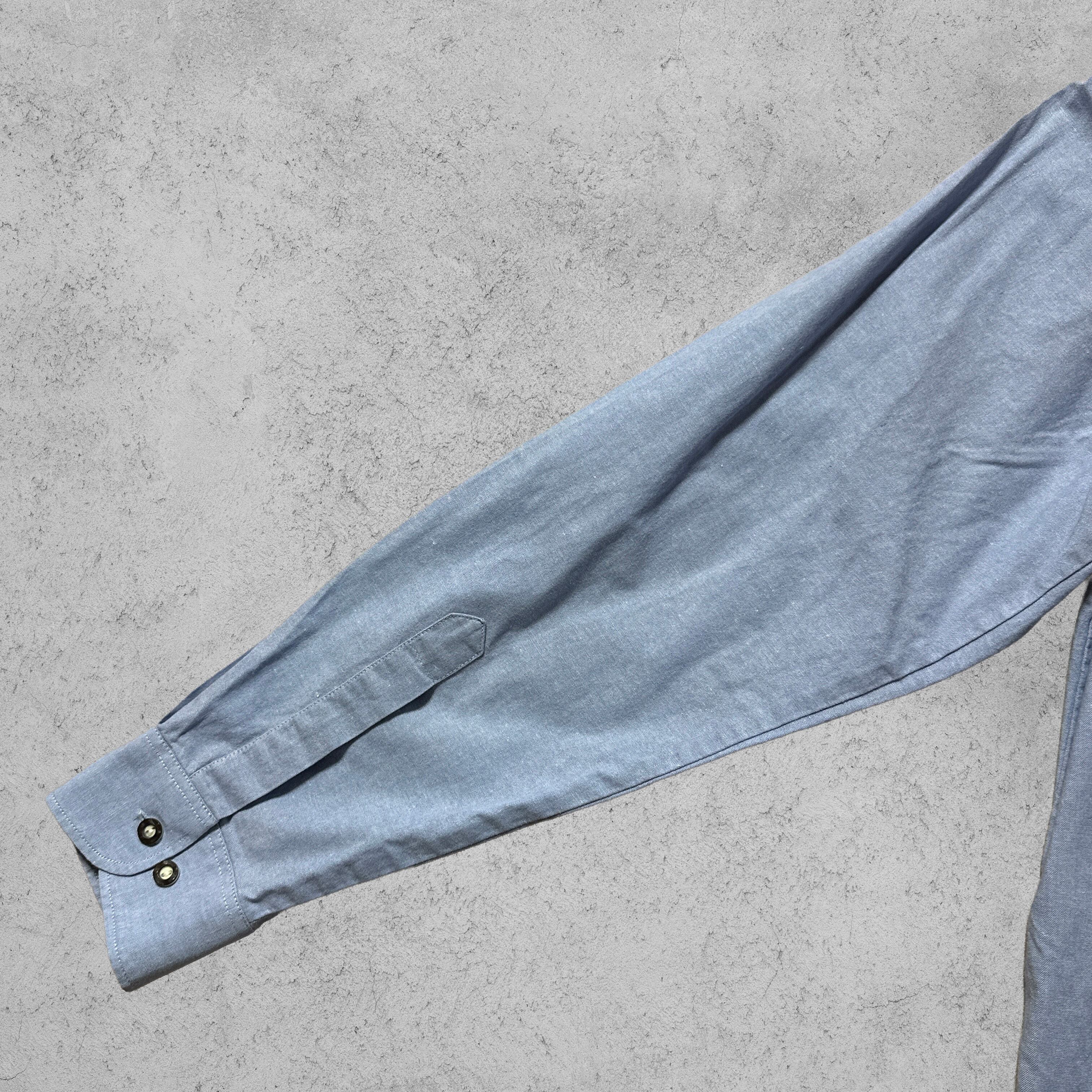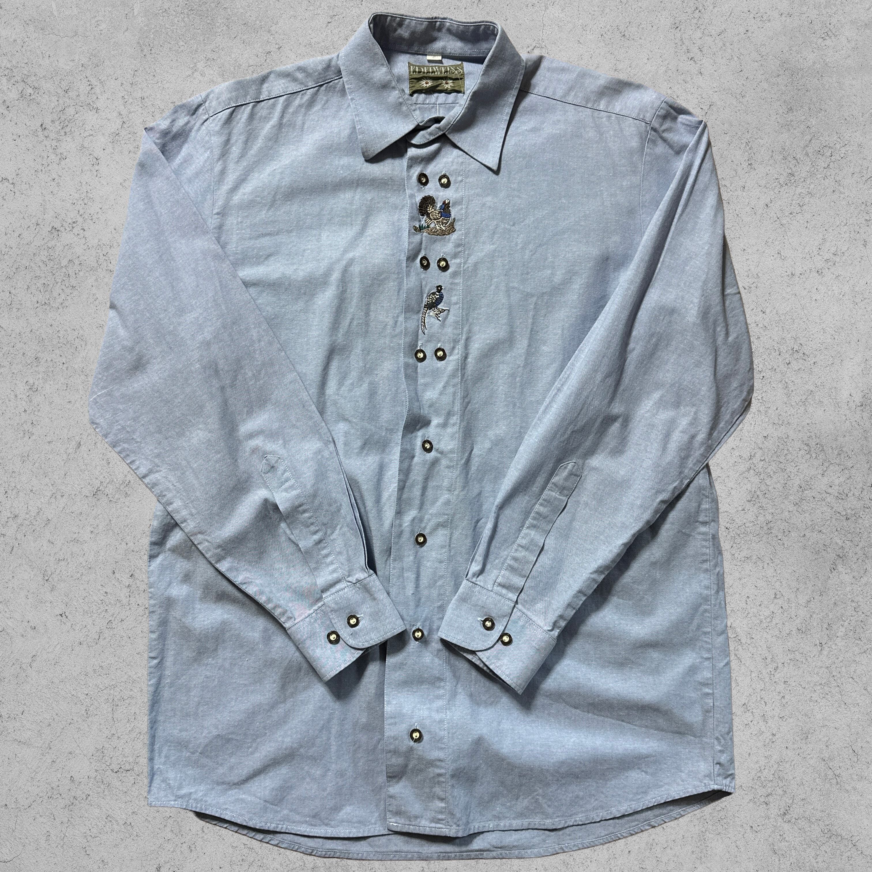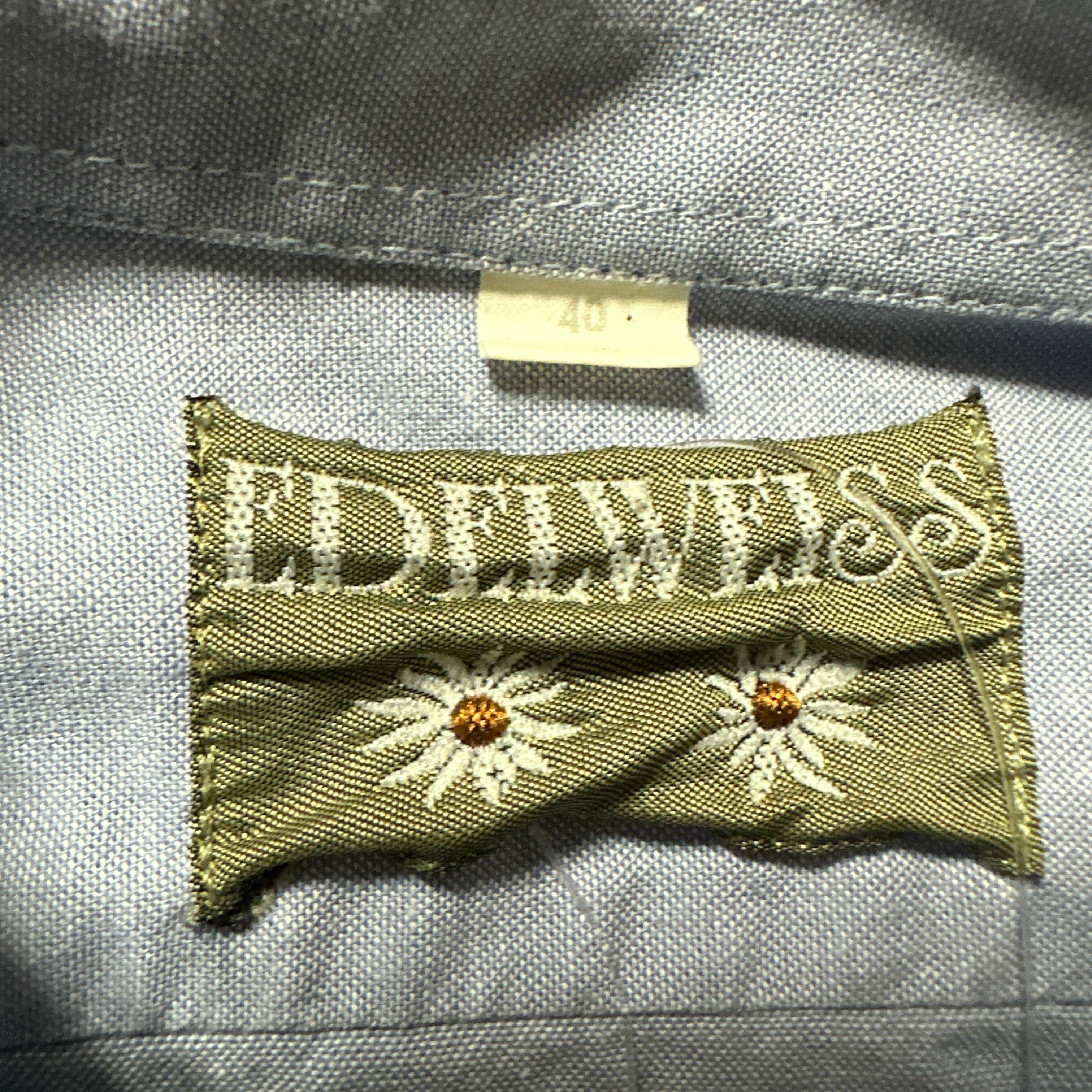 EDELWEISS(エーデルワイス)の長袖ボタンダウンシャツ。おそらく90年代〜2000年代初頭頃のチロリアンシャツ。フロントの比翼仕立てに配置された鳥の刺繍が印象的で、シンプルなブルーボディにアクセントを効かせている。素材はおそらくコットンポリ混紡の軽いオックスフォード系生地で、日常使いしやすく通気性もある。古着らしいユーロテイストの雰囲気があり、ナチュラルなスタイルから個性派コーデのアクセントまで幅広く使える。