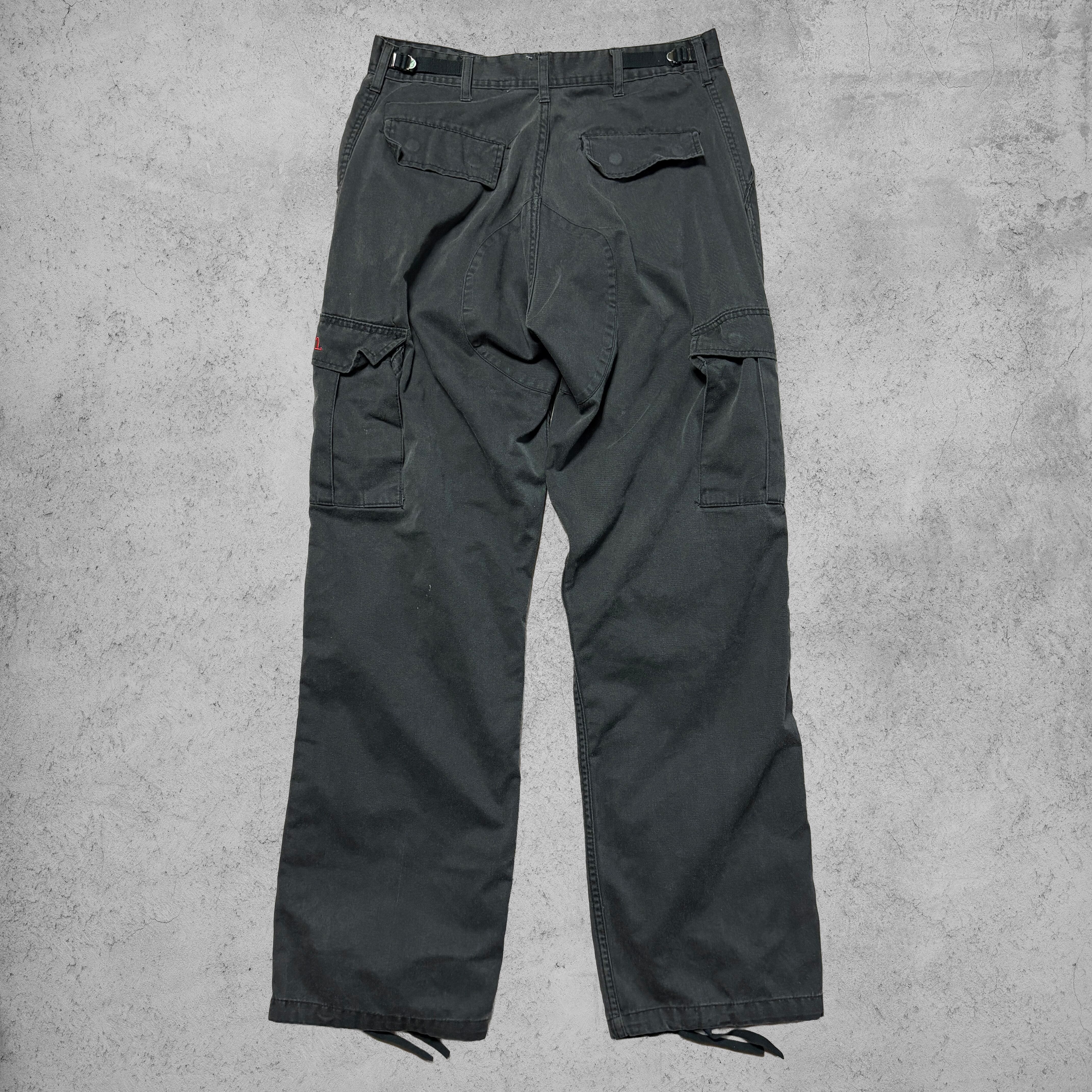 ワークとミリタリーの中間を狙ったような、無骨なシルエットのブラックカーゴパンツ。両サイドのフラップ付きポケットに加え、裾はドローコード仕様でシルエット調整が可能。バックポケットやステッチワークも存在感があり、実用性とデザインを両立。左カーゴポケットに赤刺繍の「dish」ロゴ入り。素材はタグが摩耗して詳細不明だが、しっかりとしたコットン系の質感。サイズ感はメンズM〜L相当。アウトドアやストリートスタイルのアクセントに馴染む一本。