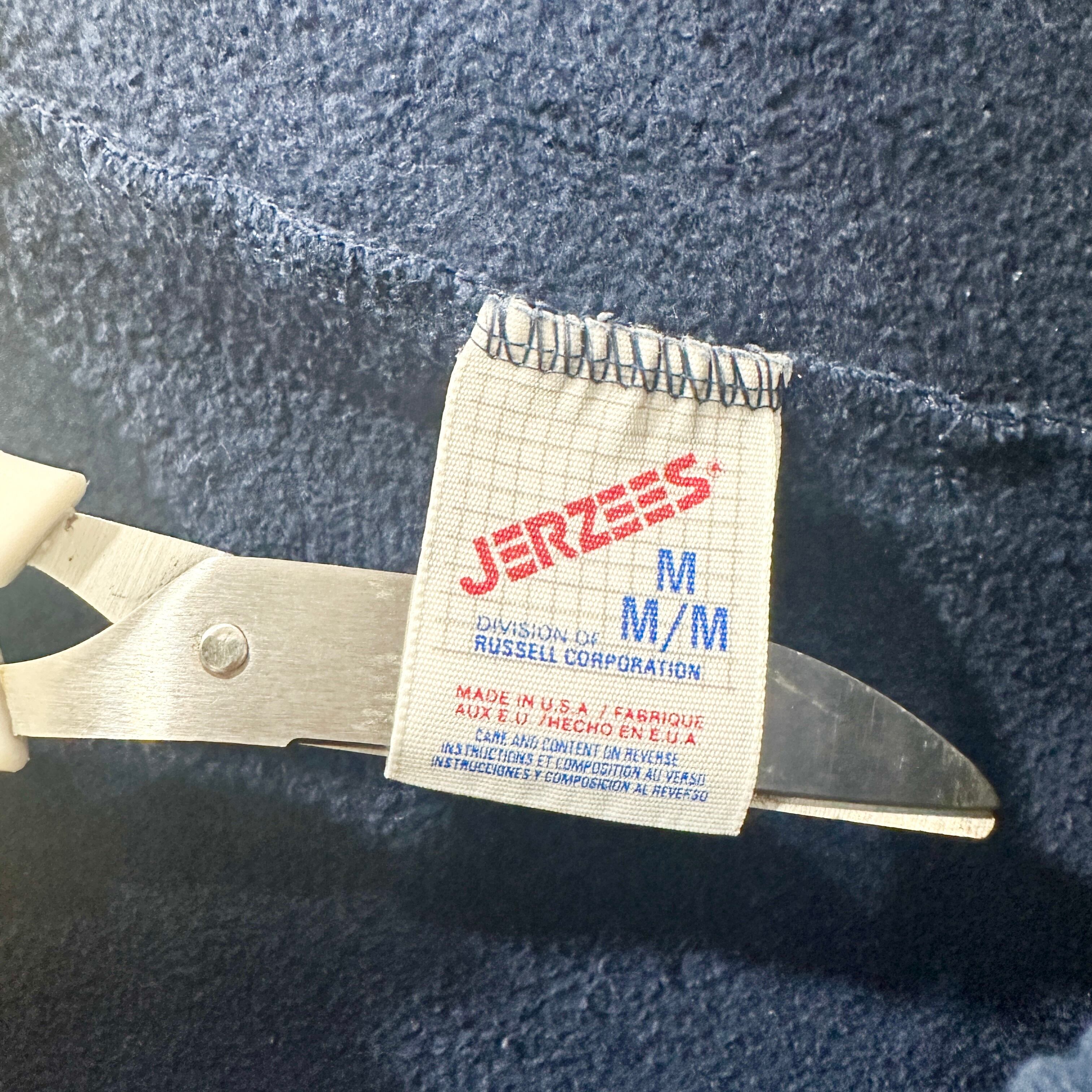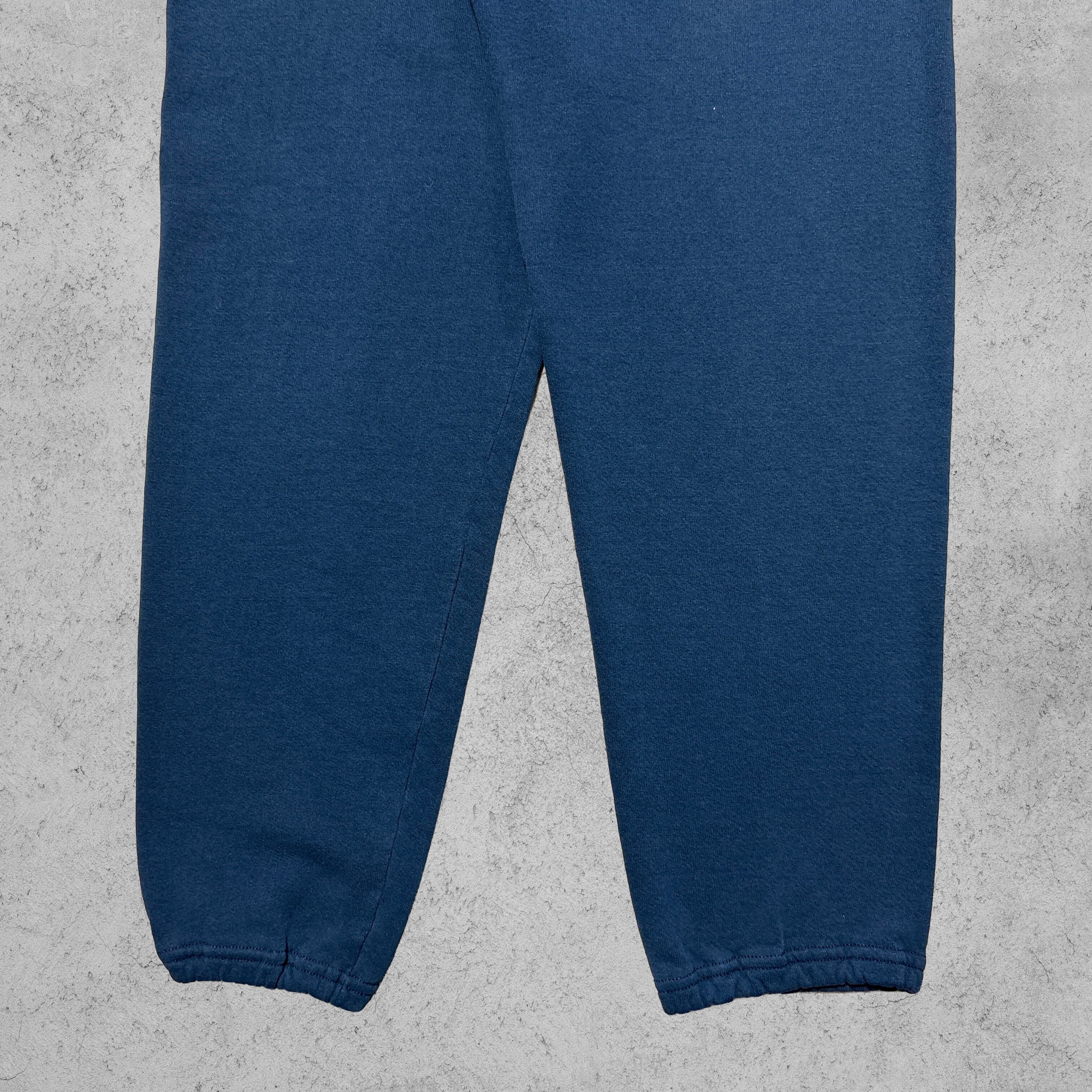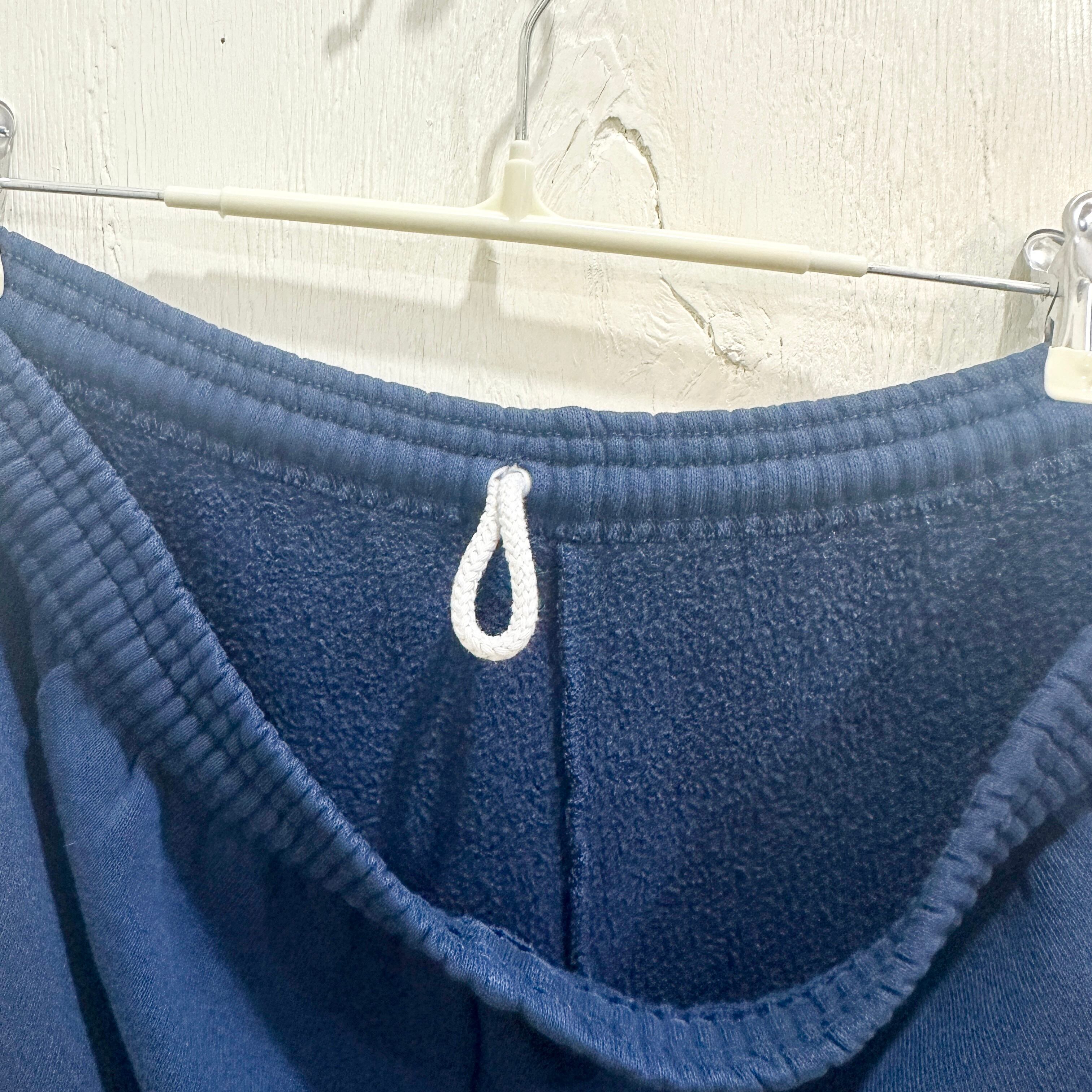 JERZEES製のスウェットパンツ。濃いネイビーカラー、裾ゴム入りの王道シルエット。ウエストはドローコード付きで調整可能。タグには「Made in U.S.A.」の表記があり、80〜90年代らしいアメリカ製スウェットの雰囲気がしっかり出ている。裏起毛の厚みあるボディで、シンプルながら無骨なアメカジ感を放つ一本。