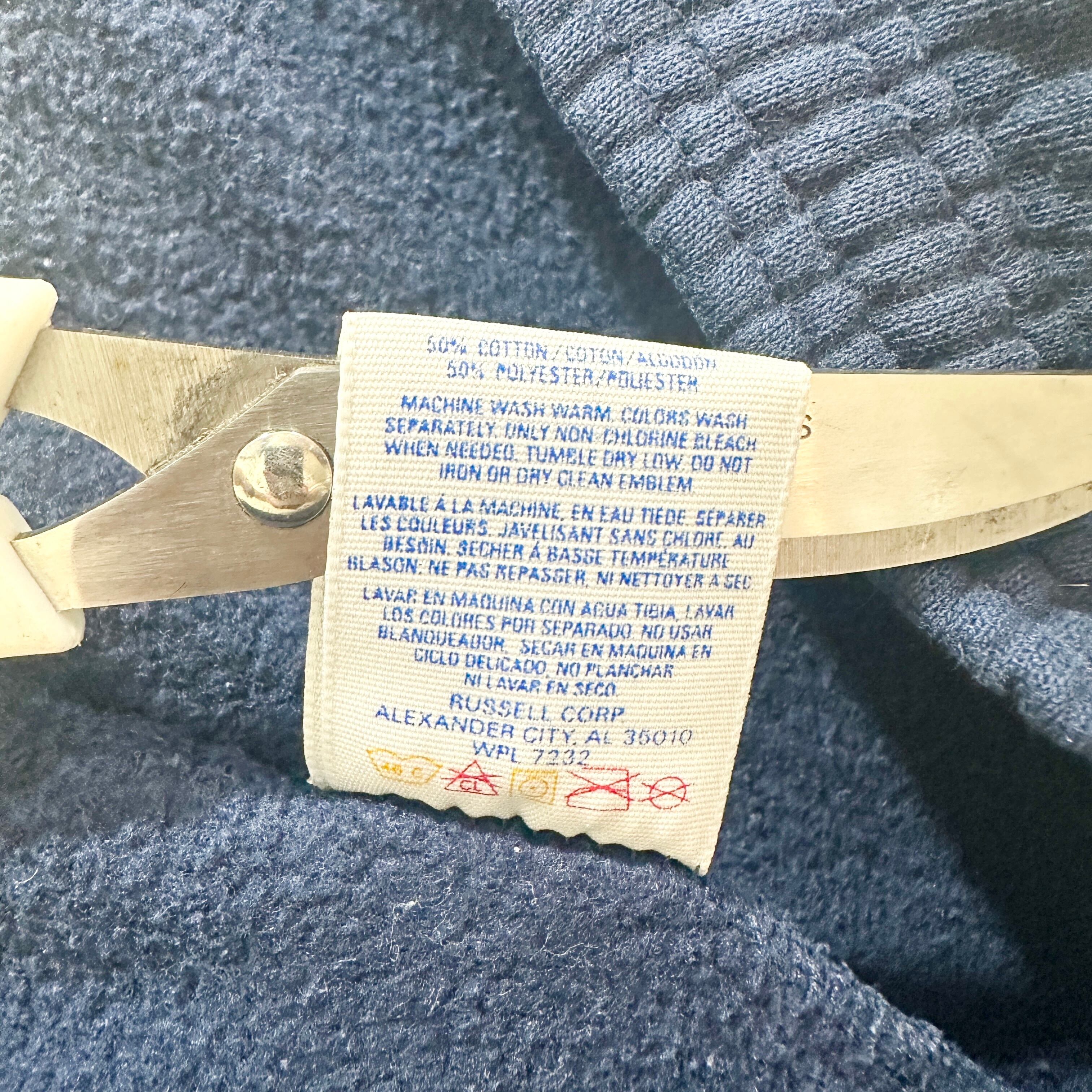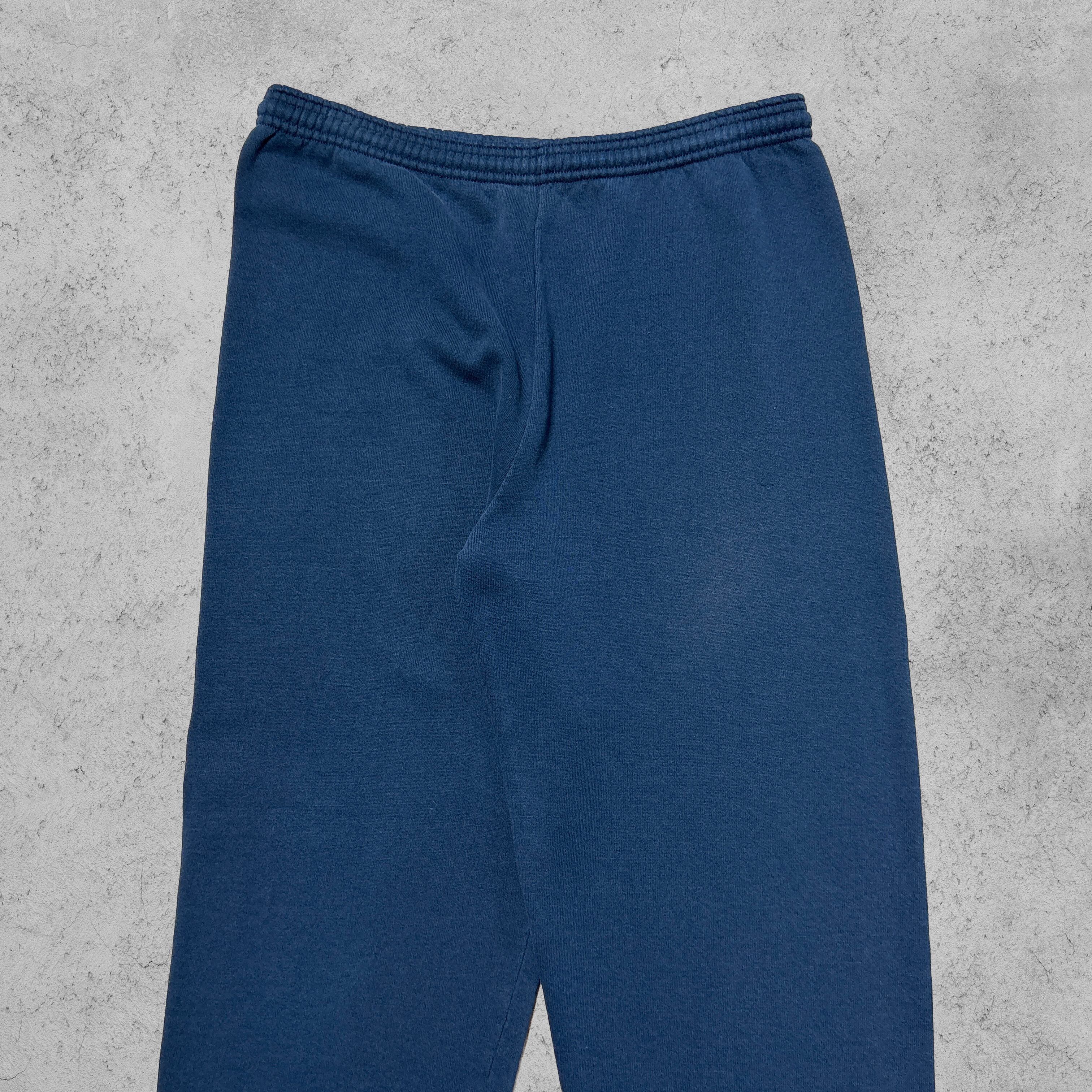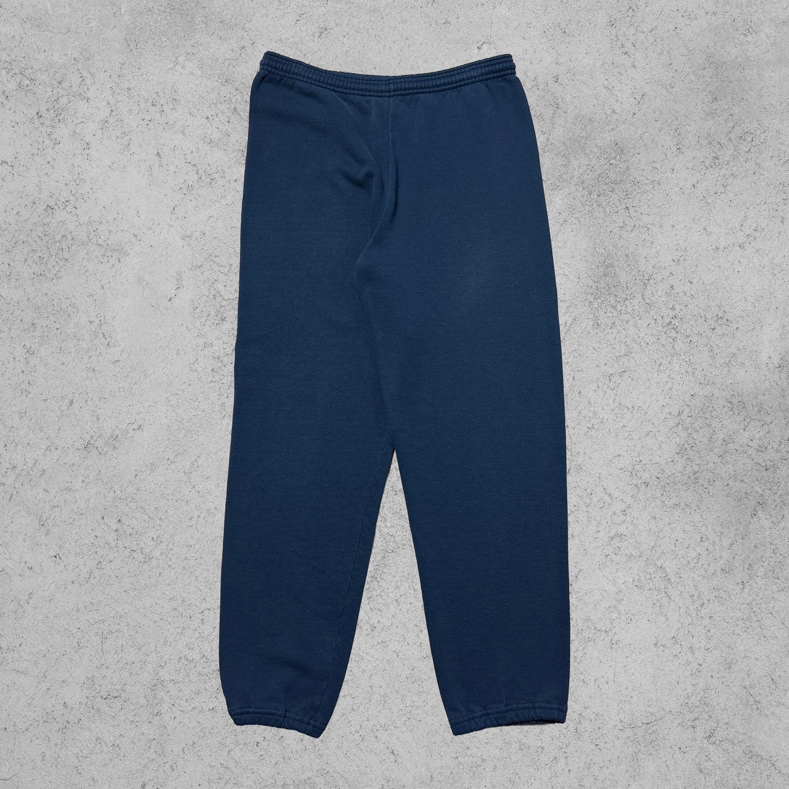 JERZEES製のスウェットパンツ。濃いネイビーカラー、裾ゴム入りの王道シルエット。ウエストはドローコード付きで調整可能。タグには「Made in U.S.A.」の表記があり、80〜90年代らしいアメリカ製スウェットの雰囲気がしっかり出ている。裏起毛の厚みあるボディで、シンプルながら無骨なアメカジ感を放つ一本。