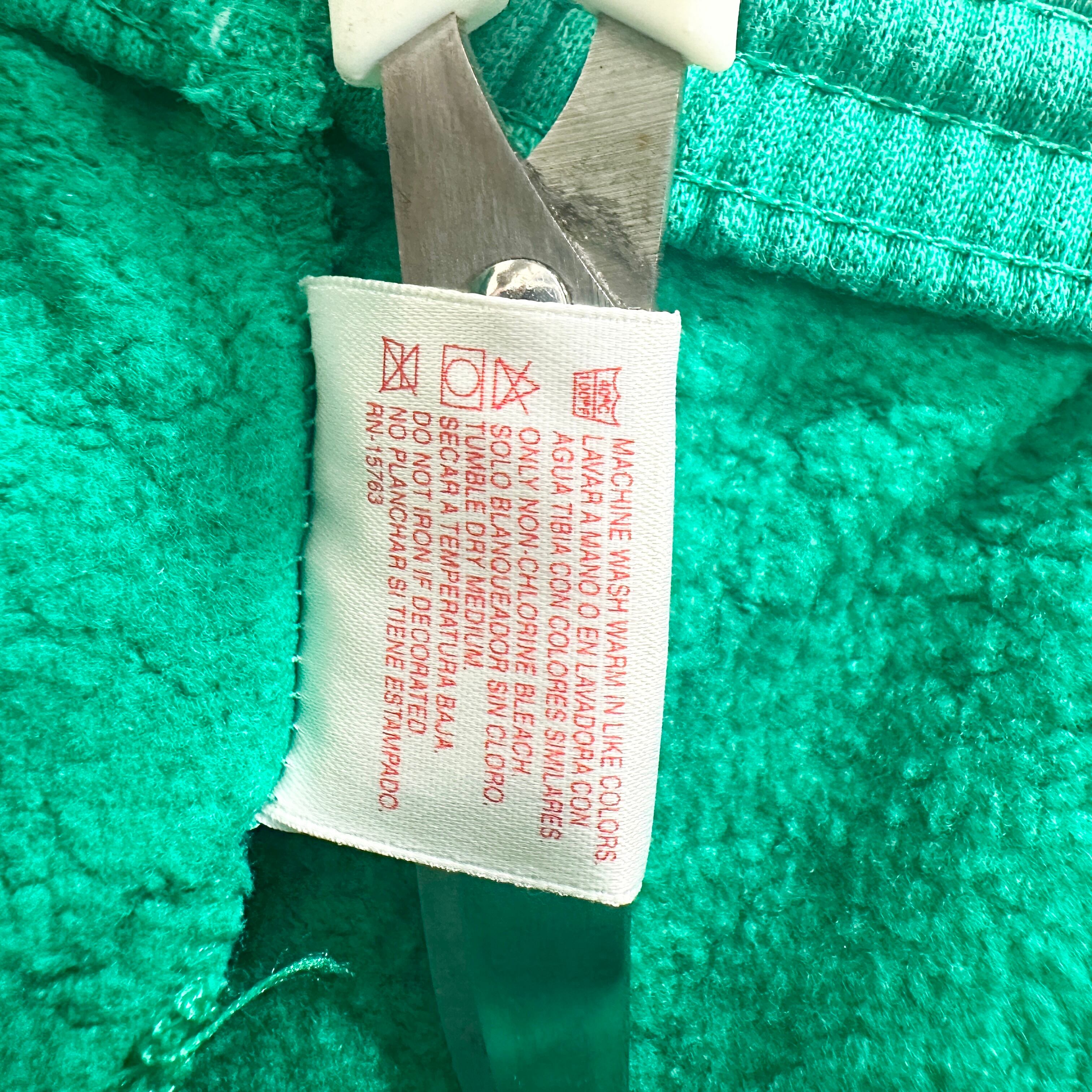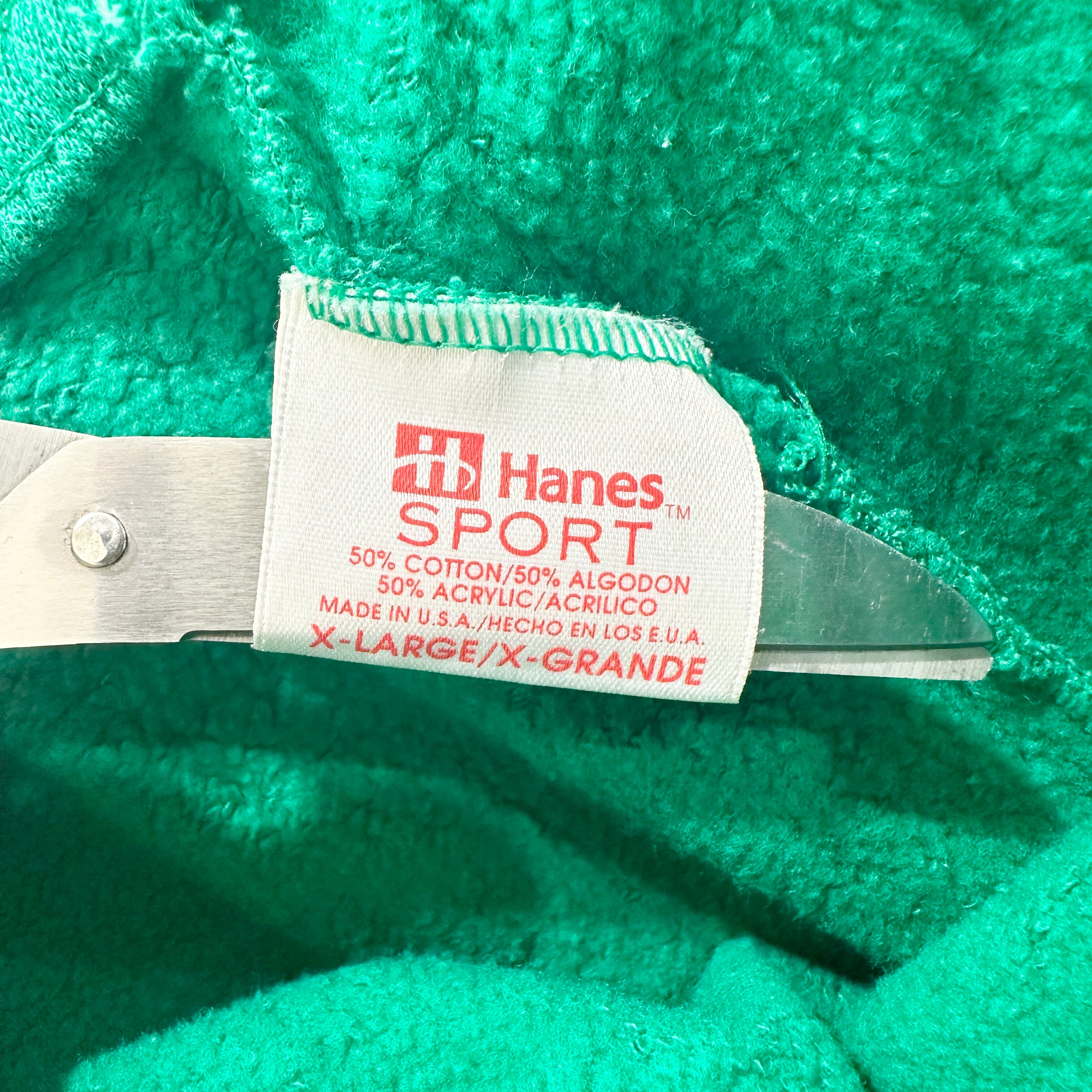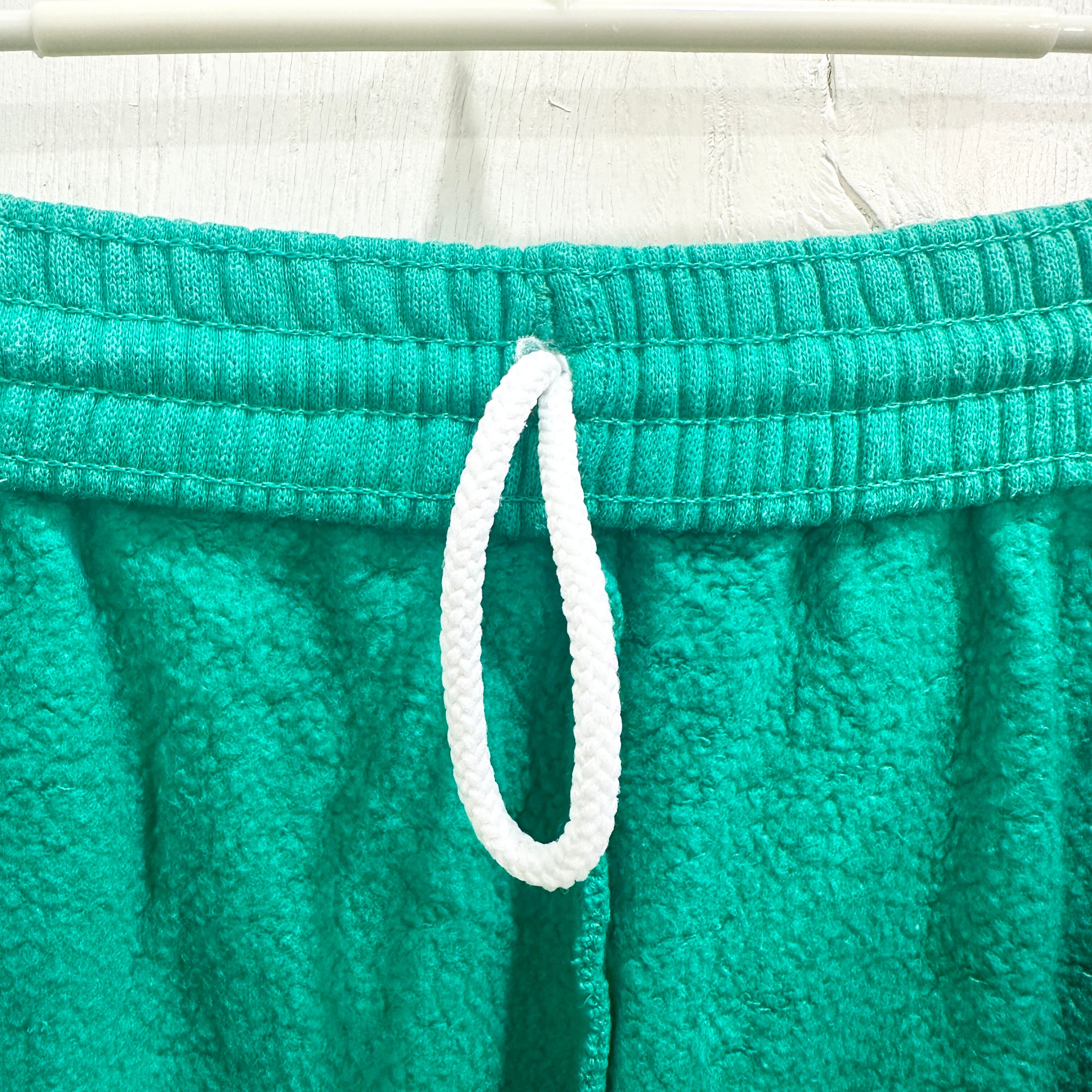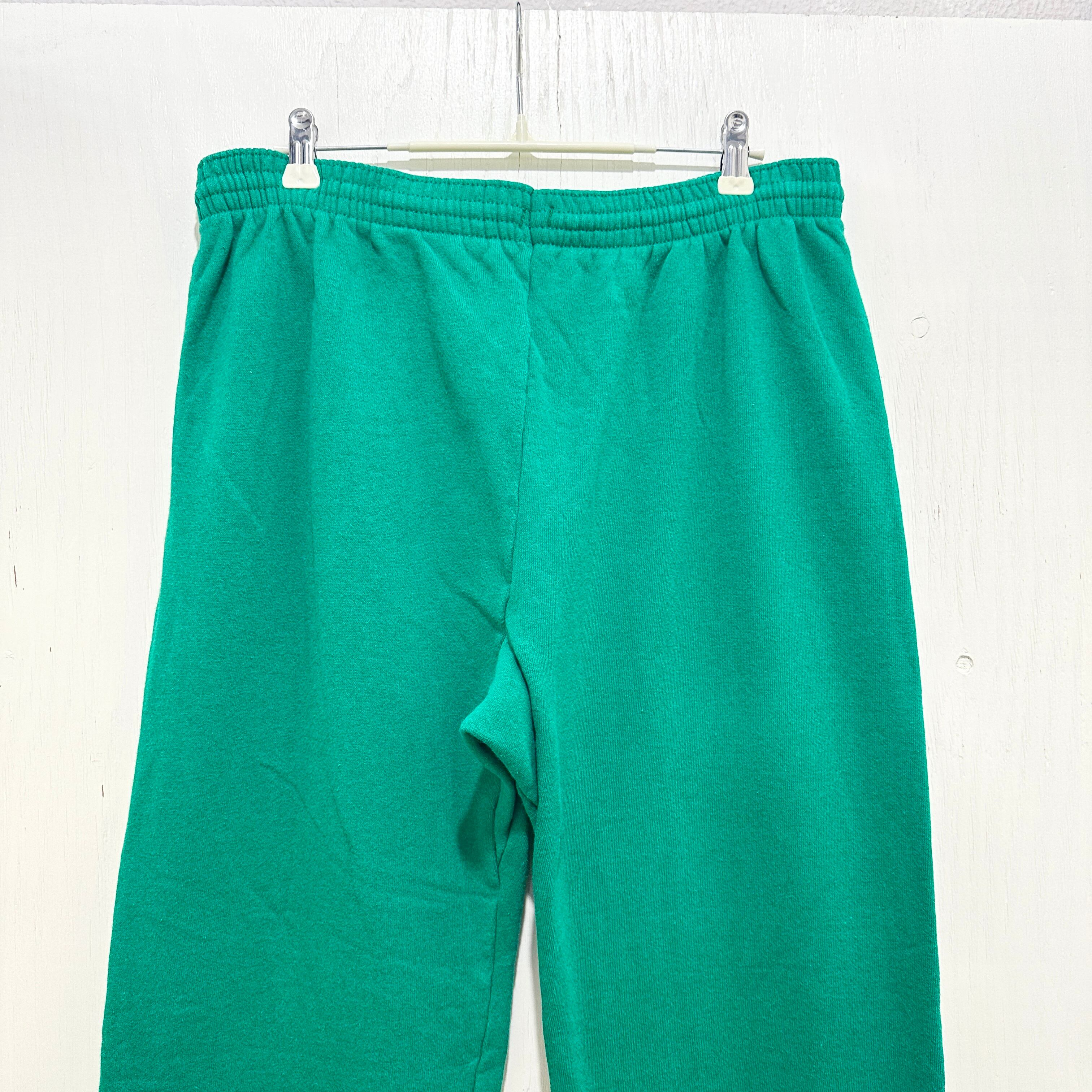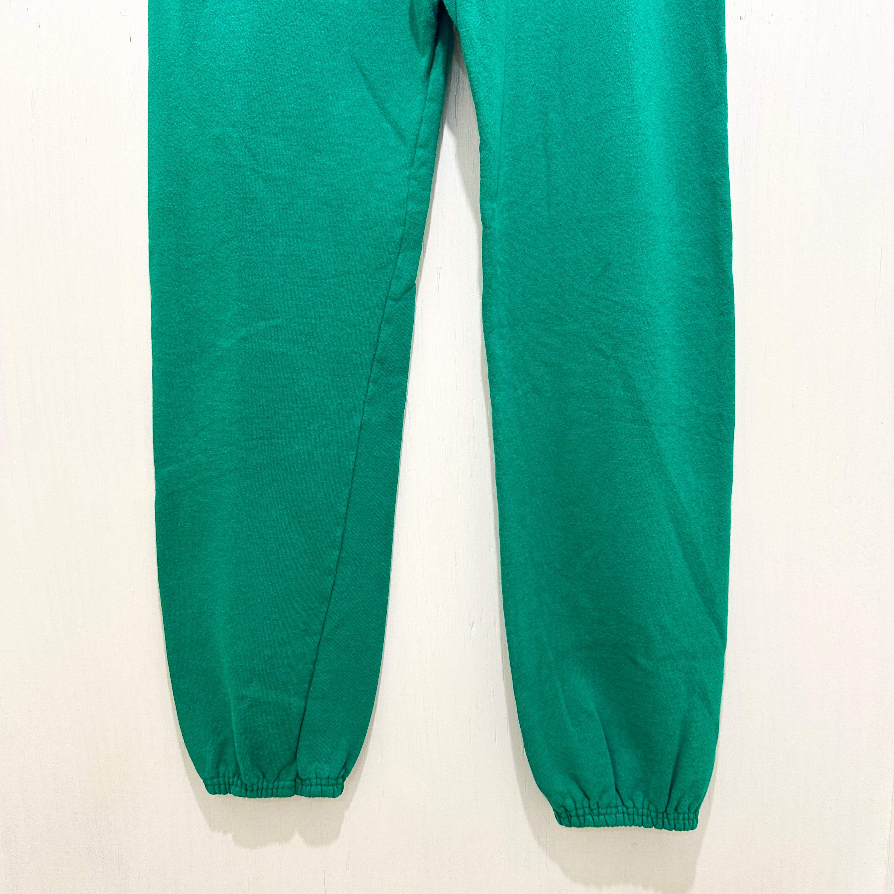 Hanes「SPORT」ラインのヴィンテージスウェットパンツ。鮮やかなエメラルドグリーンのボディに、裾ゴム入りのジョガースタイル。素材はコットン50%・アクリル50%の肉厚裏起毛で、MADE IN USA。シンプルながら90sらしい発色とシルエットで、スポーツ・カレッジ系の古着コーデに相性抜群。
