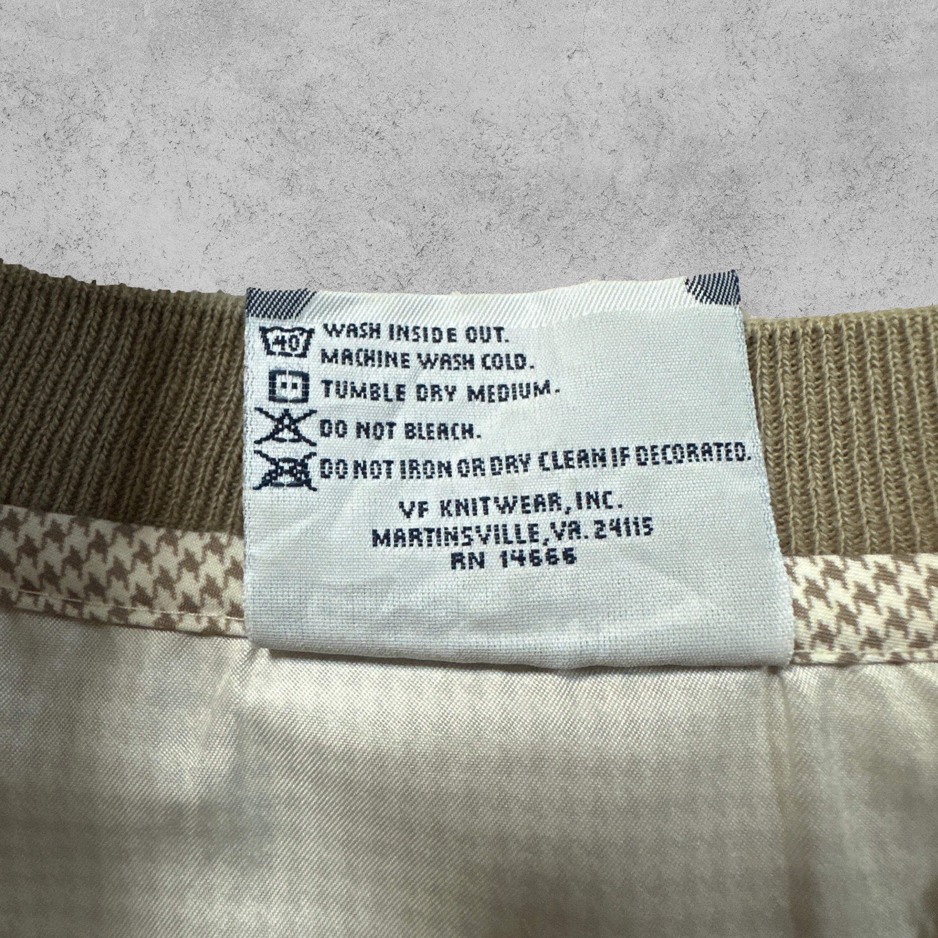 上品なベージュトーンの極小千鳥格子(ハウンドトゥース)柄に、カーキリブを合わせた落ち着いたデザインが特徴。