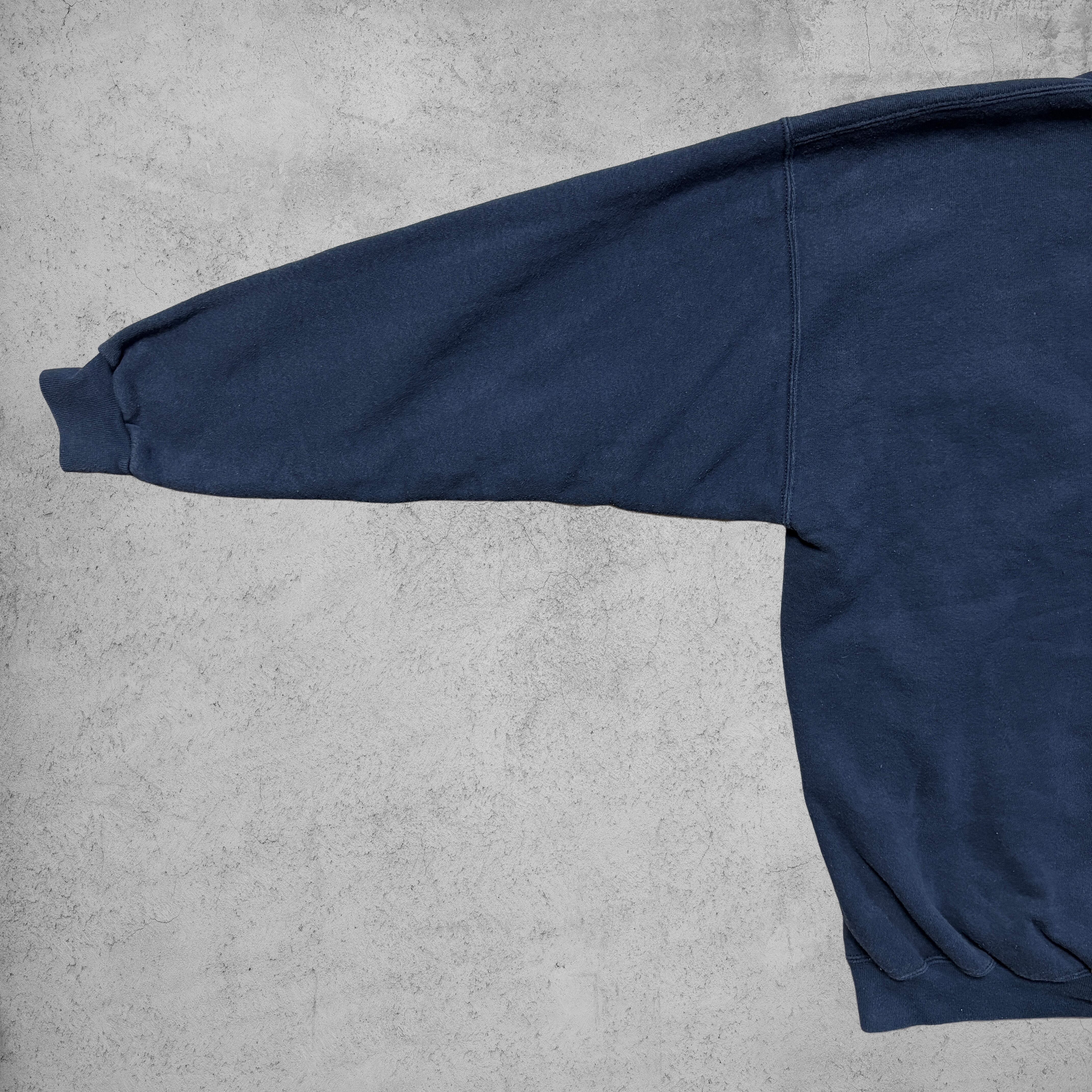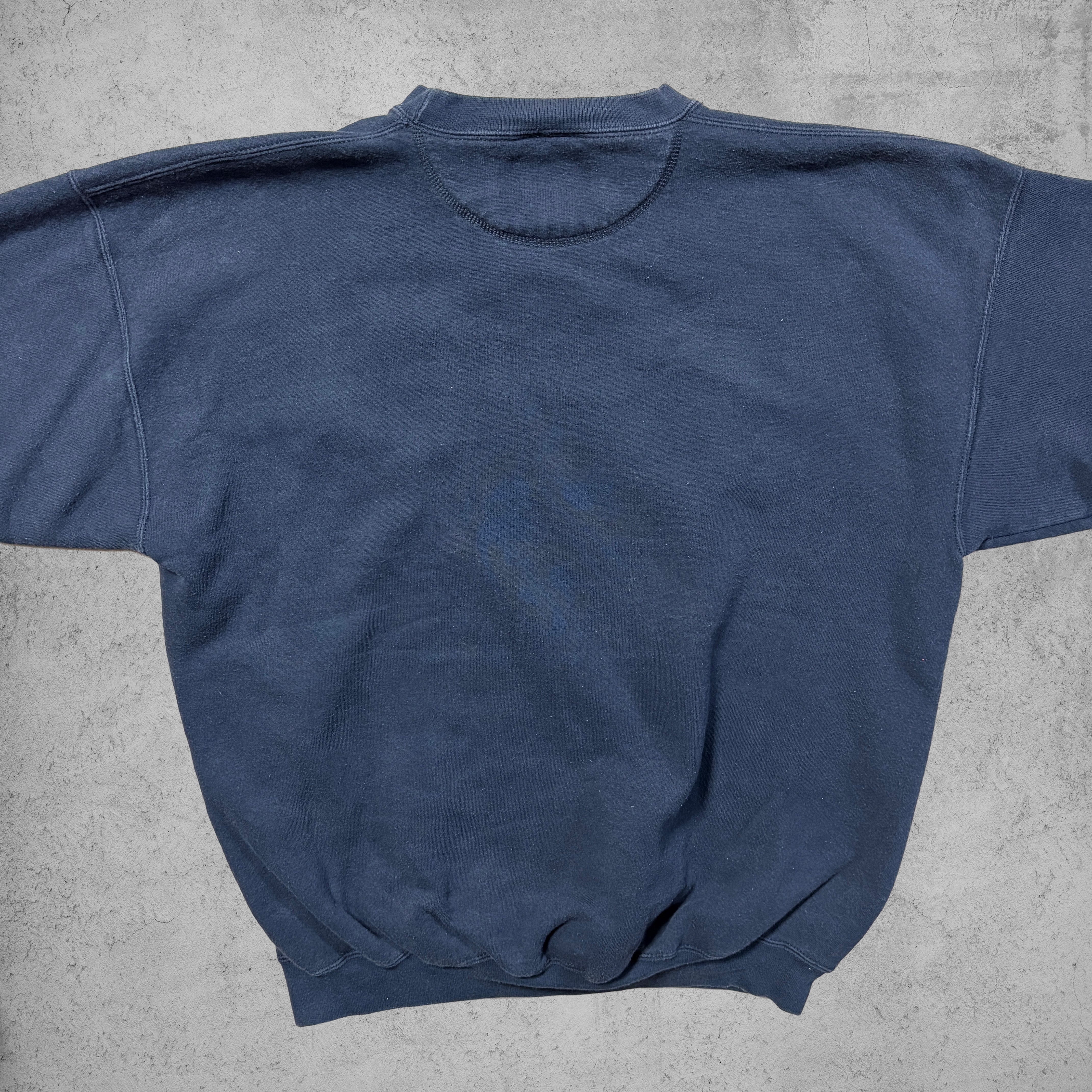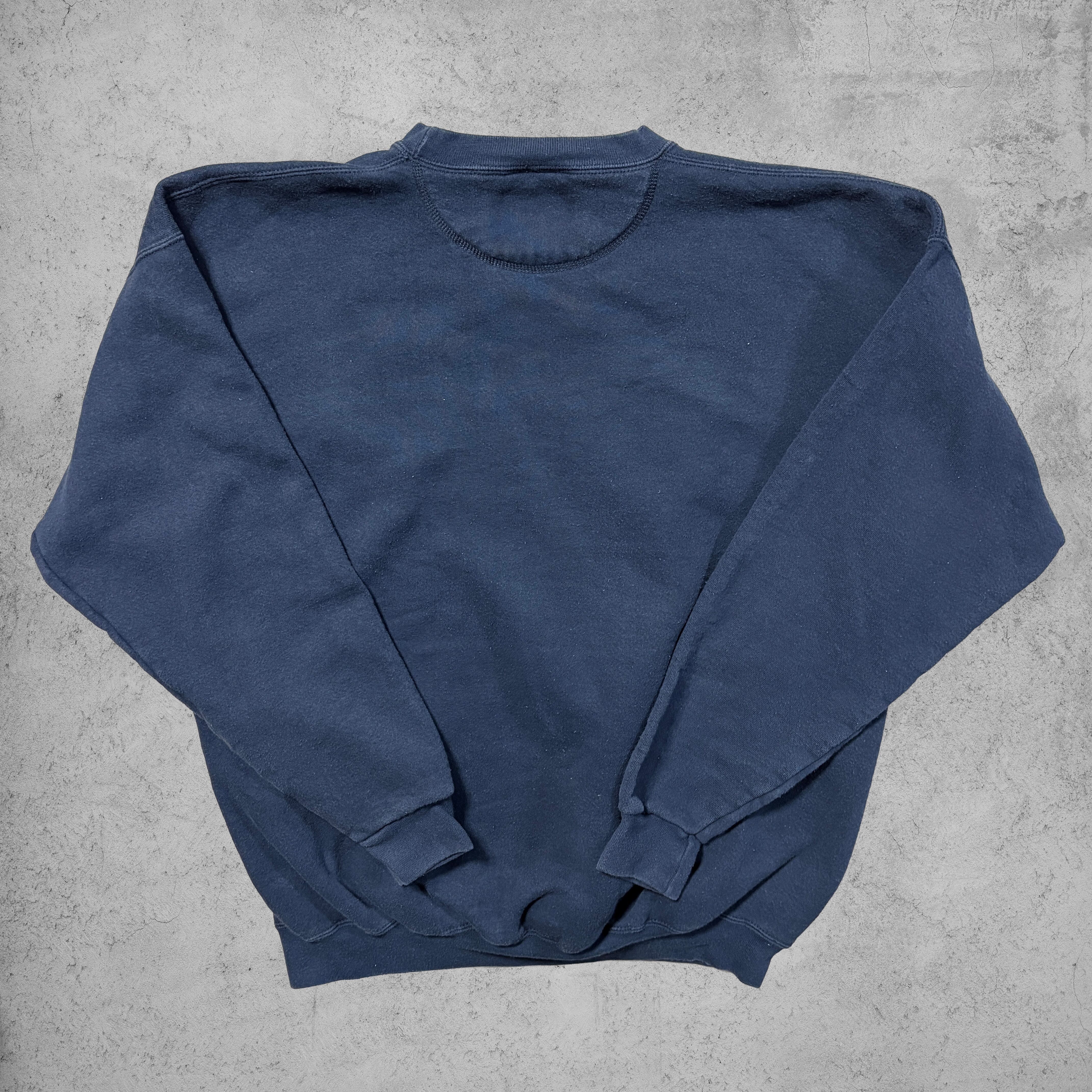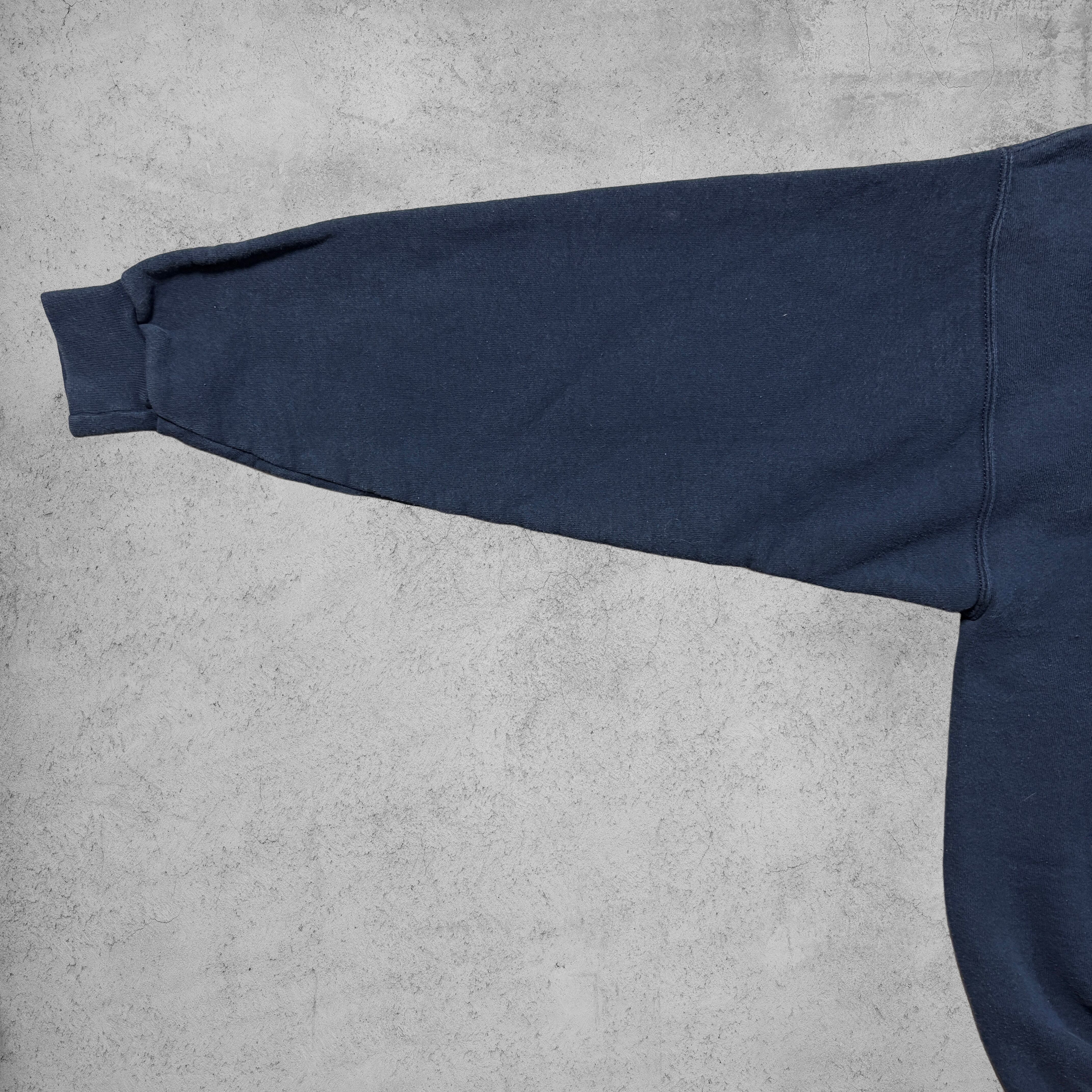 ネイビーカラーのフェード感とリブの詰まり具合も雰囲気抜群で、ヴィンテージスウェット特有のこなれた表情を楽しめる。