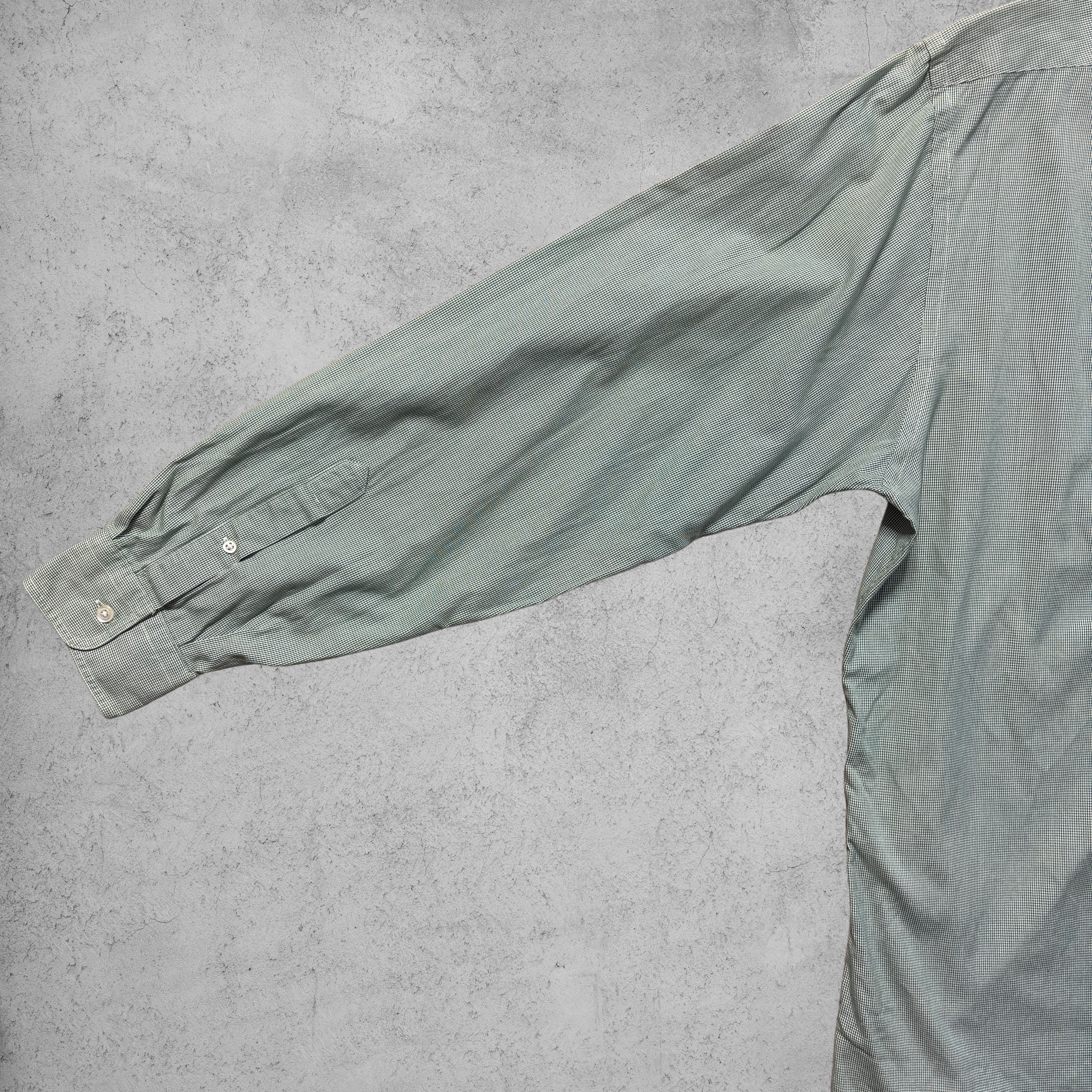 今回のボタンダウンシャツは、クラシックな「DIRECT MERCHANTS」タグを採用したMade in U.S.A.モデル。細かなグリーン×オフホワイトのピンチェック柄で、無地に近い落ち着いたトーンながらも奥行きのある表情が魅力。胸ポケット付きのシンプルなデザインで、清潔感のある印象に仕上がっている。