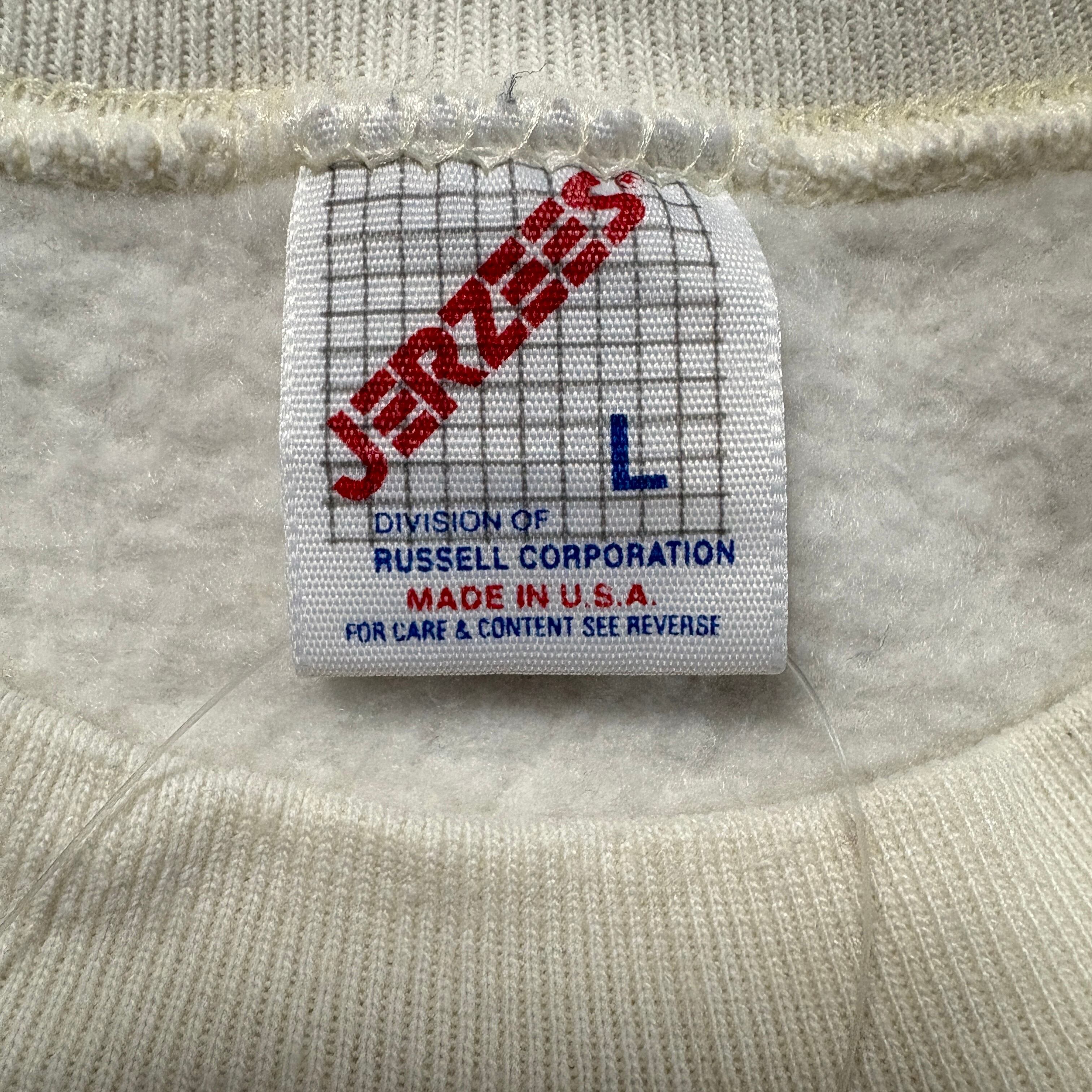 JERZEES(ジャージーズ)は、1902年創業のアメリカ・ラッセル社(Russell Corporation)のブランドライン。スポーツウェアやカレッジスウェットの定番として長年親しまれ、アメリカ製タグ期のアイテムは、その質感とシルエットから今もヴィンテージ市場で人気を集めている。