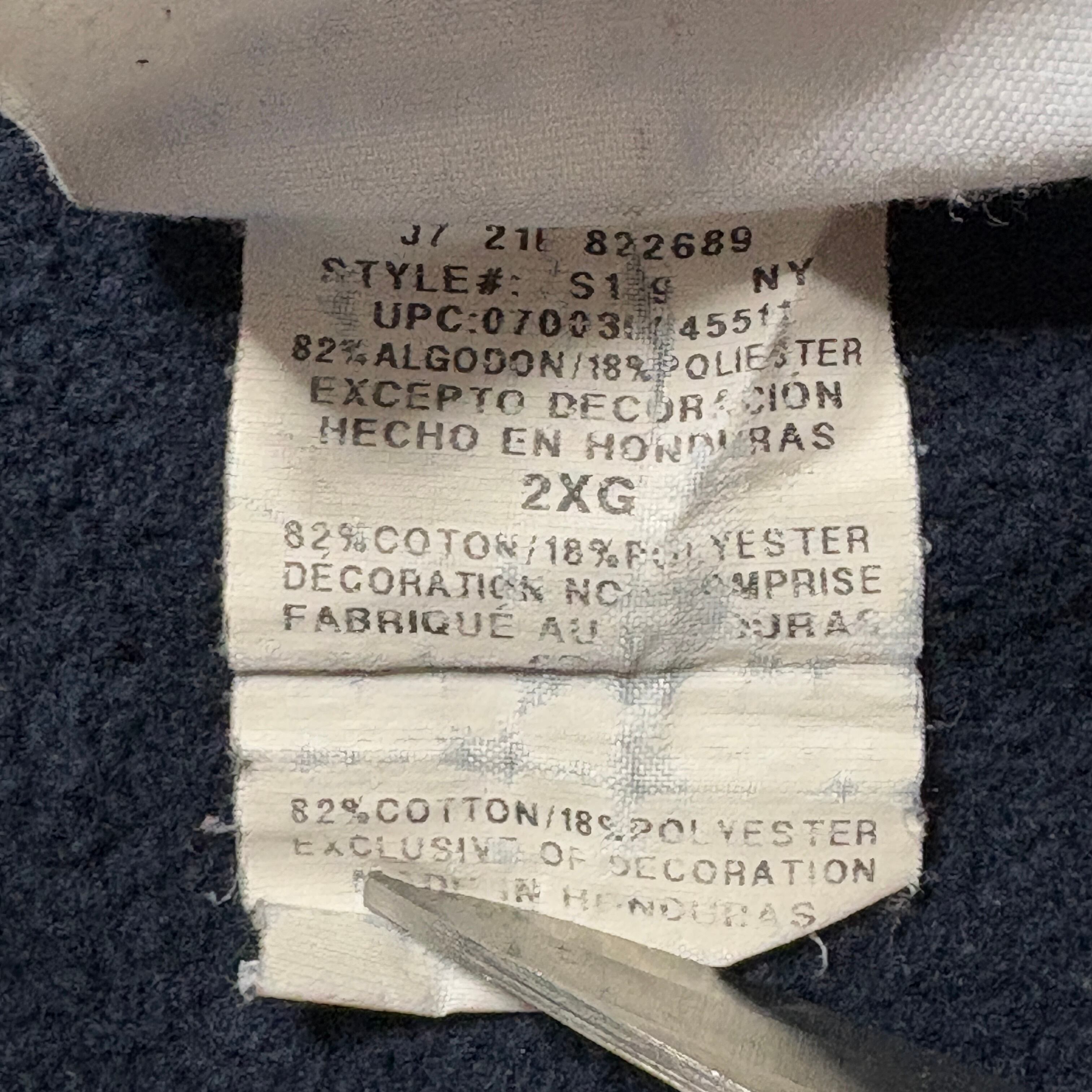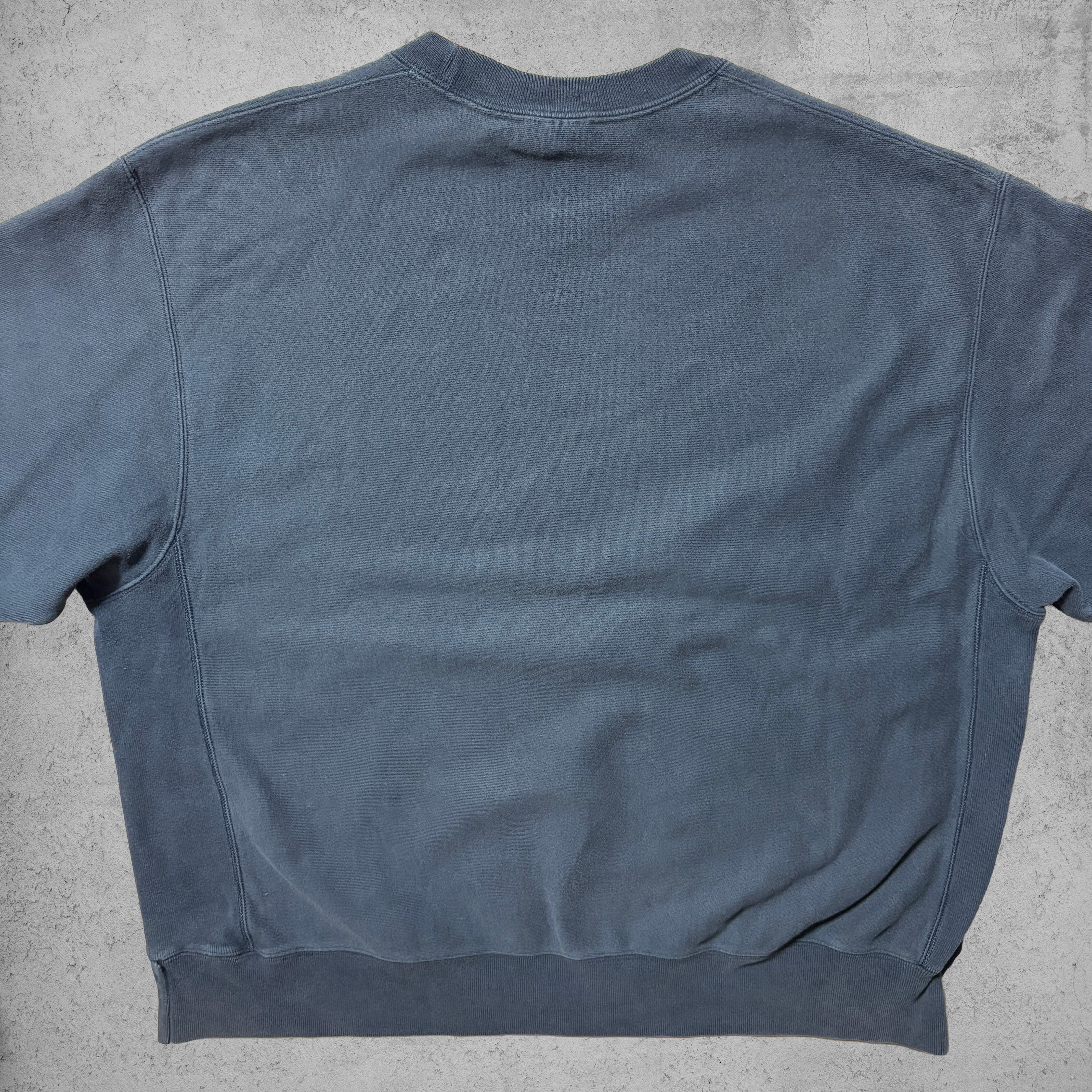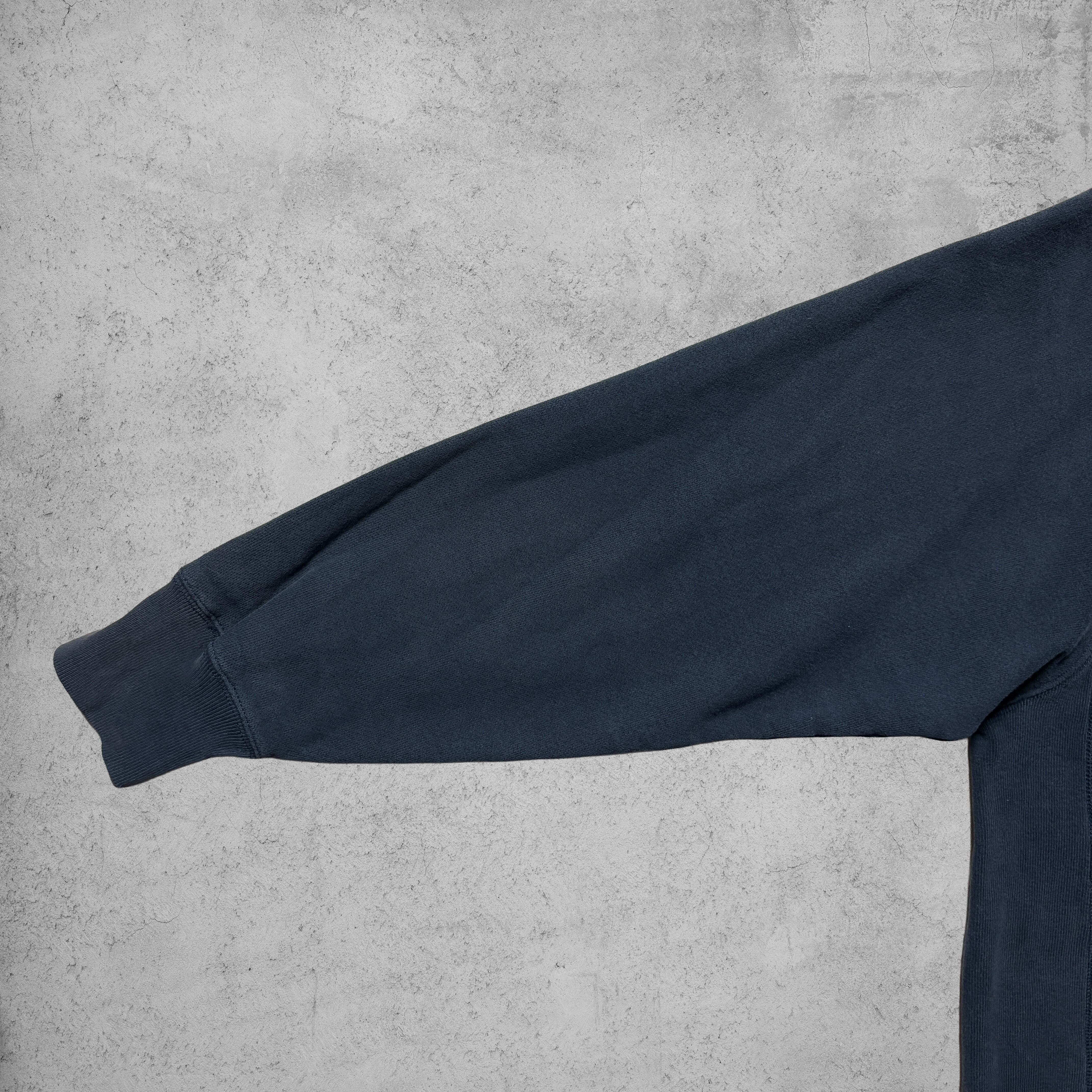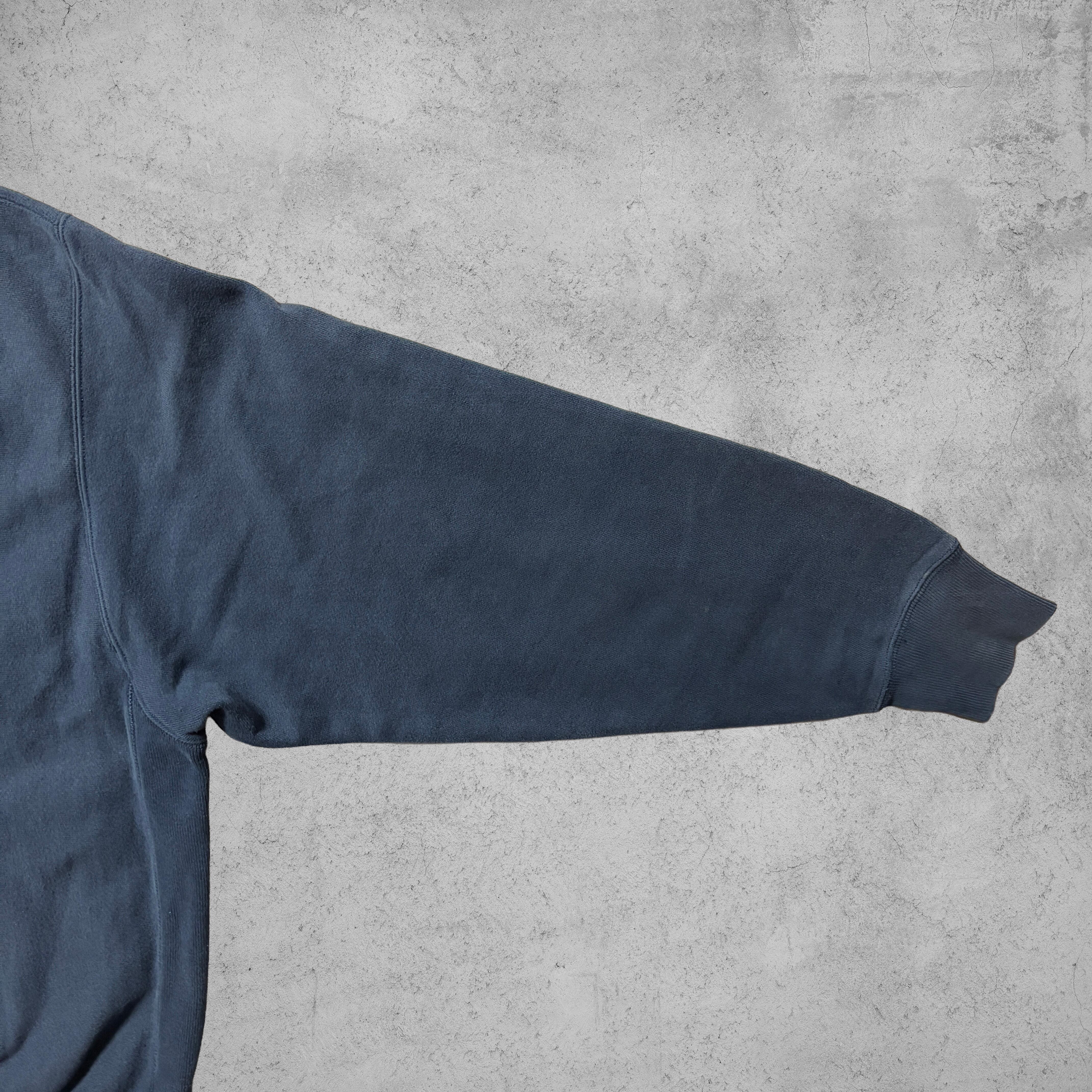 クルーネックで胸に“amazon”スモールロゴのワンポイントプリント。企業物×RWボディの掛け合わせが珍しく、さりげない存在感がある。深いネイビーが経年でほんのりフェードし、古着らしい表情に育っている。左袖口にCロゴパッチ。サイズは2XLでゆったりとしたリラックスシルエットを楽しめる。