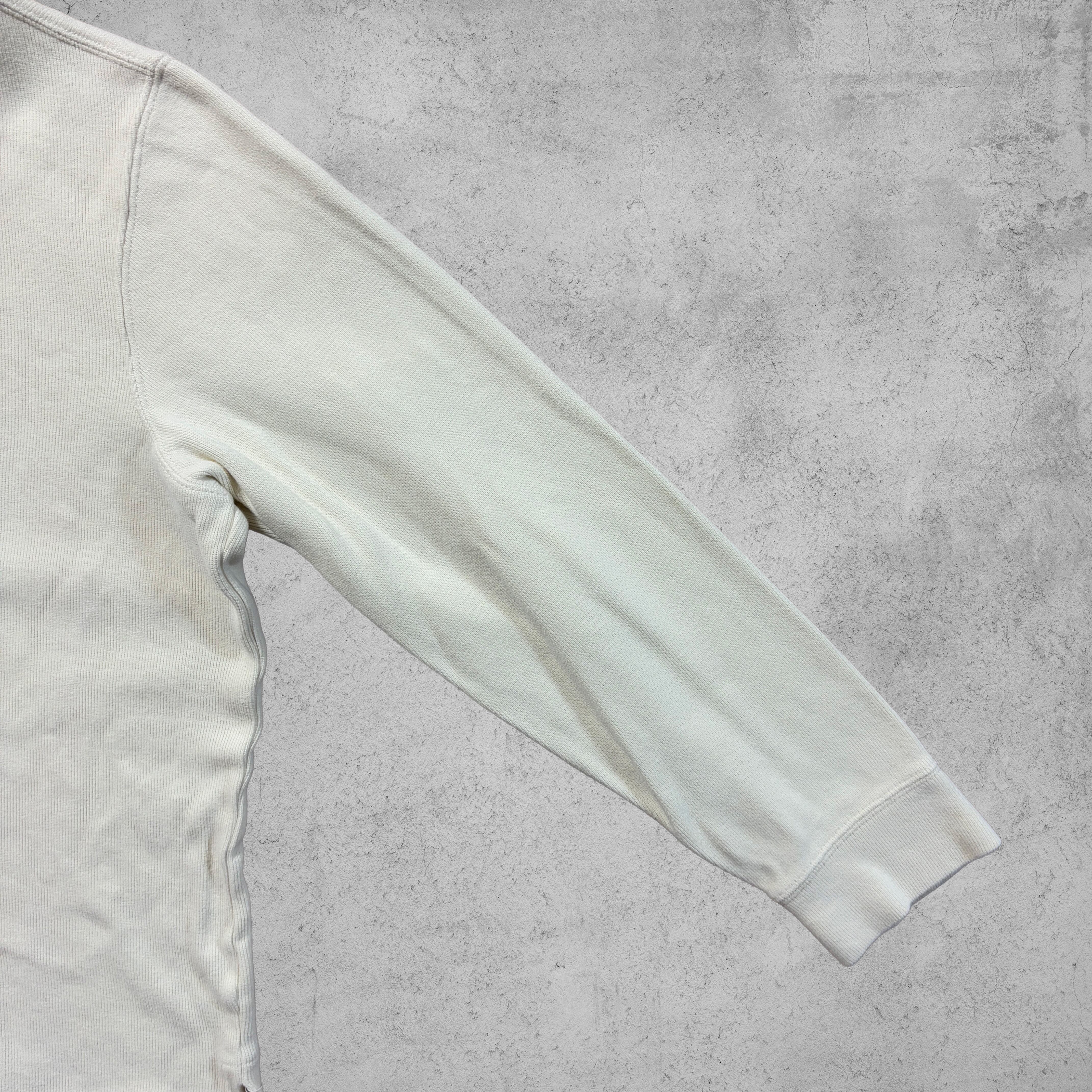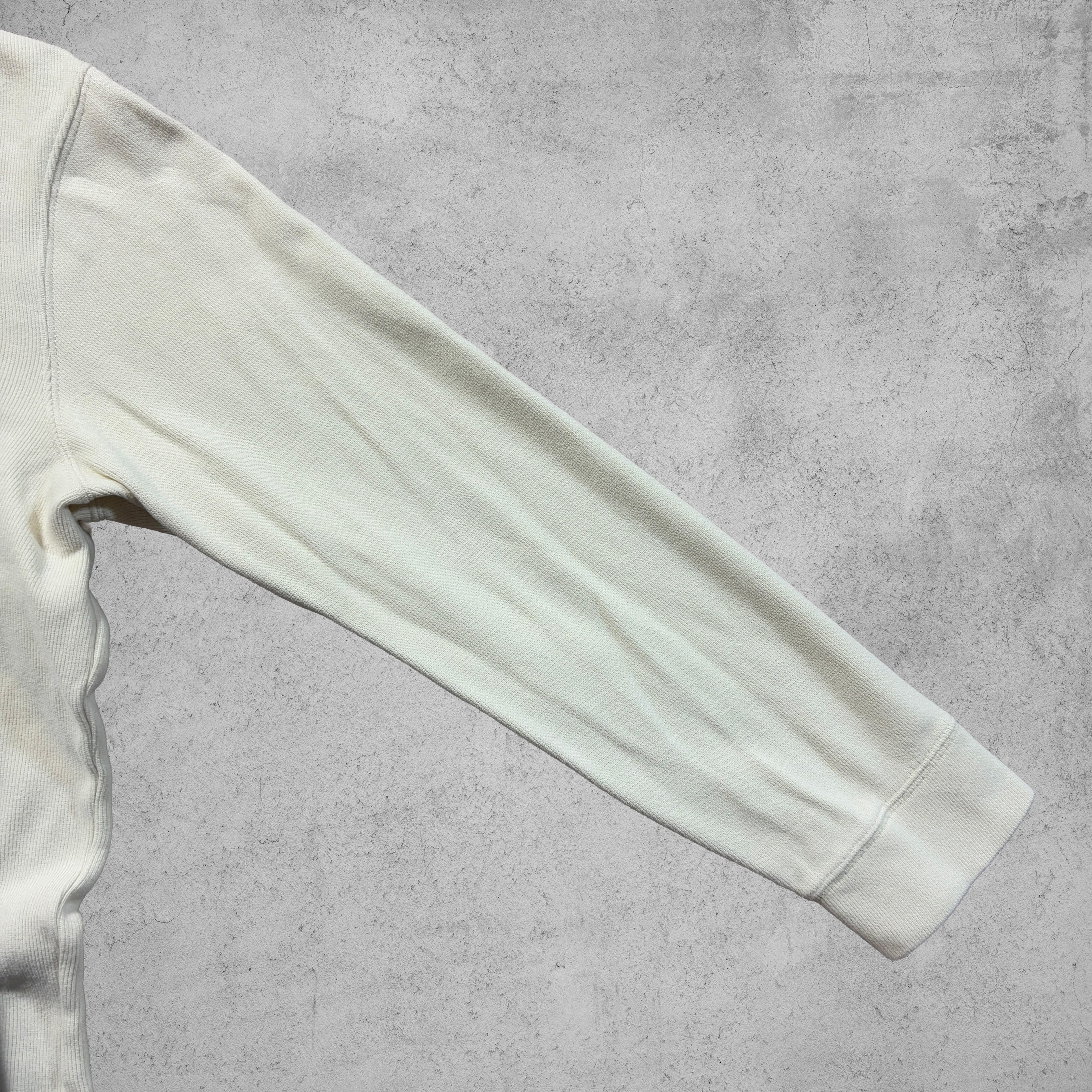 オフホワイトのカラーリングが清潔感を演出し、シャツの上から重ねても一枚でもサマになる万能アイテム。上品なカジュアルスタイルや古着MIXコーデにぴったり。