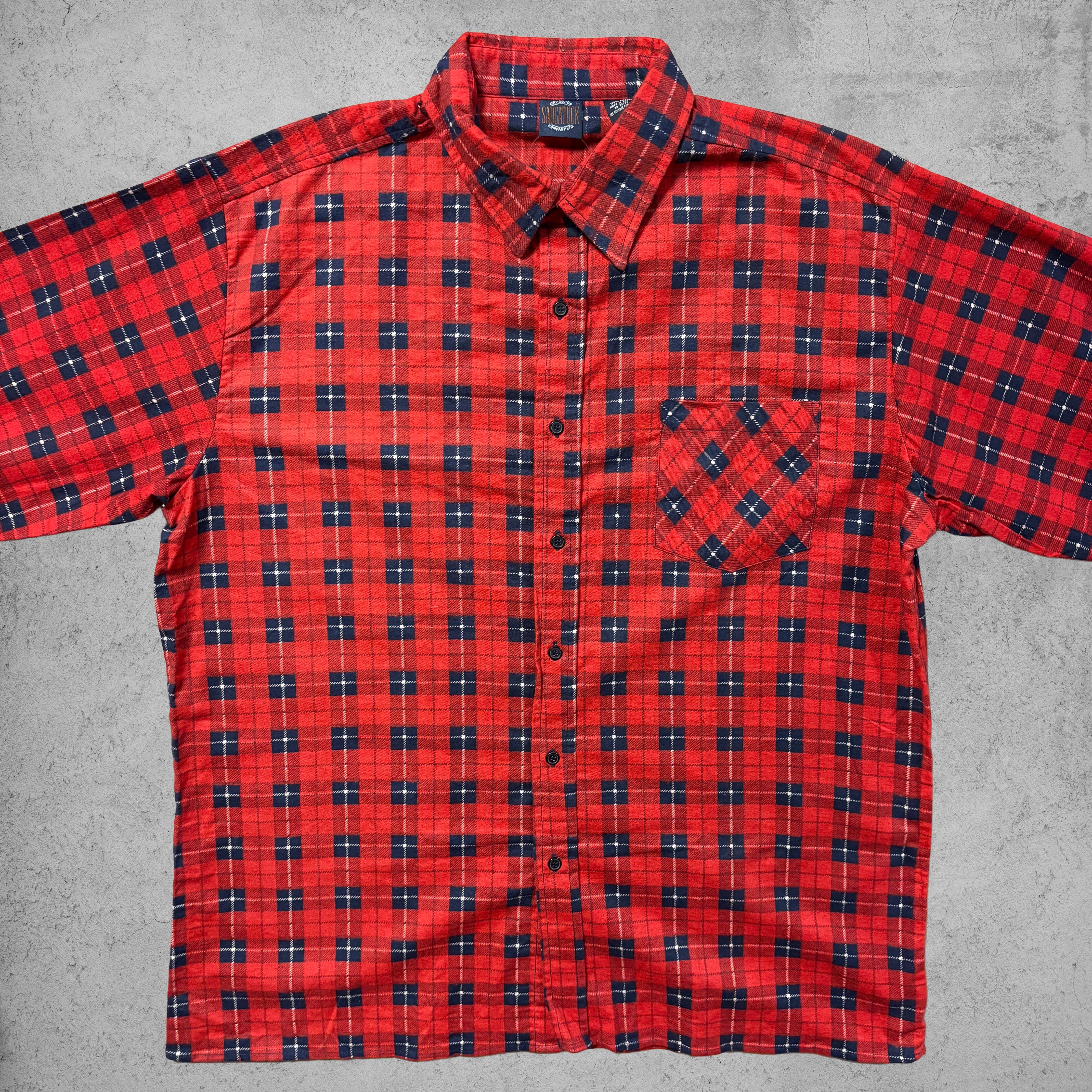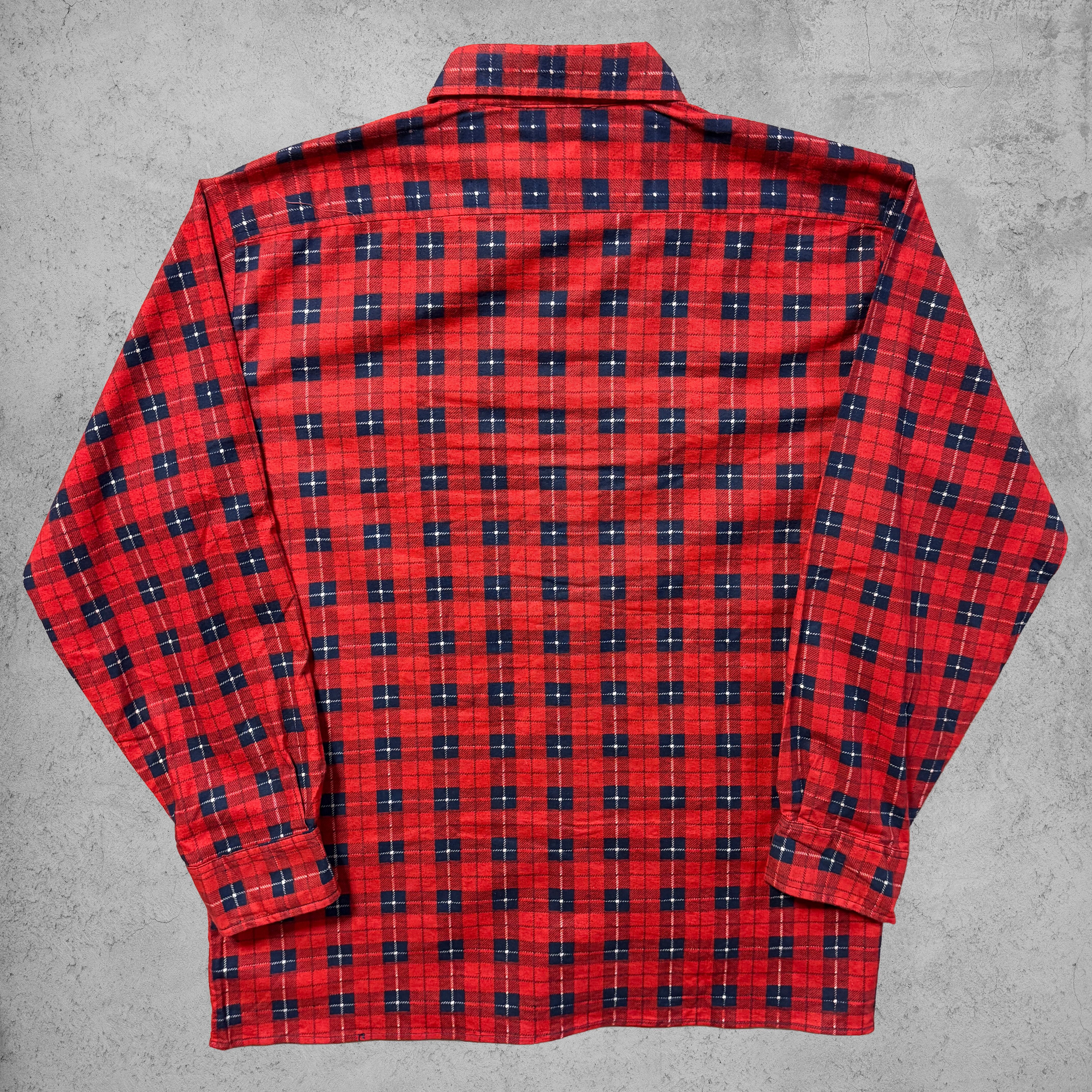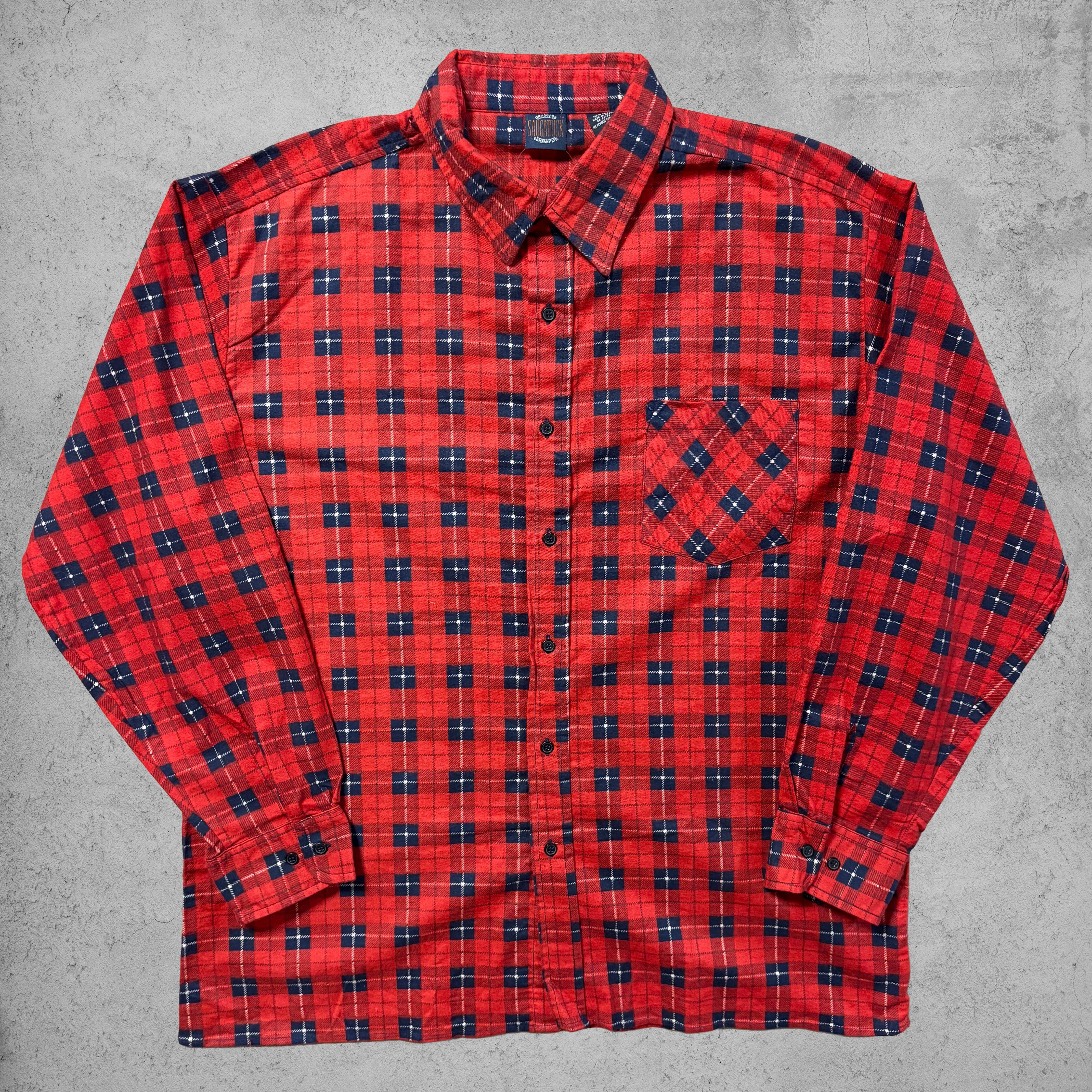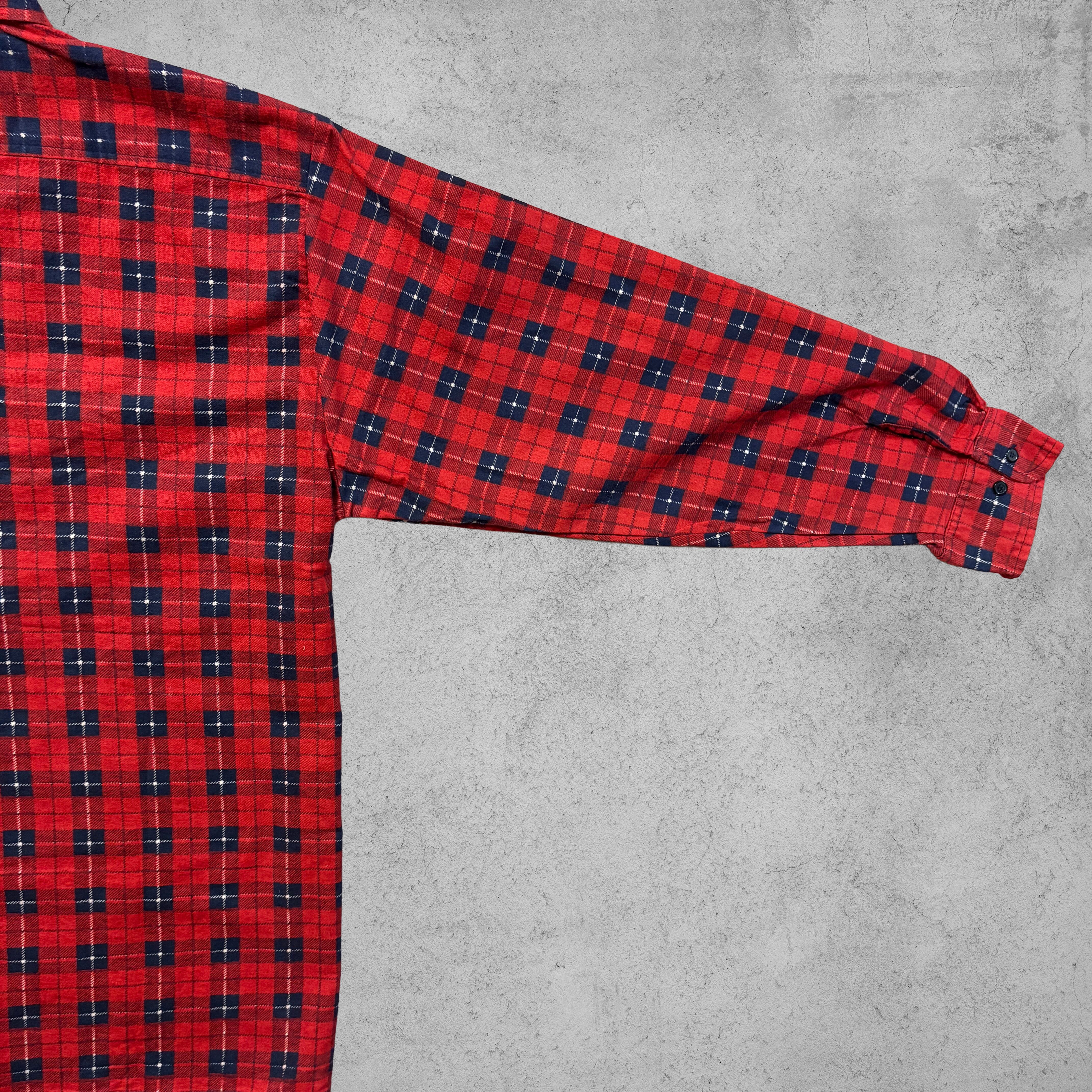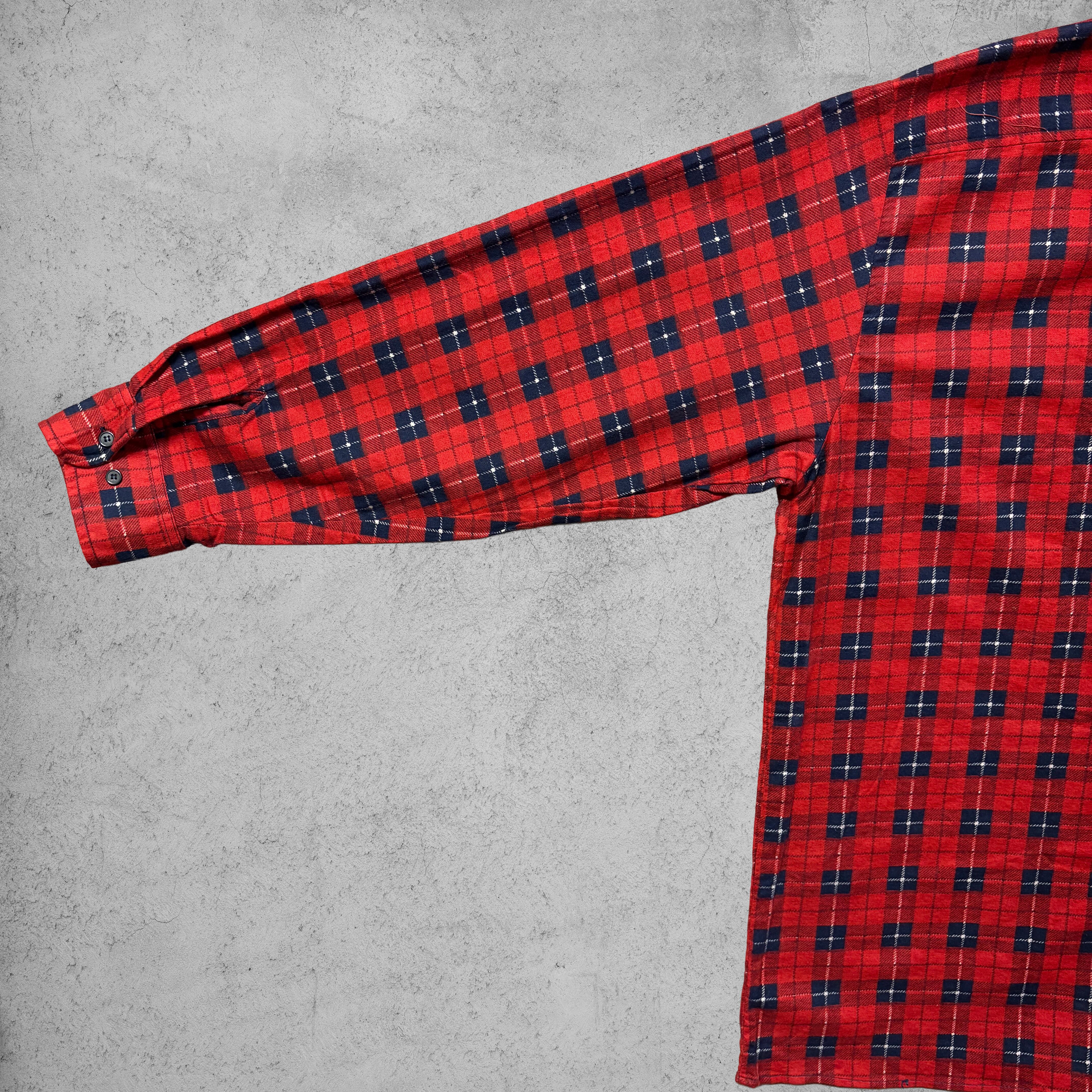 今回のフランネルシャツは、赤ベースにネイビーとホワイトのオーバーチェックを配した細かなグリッド柄が魅力。胸ポケットはバイアス取りで柄合わせのアクセントになる。起毛感のあるコットンフランネルで肌当たりが柔らかく、軽く羽織ってもインナー使いでも活躍する一枚。ゆったりめのXLでリラックスした着こなしができる。