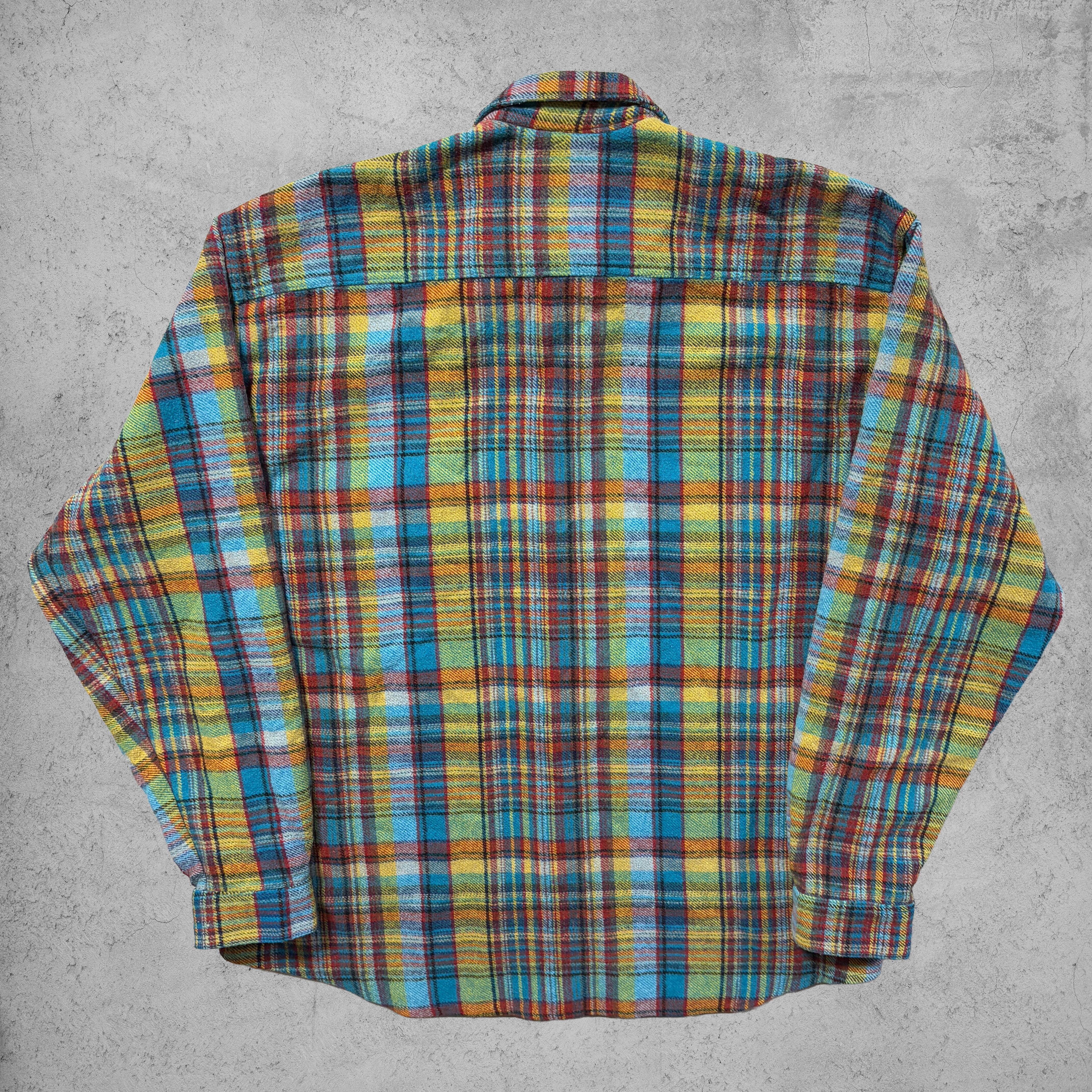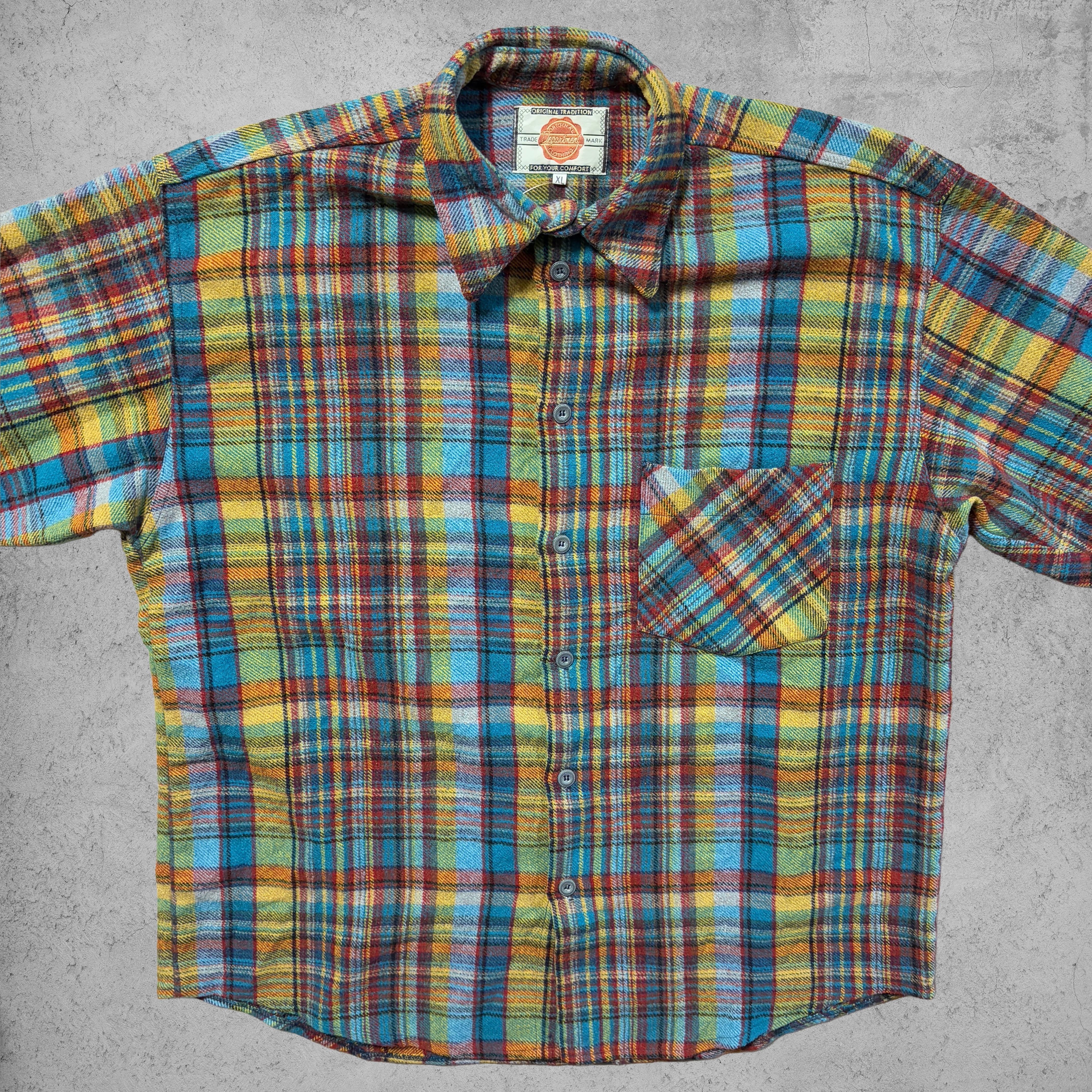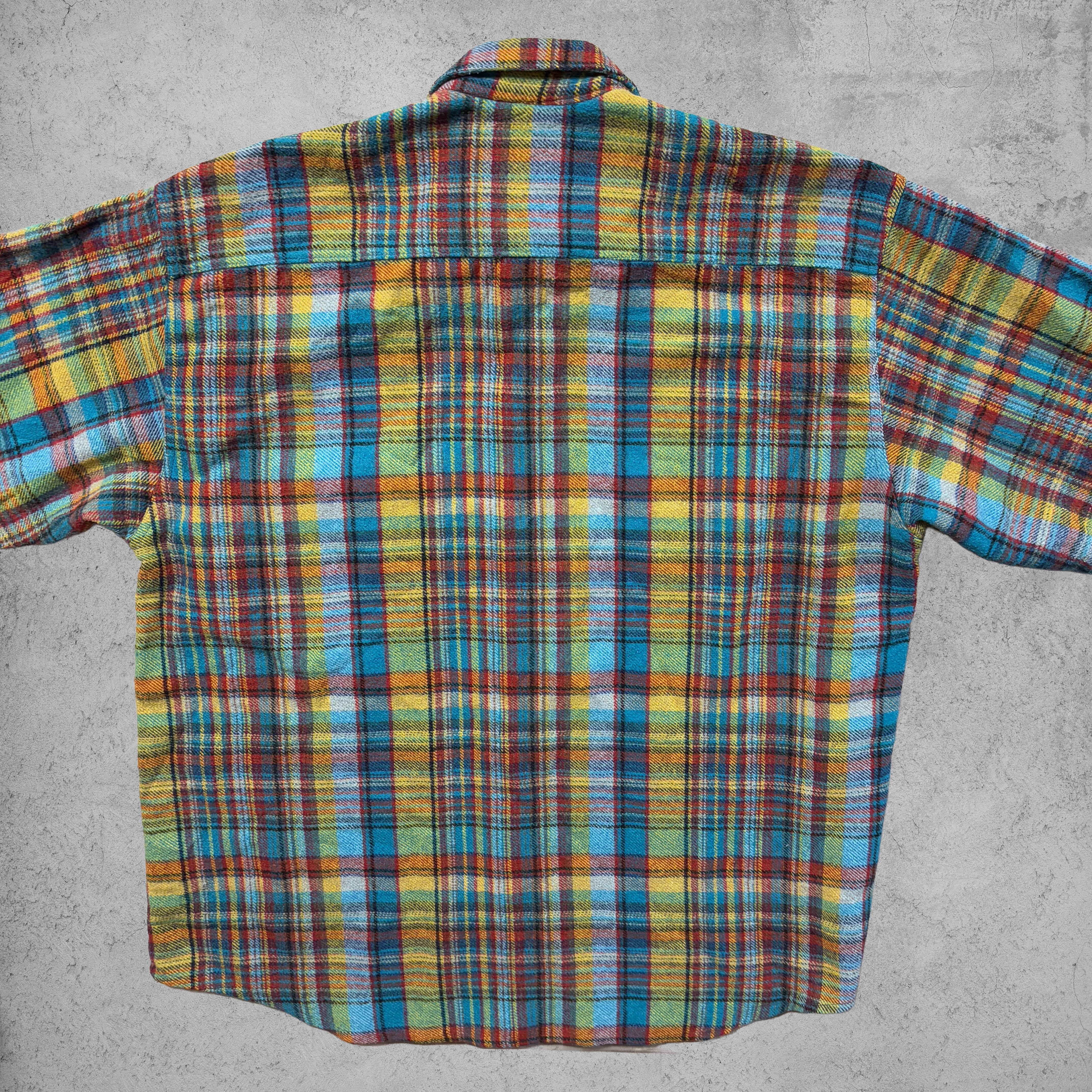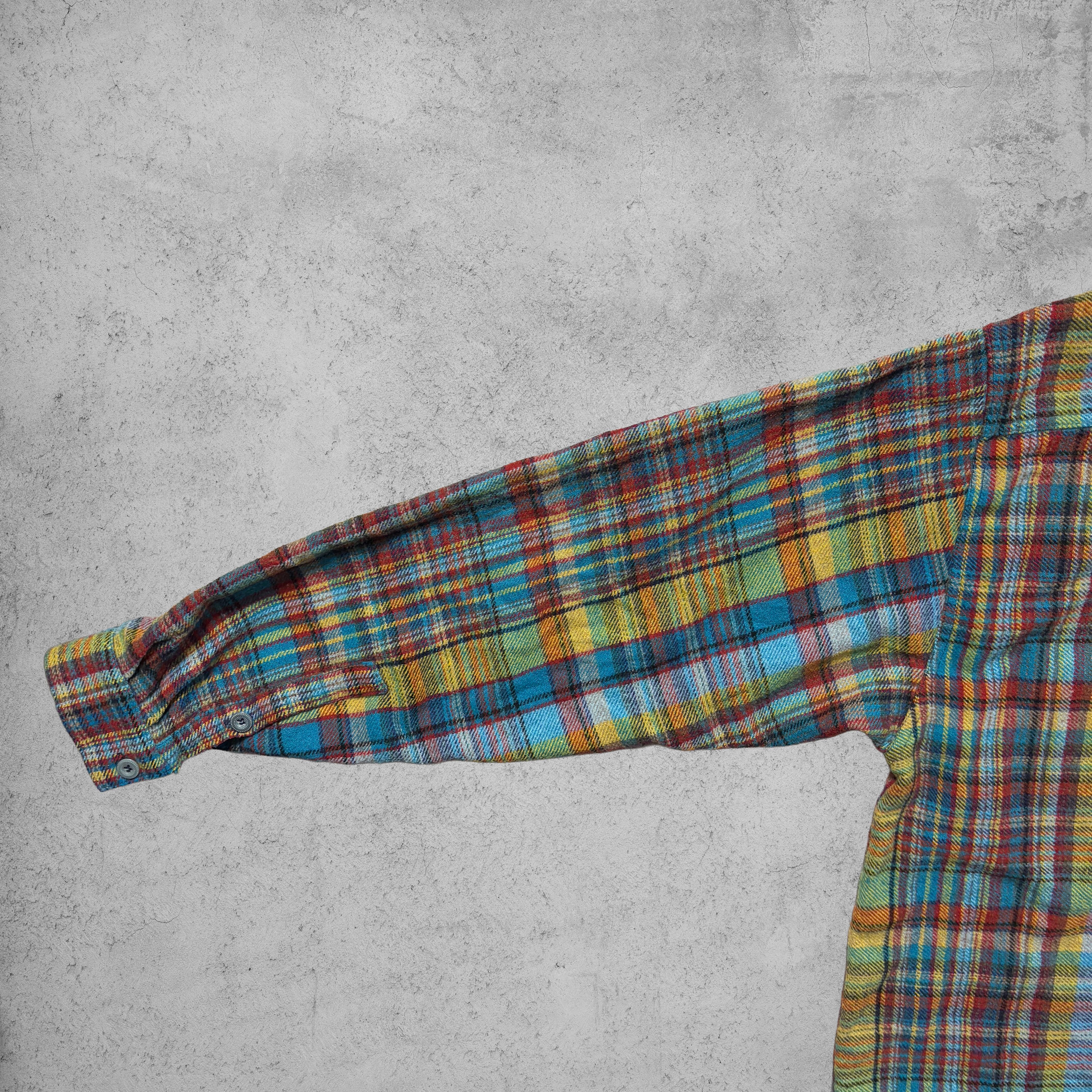 今回のチェックフランネルシャツは、ブルー・イエロー・レッドなど多色使いのビビッドなチェックパターンが目を引く一枚。