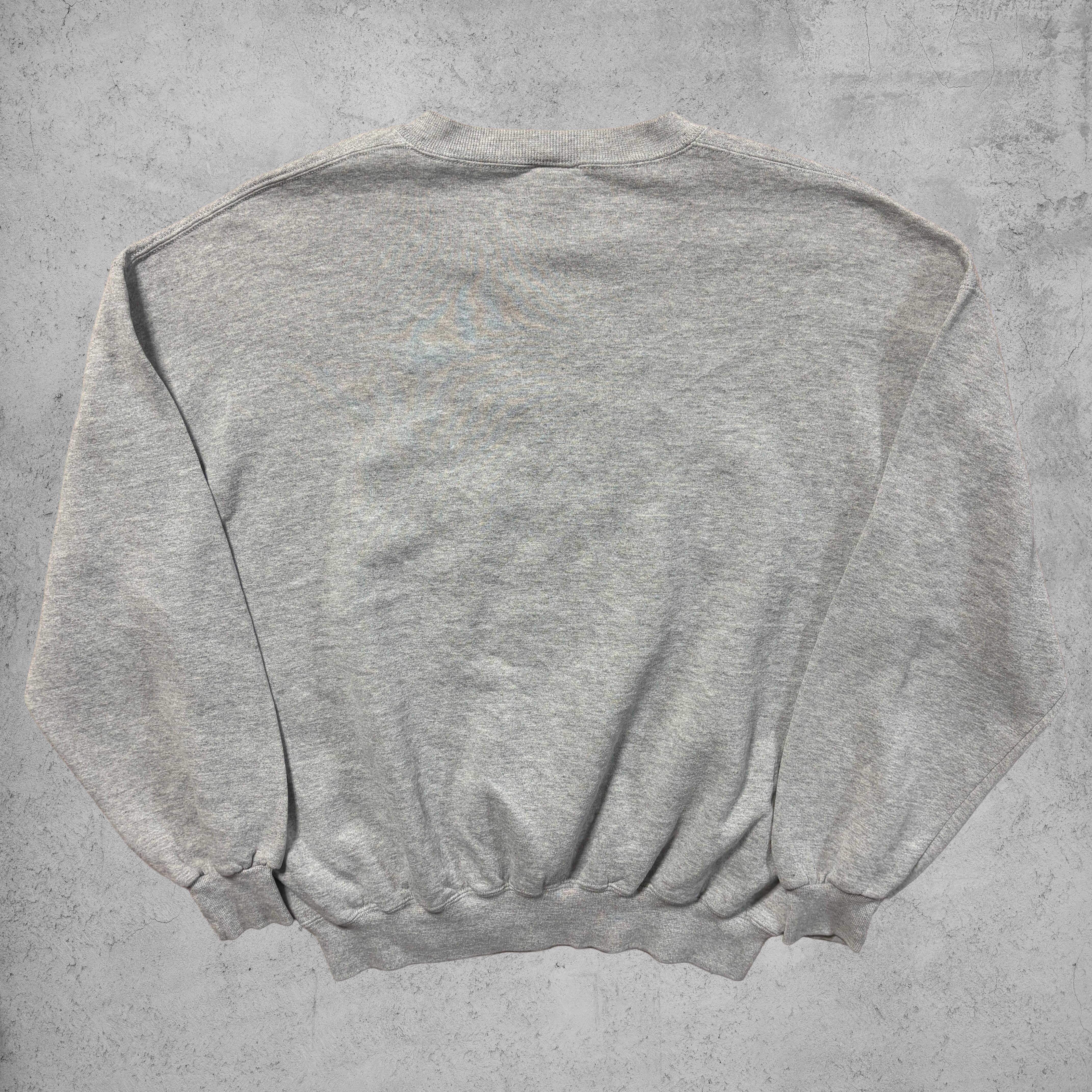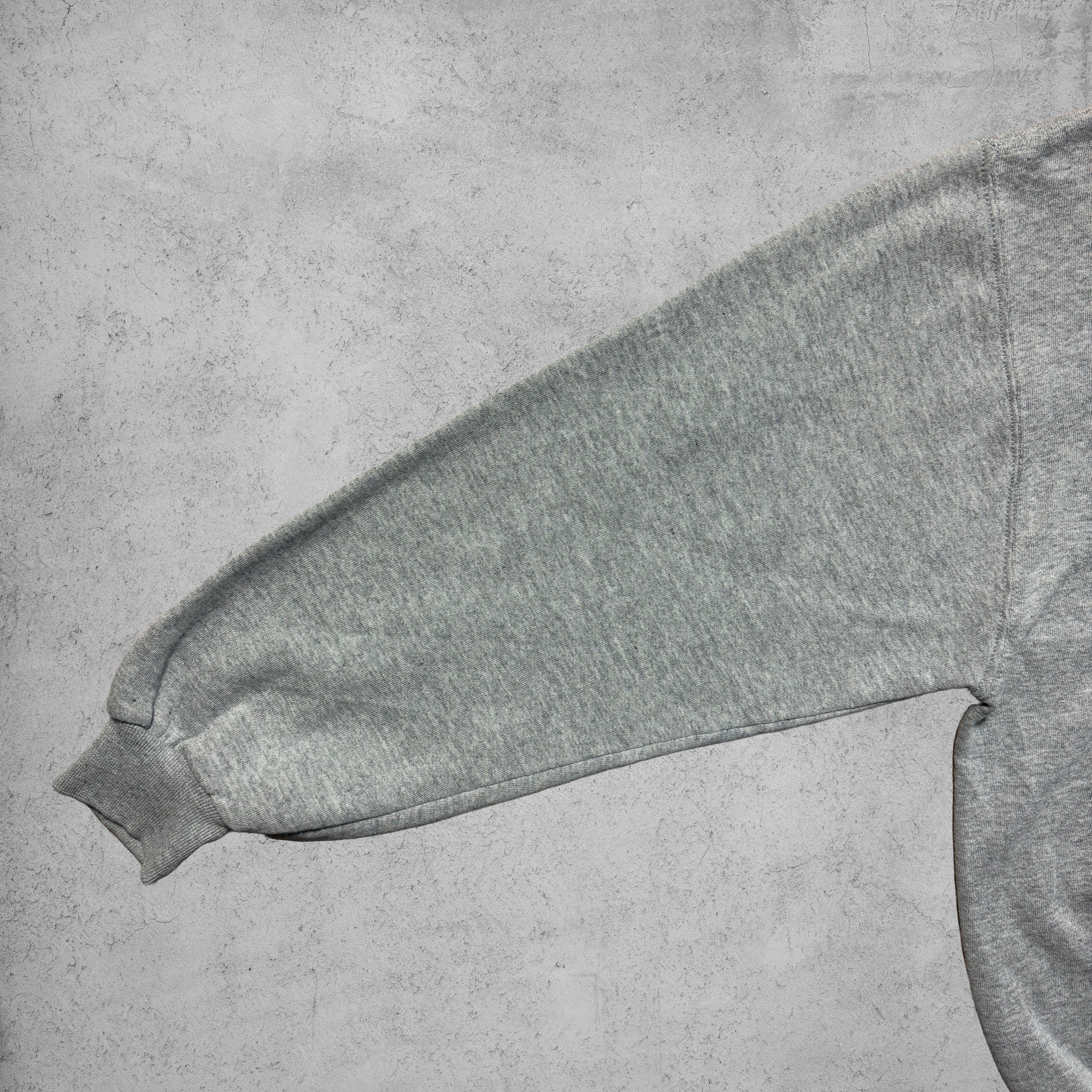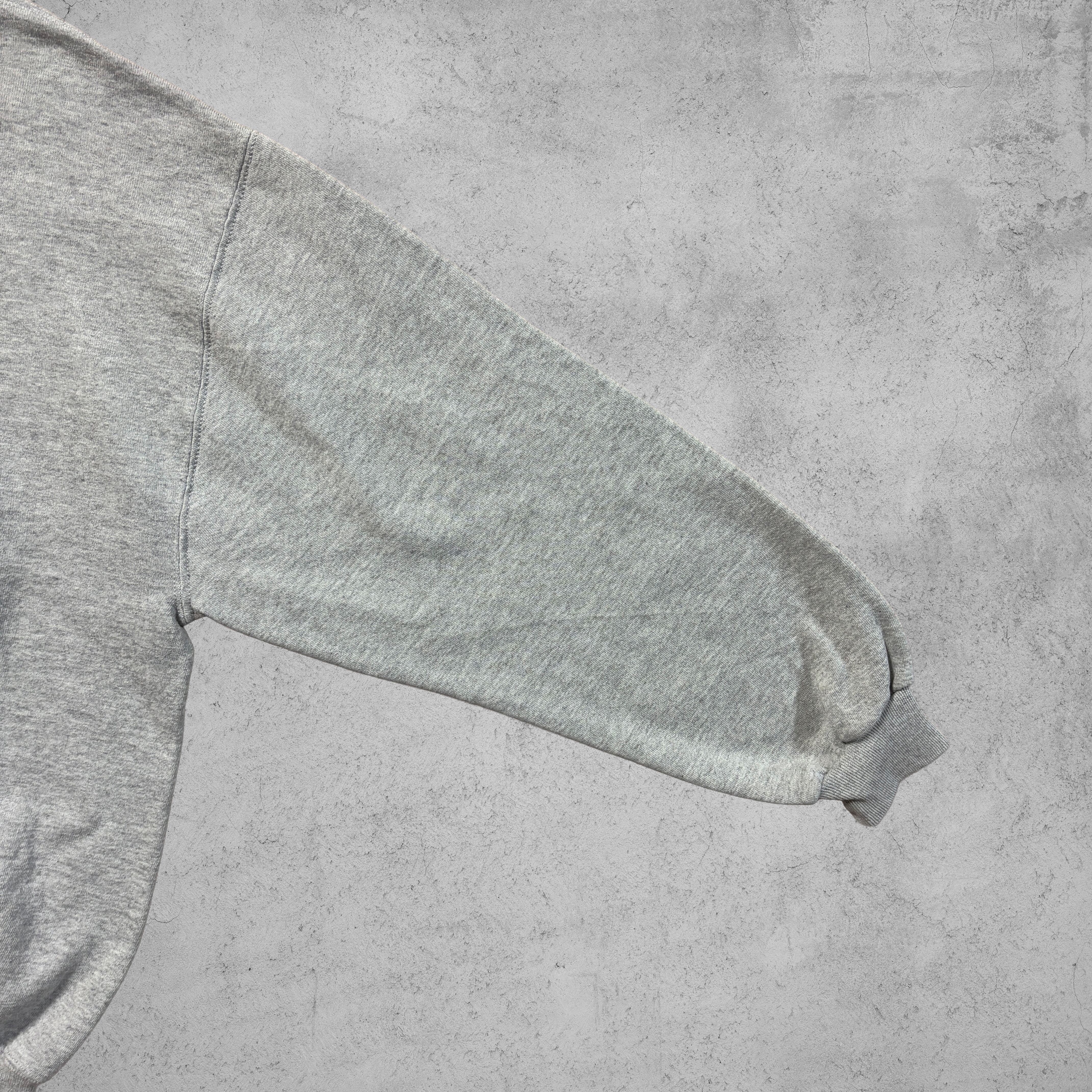今回のクルーネックスウェットは、胸に“UNIVERSITY OF OTTAWA”のアーチロゴ。バーガンディのタックルツイル調ワッペン×ステッチが映える王道カレッジデザイン。霜降りグレーのボディは合わせやすく、裏起毛がしっかり立った暖かな着心地。首元のRマーク織タグは「RUSSELL ATHLETIC / MADE IN U.S.A. / XXL」。袖口・裾のリブも程よい締まりで、ゆったりシルエットを楽しめる。