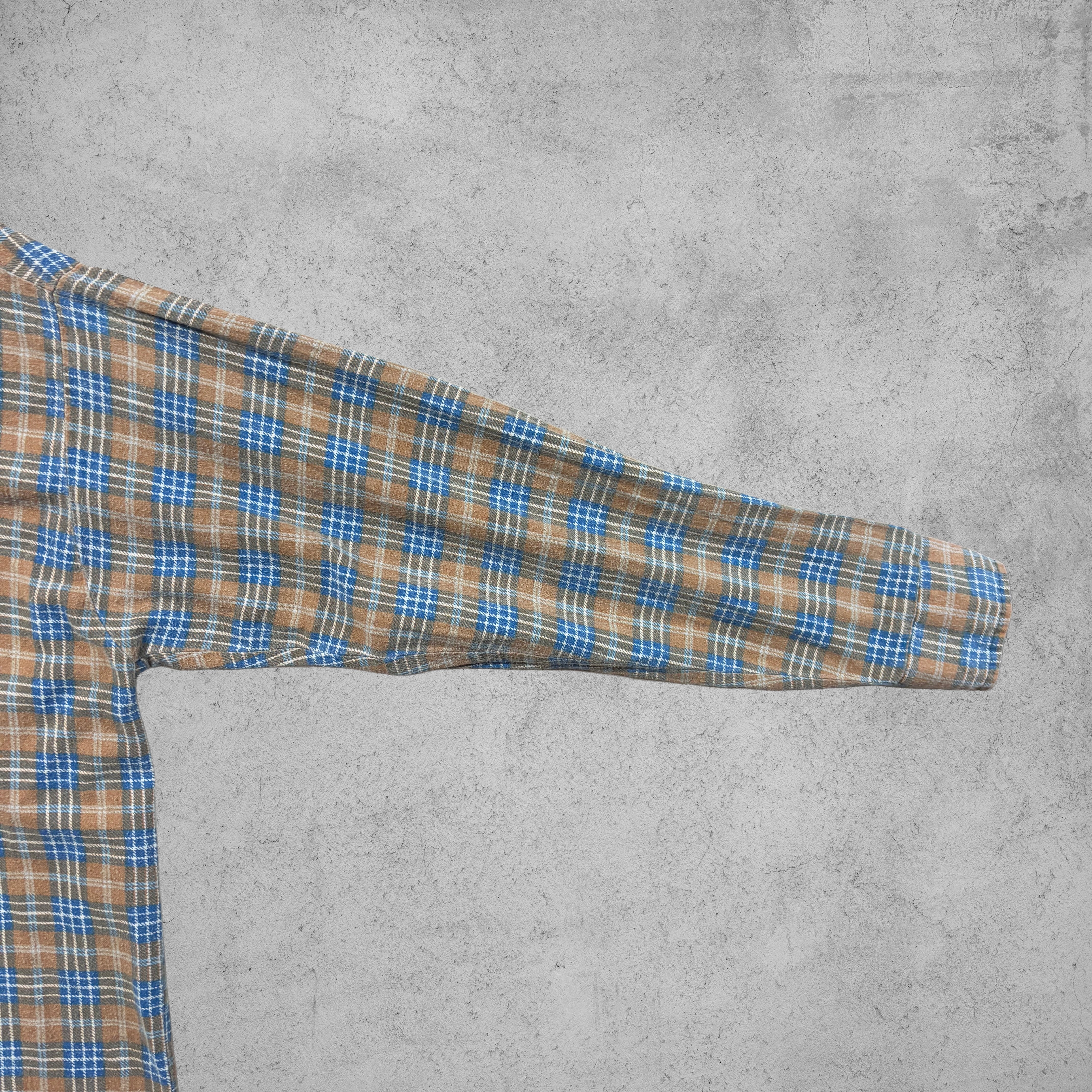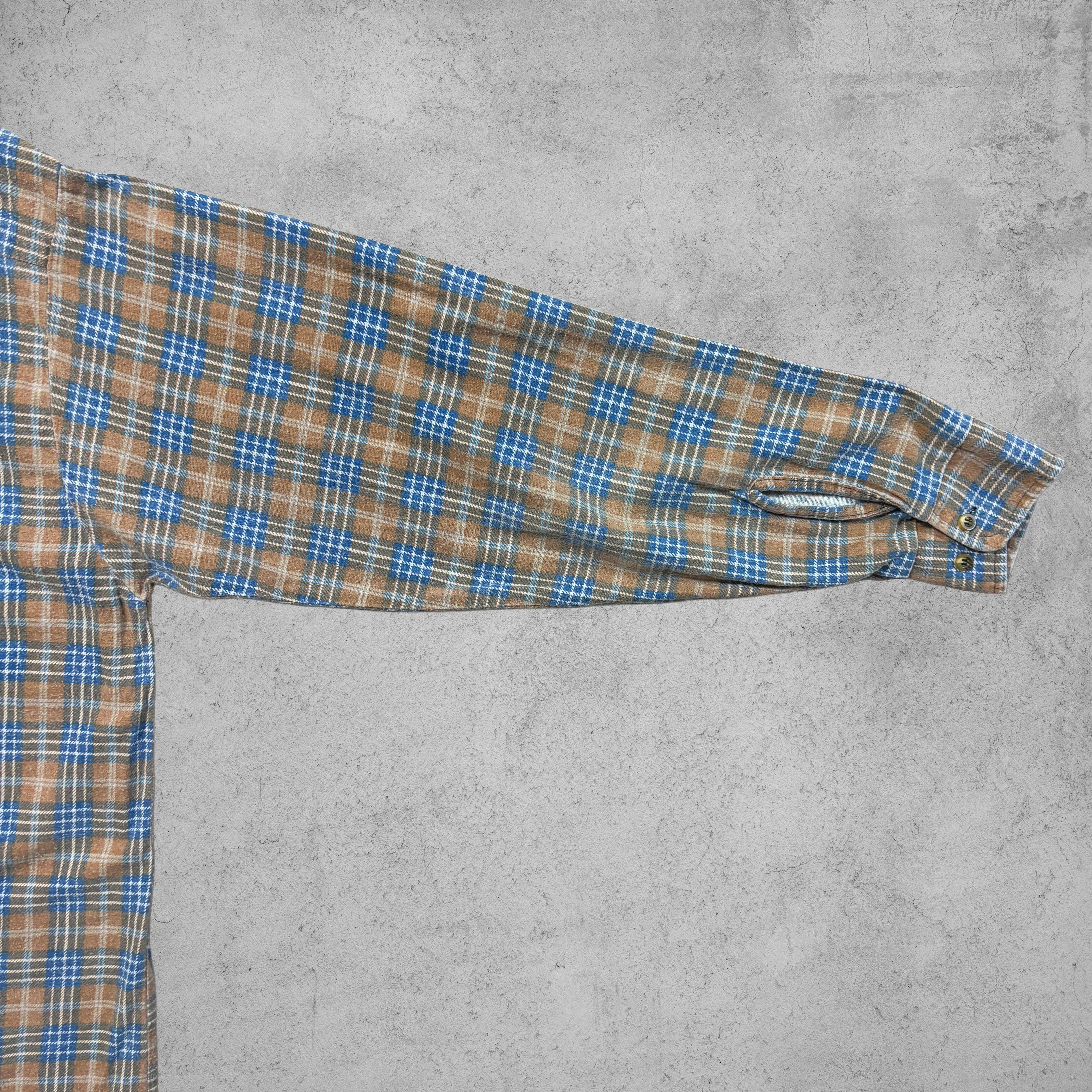 本品は、ライトブラウン×サックスブルーの落ち着いたタータンチェックネルシャツ。胸ポケットを斜め取りにした遊び心のあるデザインがポイントで、色味のバランスも絶妙。クラシックなチェックながら、都会的な抜け感を演出できる一枚。