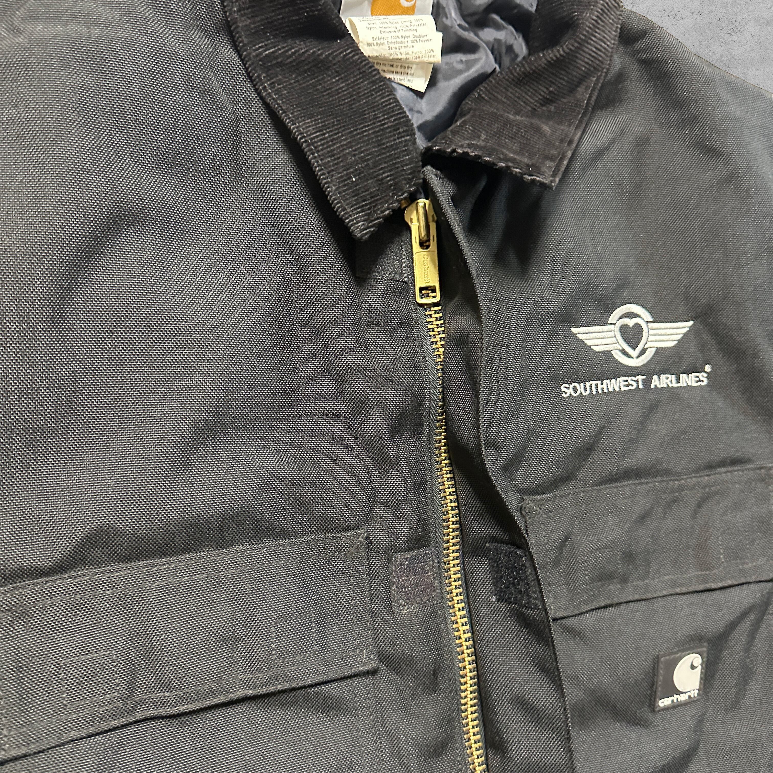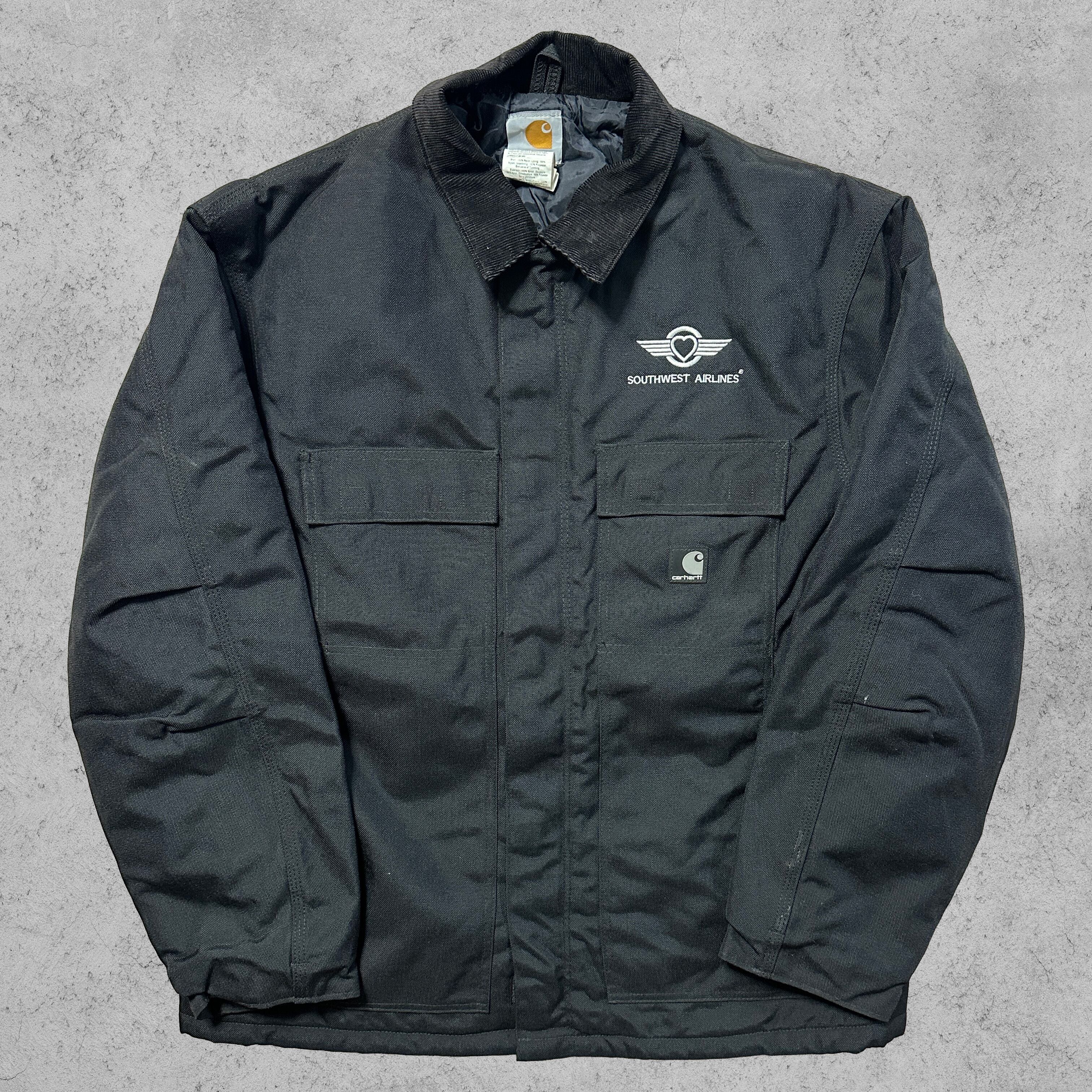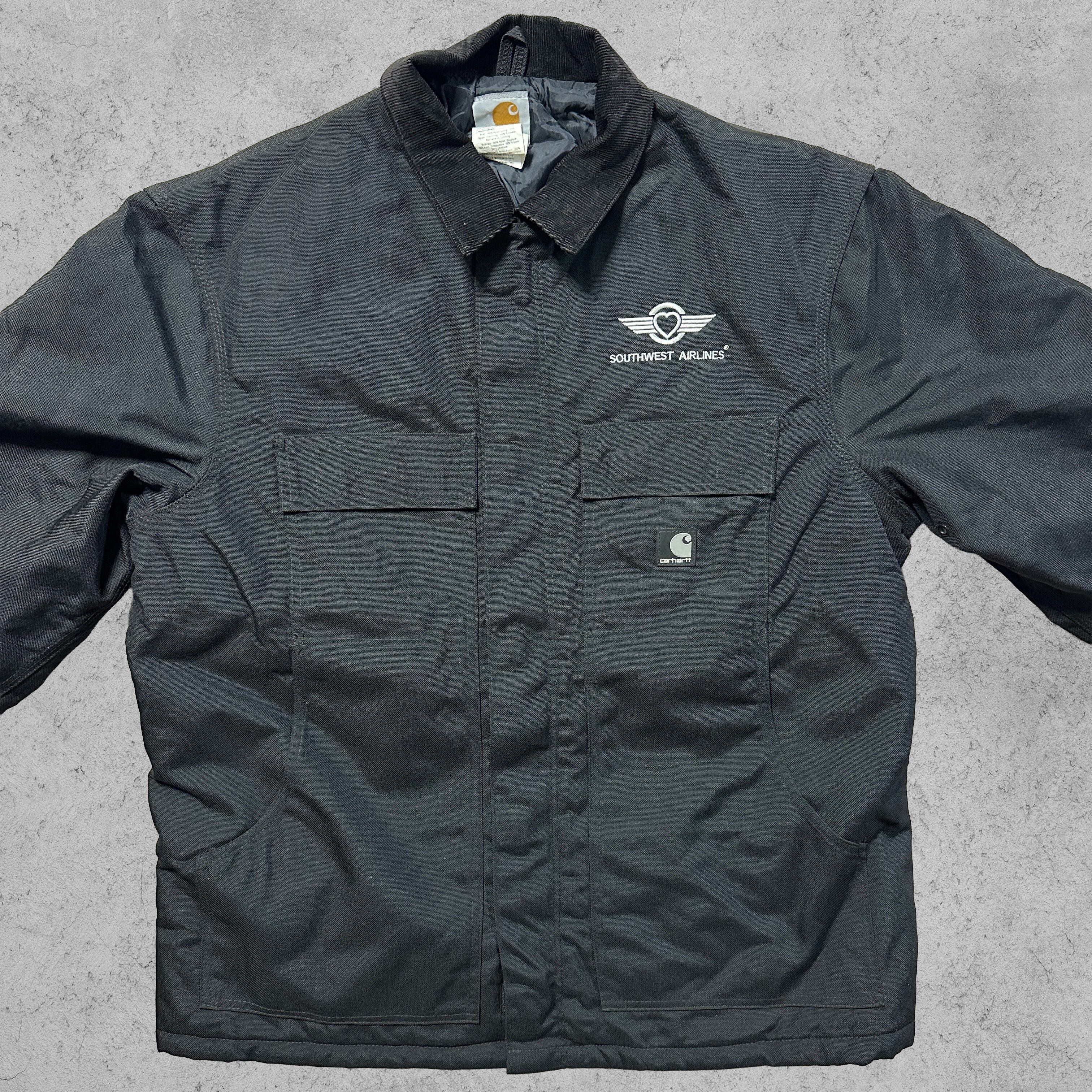 今回のアイテムは、アメリカの大手航空会社「Southwest Airlines(サウスウエスト航空)」の企業刺繍が入った特別仕様のCarharttアクティブワークジャケット(C55 BLK)。胸元にはハートウィングのロゴと社名刺繍、フロントにはカーハートのスクリプトロゴタグを配置したコラボレーション的1着。