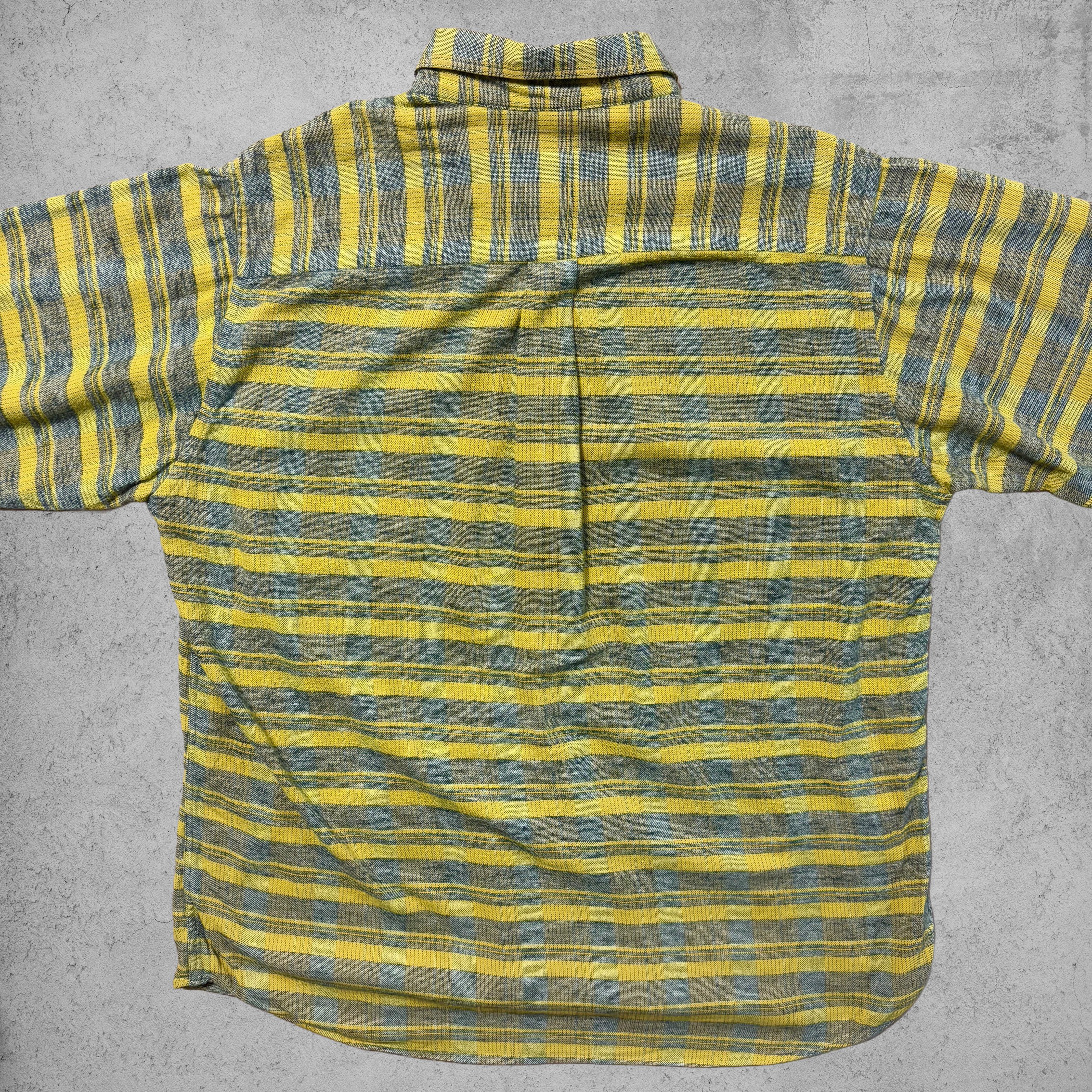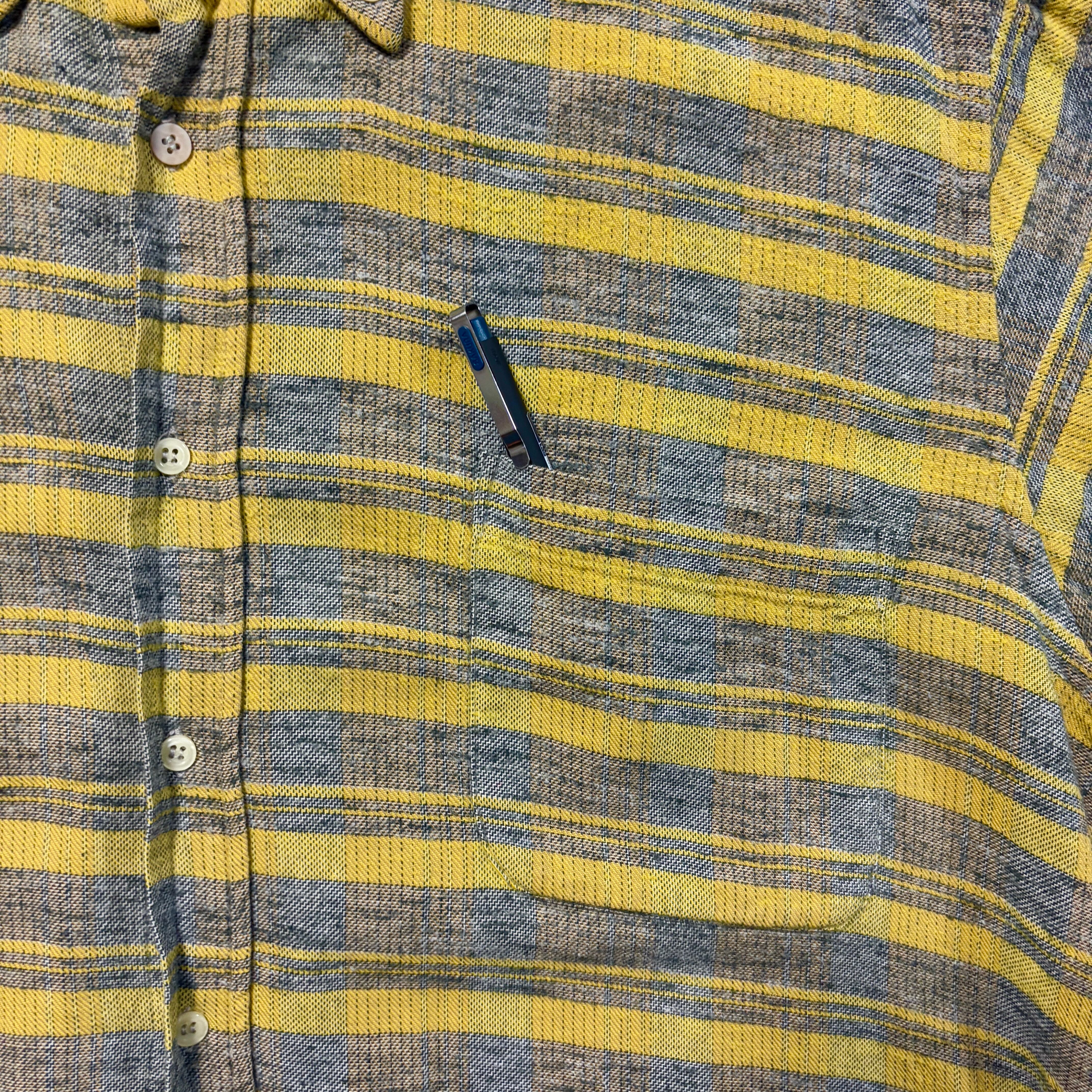 本品は、柔らかな色合いが印象的なイエロー×グレーのチェックネルシャツ。ボタンダウン仕様で上品さがありつつ、ざっくりとした織りの風合いがヴィンテージらしいぬくもりを感じさせる。色味のバランスがよく、古着コーデに自然と馴染む一枚。