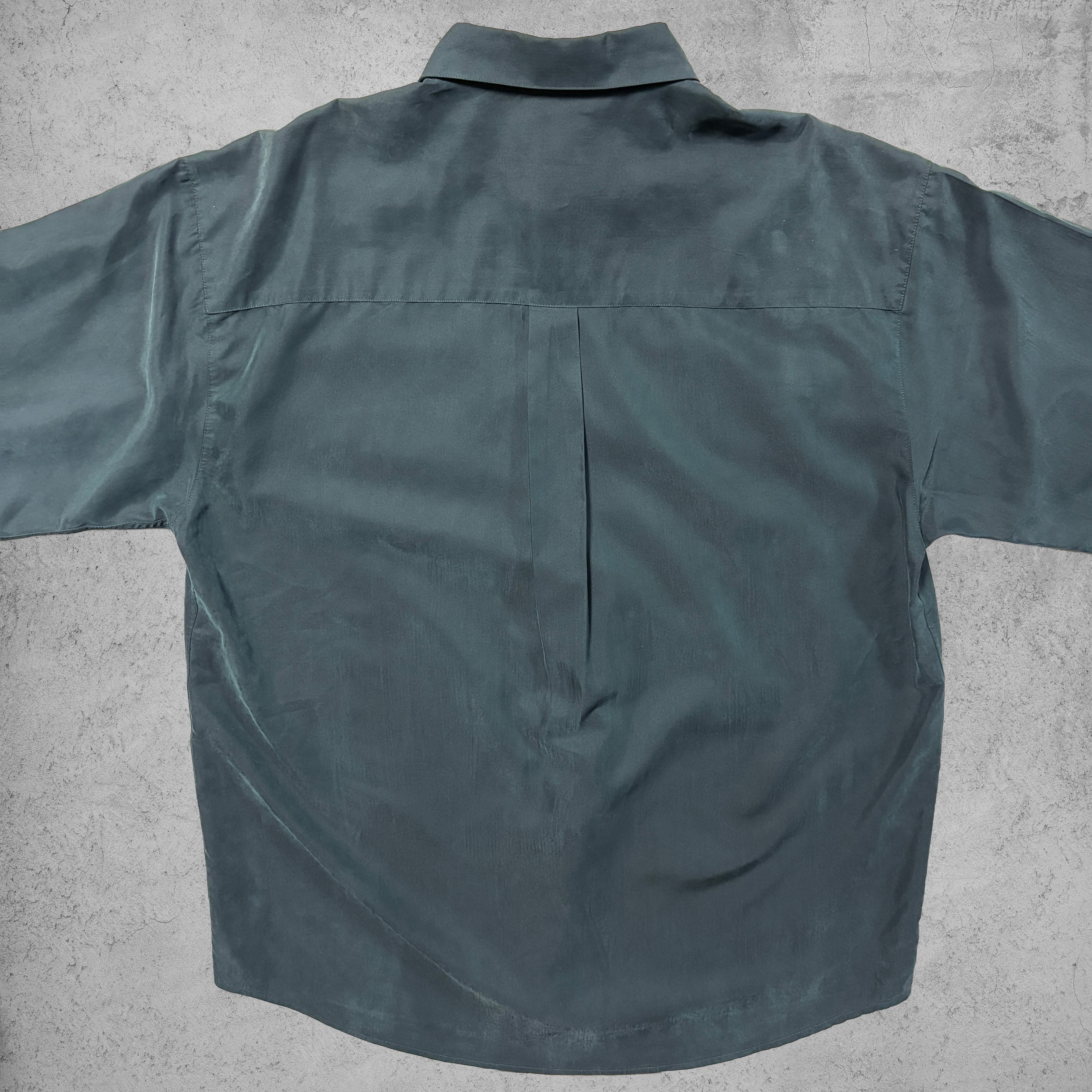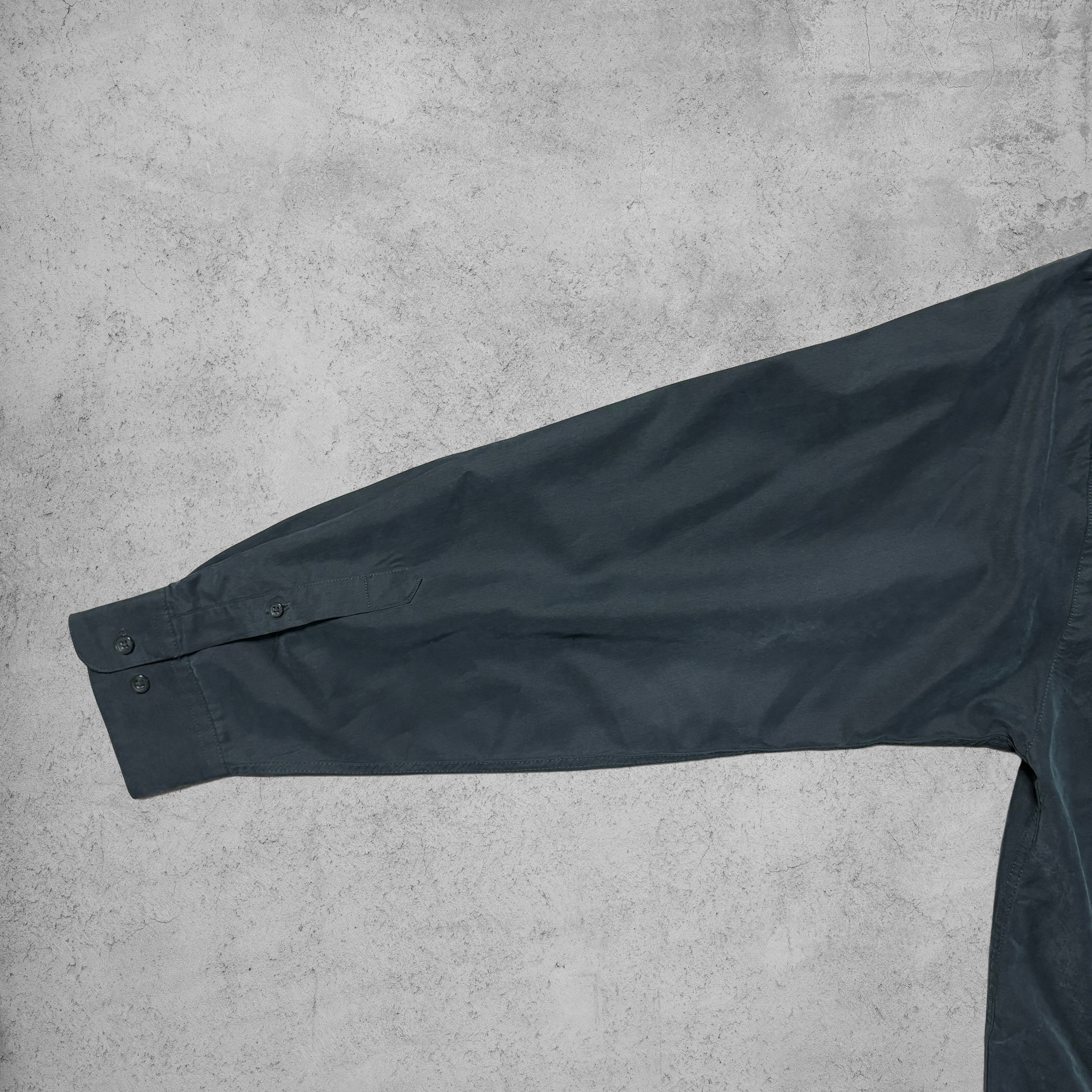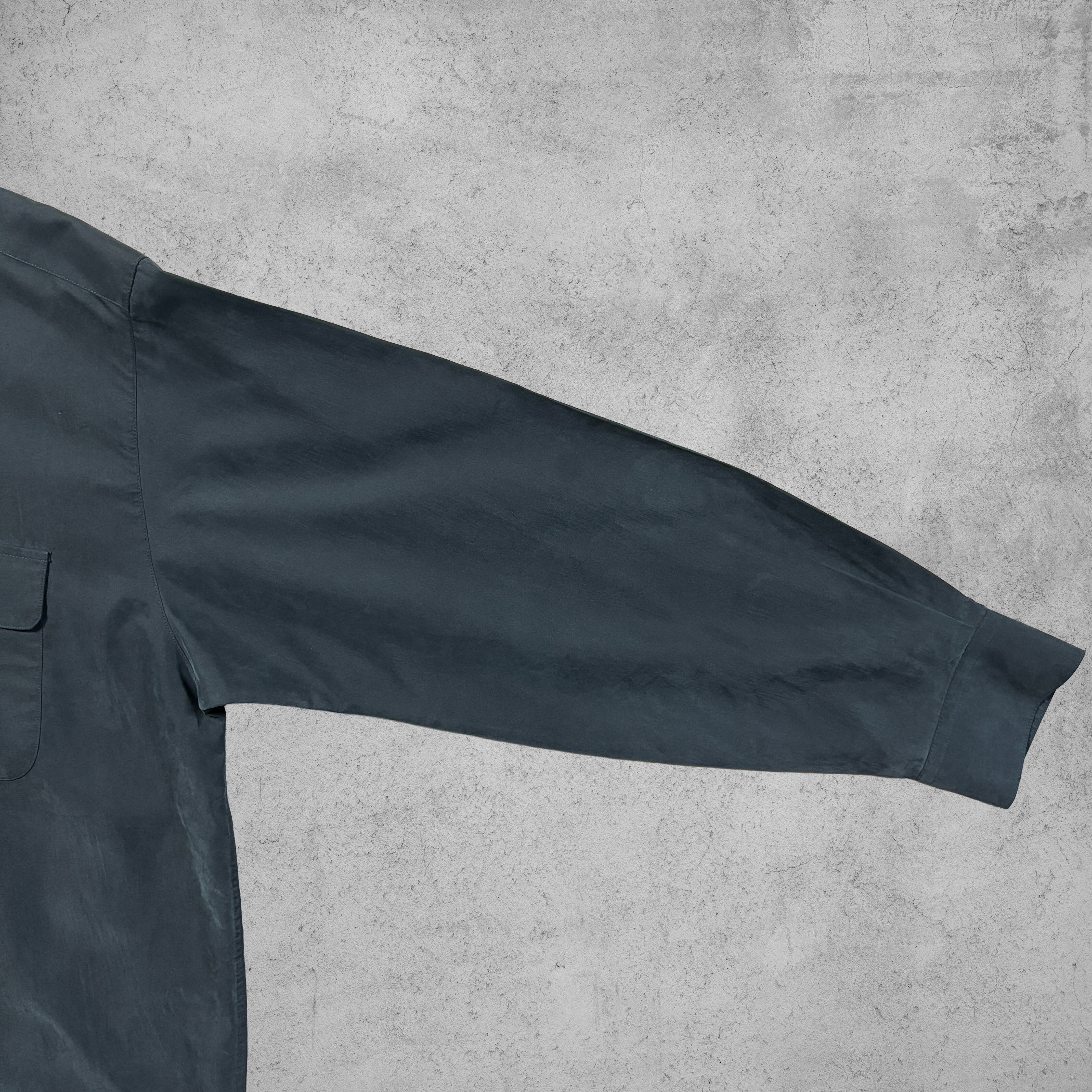 今回のアイテムは、深みのあるブラックカラーが魅力のレーヨン×ポリエステル混シャツ。控えめな光沢があり、上品な落ち感が特徴。シンプルながらも洗練された印象で、ワークシャツ風のダブルポケット仕様がほどよく男らしさをプラスしている。