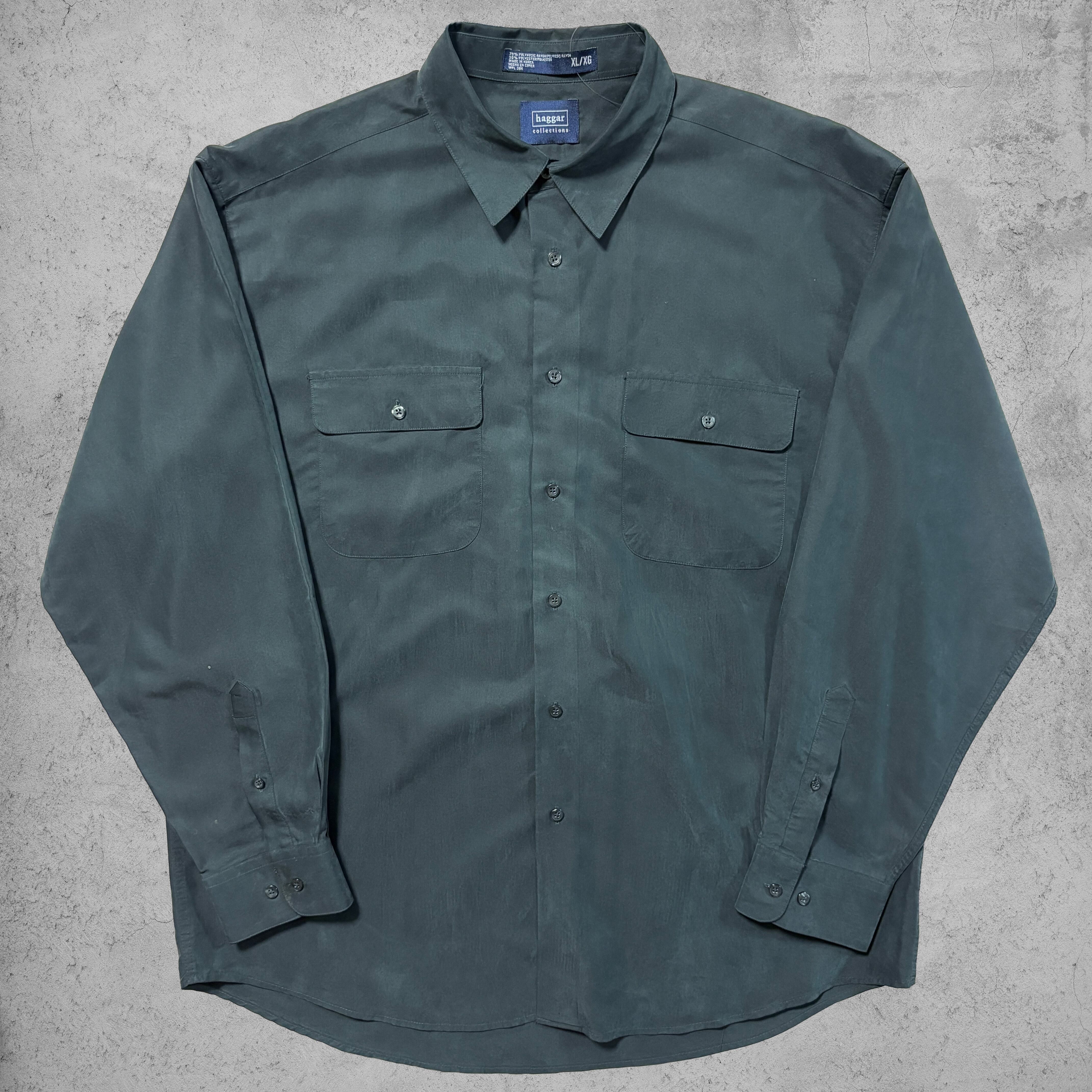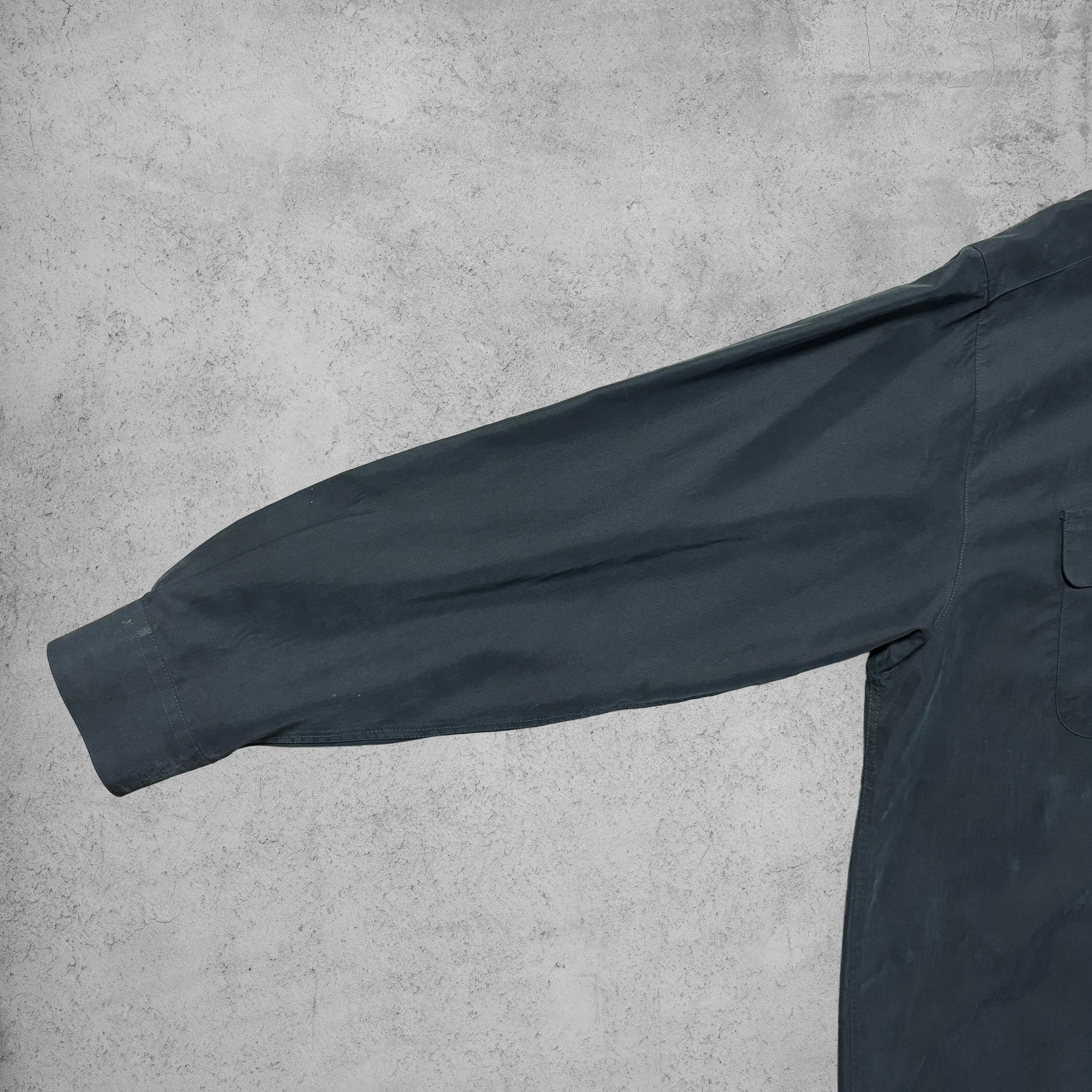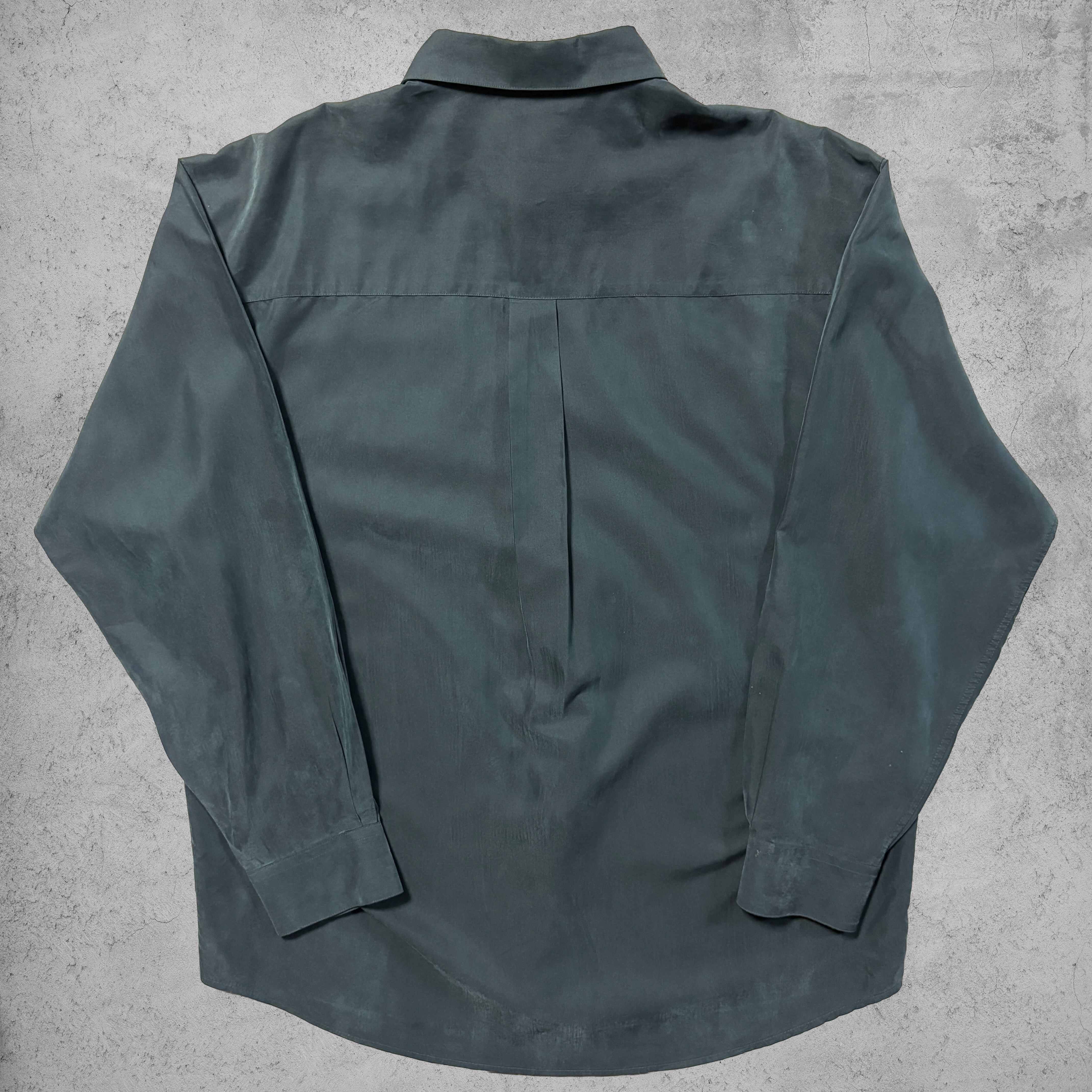 今回のアイテムは、深みのあるブラックカラーが魅力のレーヨン×ポリエステル混シャツ。控えめな光沢があり、上品な落ち感が特徴。シンプルながらも洗練された印象で、ワークシャツ風のダブルポケット仕様がほどよく男らしさをプラスしている。