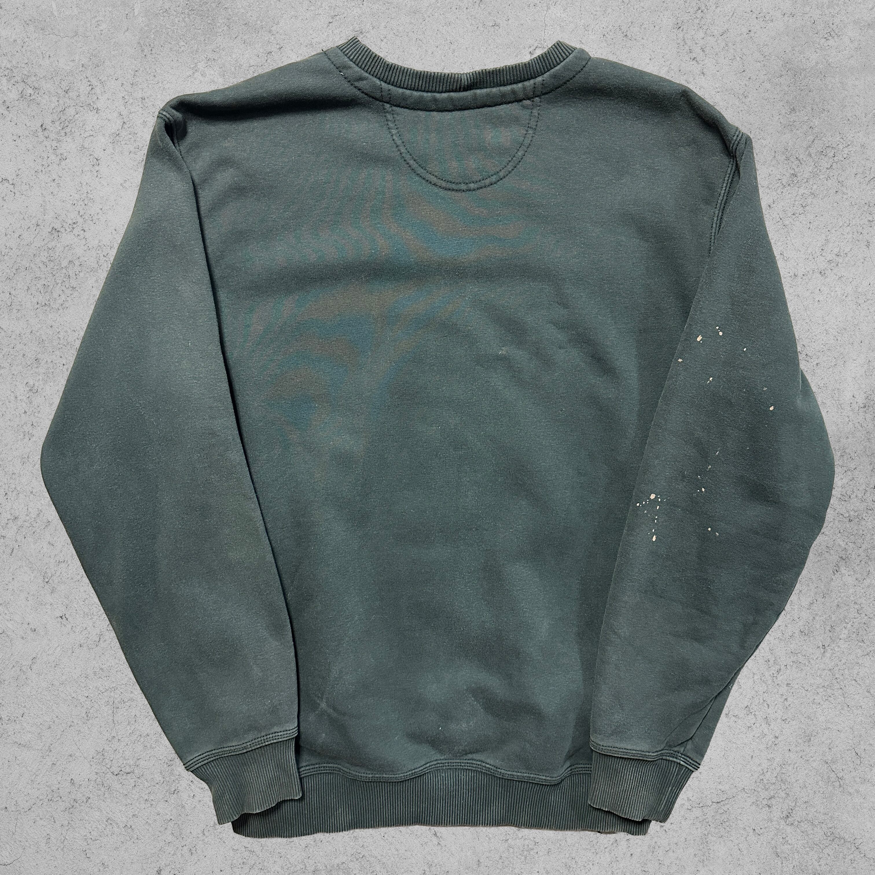 カラーはフェード感のあるチャコールグリーン系で、袖部分にペンキ飛びのような跡が見られ、リアルなワークウェアらしいエイジングを感じる一枚。