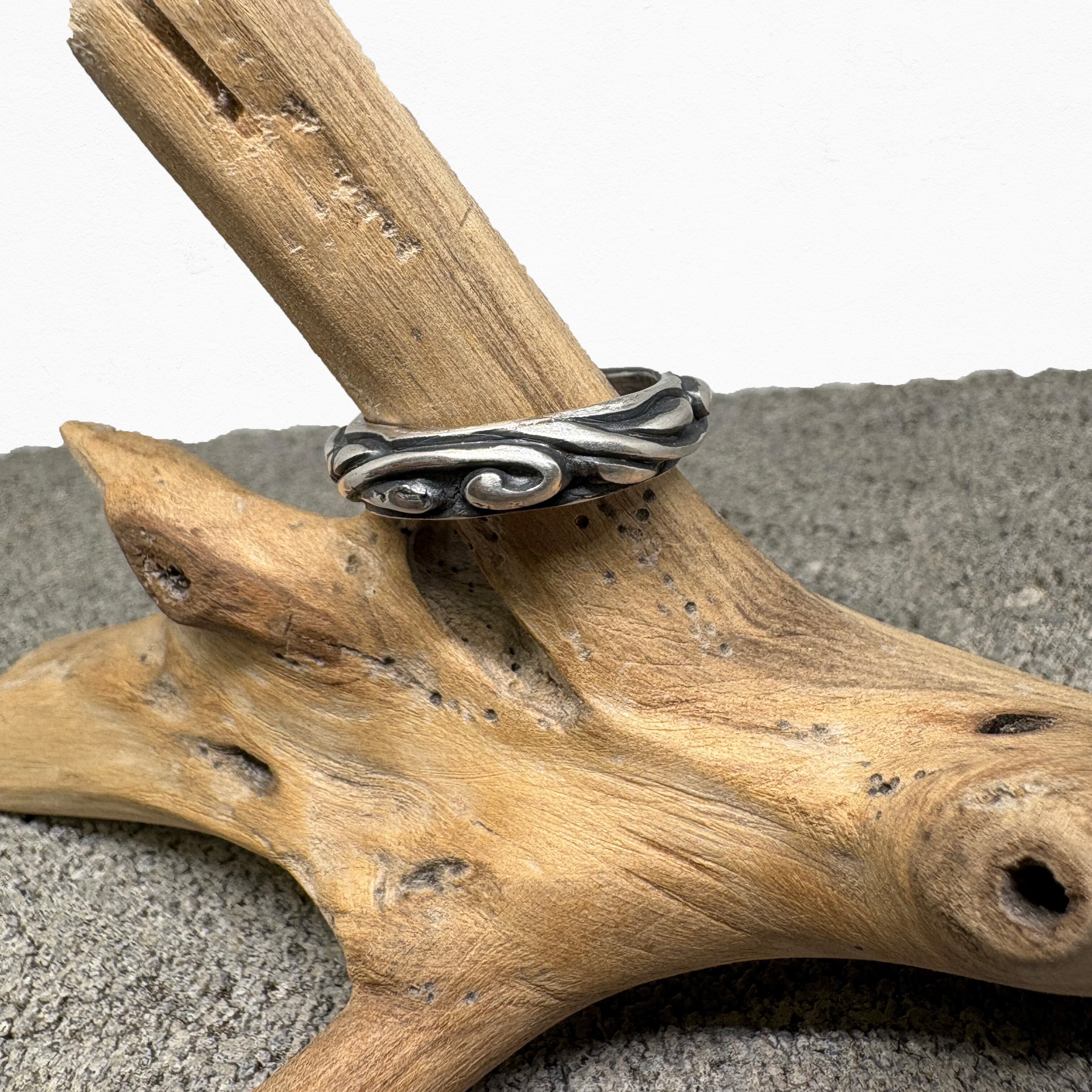 職人が銀粘土から作り上げた、全面にうねりのあるスクロール/アラベスク模様を回し彫りしたクラフトシルバーリング。植物のつぼみのような膨らみと流線のレリーフが立体的で、燻し(いぶし)をあえてつけたダークトーンでヴィンテージ感を演出している。内側にスターリングシルバー製である「925」マークを刻印。幅は太すぎず細すぎないバランスで、単品でもスタックでも使いやすい。男女問わず手元のアクセントになる一本。