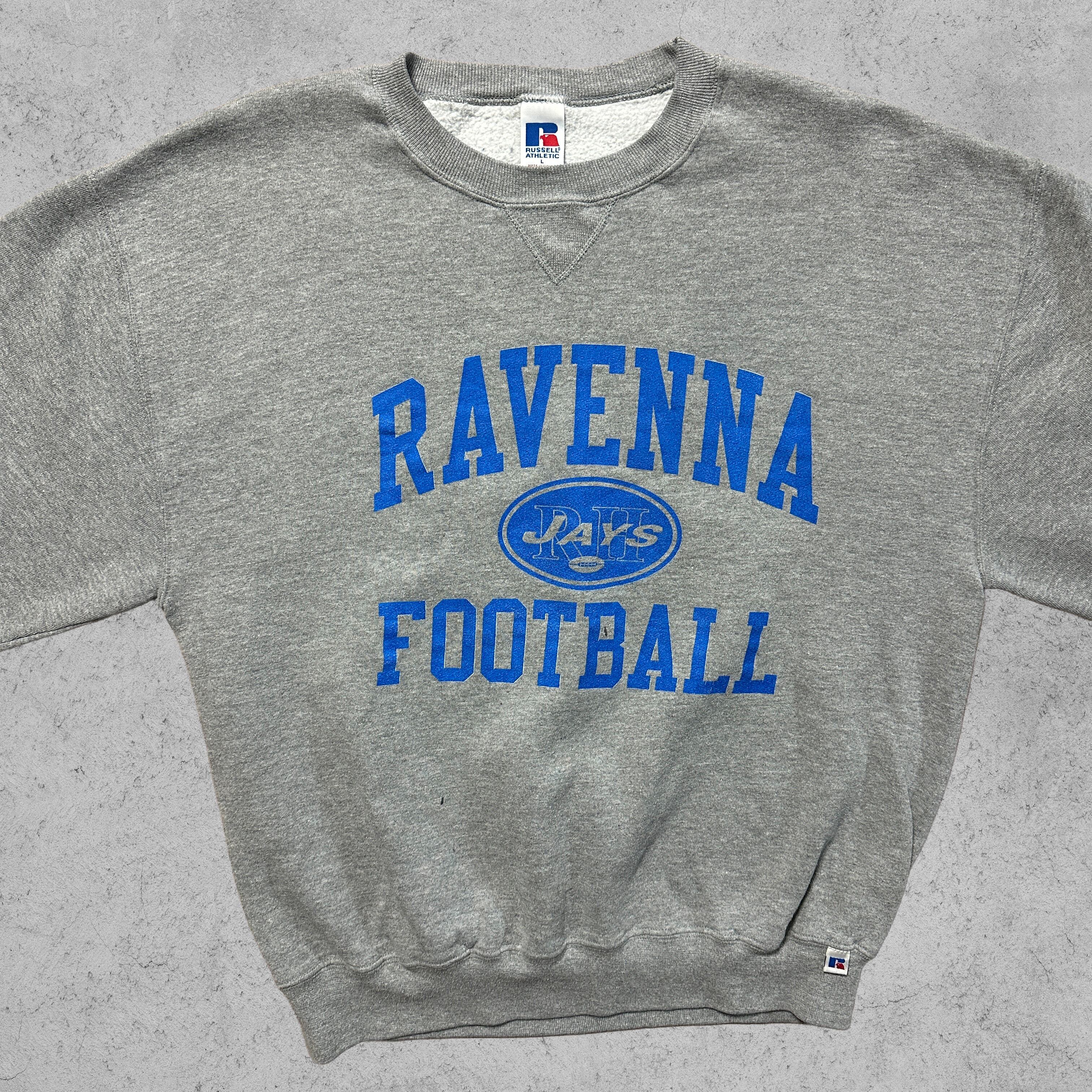今回のスウェットは、胸に「RAVENNA FOOTBALL」アーチロゴと楕円の“JAYS”ロゴが入る王道カレッジデザイン。