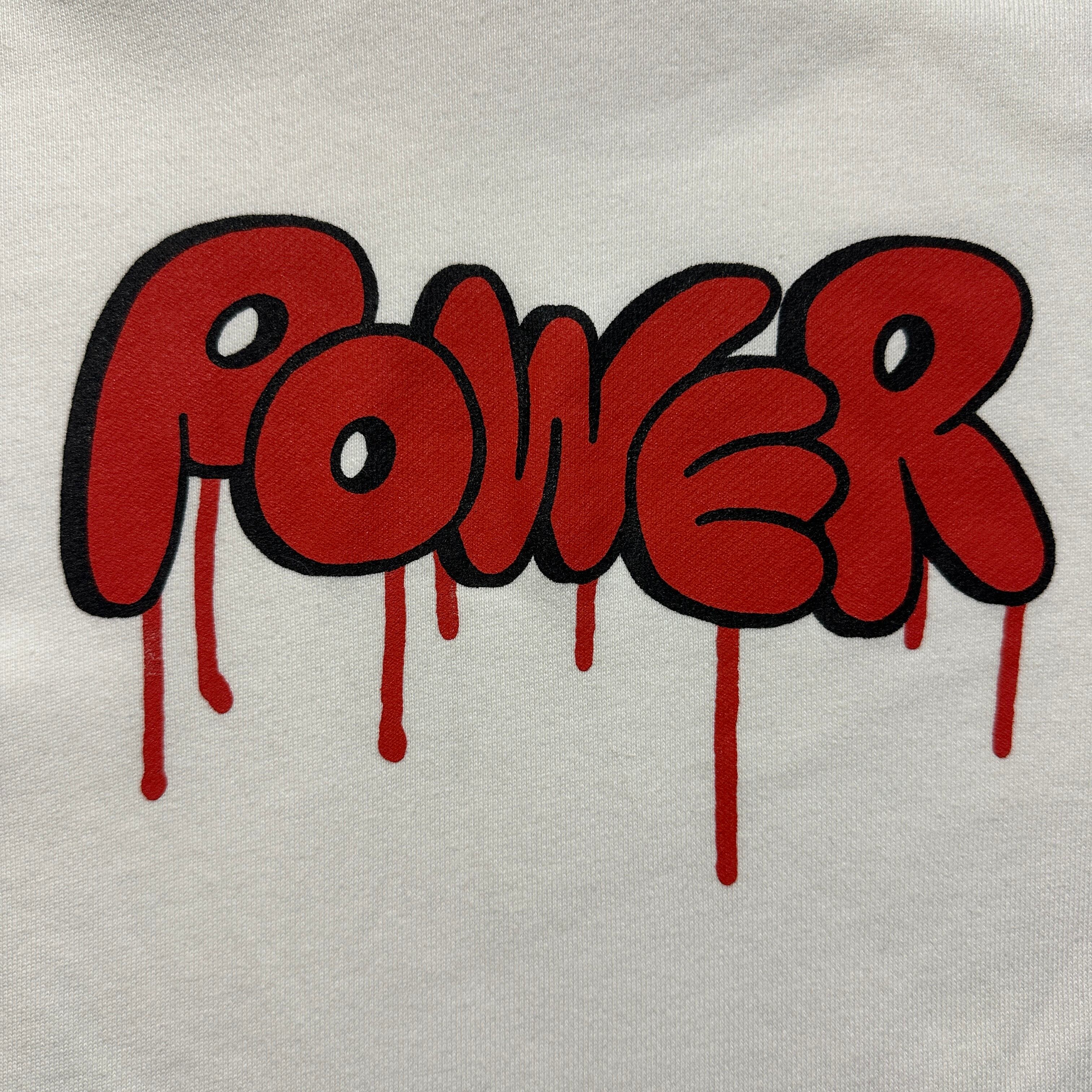 胸元には「POWER」の赤いドリップロゴ、背面にはキャラクターの印象的なアートプリントが大胆にデザインされており、ストリートアートのようなポップさとグランジ感を併せ持つ一枚。