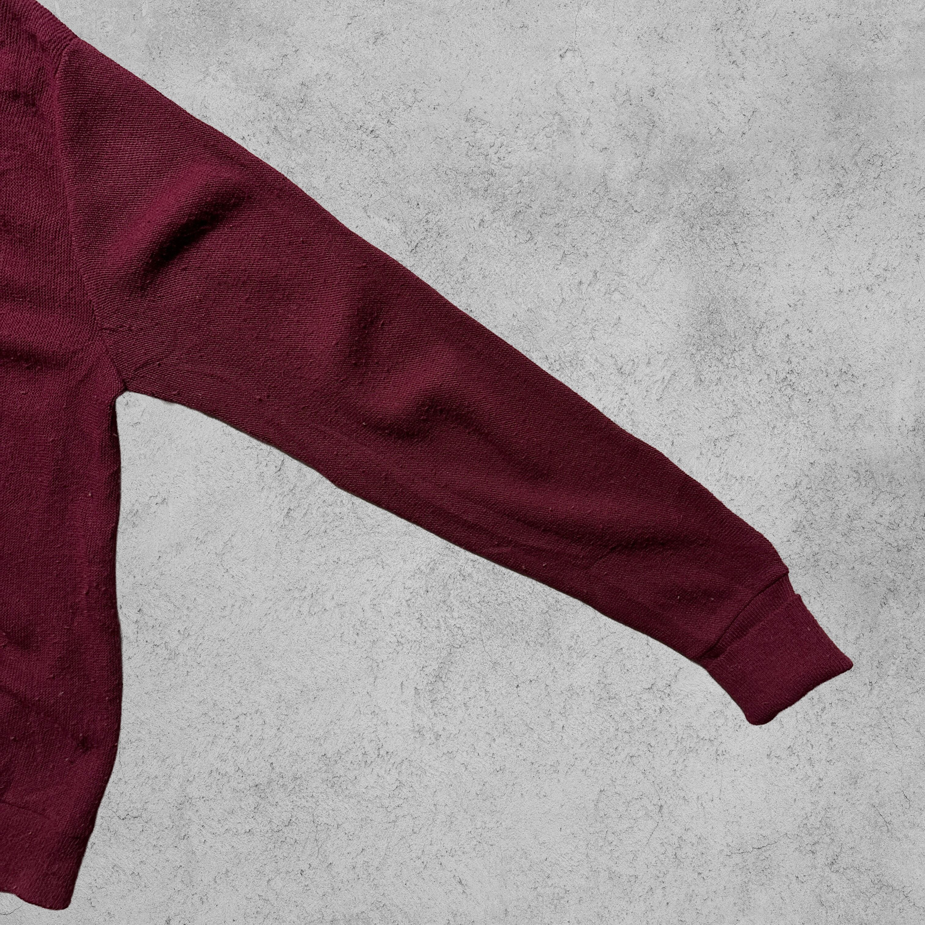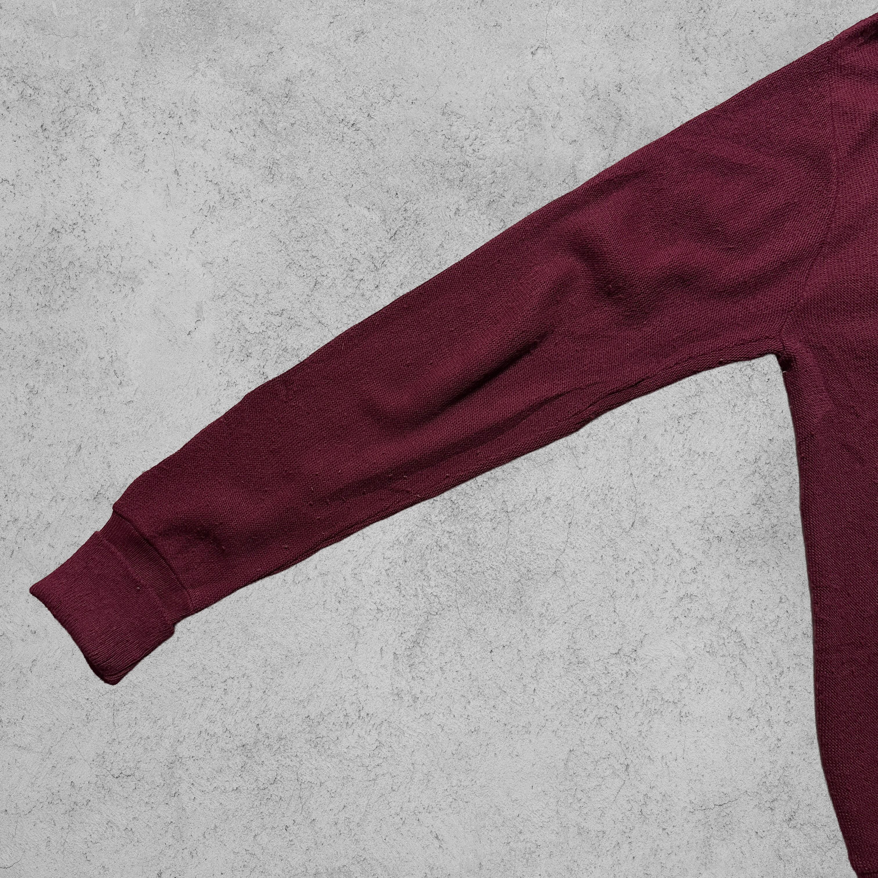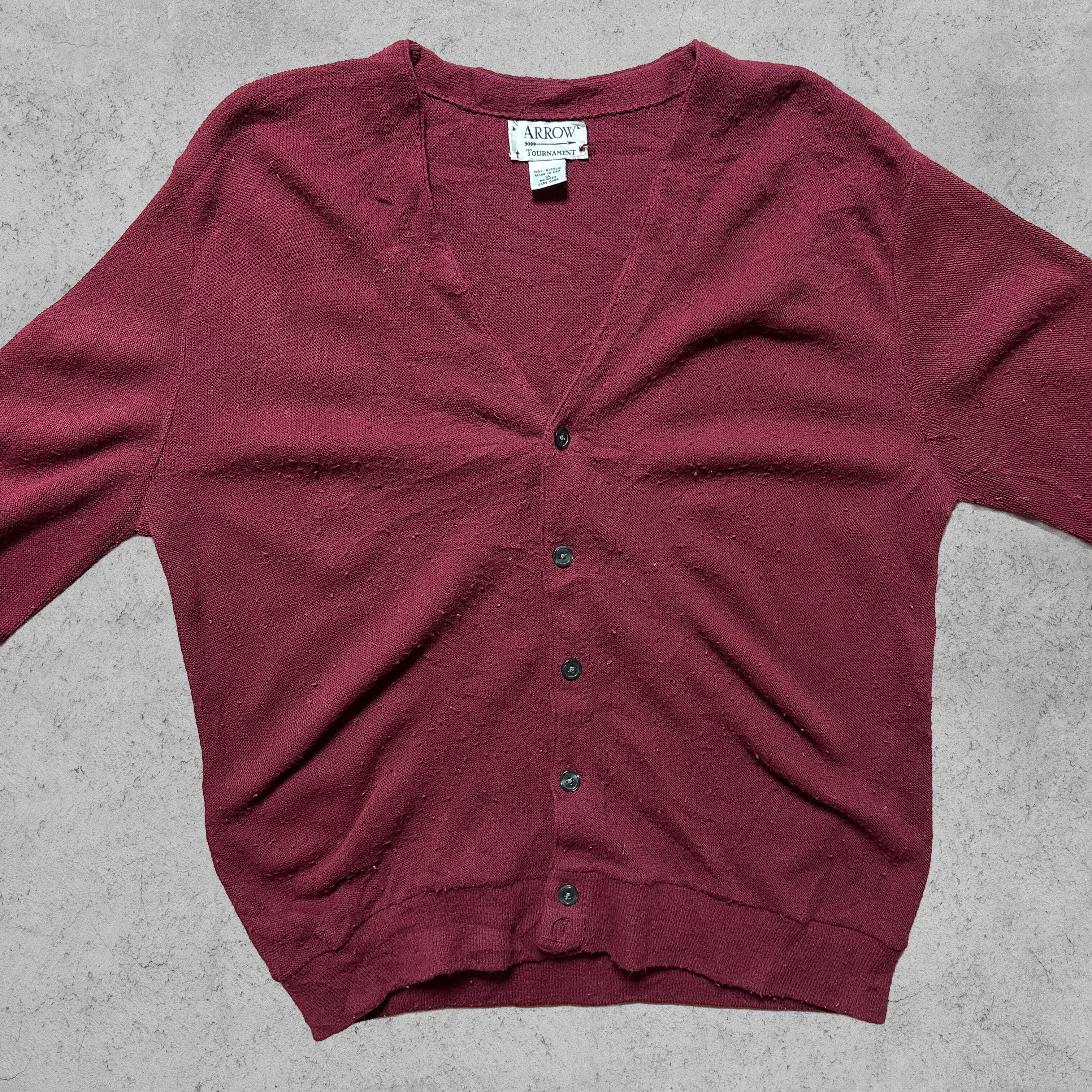 今回のカーディガン(Tournamentライン)は、深みのあるワイン系カラーが特徴の一枚。ボディ全体に細かな凹凸感のあるアクリルニットが使われ、軽い着心地ながら保温性も確保されている。6ボタンのVネック仕様で、シャツの上からでもカットソーの上からでも合わせやすいシルエット。