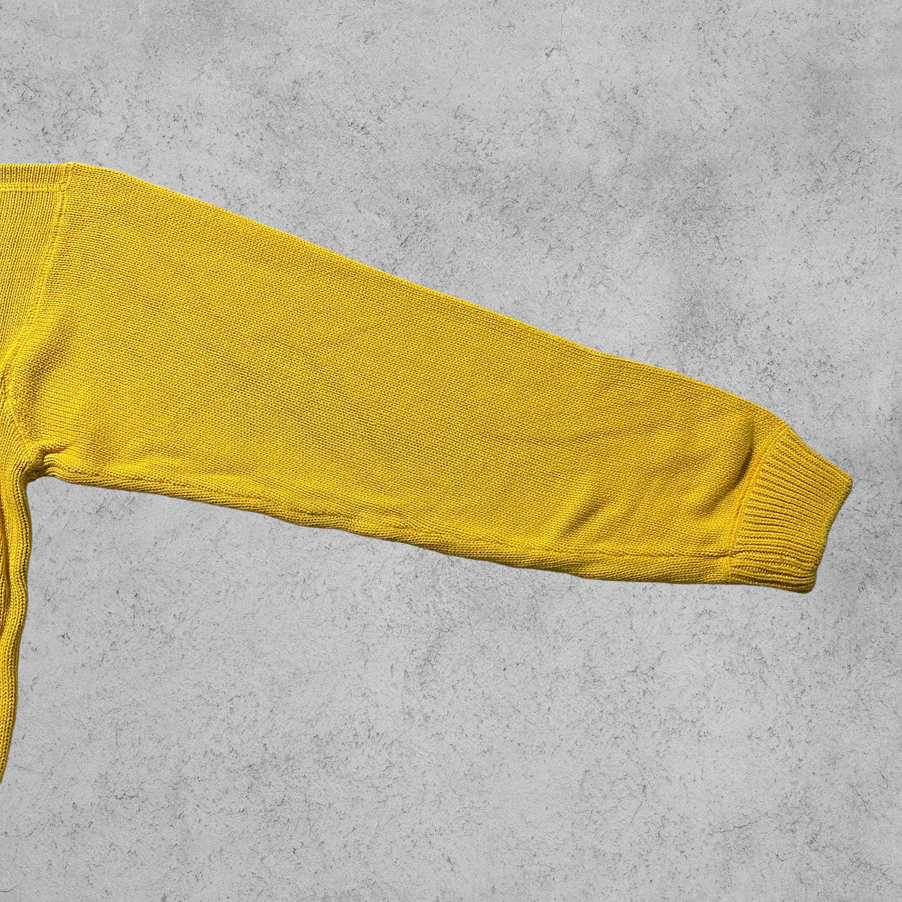 胸元のクレスト(紋章)刺繍ロゴが特徴的なコットンニットセーター。イエローの鮮やかなカラーに、ネイビーの裏地・Vガゼット(V字のパッチデザイン)がアクセントになり、シンプルながら「らしさ」のあるプレッピーな雰囲気をしっかり感じられる。