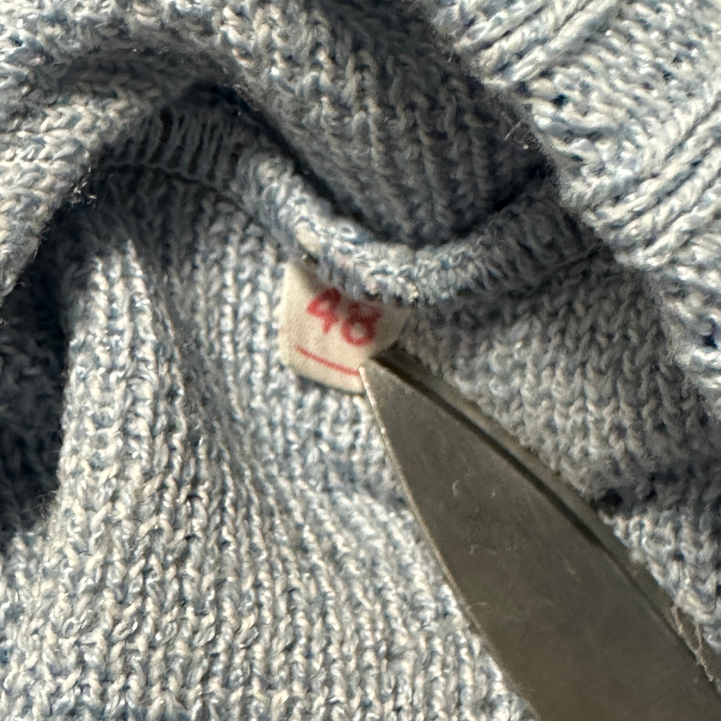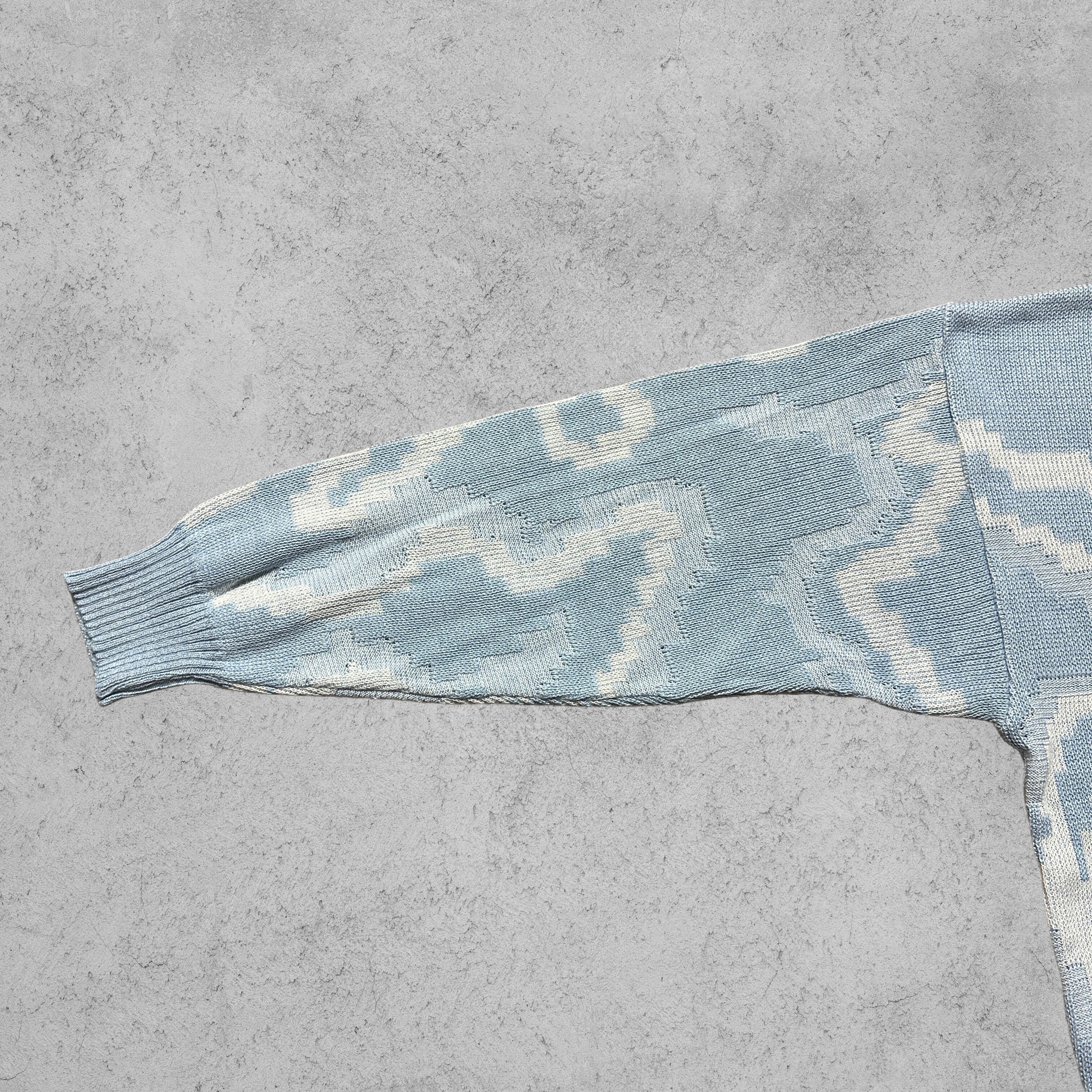 淡いサックスブルーにクリームカラーのアブストラクト柄ジャカードが走るデザインが魅力なVネックニットセーター。細かな透かしが入る編み組織で、軽くてドライタッチなニット生地になっている。インナーにシャツやロンTを重ねて春先〜秋口まで活躍する一枚。サイズ表記46で、身幅ゆったり・着丈やや短めのボックスシルエットなので、ハイウエストパンツやタック入りスラックスと相性がいい。
