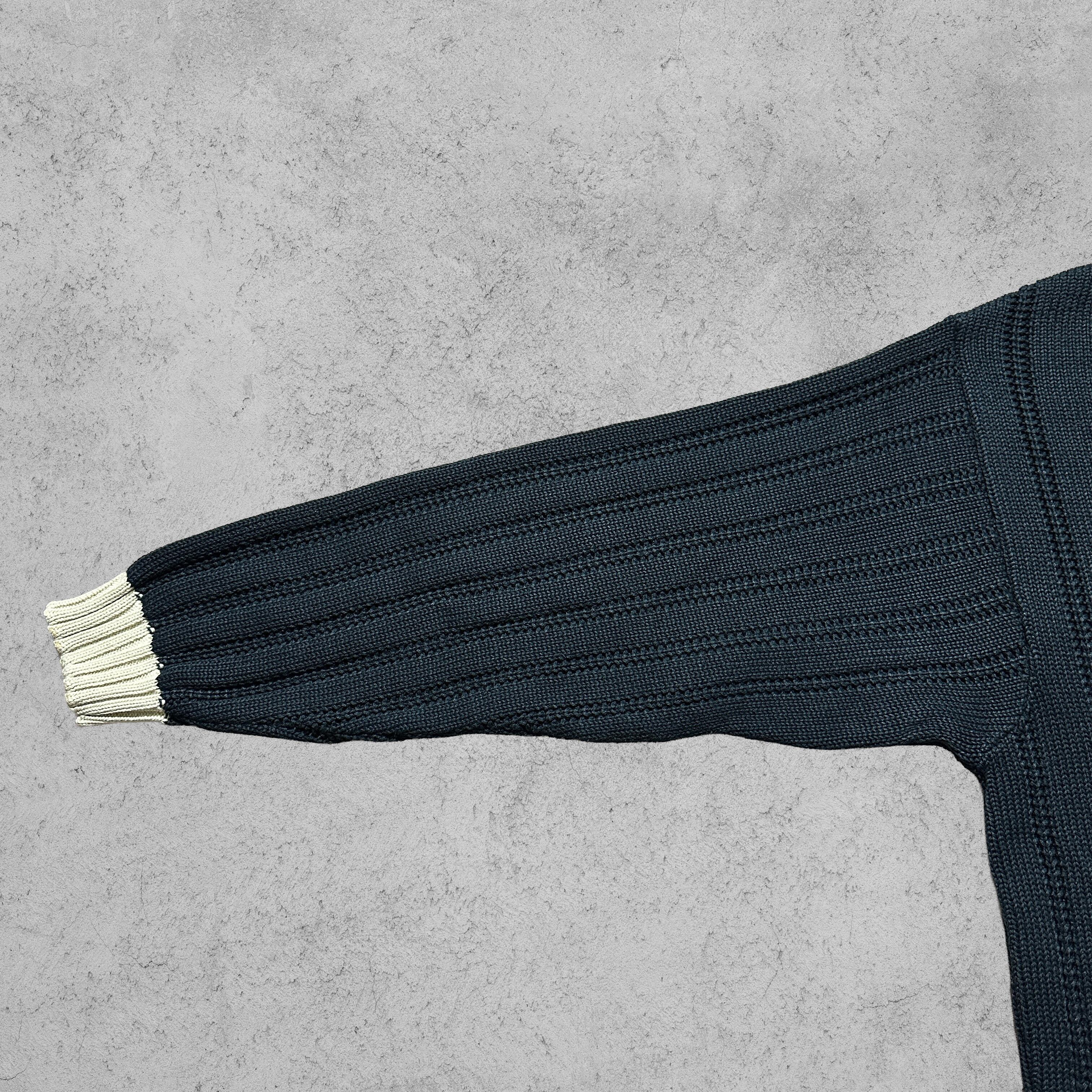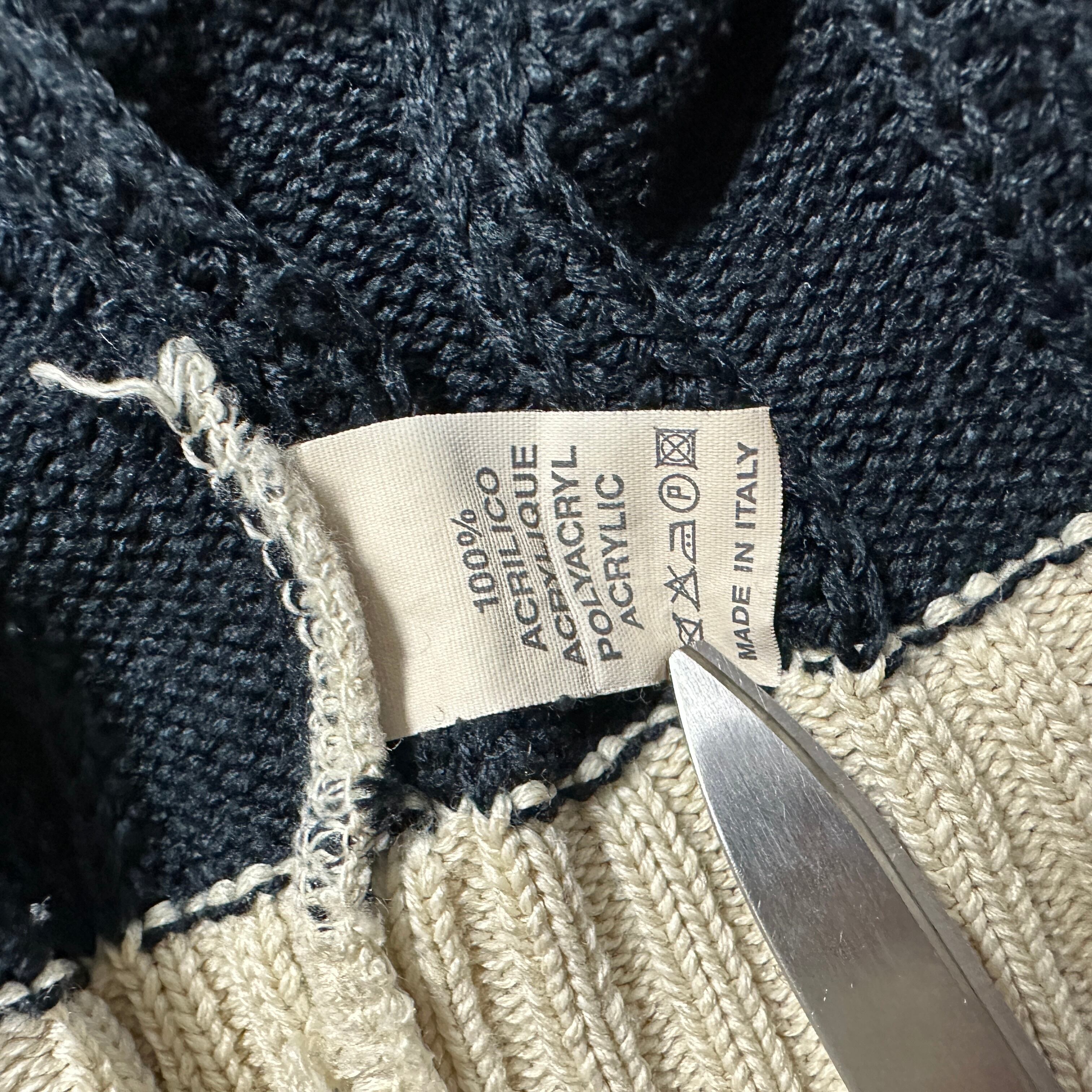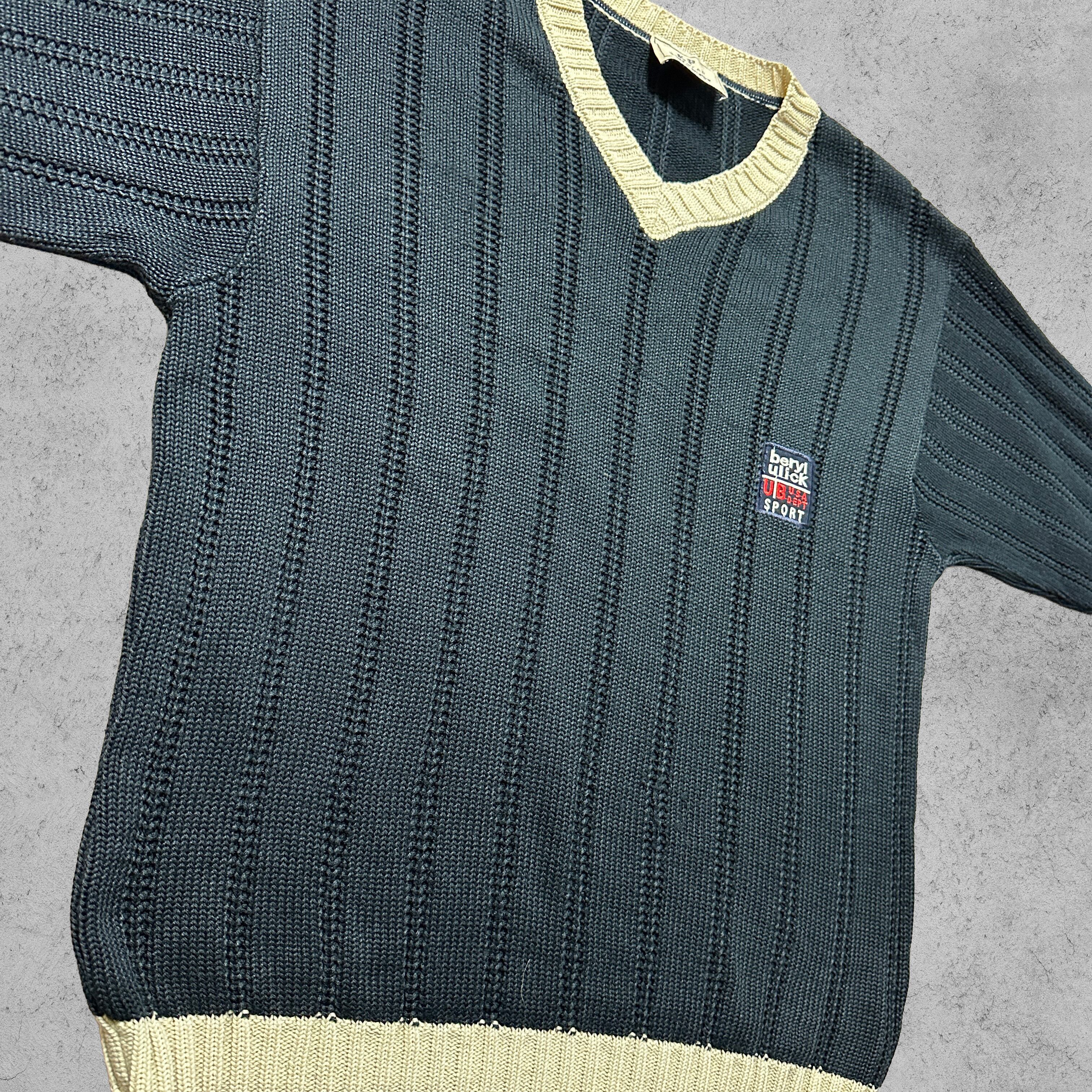 ブラックのボディに縦方向のリブ編みとリンクス柄を走らせ、ネック・袖口・裾をアイボリーのリブで切り替えた2トーンデザインが魅力のVネックニットセーター。左胸には「beryl ulick UB USA DEPT SPORT」のワッペンパッチがさりげなく入り、スポーツミックスな雰囲気をプラスしている。素材は軽くて扱いやすい100%アクリルで、イタリア製らしいきれいな落ち感が特徴。シャツに重ねたきれいめコーデからデニムやチノと合わせたヨーロッパ古着スタイルまで、幅広く楽しめる一枚。