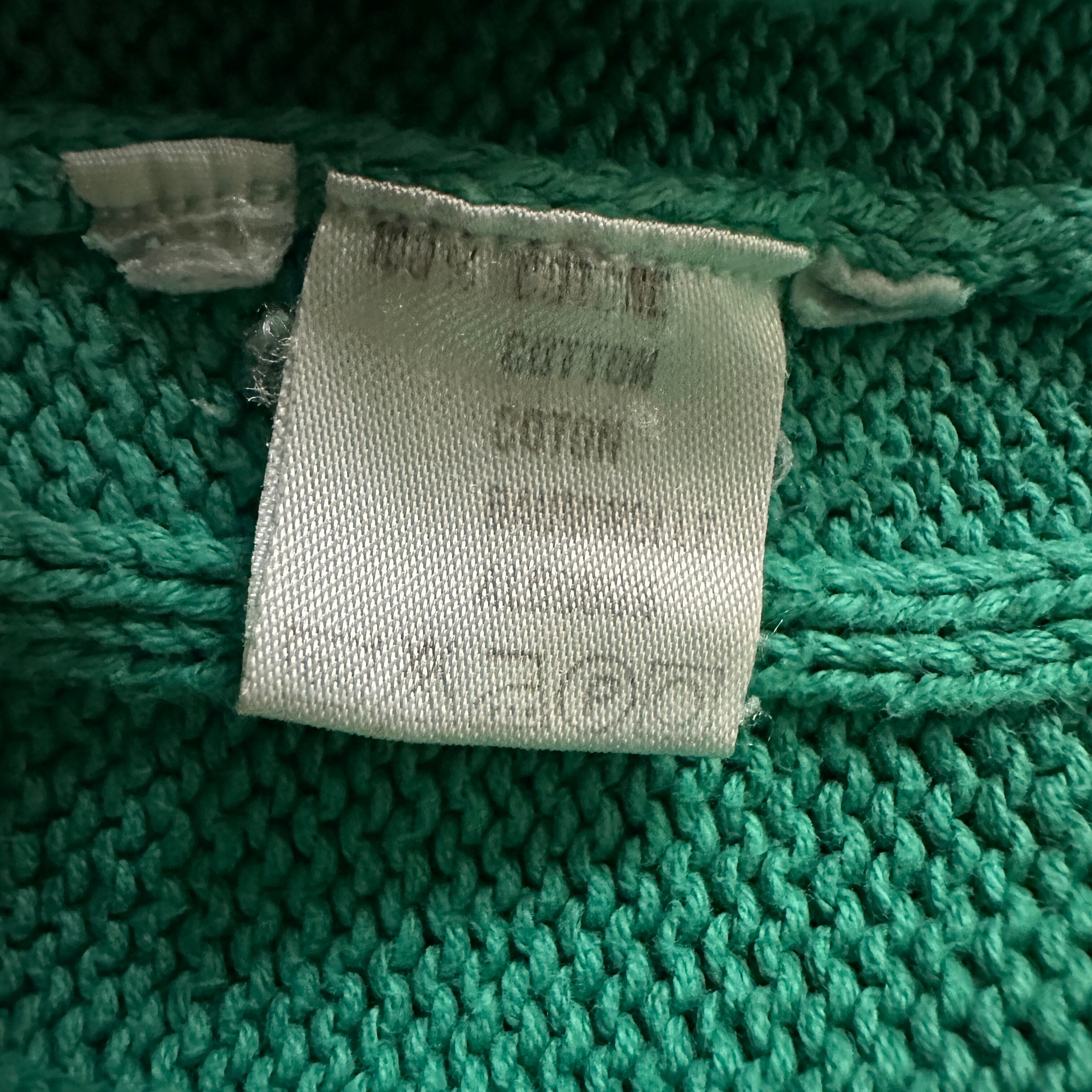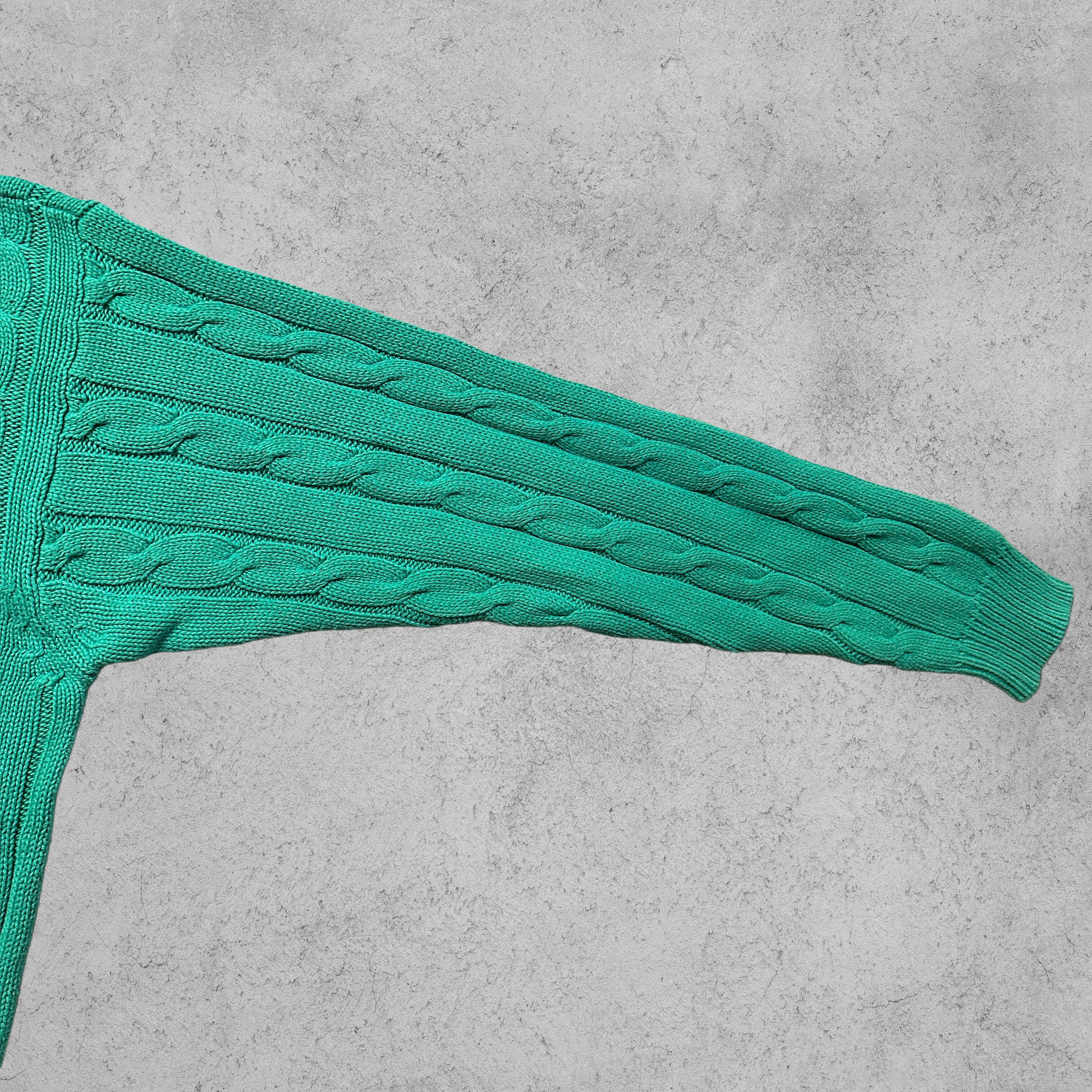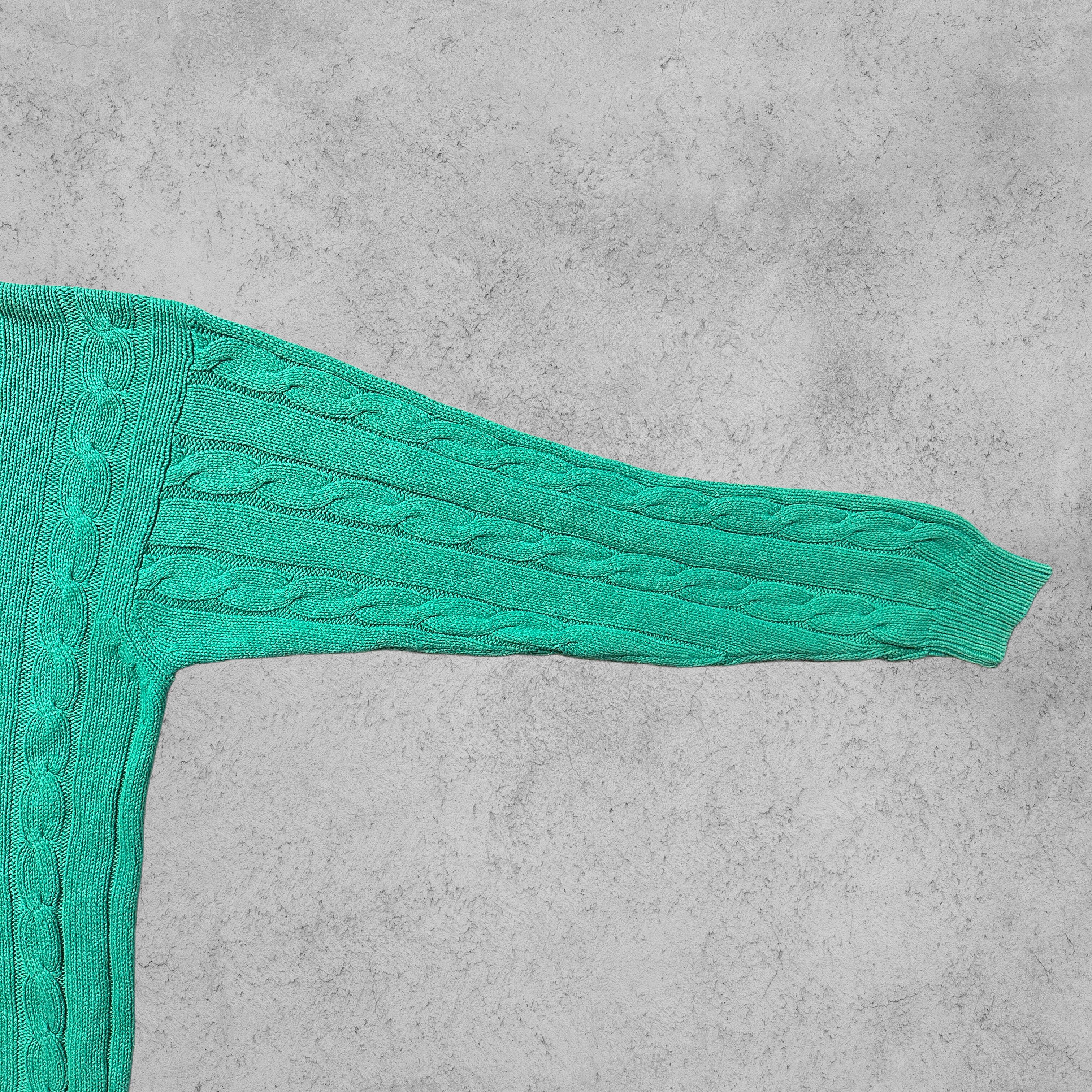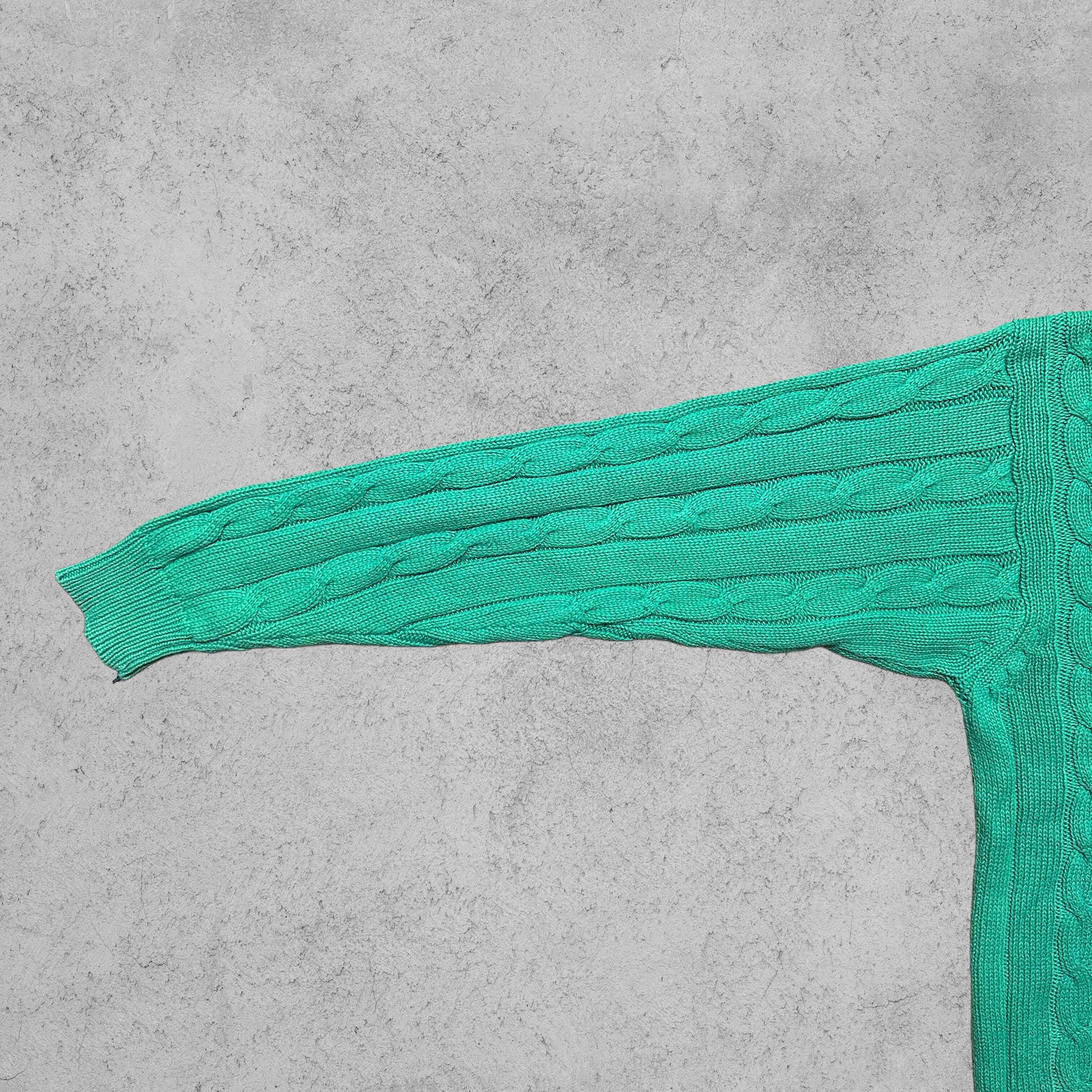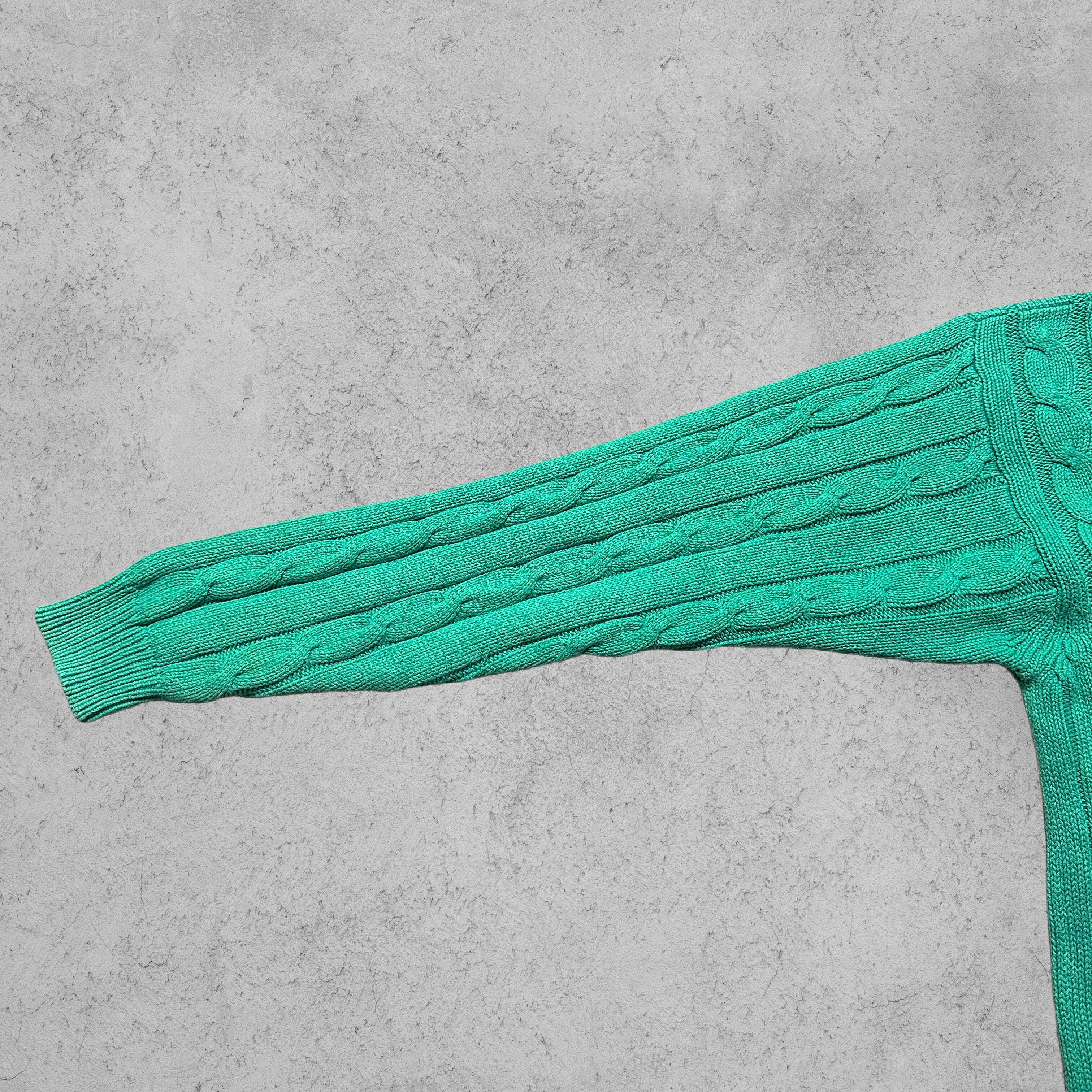 全面に走る太めのケーブル編みと、鮮やかなエメラルドグリーンの色味が印象的なクルーネックニットセーター。コットン100%のミドルゲージニットで、ふっくらとした編み地ながらもウールほどチクチクしにくく、春先や秋口の一枚着はもちろん、冬場はインナー使いにも活躍する。デニムやチノパンと合わせてカジュアルにまとめたり、シャツの上から重ねてプレッピーに着こなすのもおすすめ。