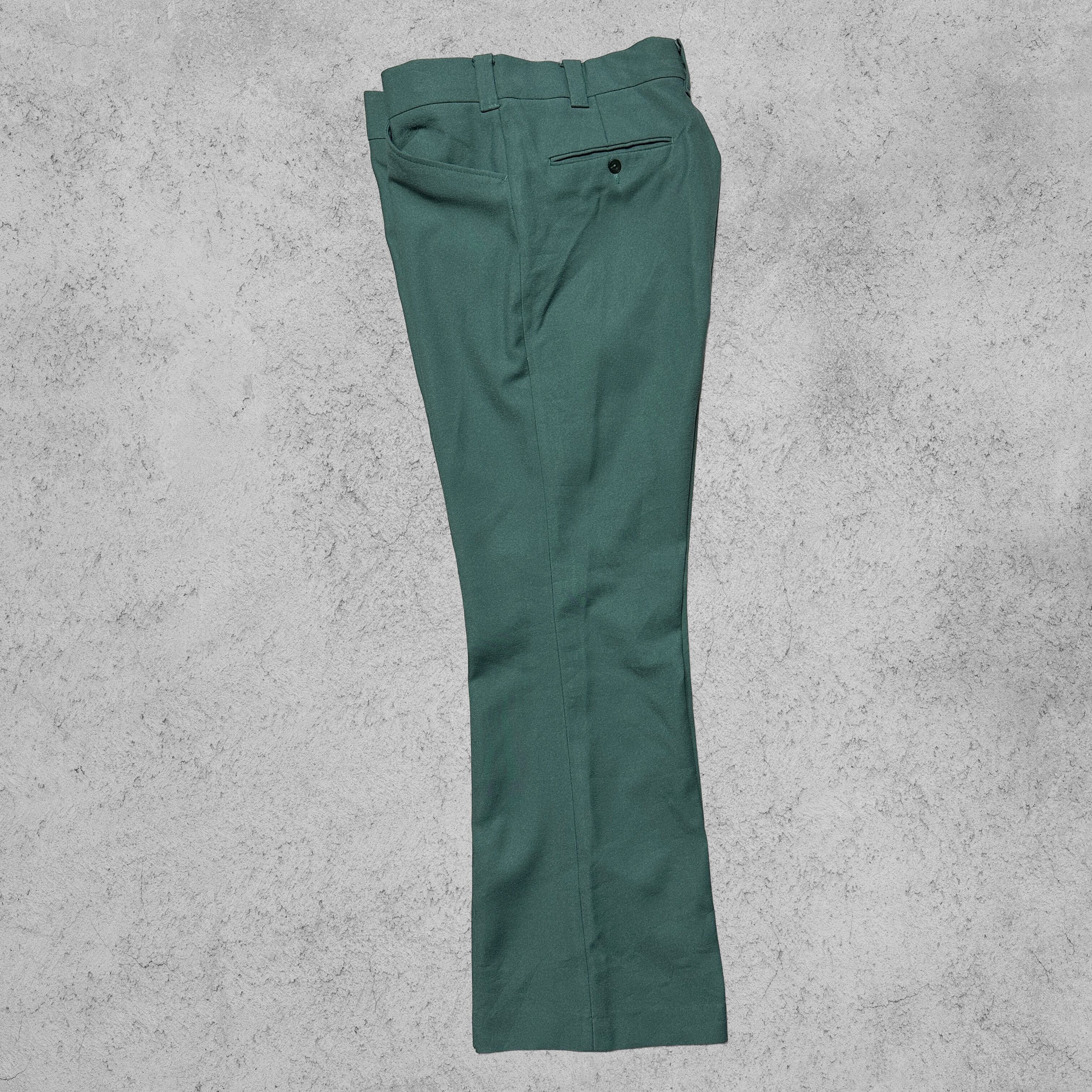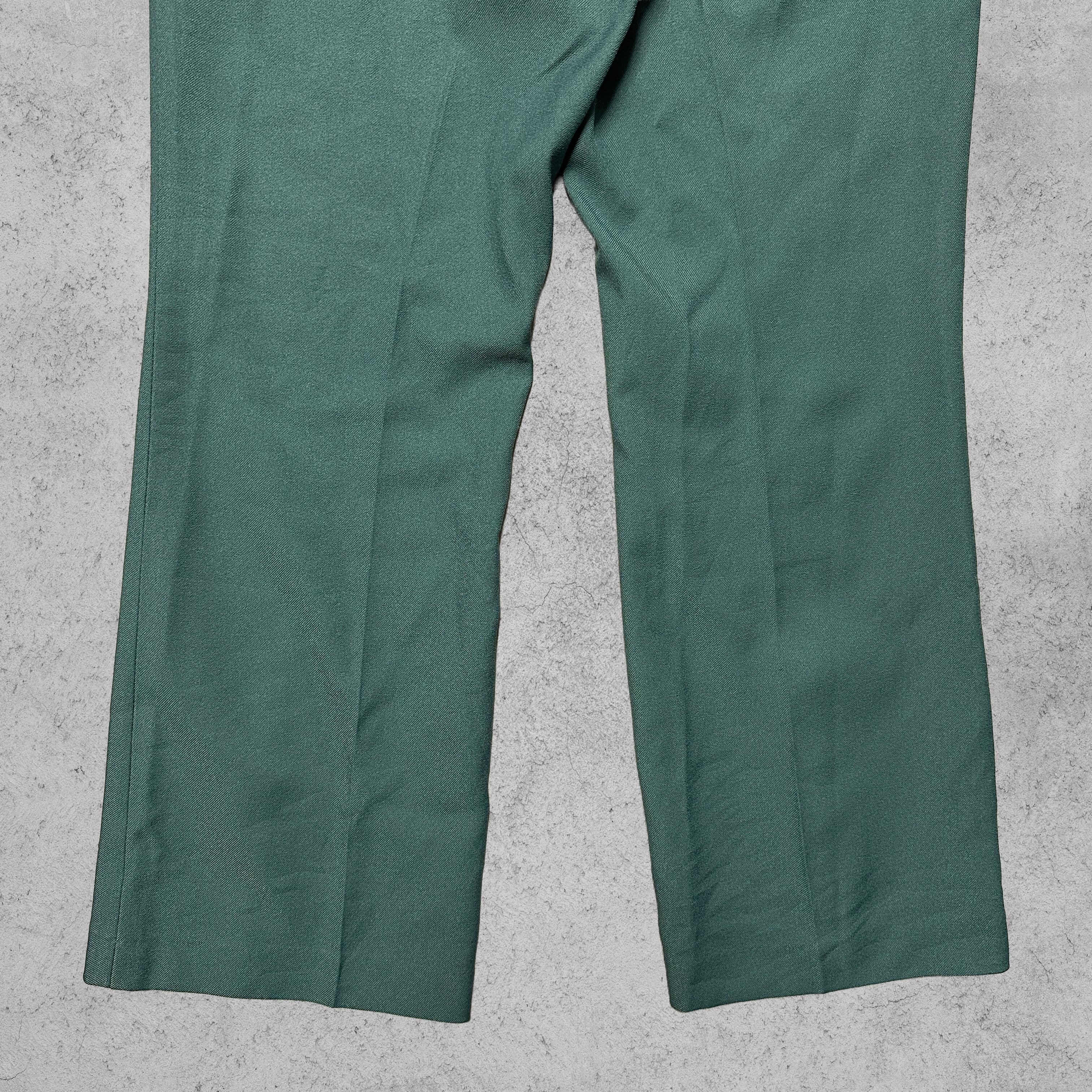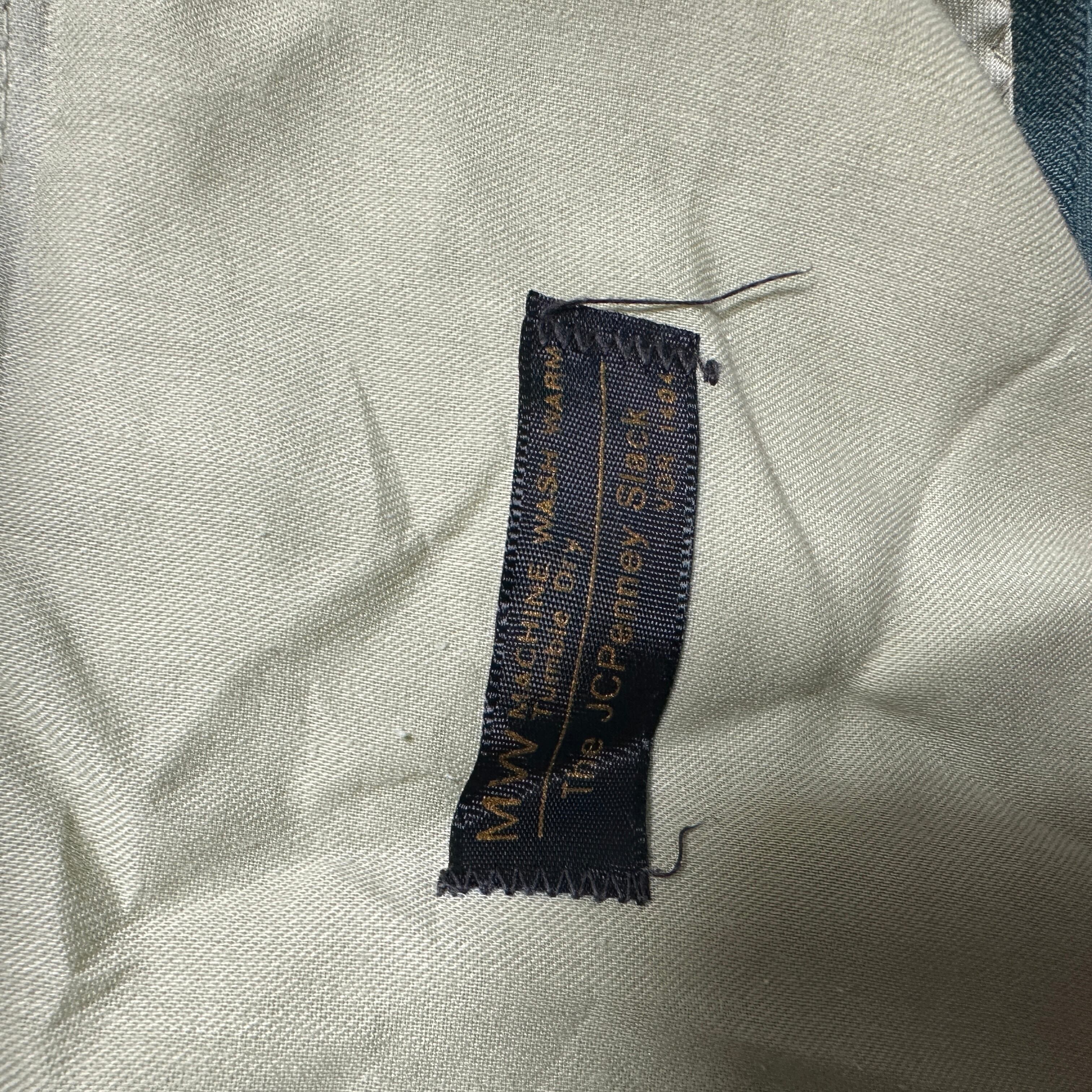 このスラックスは、深いグリーンの色味が特徴的なクラシックな一本。フロントはWフック+タロン製ジッパーの組み合わせ。バックは両玉縁ポケットで、片側のみボタン付きの実用的なデザインになっている。内側の黒地にゴールドで印字されたタグ(J.C. Penney Store / Machine Wash Warm …)も70年代らしい雰囲気を持つ。