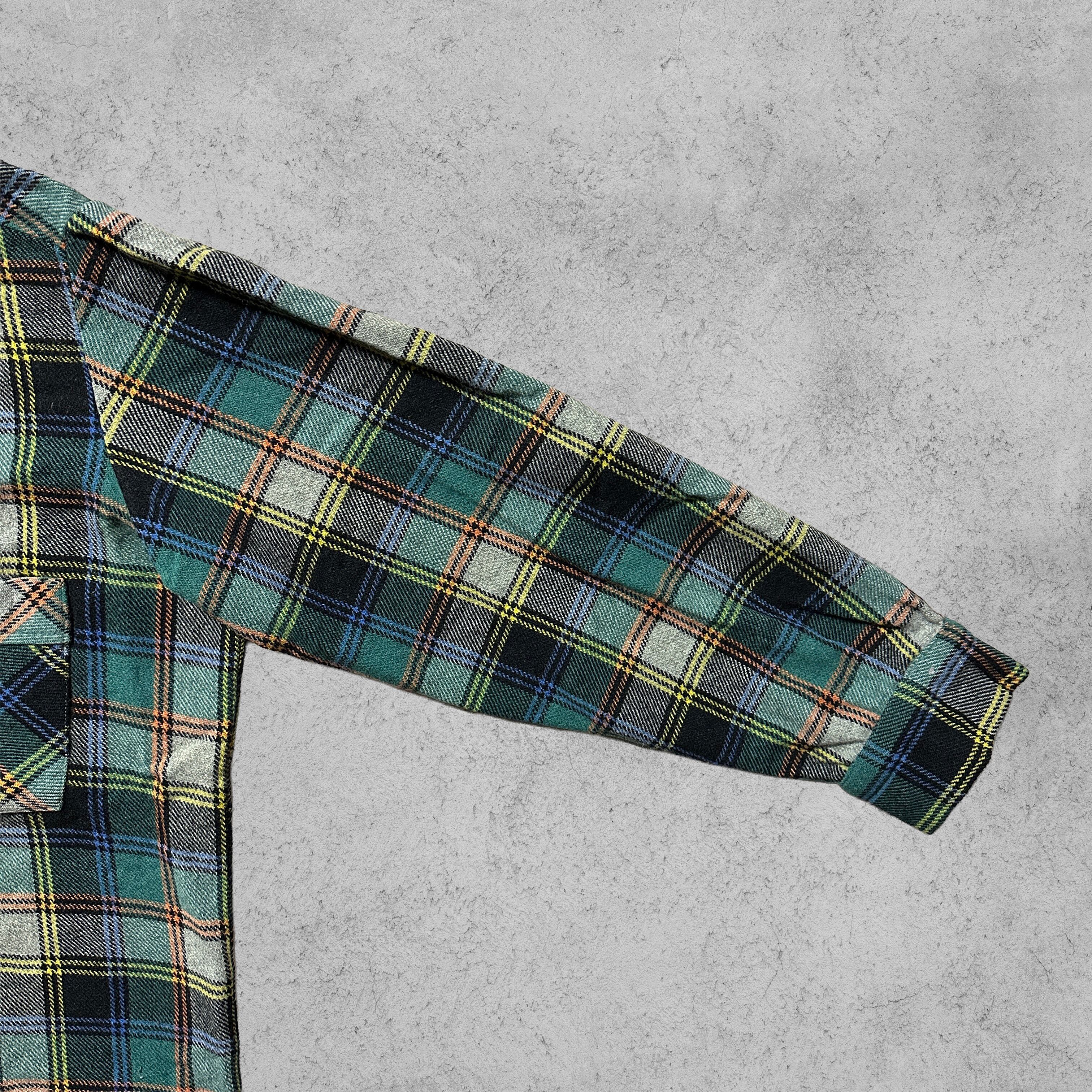 グリーン〜ブルー系をベースに、ネイビー/グレー/イエロー/ブラウンのラインが走るチェック柄が魅力なフランネルシャツ。胸ポケットは柄合わせのバイアス取りで、地味に手が込んでいる。生地はネルらしい起毛感で、秋冬のレイヤードにぴったりの一枚。