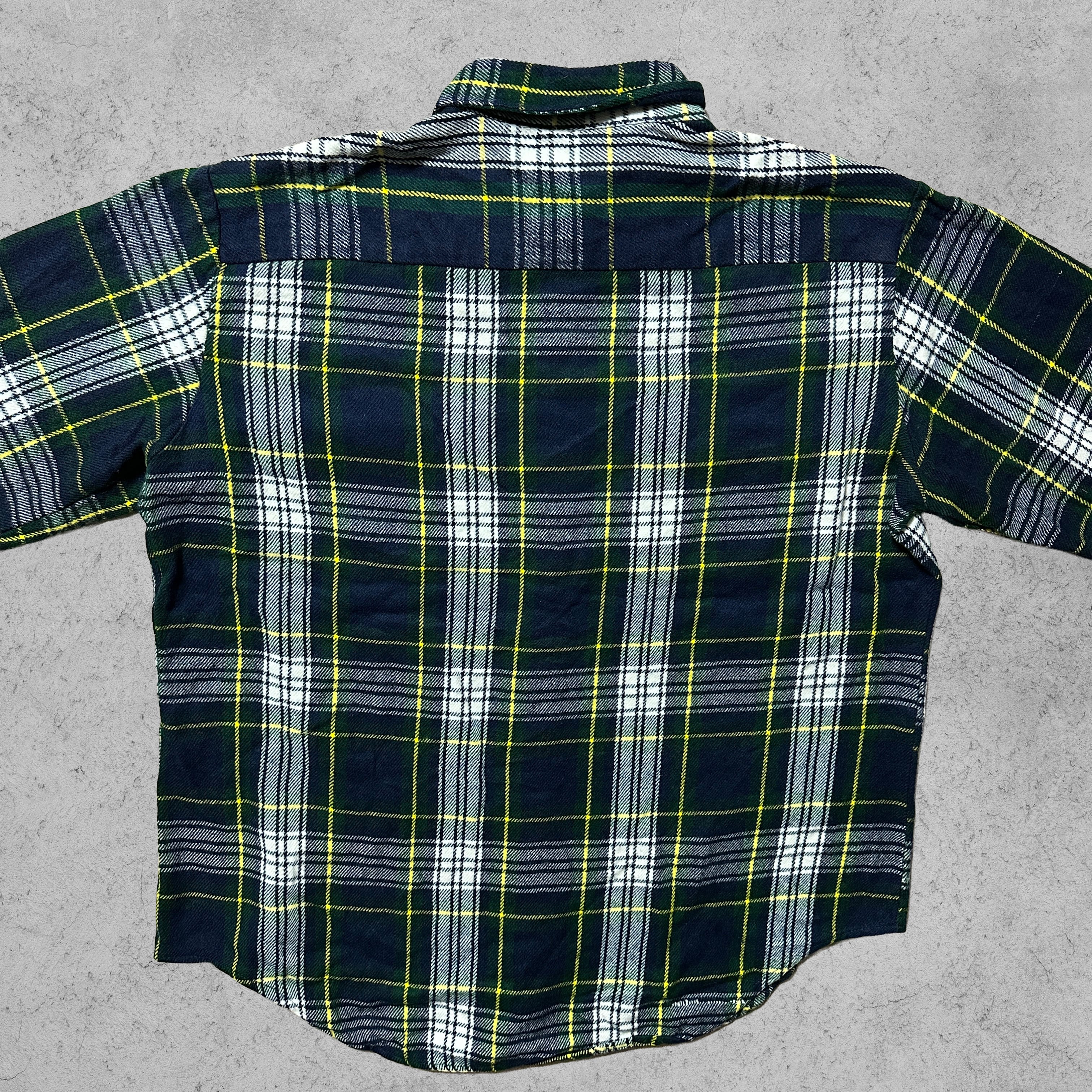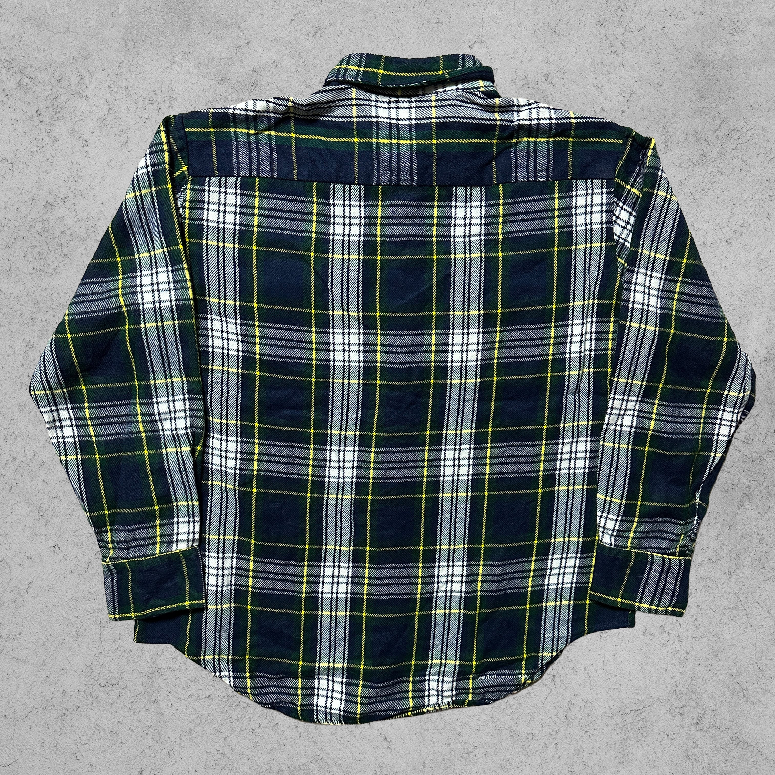 ネイビー×グリーン×ホワイトにイエローラインが走るチェック柄が魅力なフランネルシャツ。胸元はフラップ付きポケット2つ、柄合わせはバイアス取りで雰囲気が良い。素材はタグ表記よりアクリル100%で、起毛感のあるネル見えの質感。さらに内側はブルー系の裏地付きで、シャツ一枚より防寒性が高く、秋冬の羽織りとして使いやすい。白Tやサーマルの上にさらっと羽織って、デニムやチノに合わせるだけでまとまる一枚。