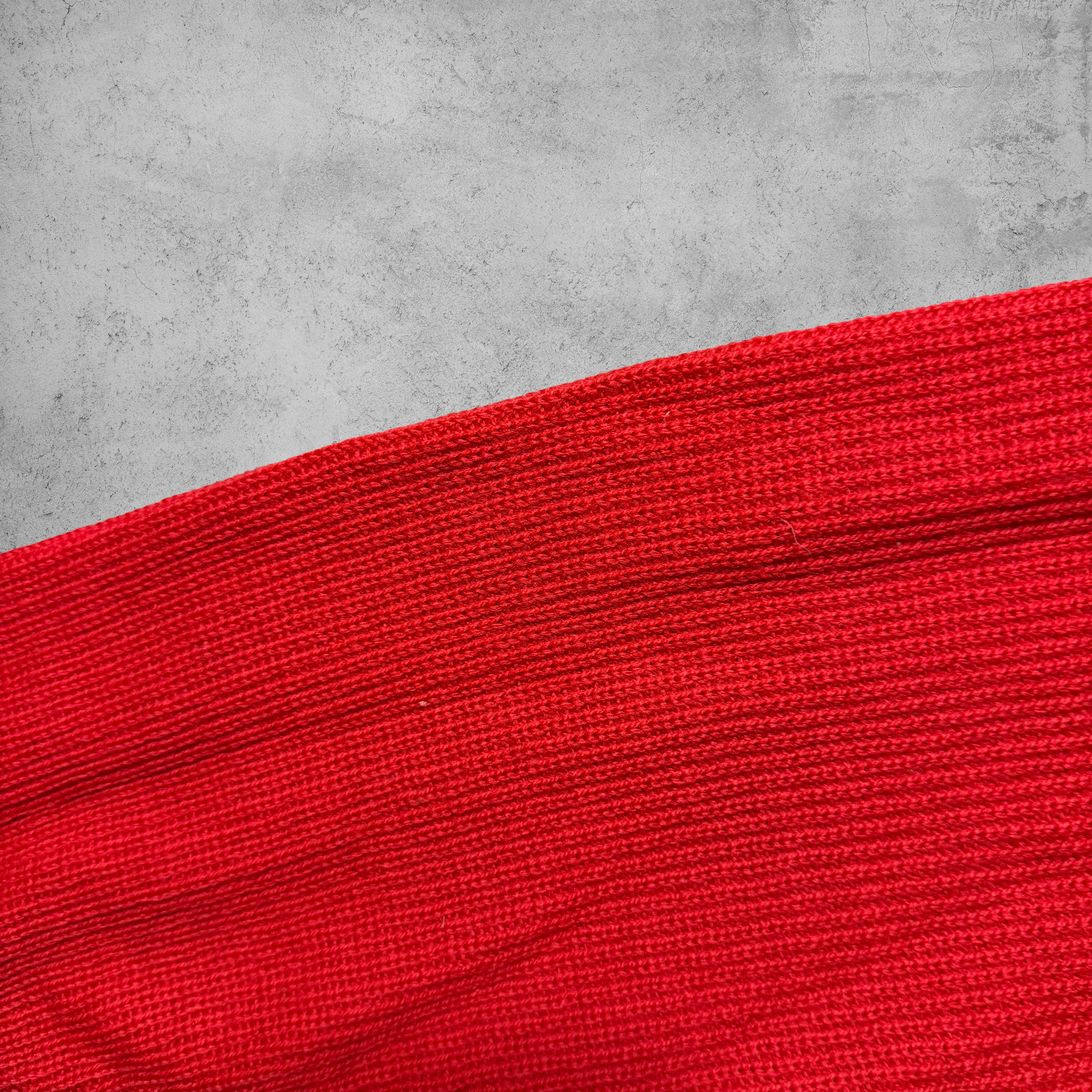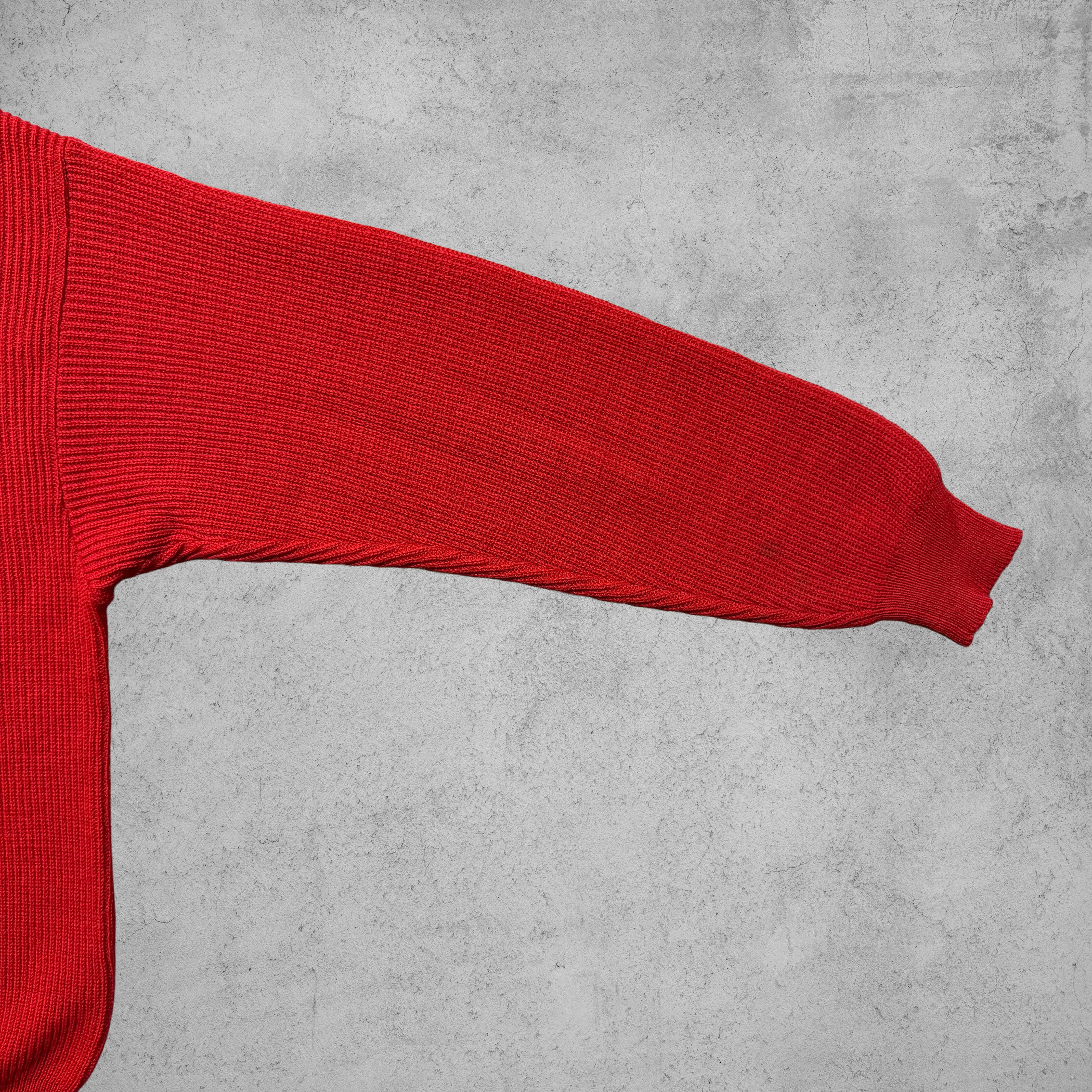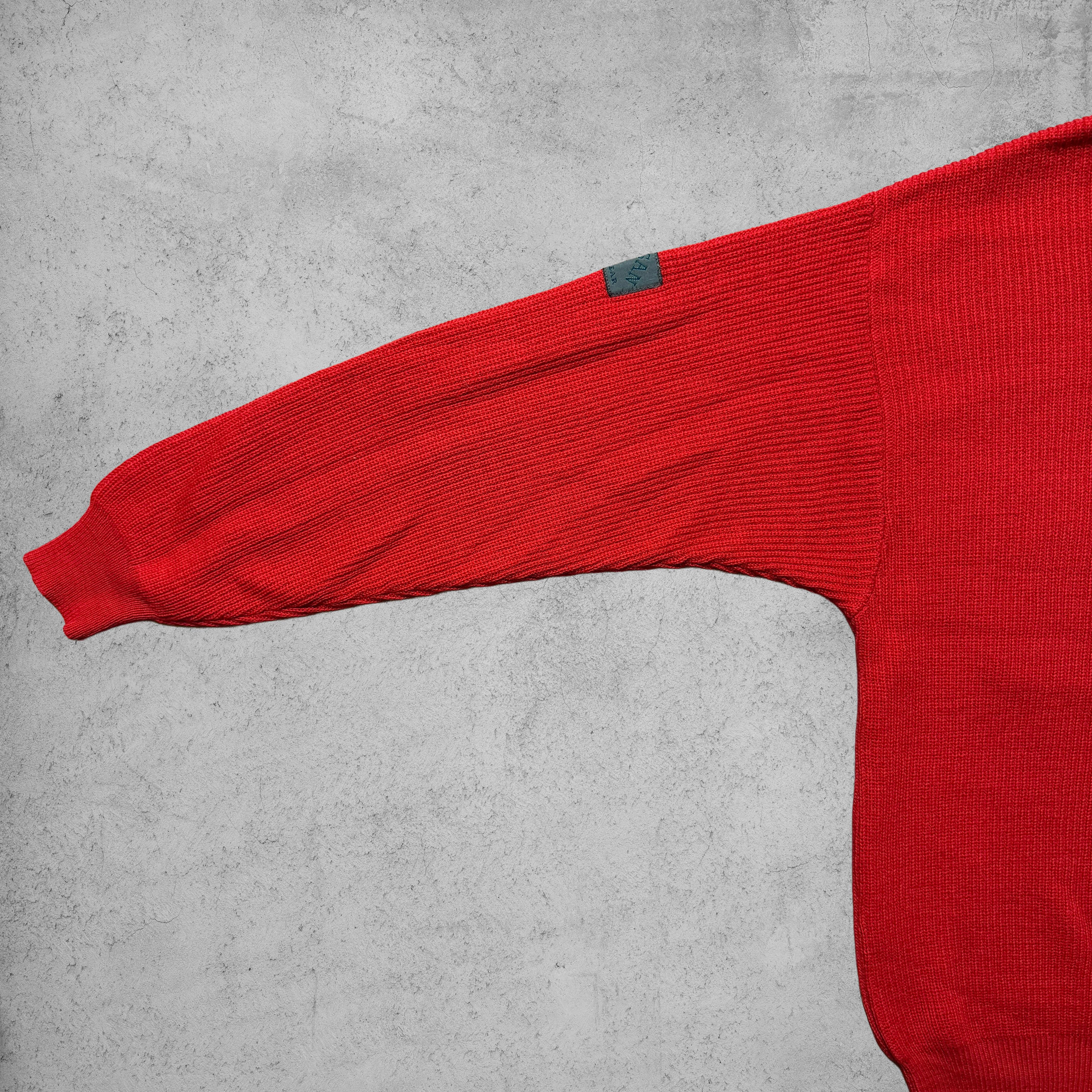 発色の良いレッドカラーが印象的な、ハーフジップ仕様のウールニット。