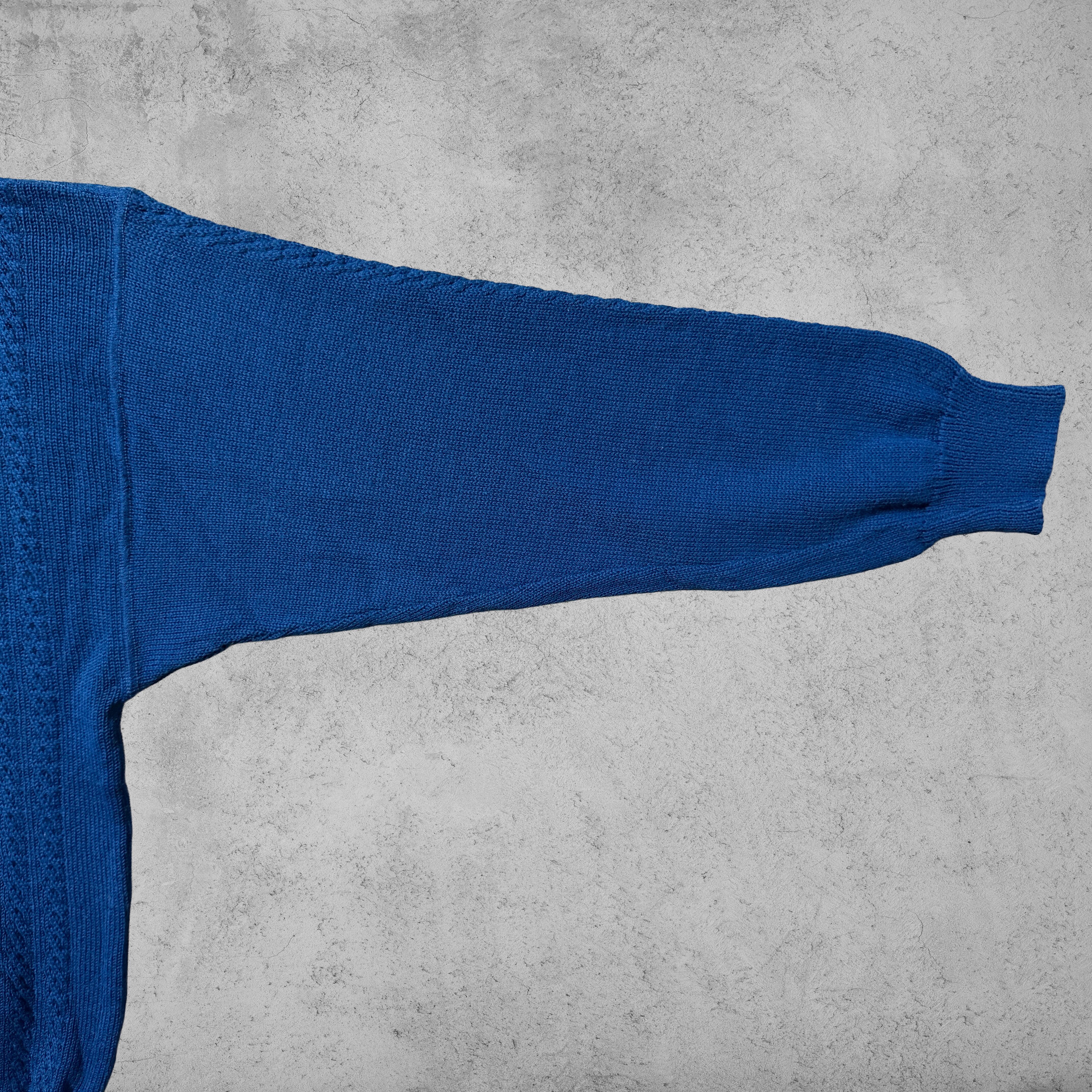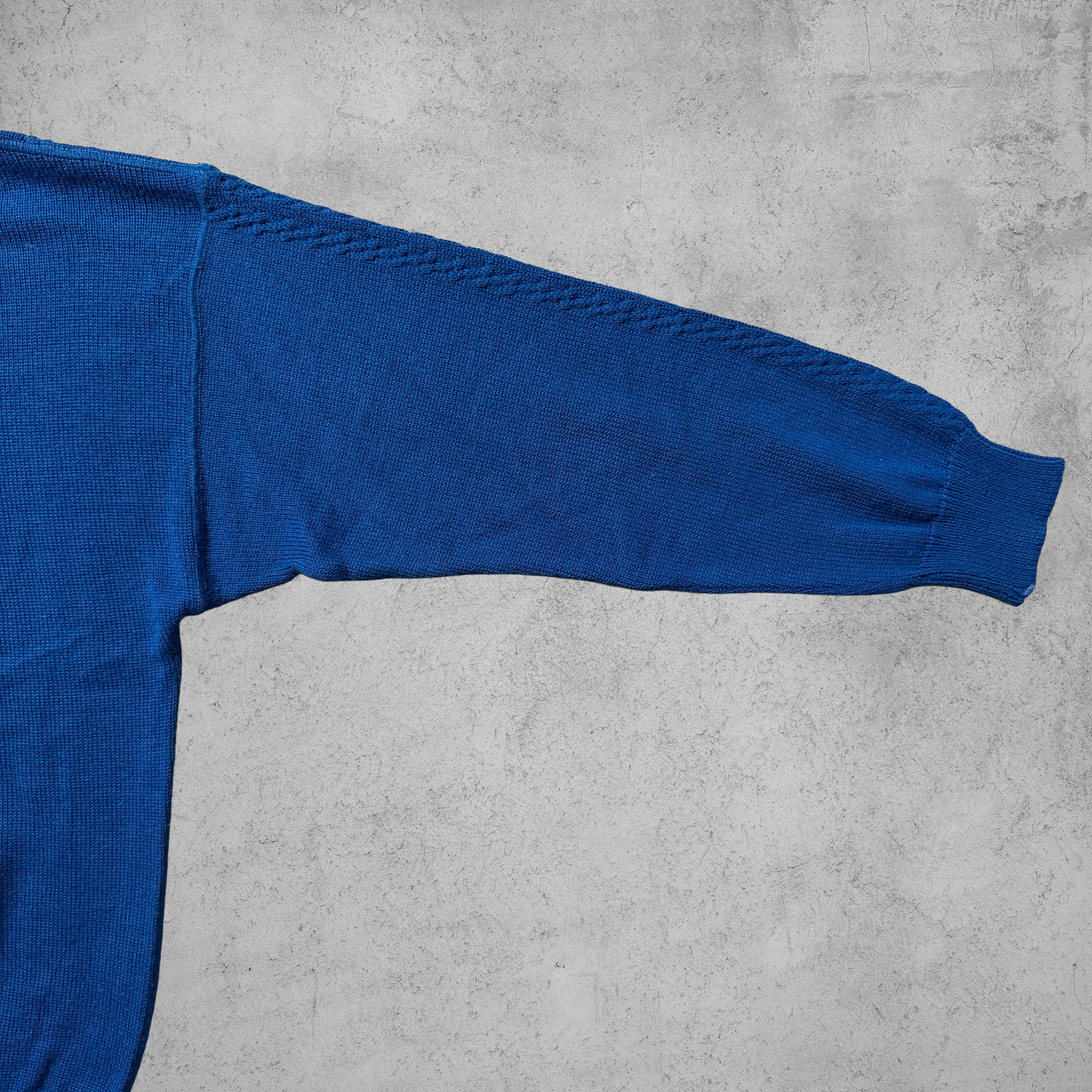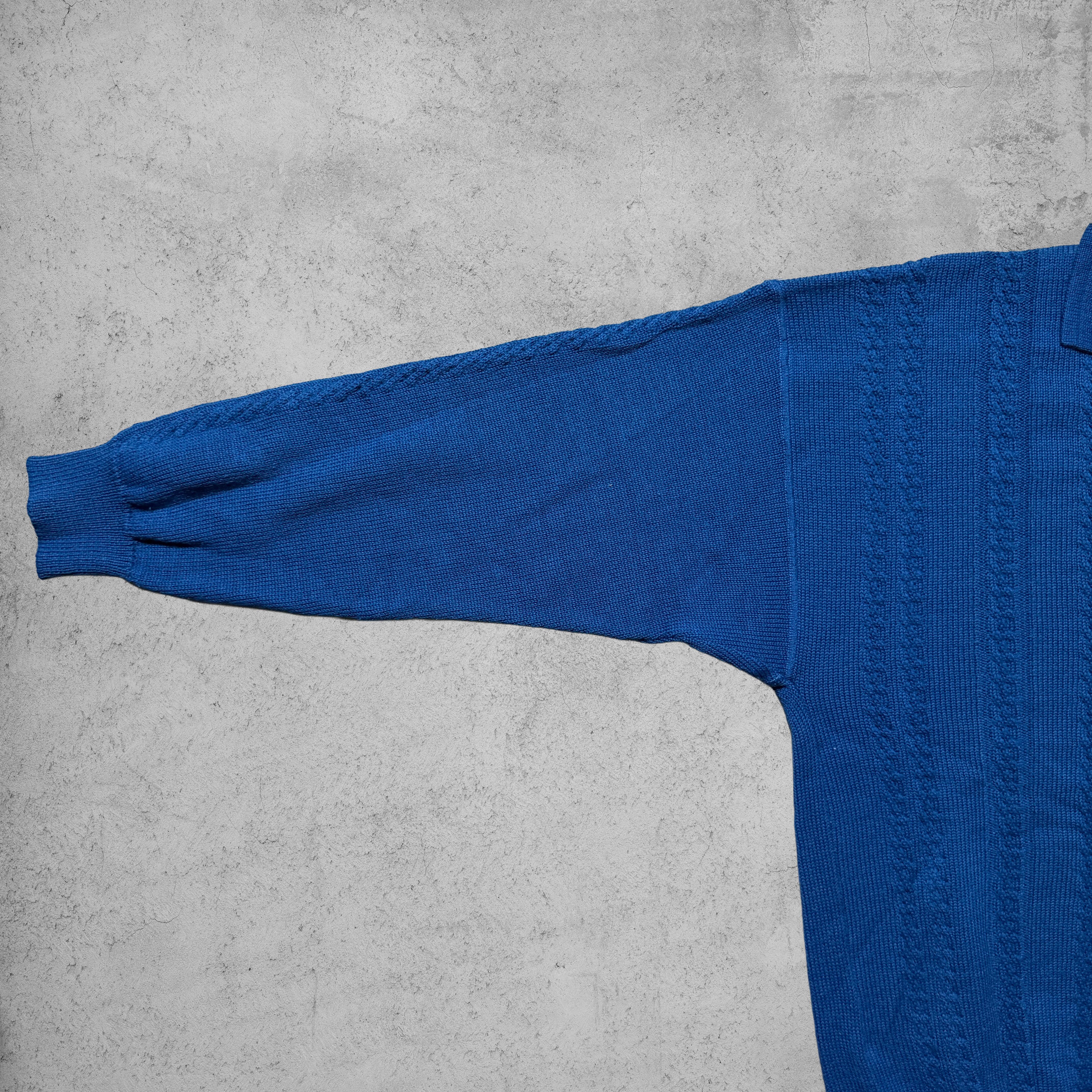 発色の良いロイヤルブルーが印象的なニットポロタイプのセーター。フロントには立体感のある縦畝編み、胸元には控えめなブランドロゴタグが付き、主張しすぎないバランス感が魅力。