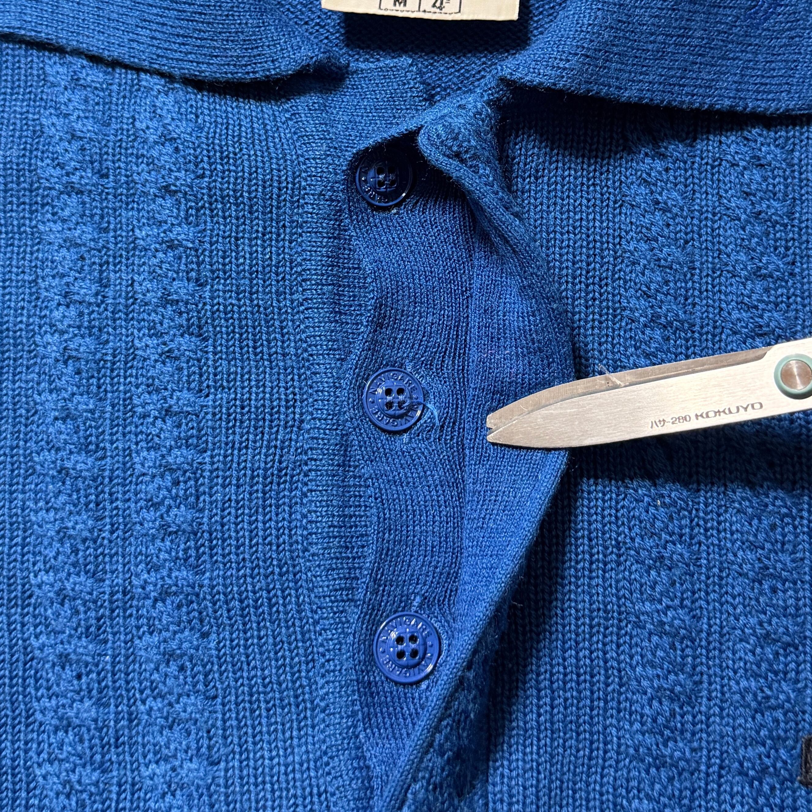 素材はコットン×アクリル混紡で、ニットながら重すぎず、柔らかくドライなタッチ。シャツ感覚で着られる一方、しっかり“ニットらしさ”も感じられるため、春秋は一枚で、冬はインナー使いでも活躍する。スラックスからデニムまで相性が良く、きれいめ古着が好きな人に刺さる一枚。